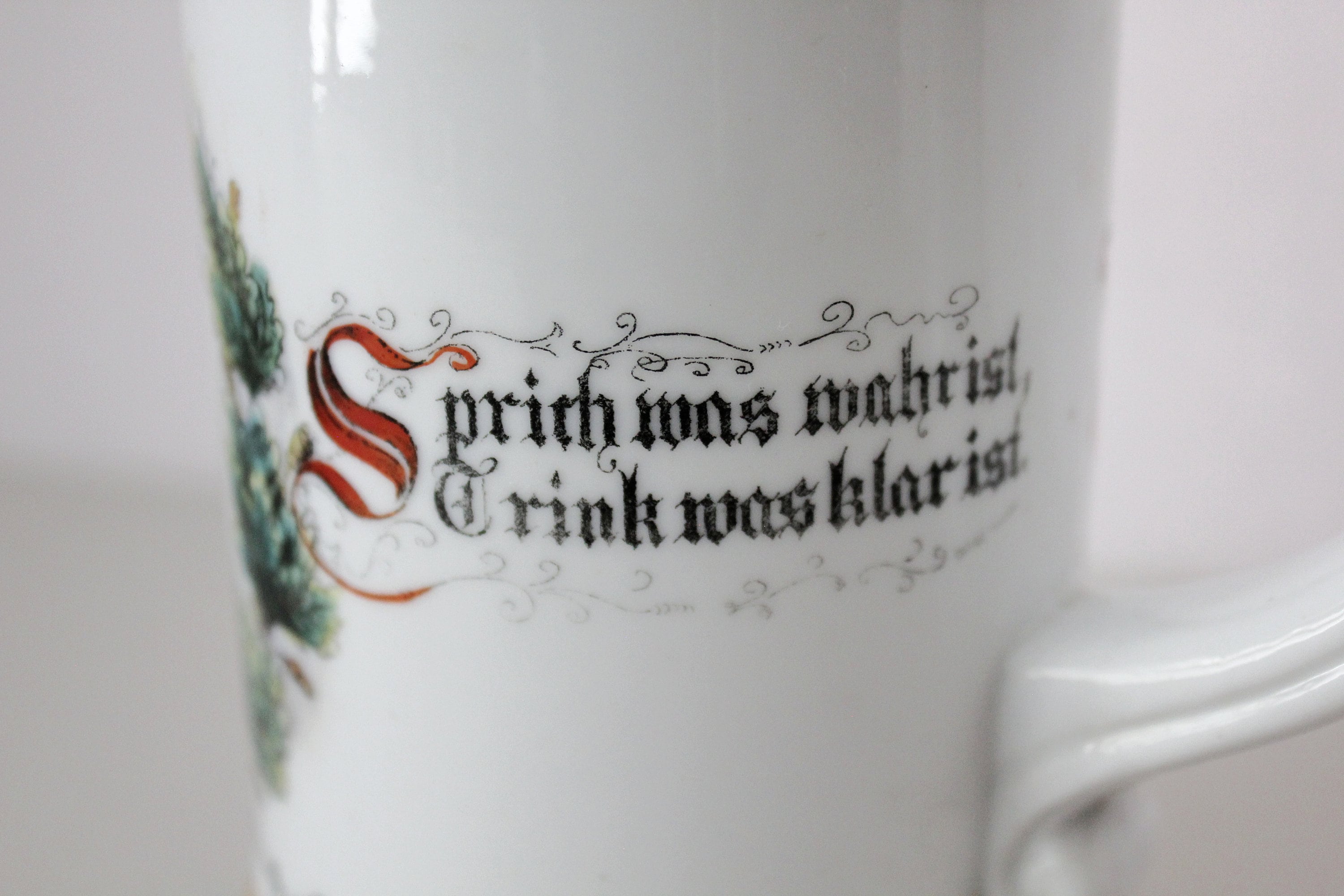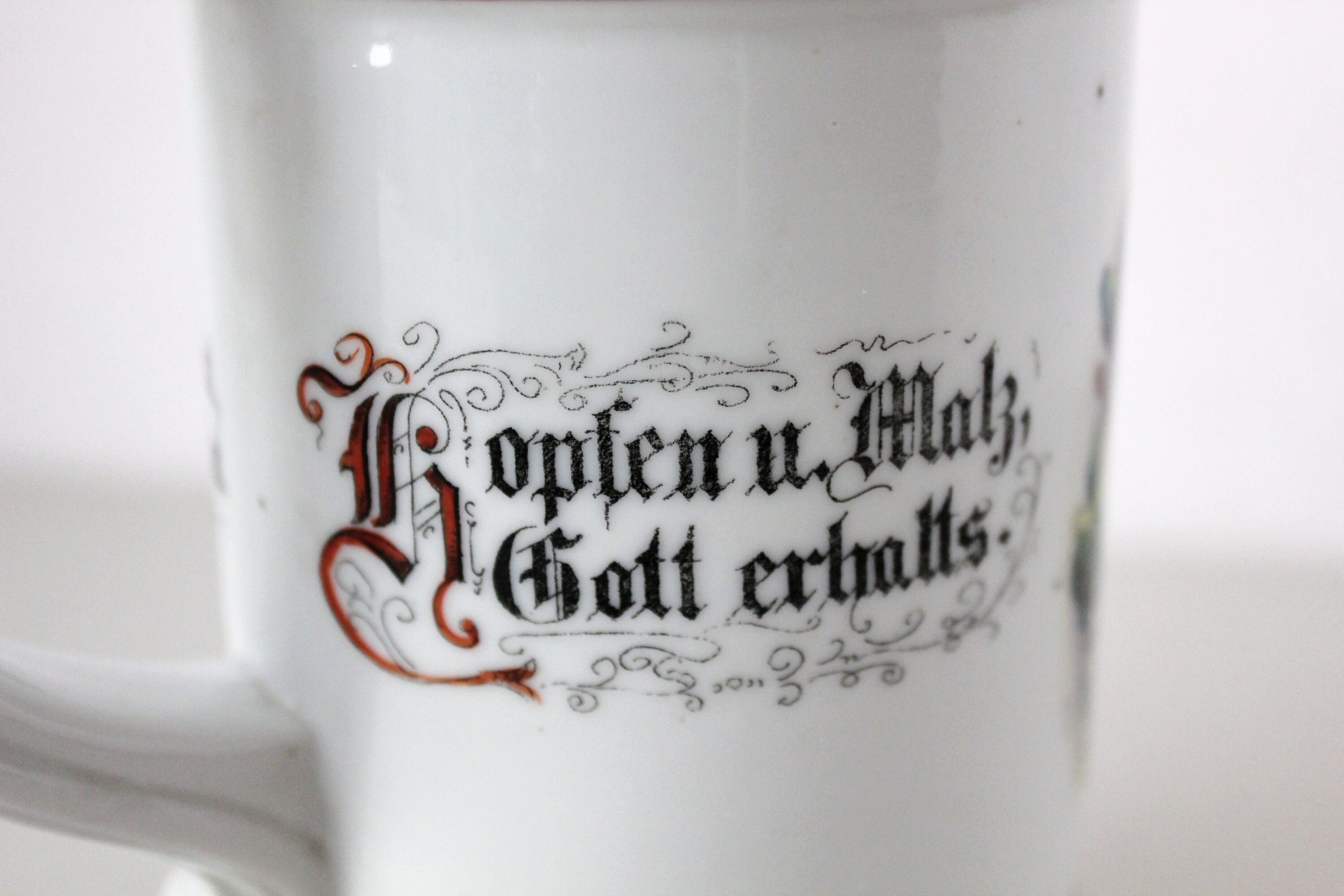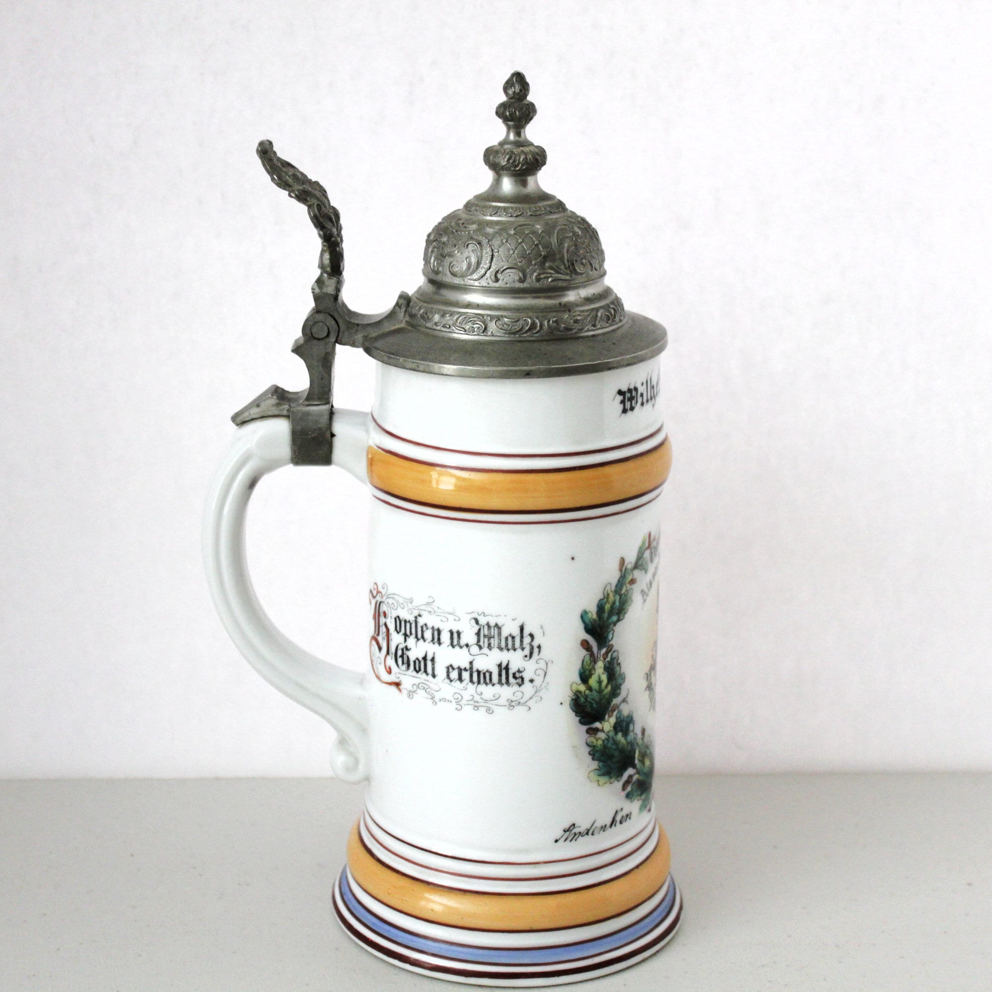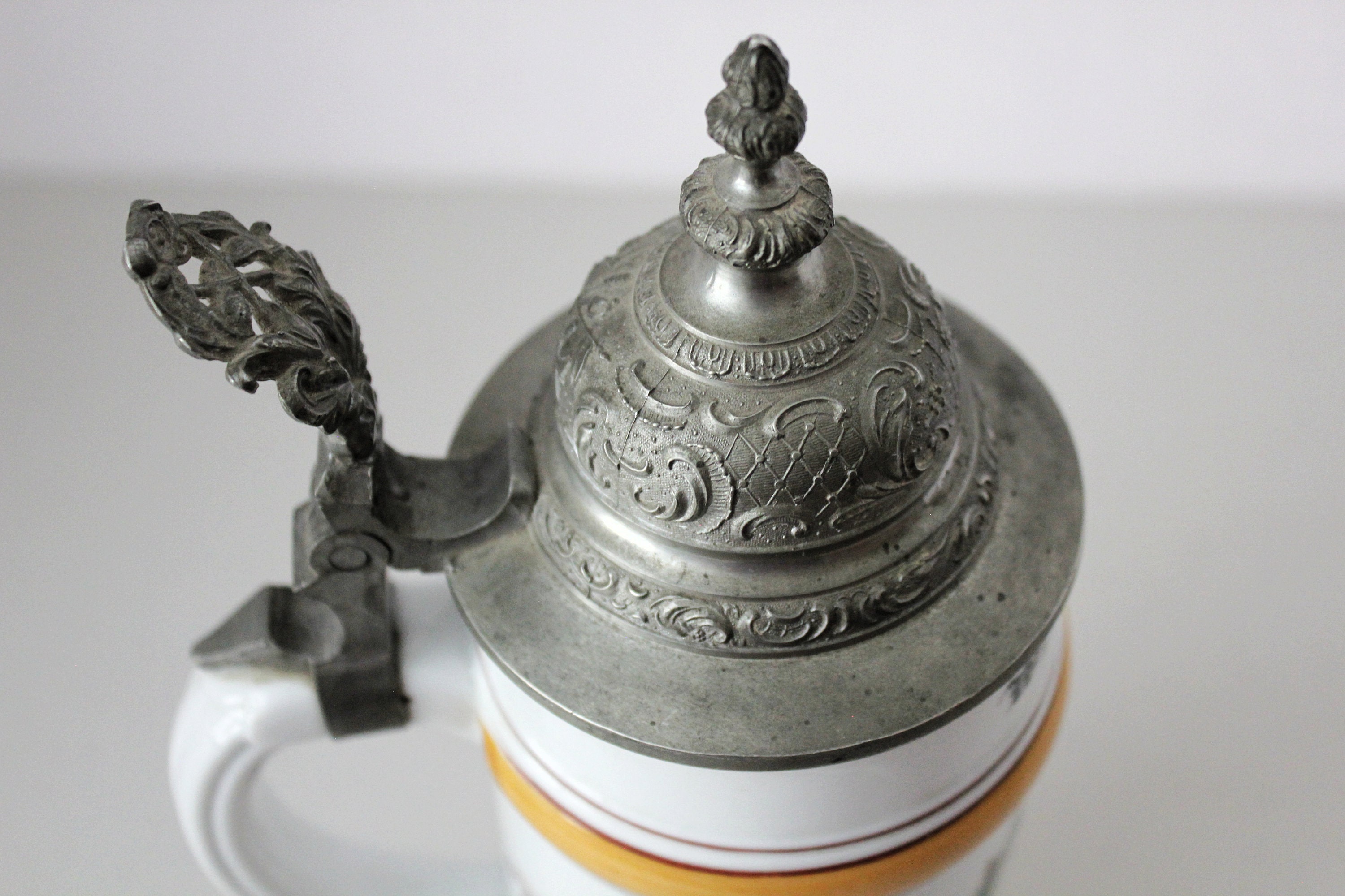 An antique occupational beer stein souvenir from the early 1900s. There is a date of 1905 on the stein. The lid is metal and the rest of the stein is ceramic.