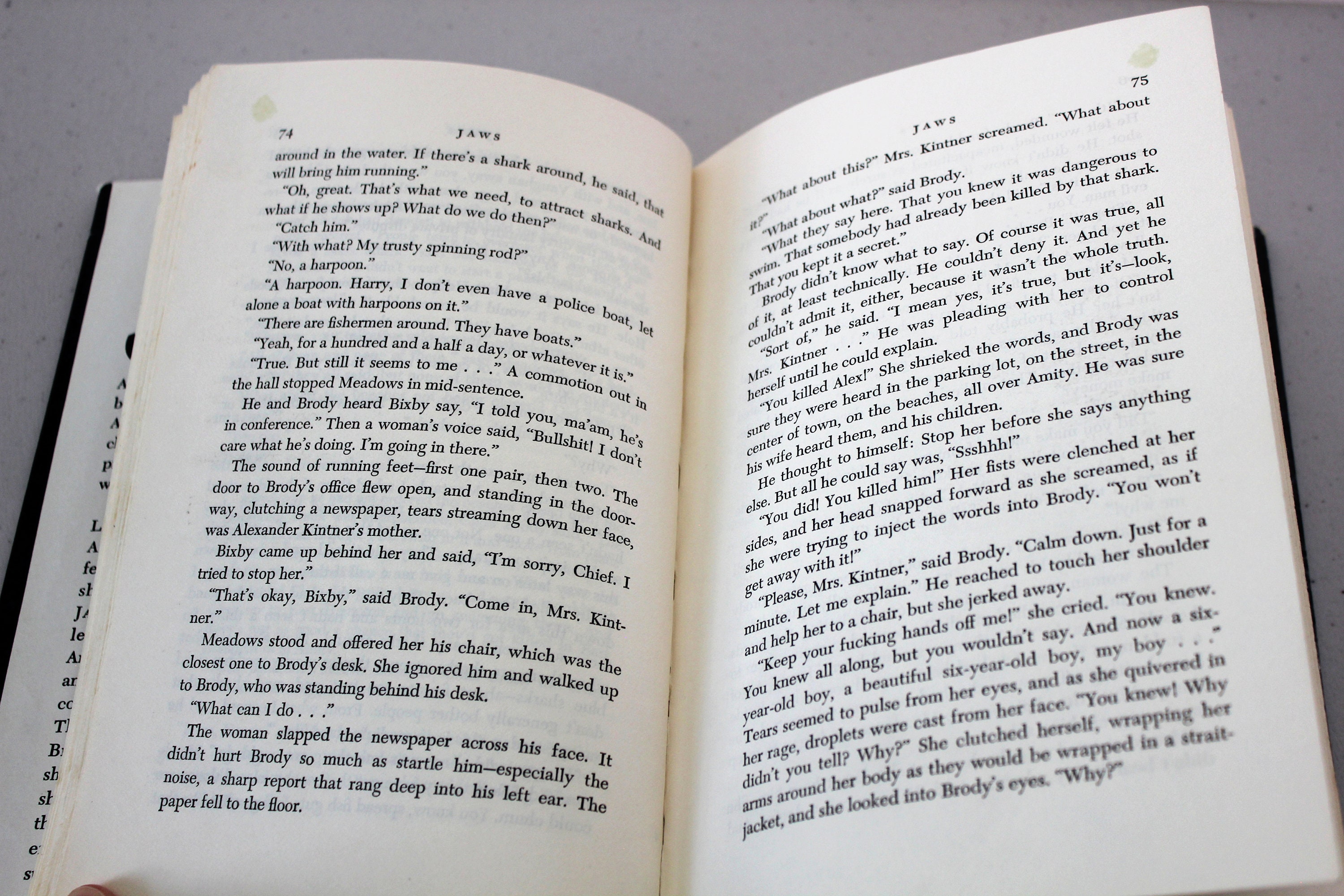 Jaws by Peter Benchley, A Novel. This is a Doubleday 1st Edition published in 1974. Has a gutter code of P7 as shown.