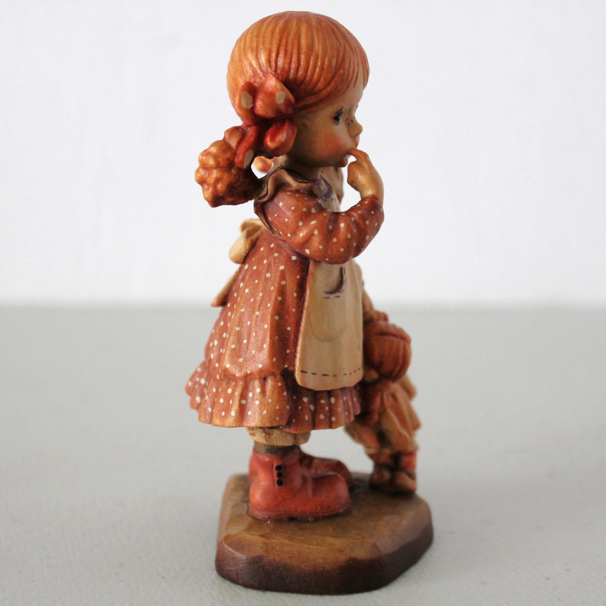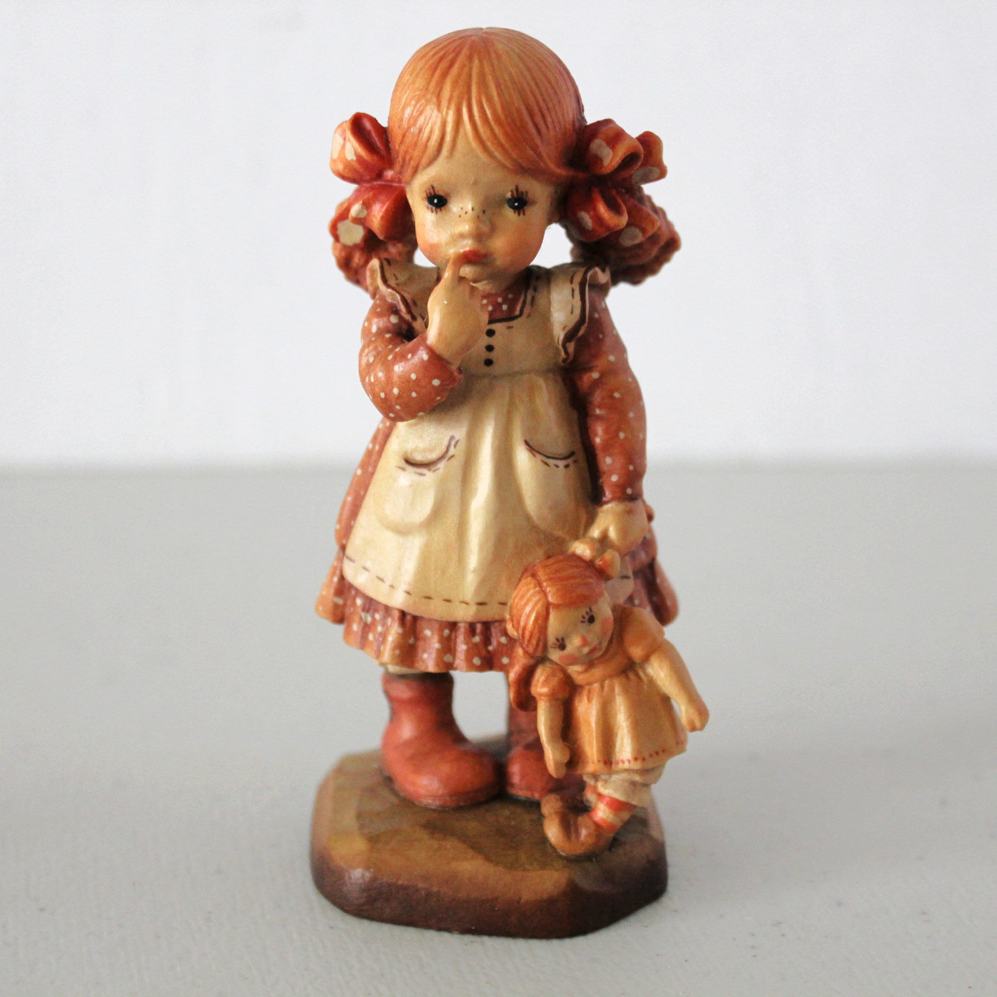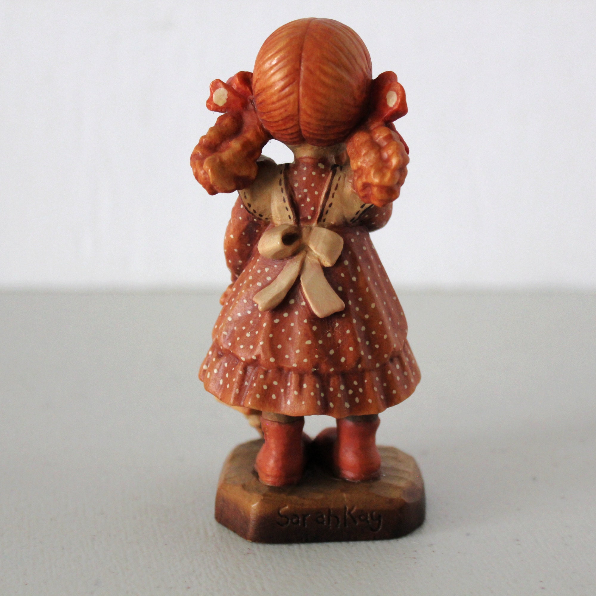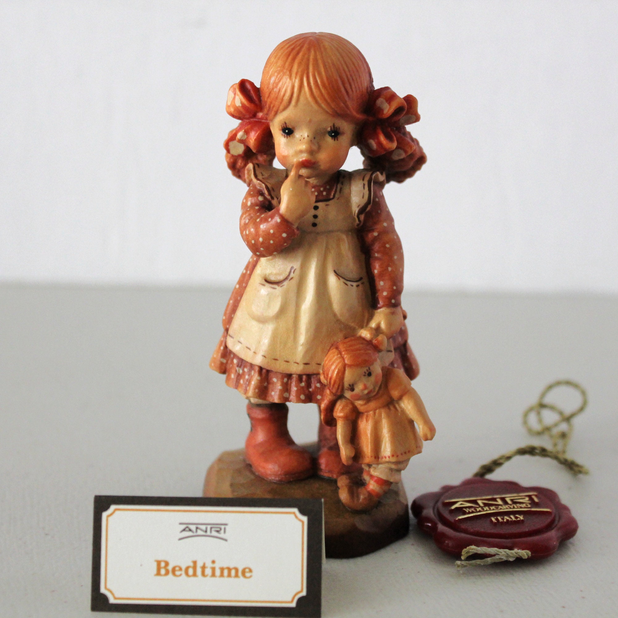 A vintage ANRI Valentine Italy figurine by Sarah Kay titled Bedtime. Little girl with doll carved from wood. Comes with plastic tag and her card.