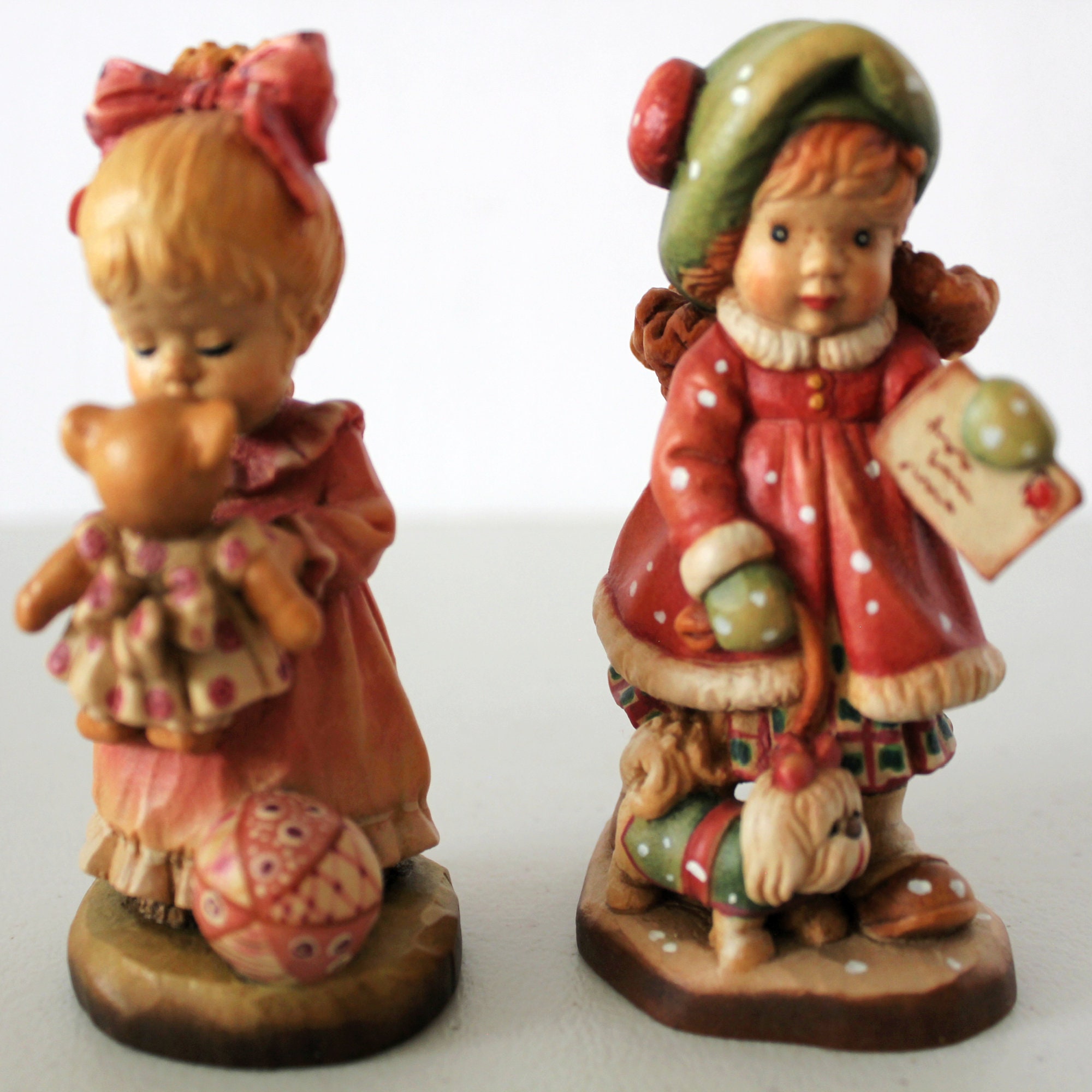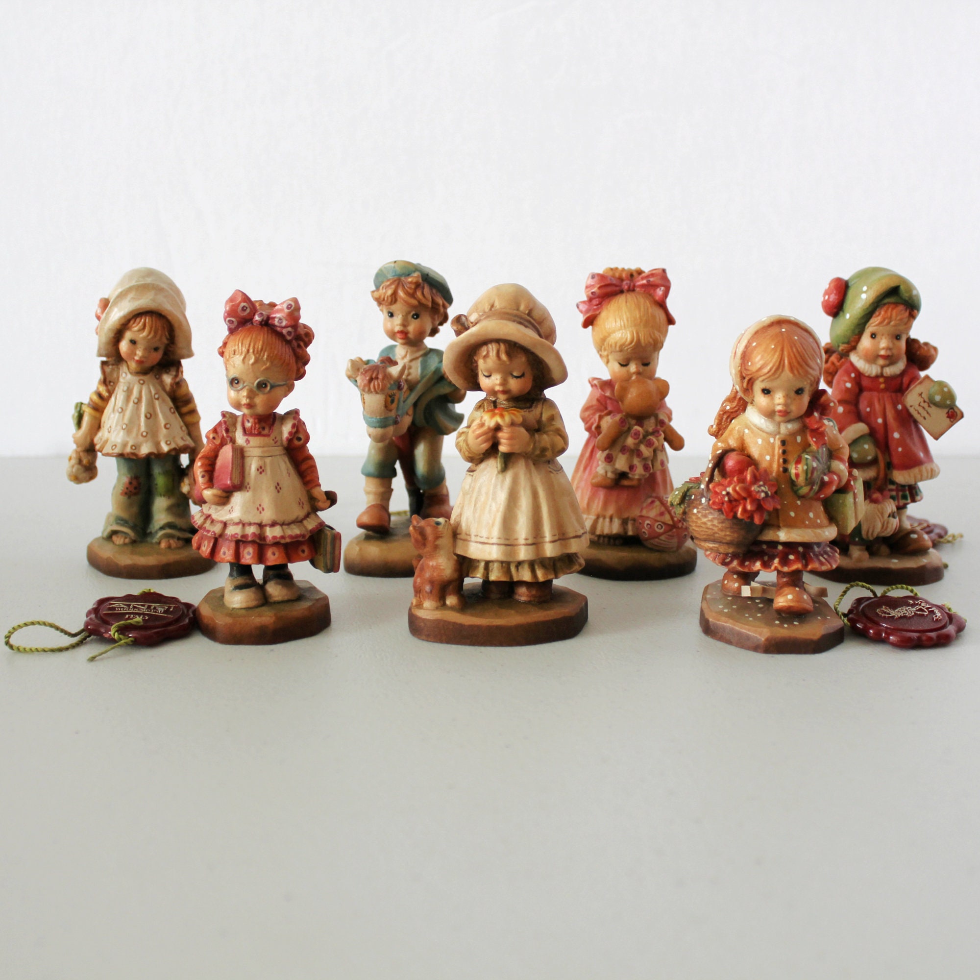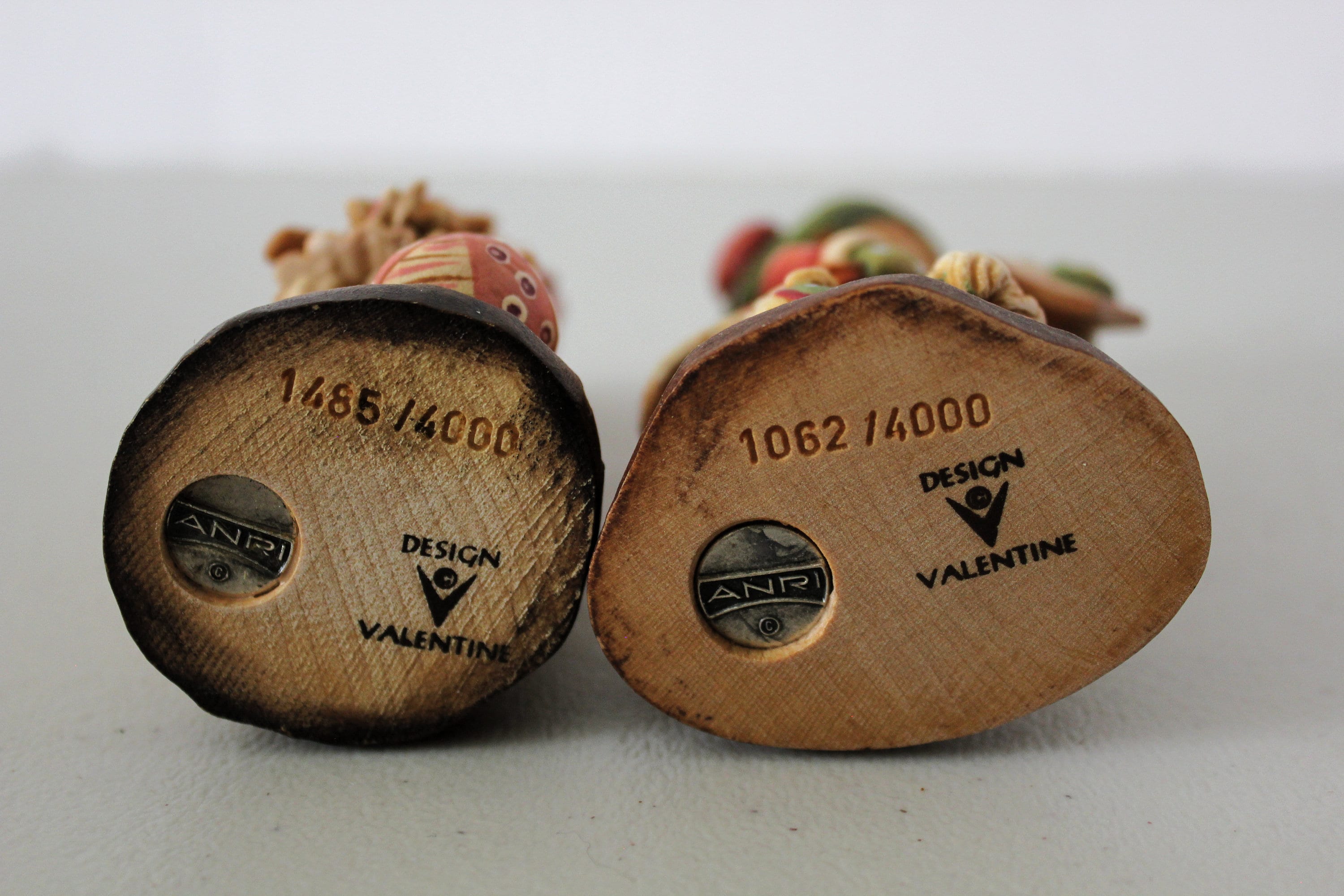 A lot of 7 different vintage ANRI Valentine Design Italy figurines by Sarah Kay. Carved from wood and all but one have an engraved number on the bottom as shown and also have a penciled number starting with 57. All include the plastic tag. Three have a Jobin Switzerland tag on the bottom.