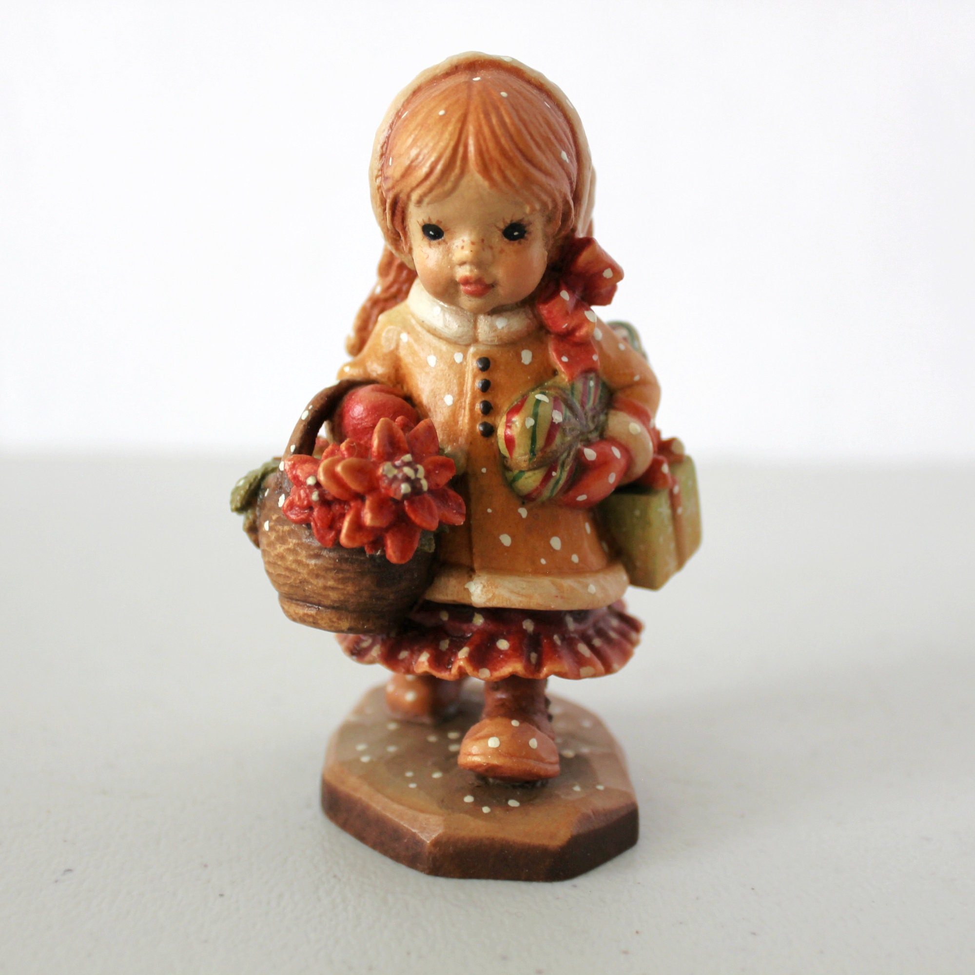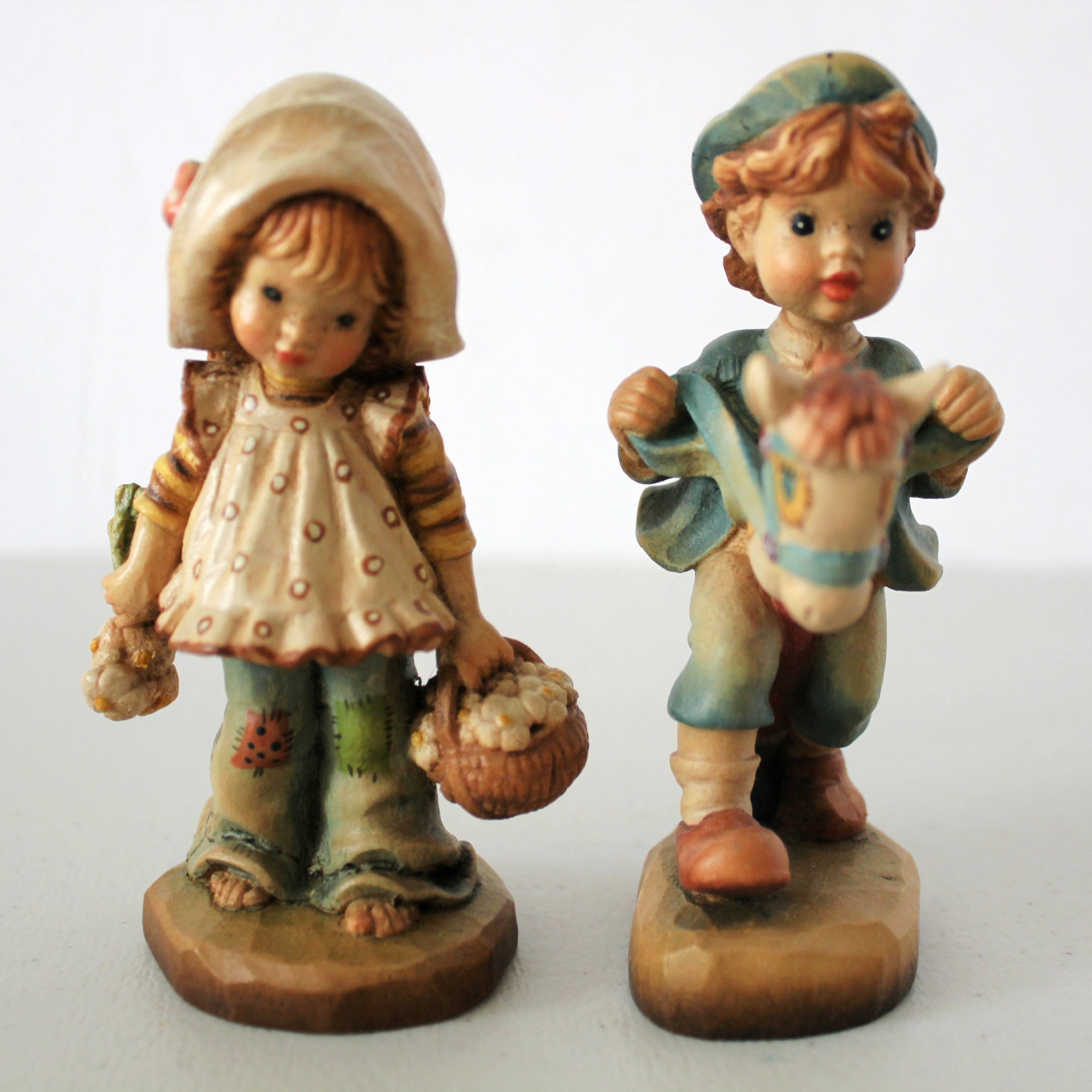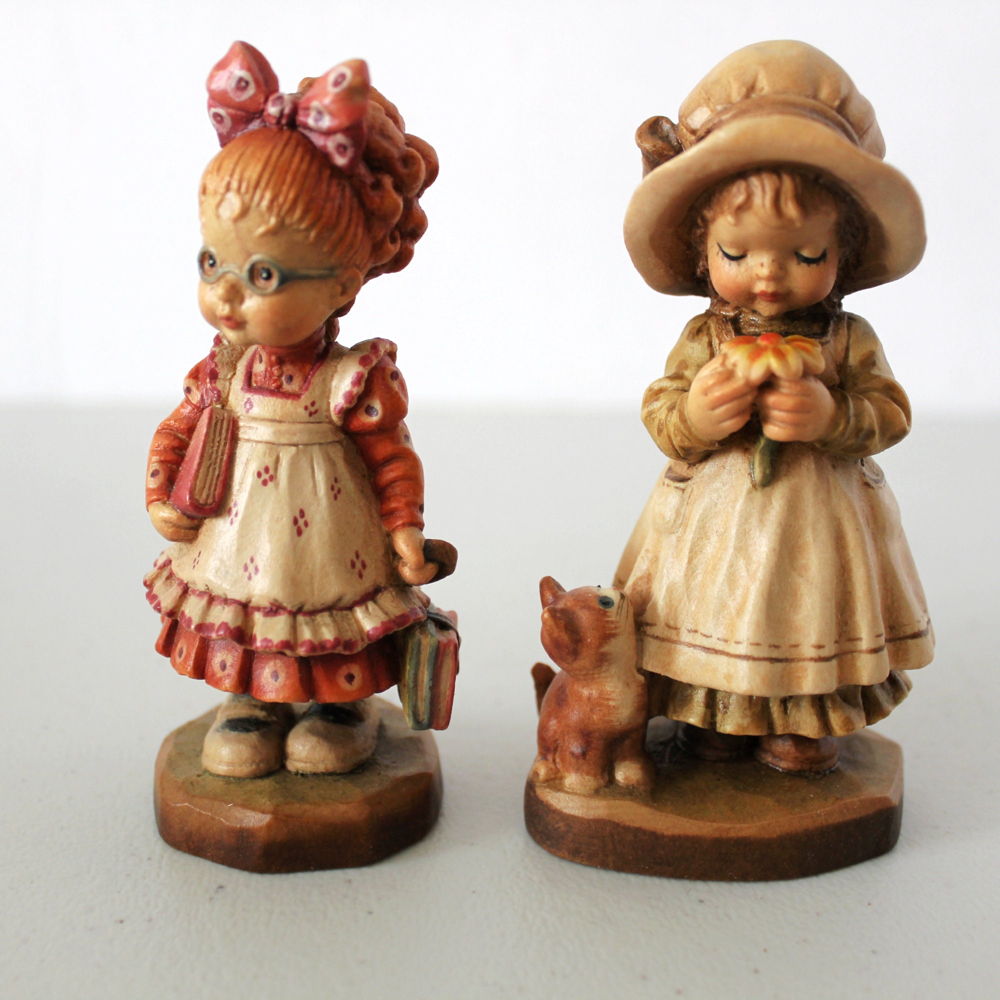 A lot of 7 different vintage ANRI Valentine Design Italy figurines by Sarah Kay. Carved from wood and all but one have an engraved number on the bottom as shown and also have a penciled number starting with 57. All include the plastic tag. Three have a Jobin Switzerland tag on the bottom.