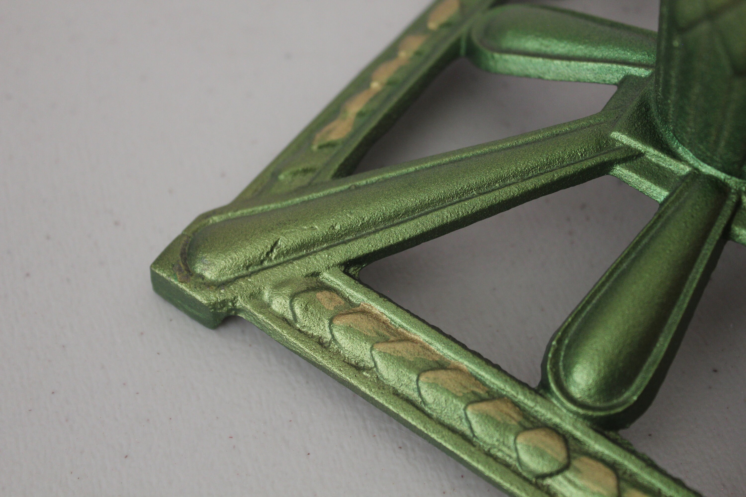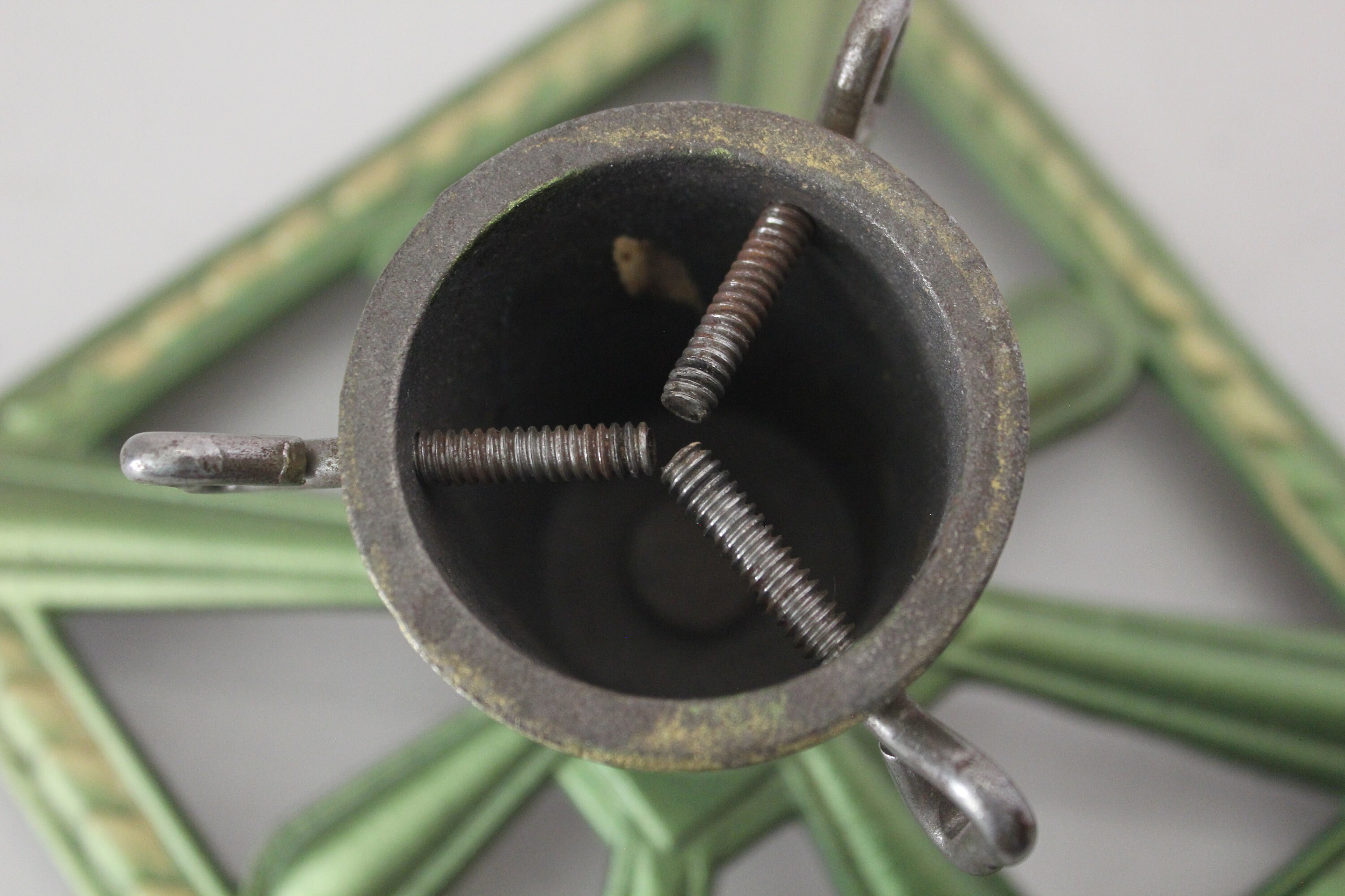 A vintage 1930s small, mini Christmas tree stand made from cast metal. Painted green with gold accents.