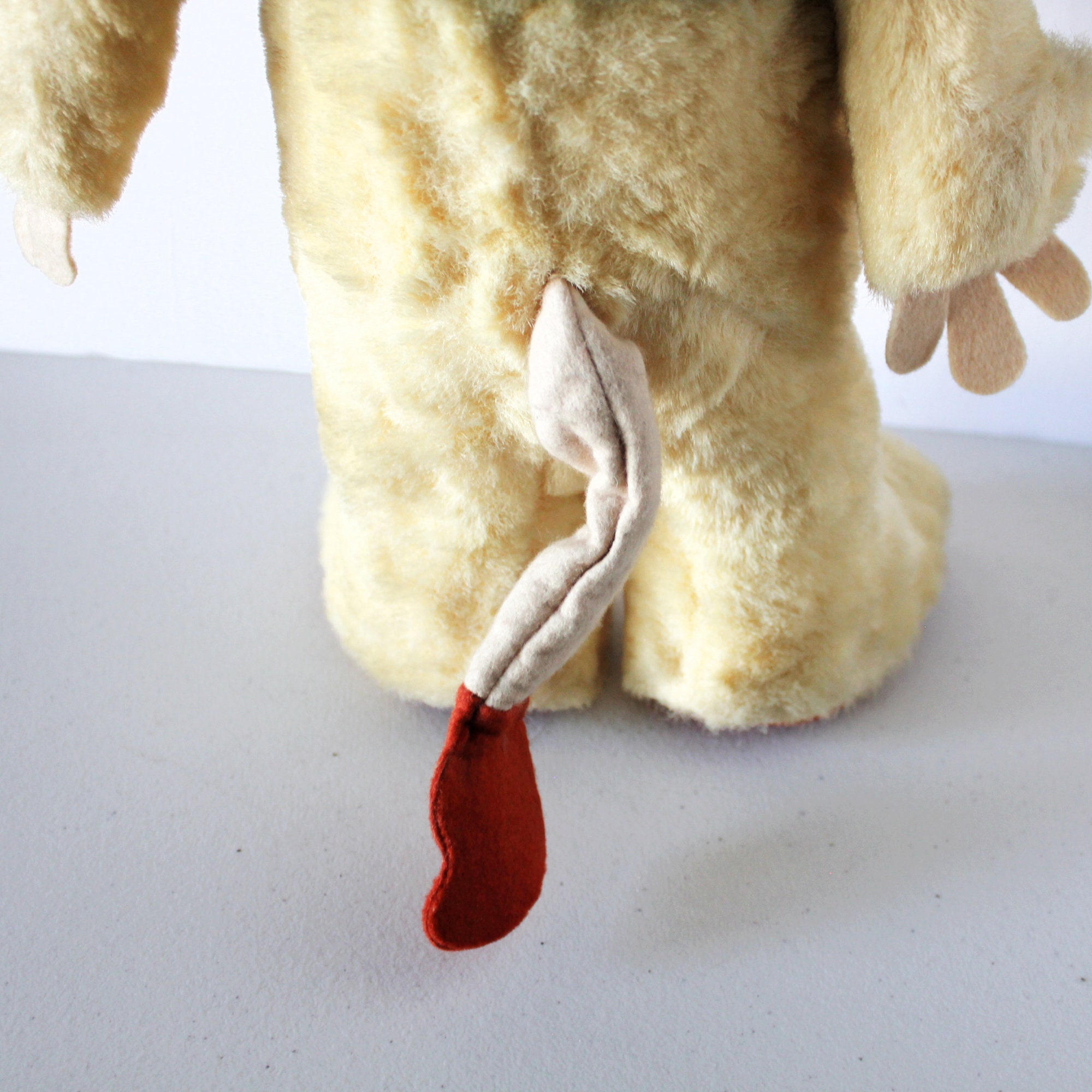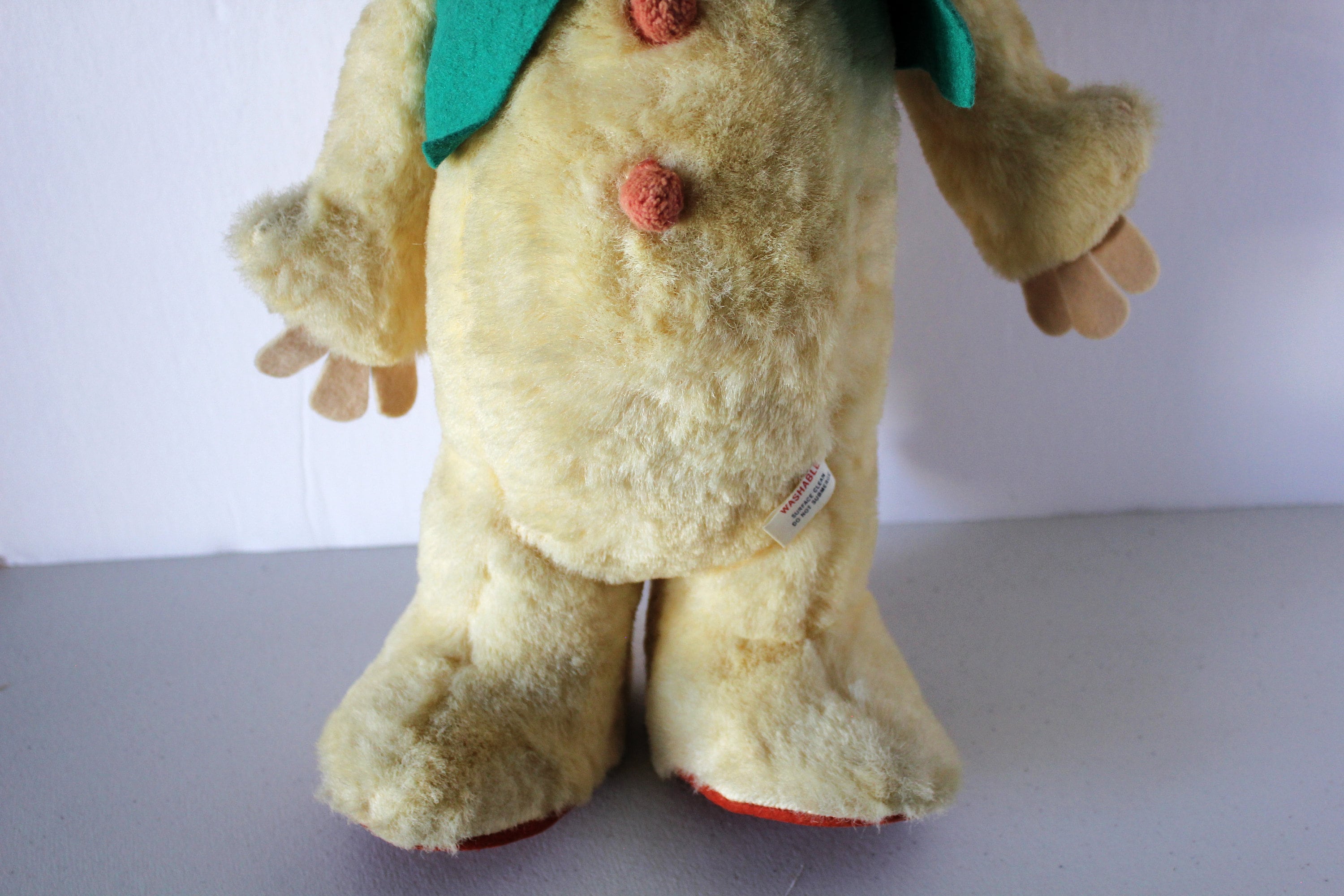 The toy is in pretty good shape for its age. There is some minor soiling on the rubber face and some color missing from the nose area and maybe the tongue edges. The bottom of one foot as a few worn spots in the felt.