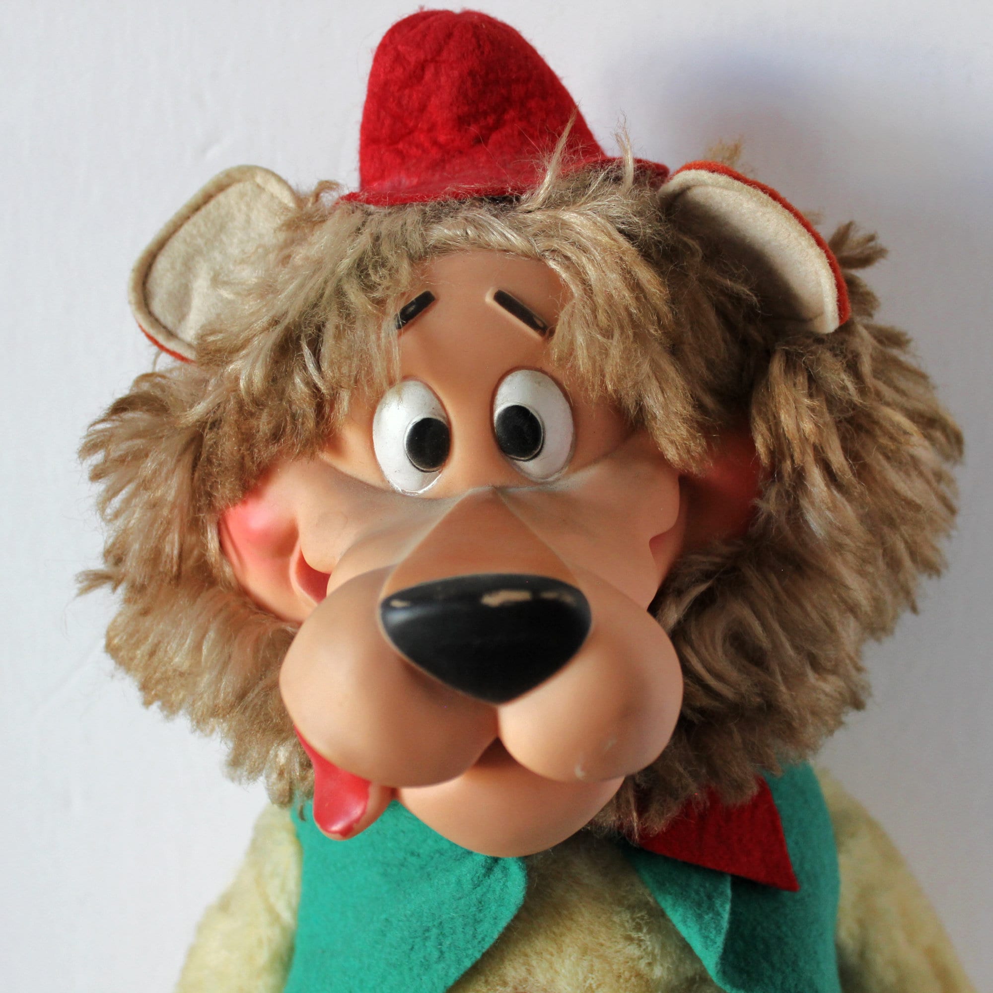 A vintage 1962 Ideal plush and rubber Libby the Lion stuffed animal toy from the character on the tv show Lippy the Lion and Hardy Har Har. Rubber head and stiff plush body with felt clothing, hat, ears, fingers, tail, feet bottoms and a furry head.