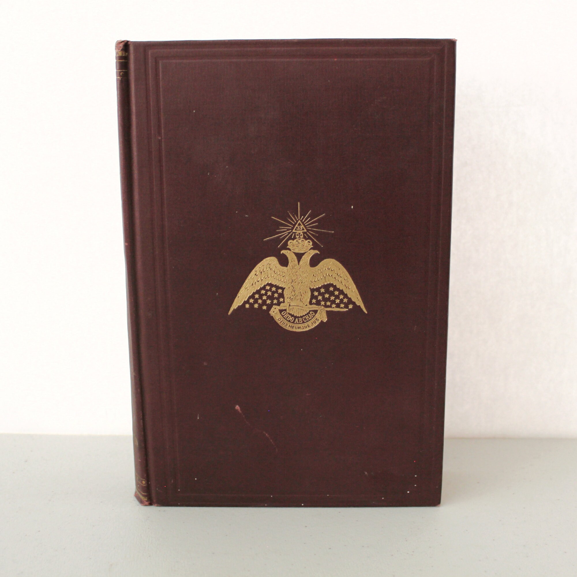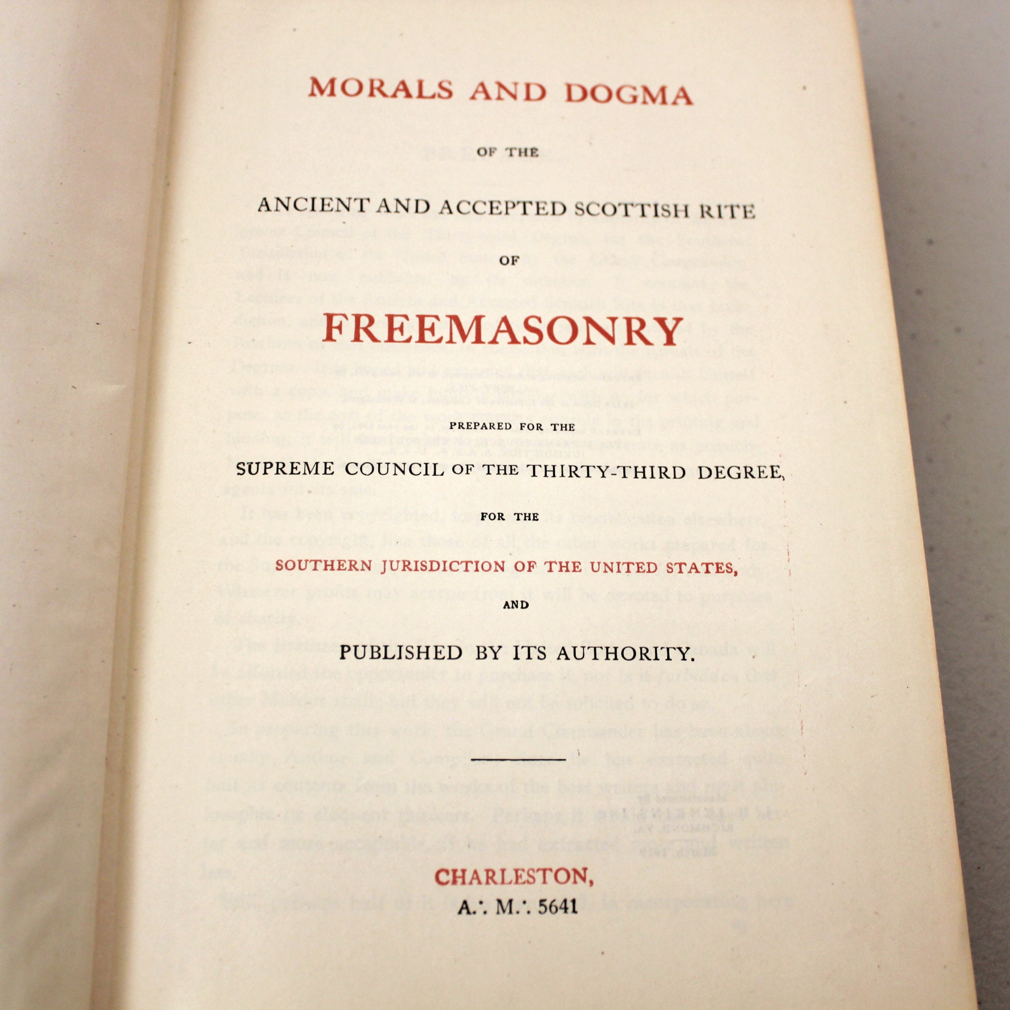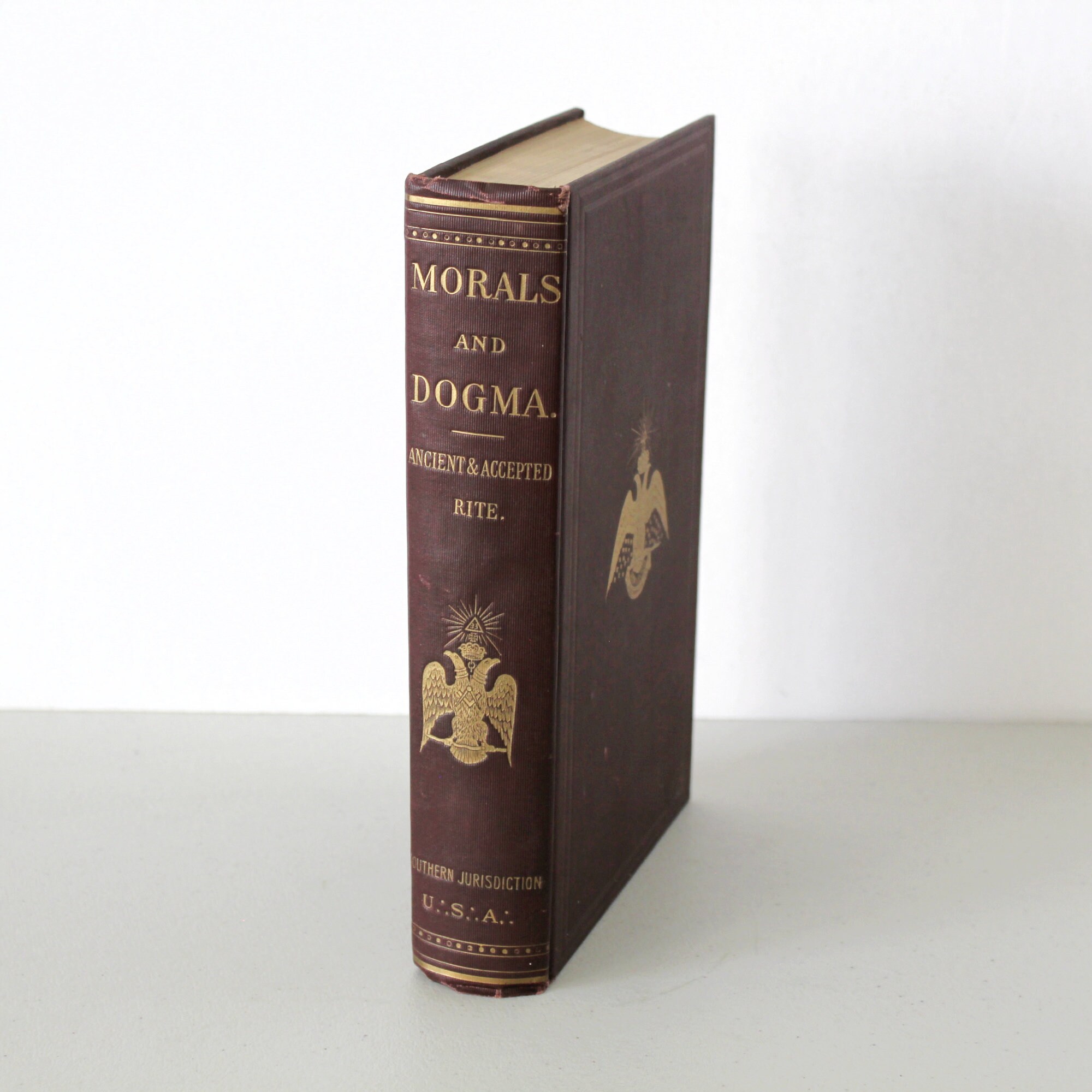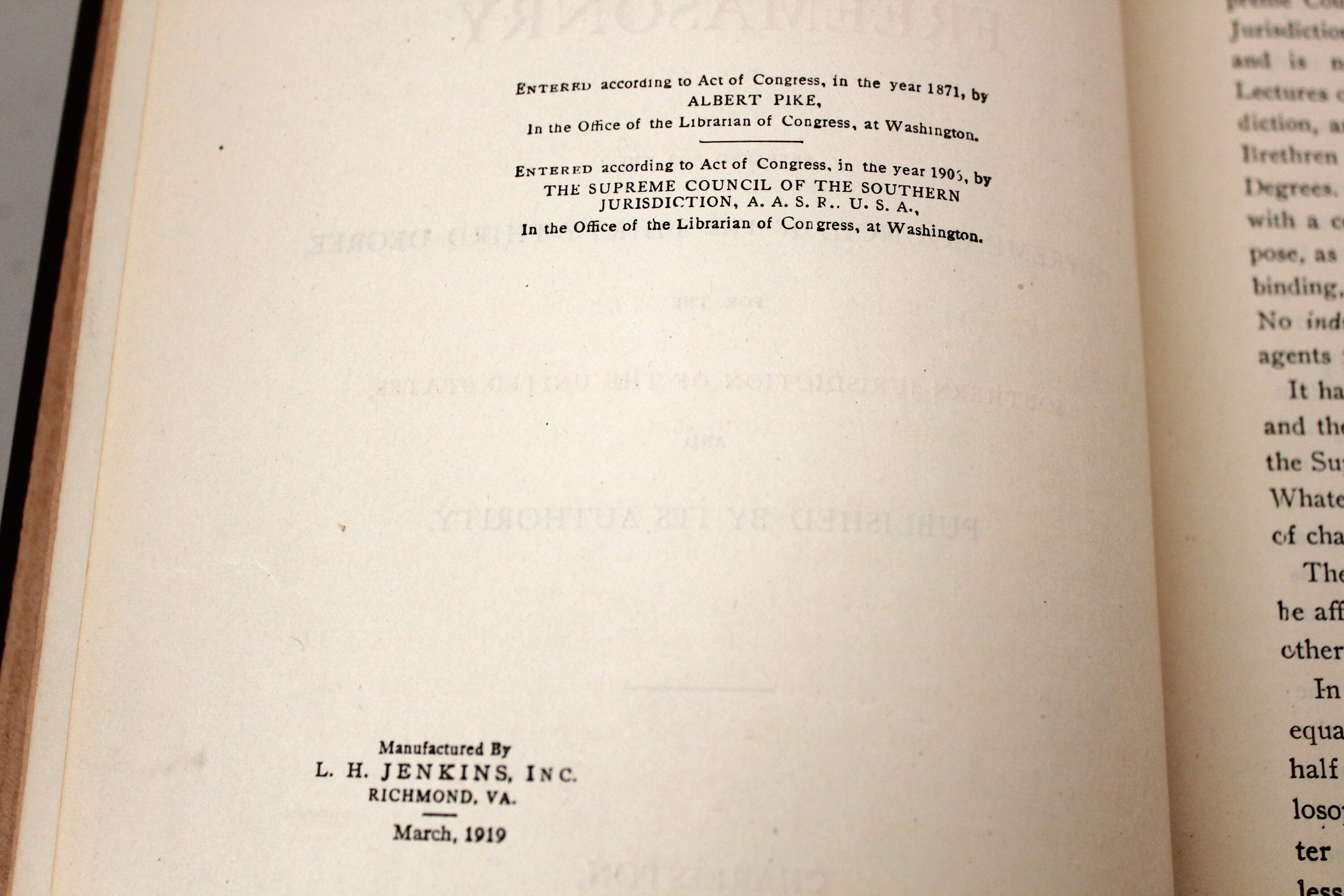 An antique hard cover 1919 printing of Morals and Dogma of the Ancient and Accepted Scottish Rite of Freemasonry. Southern Jurisdiction of the United States. States it was manufactured by L. H. Jenkins, Inc. in March 1919.
