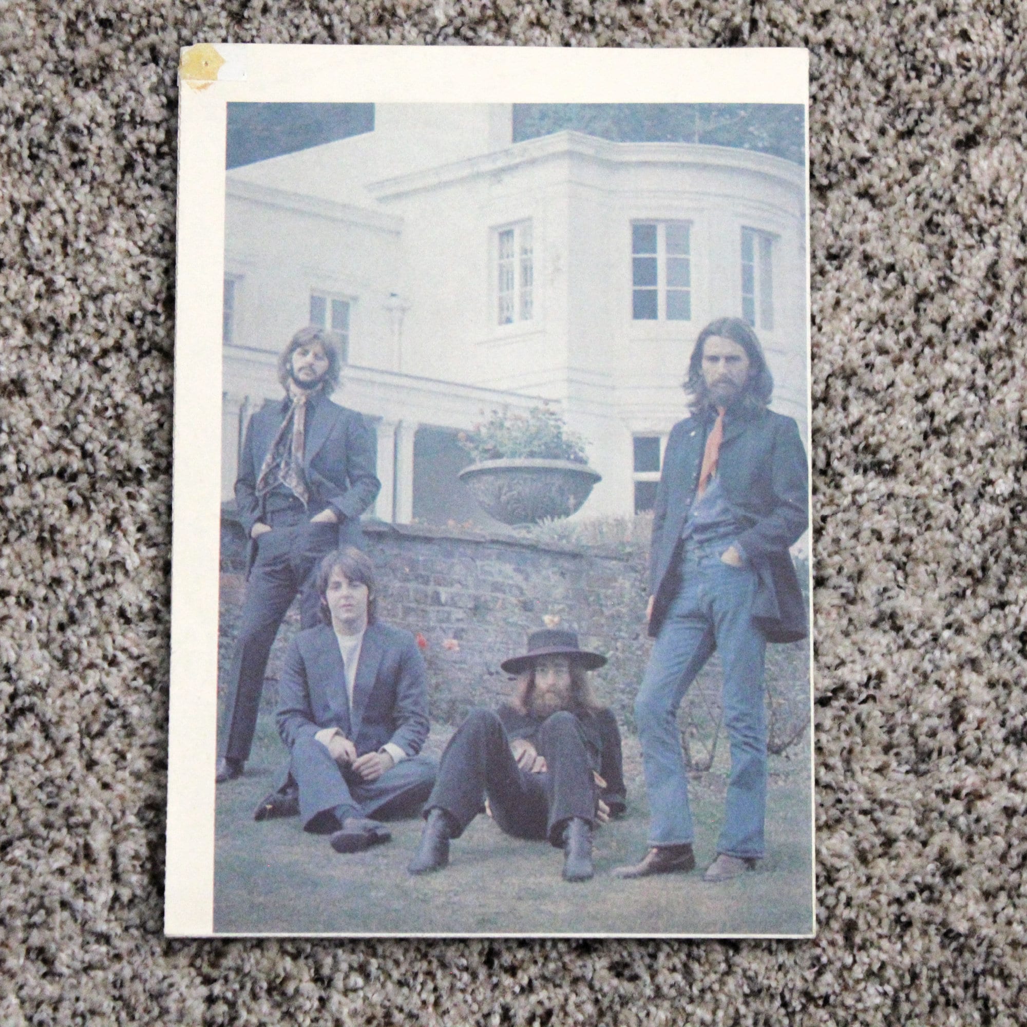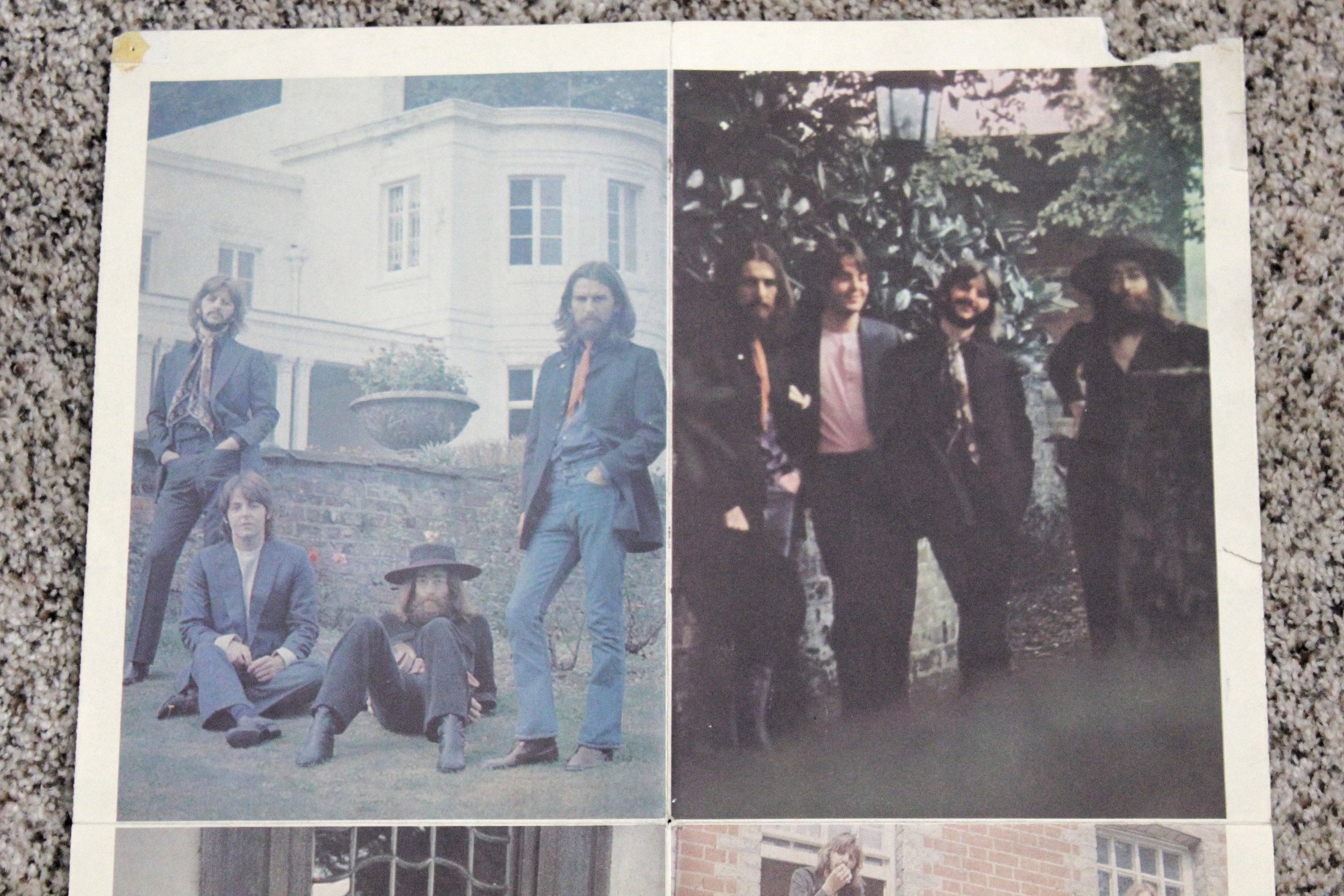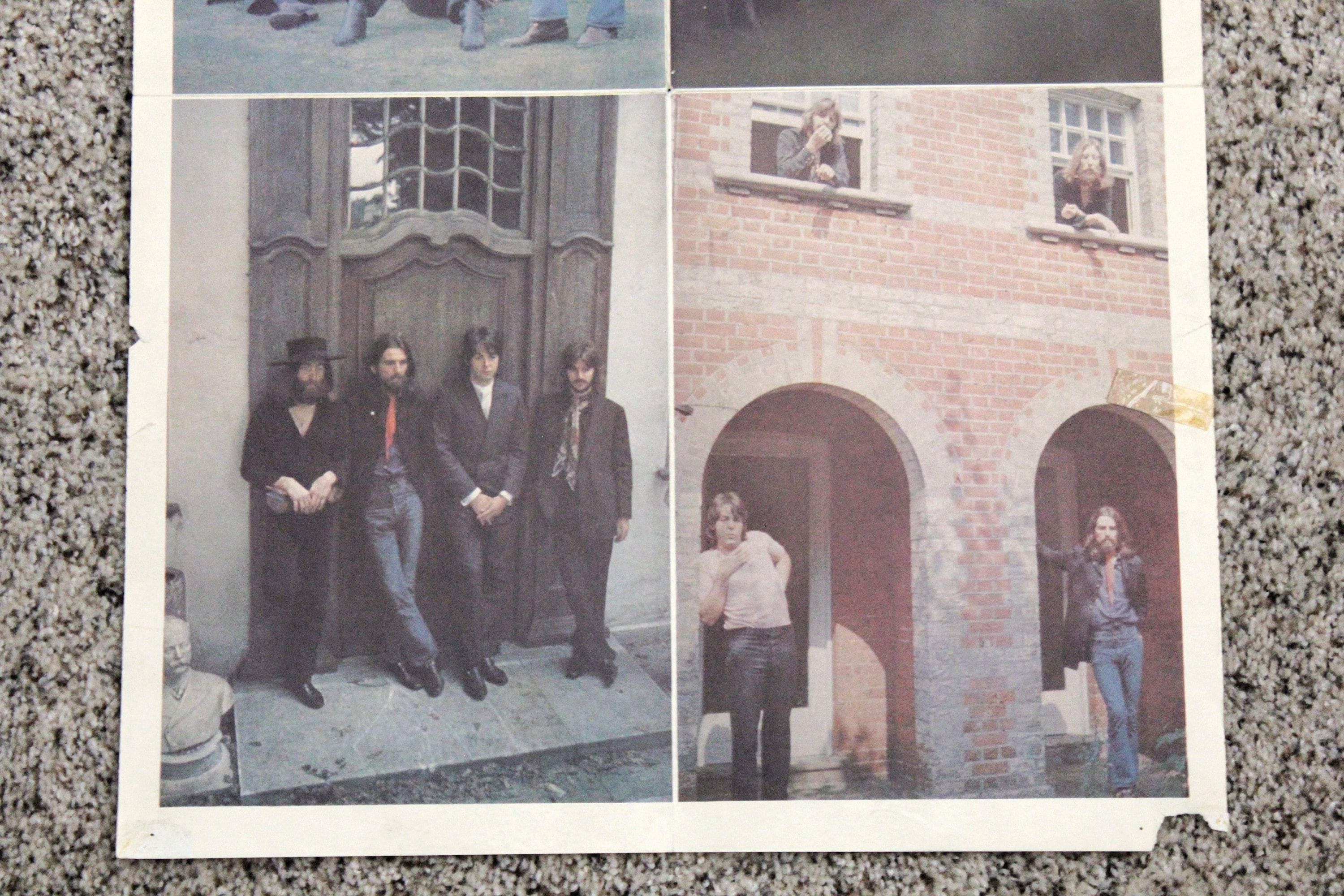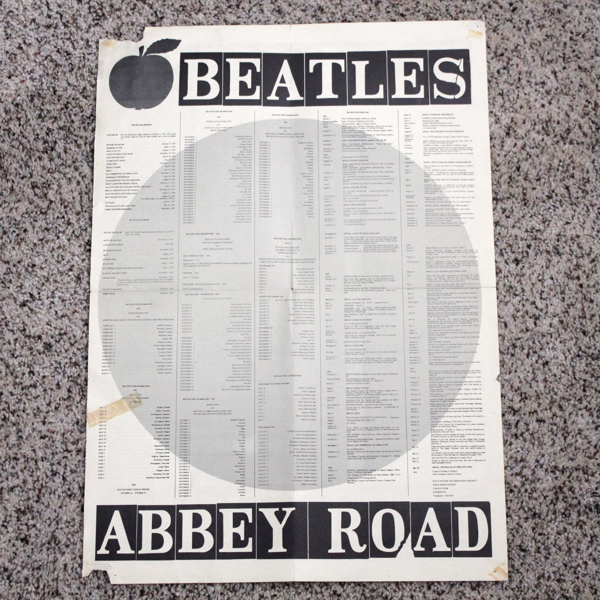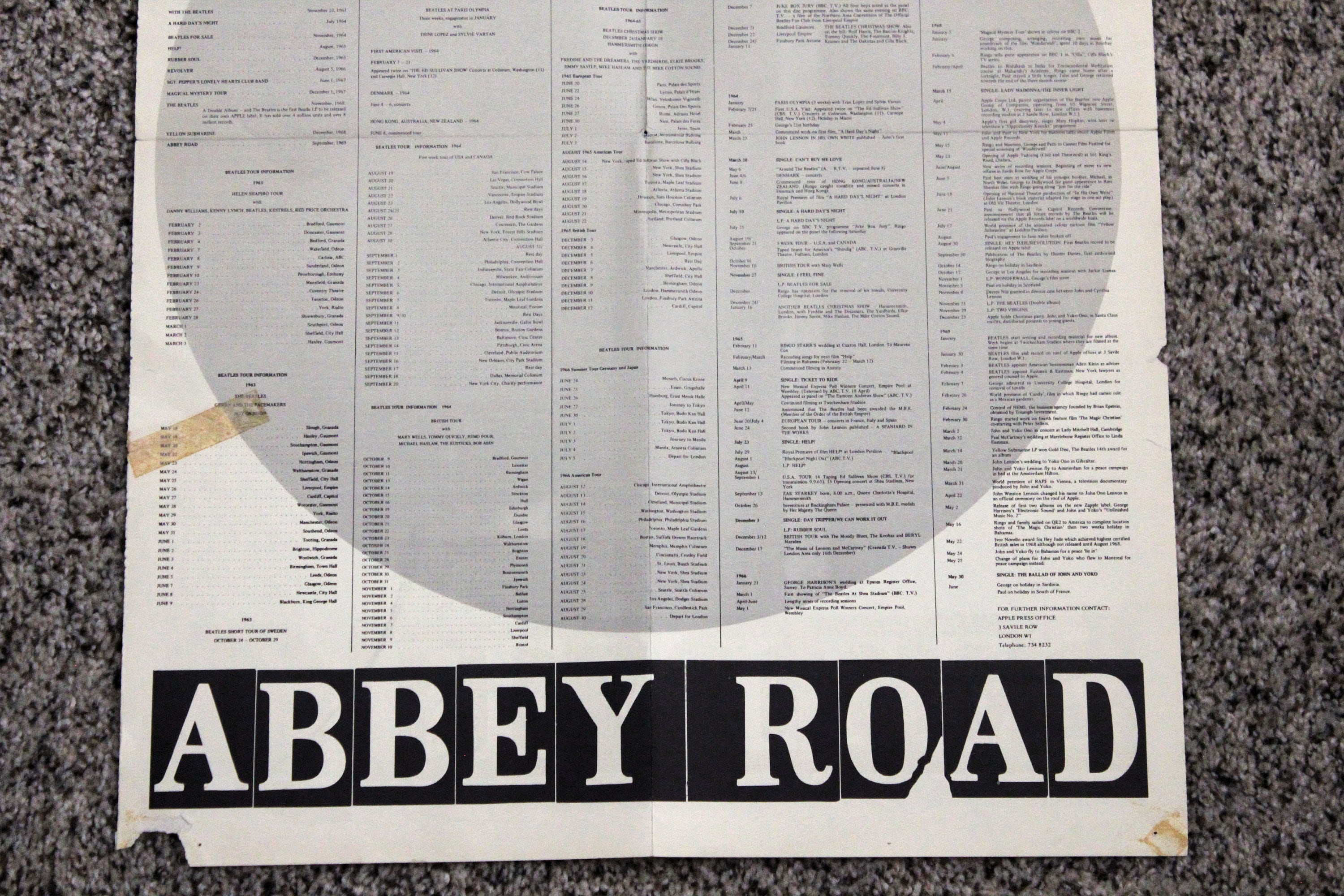 This is a Beatles Abbey Road promo poster from 1969. It has 4 group photos on one side and the other has a list of their singles, albums and tour information by year from 1963 through half of 1969.