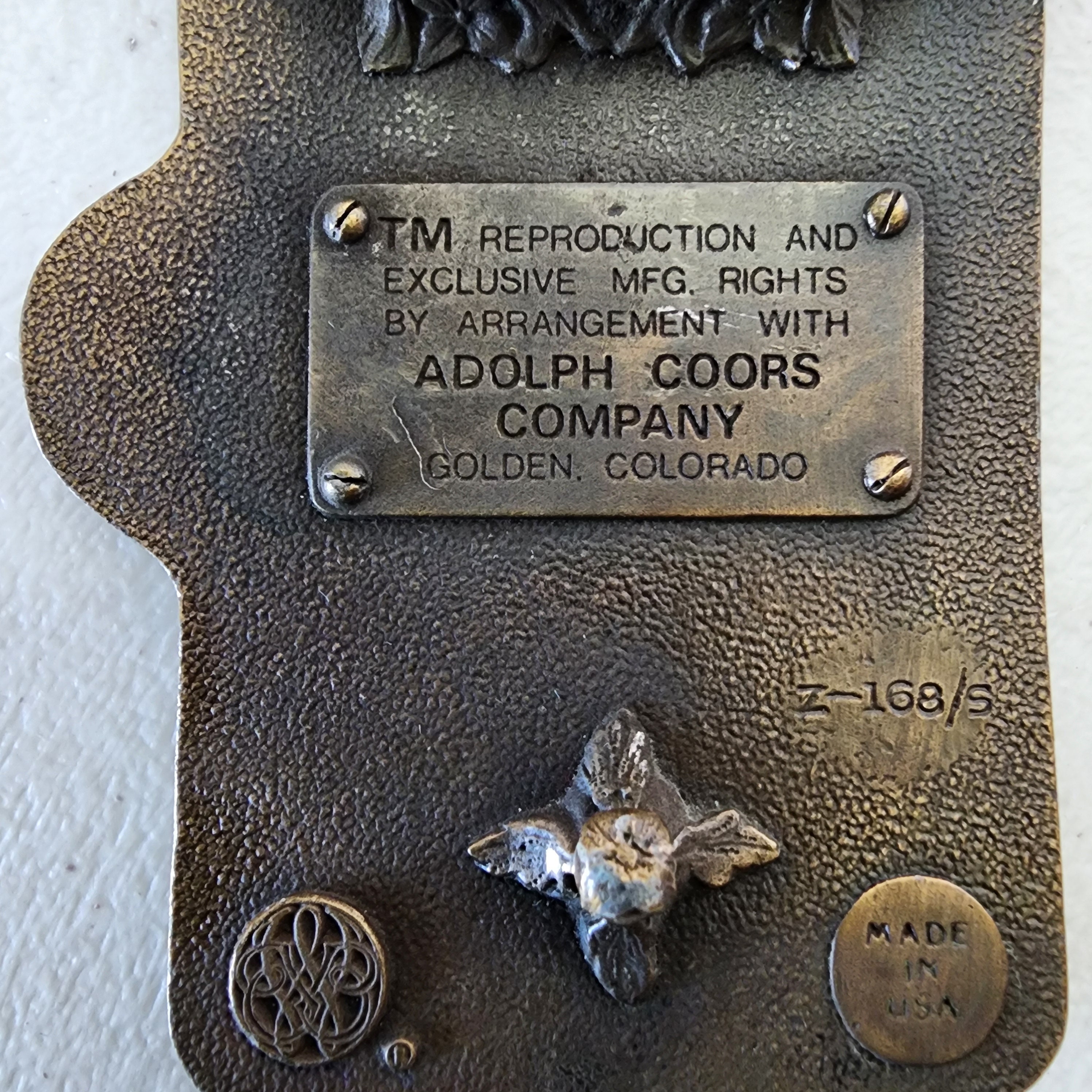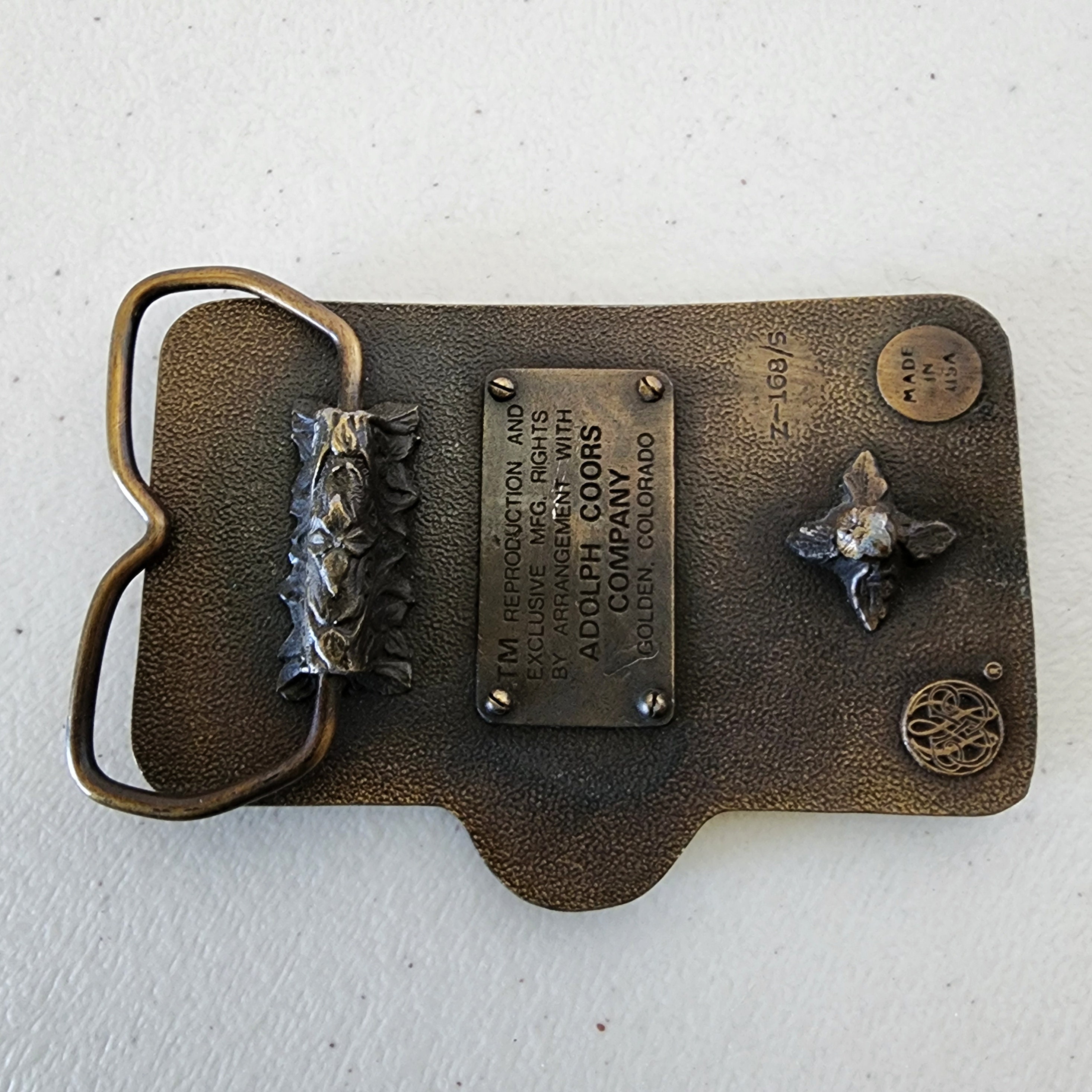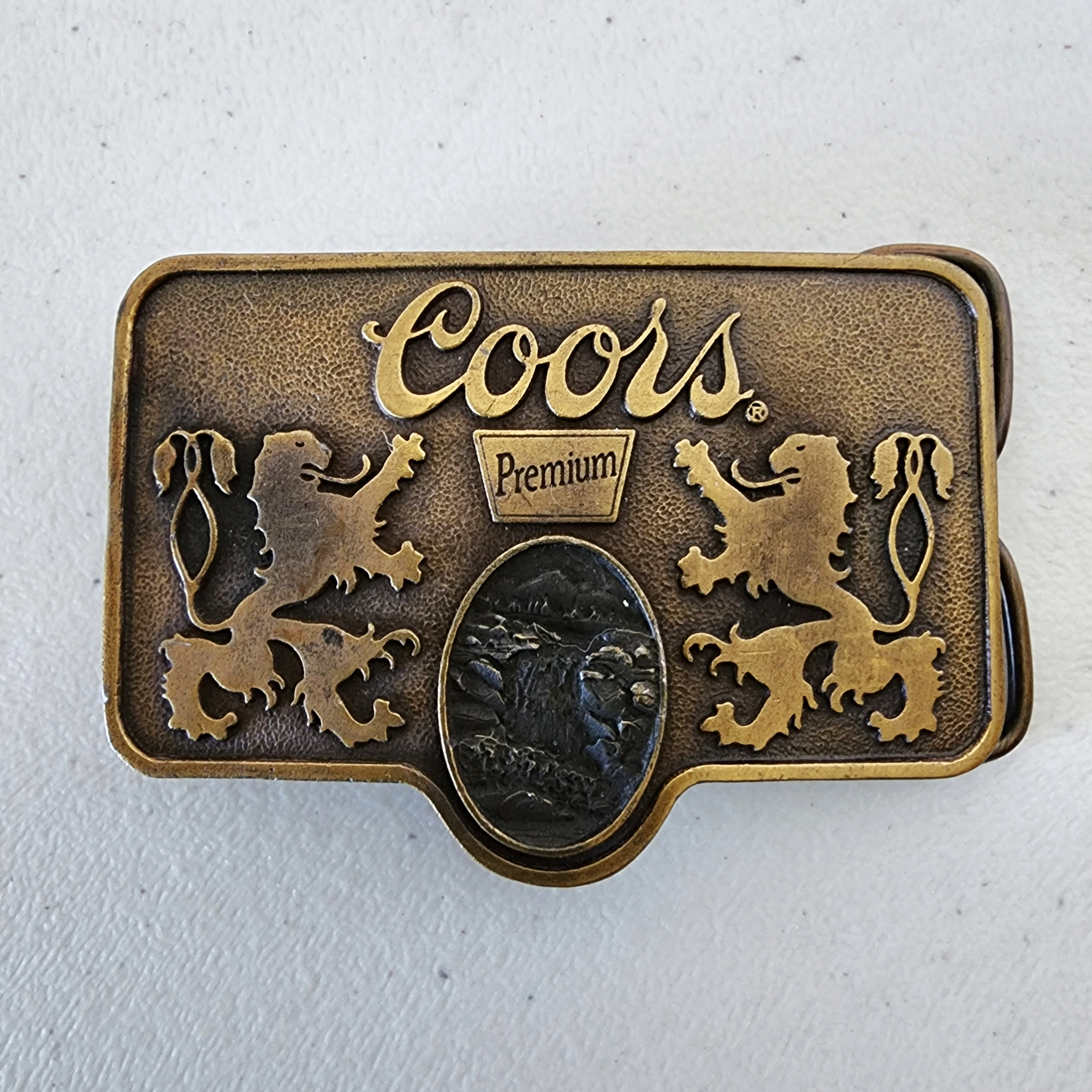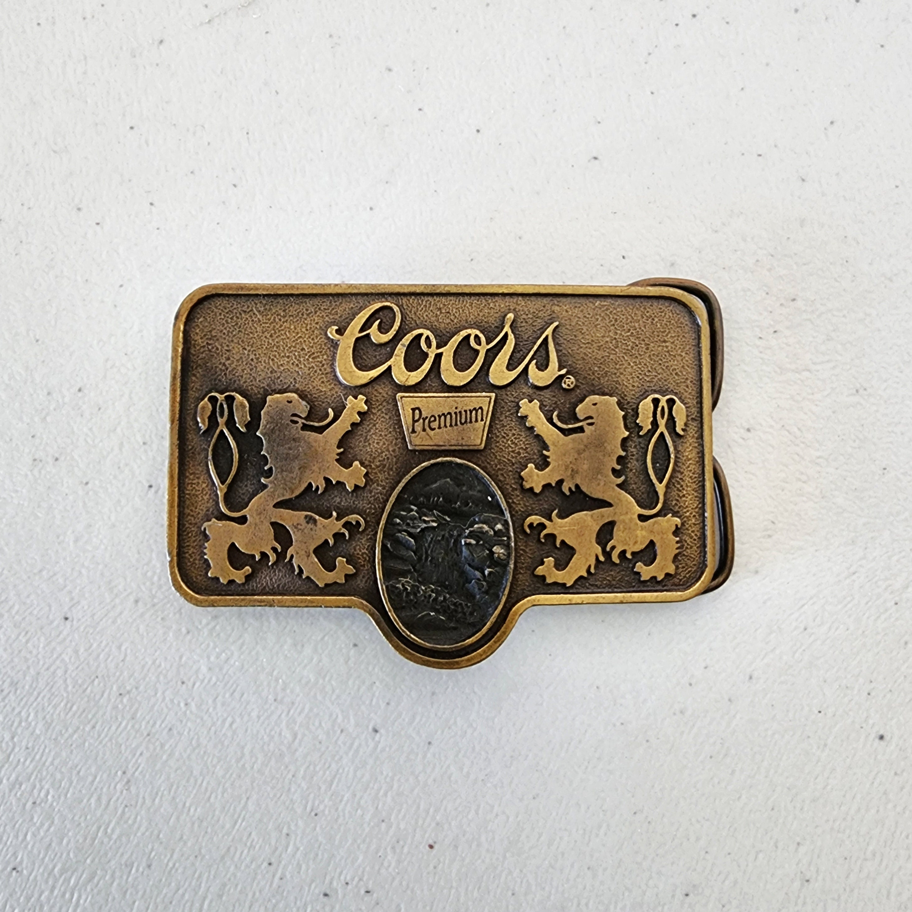 A vintage 1970s Coors Premium beer belt buckle. Made in the U.S.A. Plate on the back reads TM reproduction and exclusive mfg rights by arrangement with Adolph Coors Company Golden Colorado.