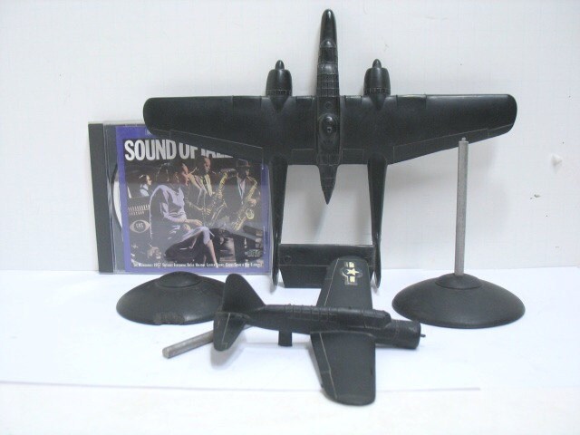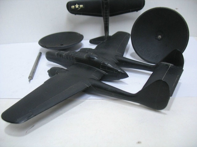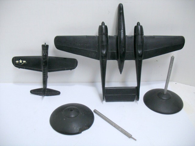 Lot of 2 World War 2 ID Spotter Recognition Airplane models. The P-61 Black widow is marked on wings: U.S.A. P-61 (c) / 2-44 and is about 11" across the wings. It shows light wear with some scratching and scuffs but overall good condition, if it had props at one time it does not now, they are gone but it doesn't look like it did.