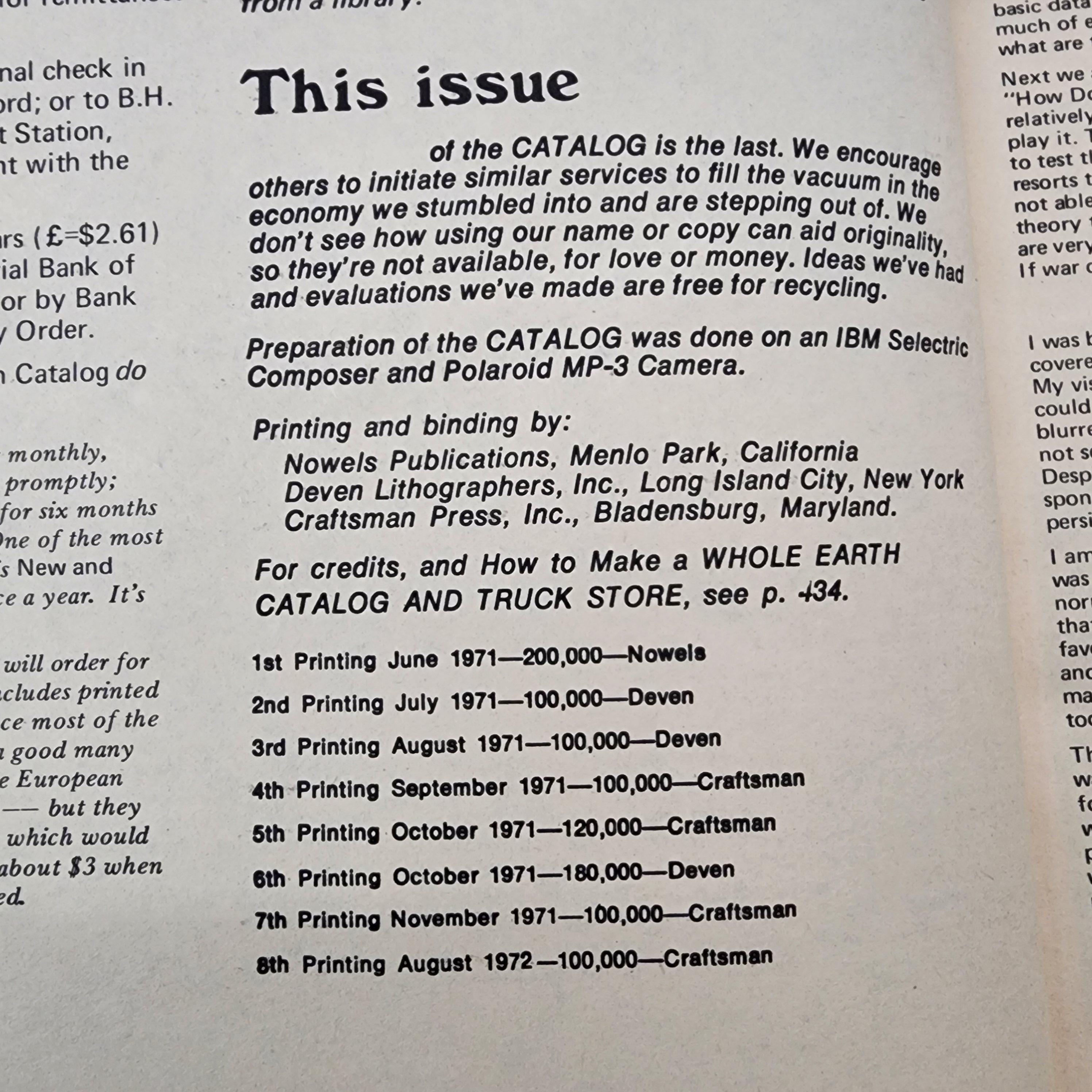 This is a vintage The Last Whole Earth Catalog, the updated 8th printing from August 1972. It was first printed in 1971 copyrighted by Portola Institute. The catalog is 447 pages and measures 10.75" x 14.5" tall. See all photos for sample pages.