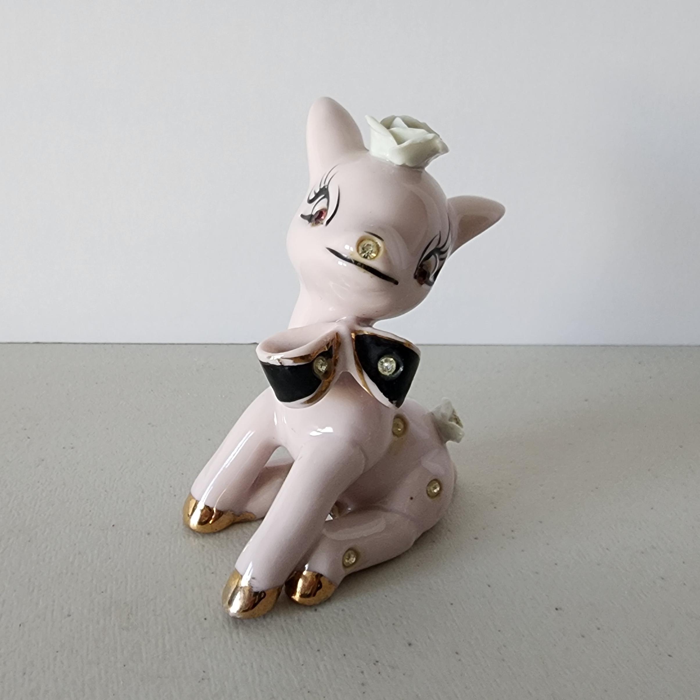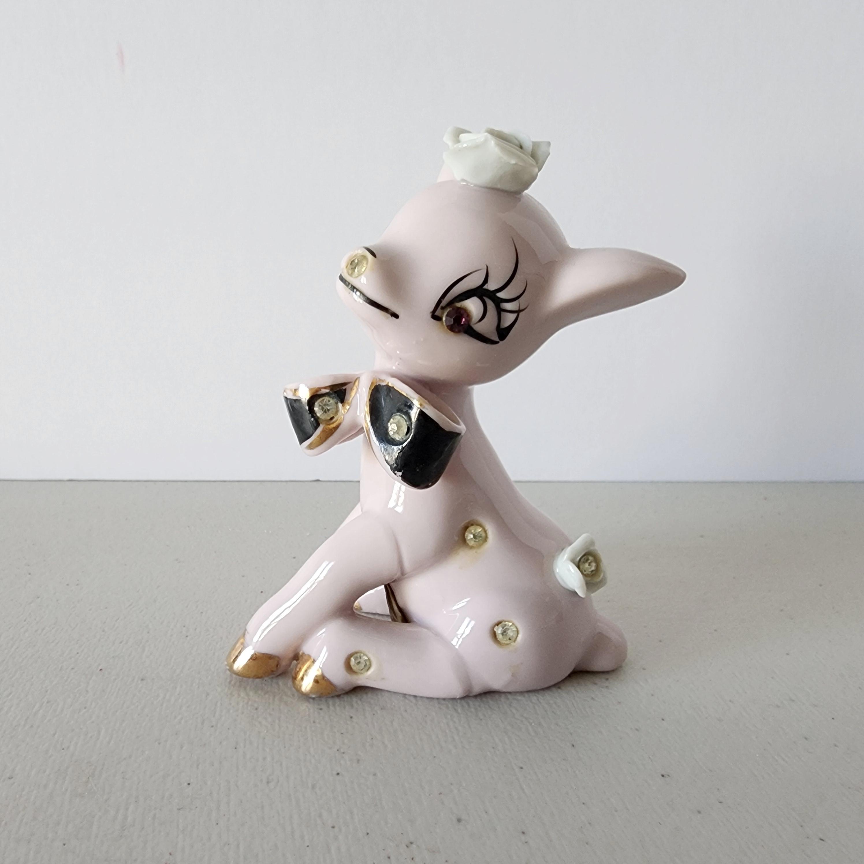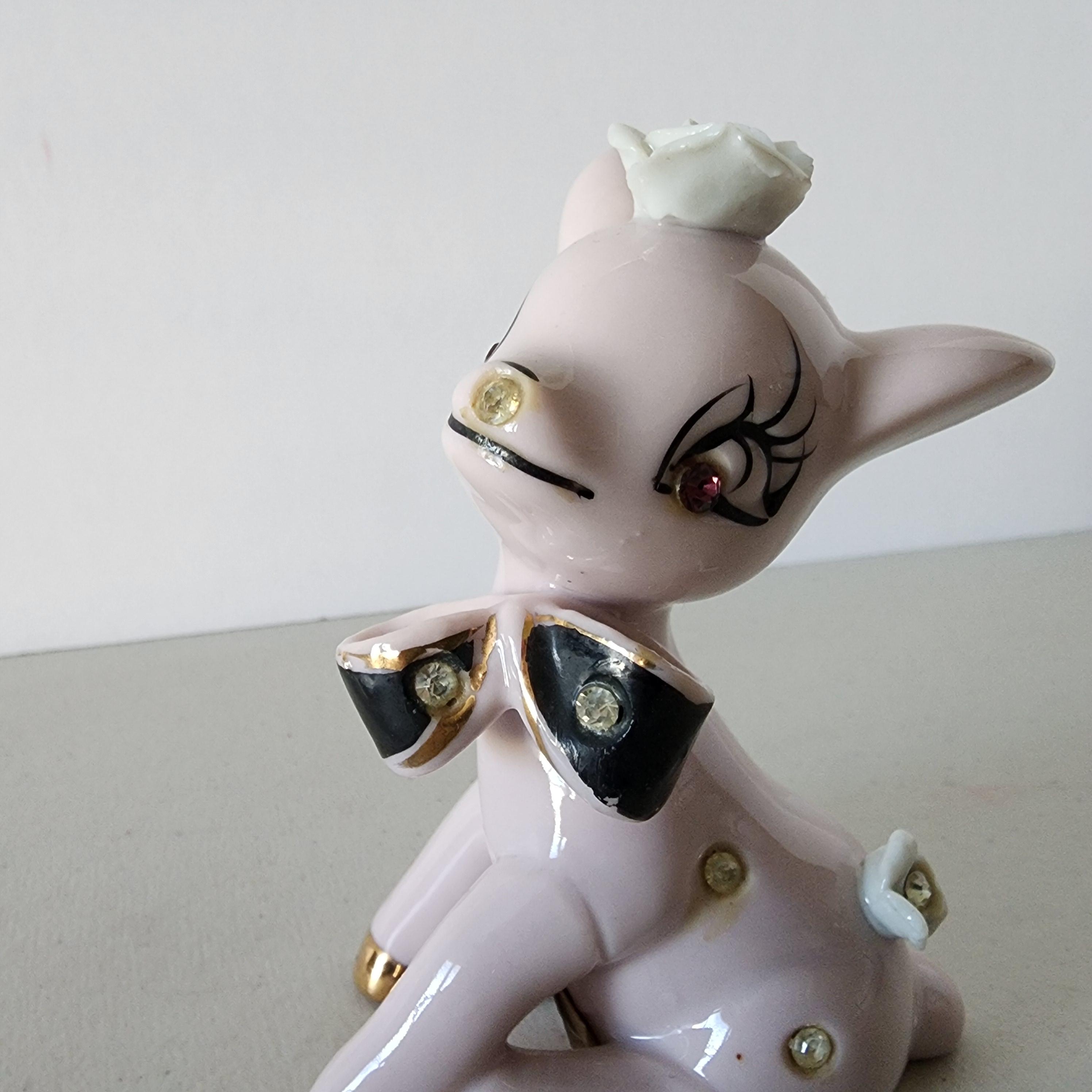 This is a vintage 1950s light lavender reindeer figurine with rhinestone accents. Wearing a black bow tie, flower on her head and back and gold hooves. It reminds me of Clarice from Rudolph The Red Nosed Reindeer. She has a Wales Made In Japan sticker on her underside.