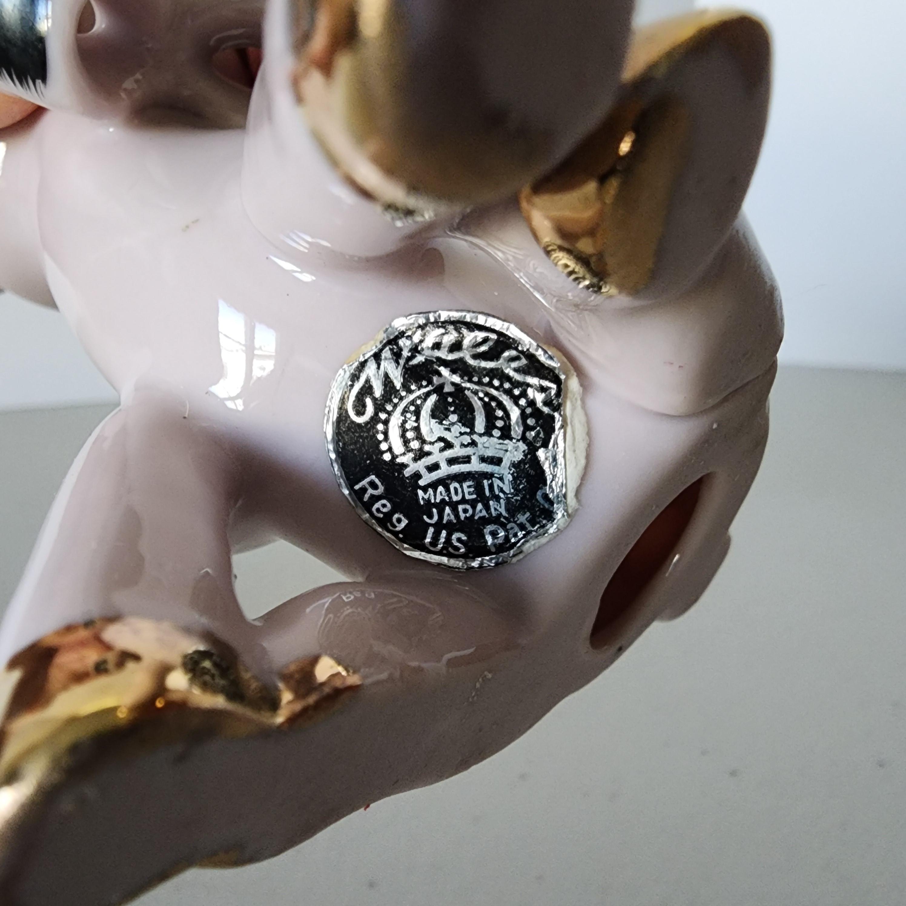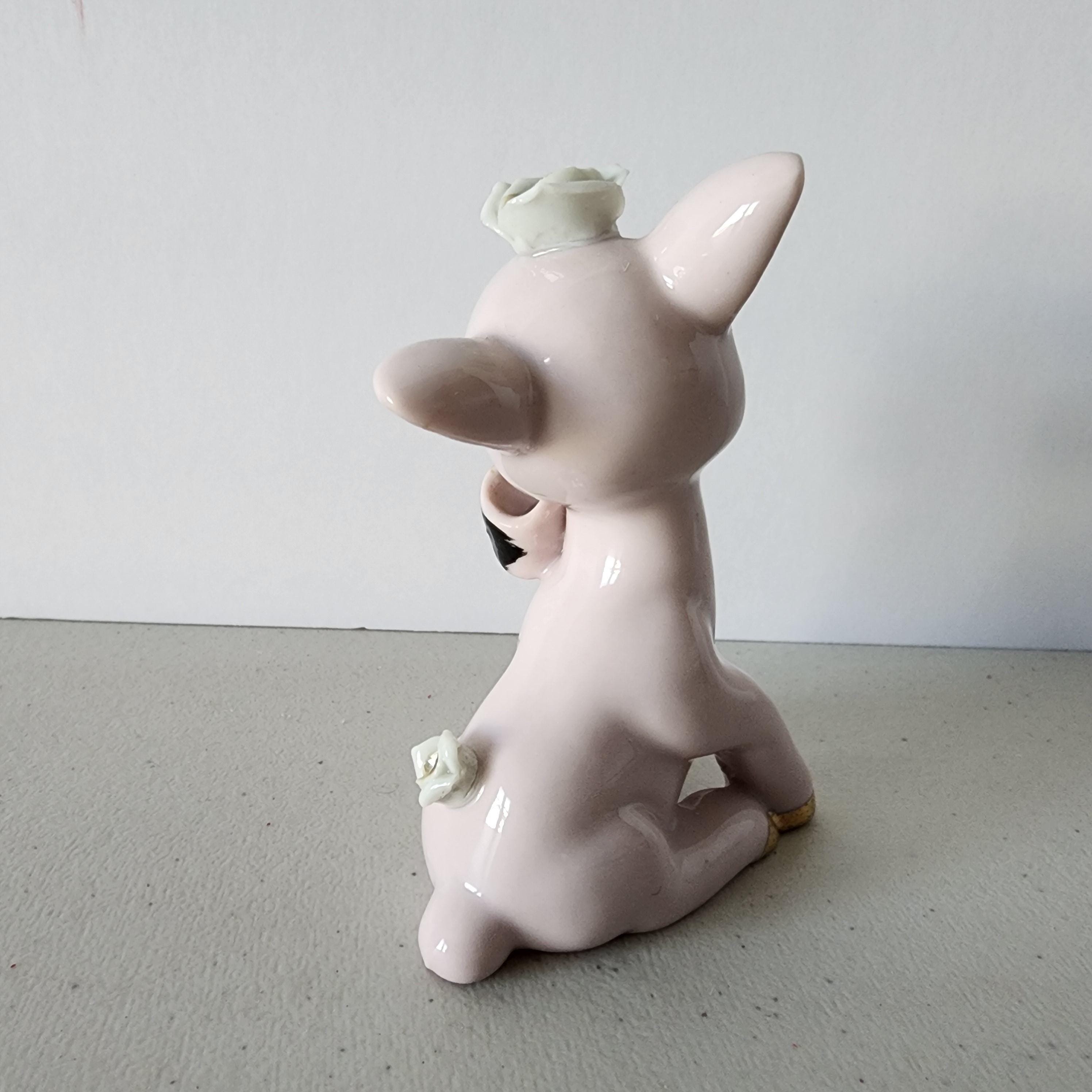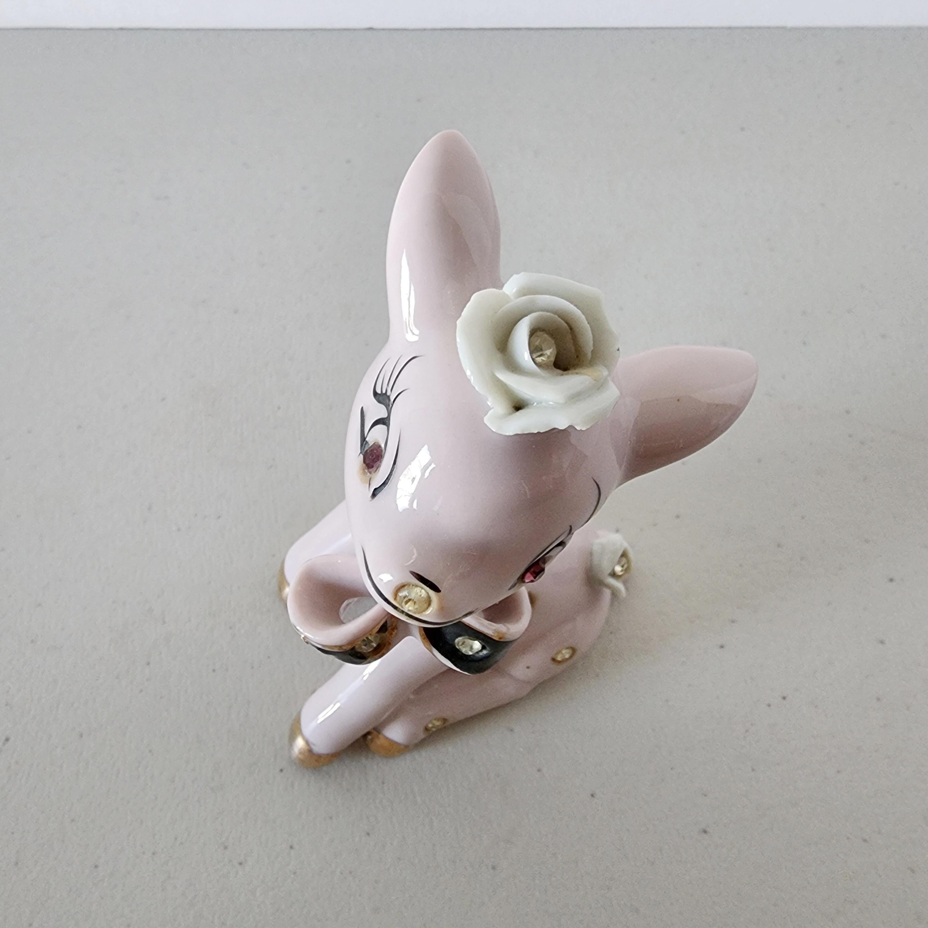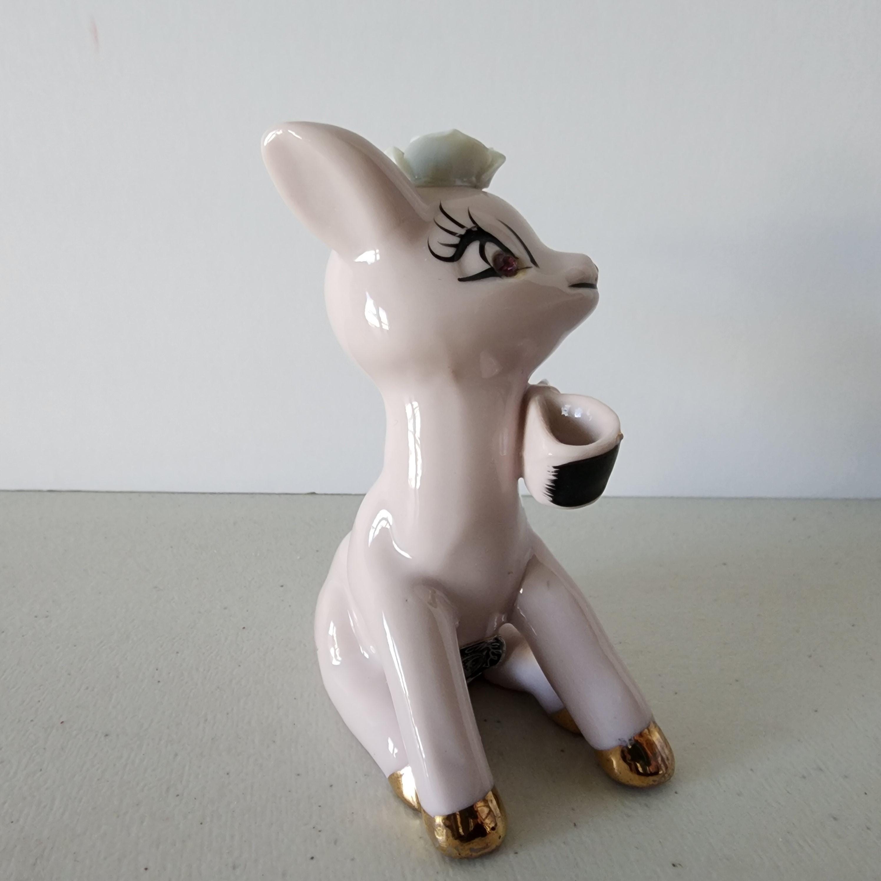This is a vintage 1950s light lavender reindeer figurine with rhinestone accents. Wearing a black bow tie, flower on her head and back and gold hooves. It reminds me of Clarice from Rudolph The Red Nosed Reindeer. She has a Wales Made In Japan sticker on her underside.