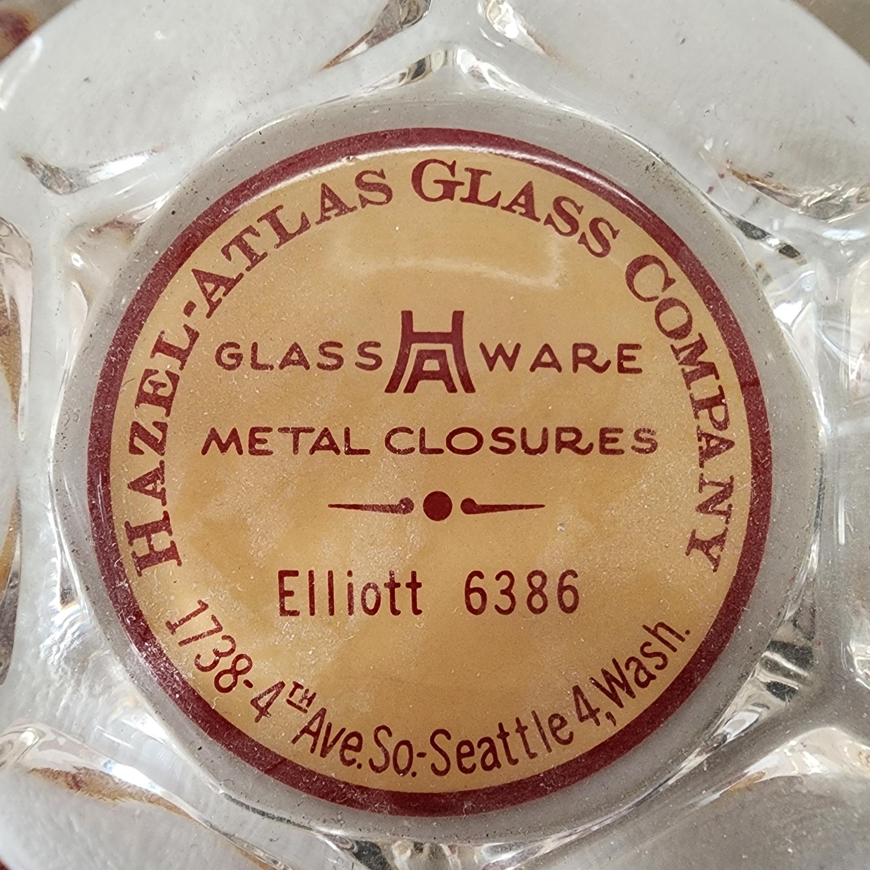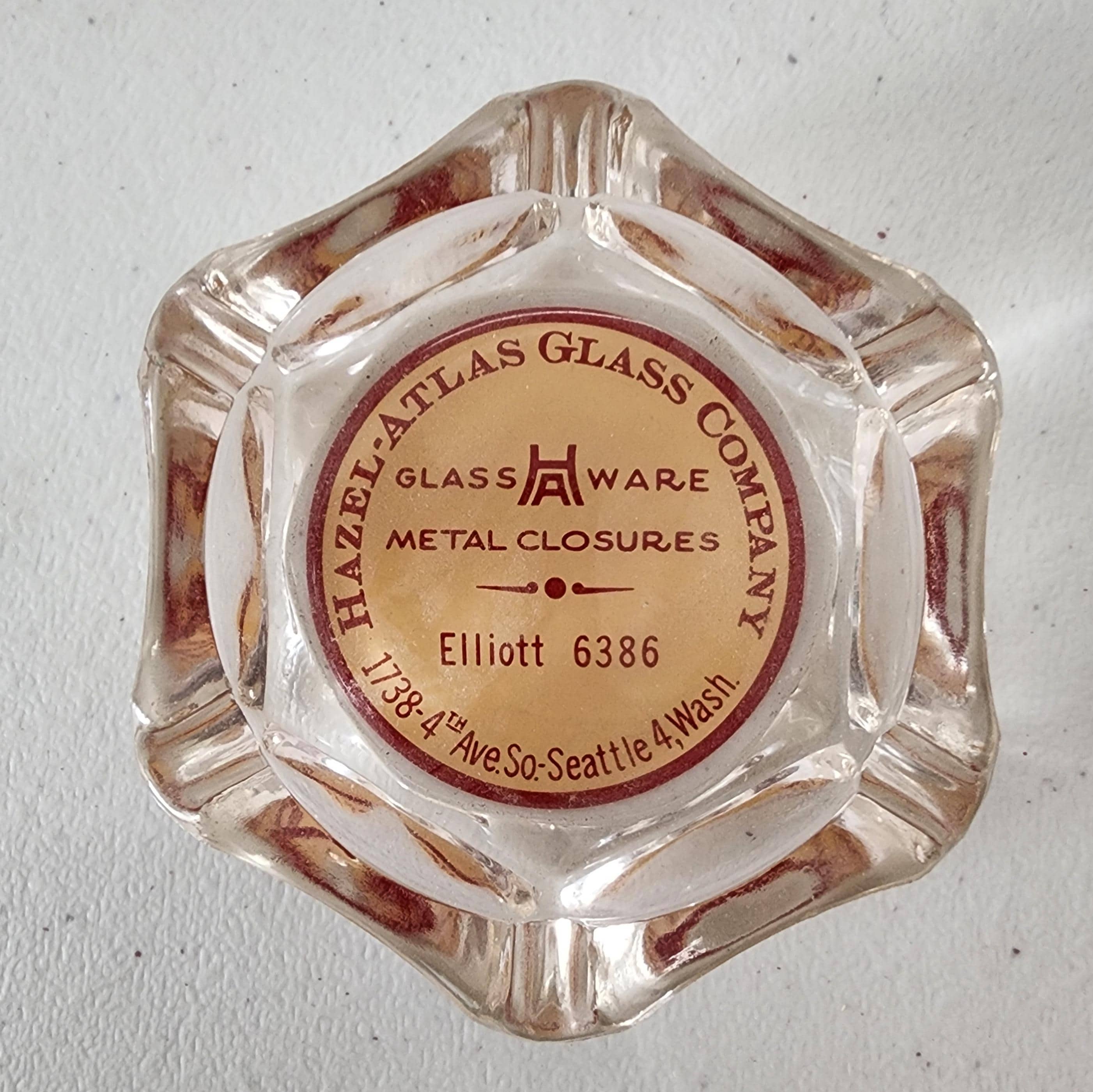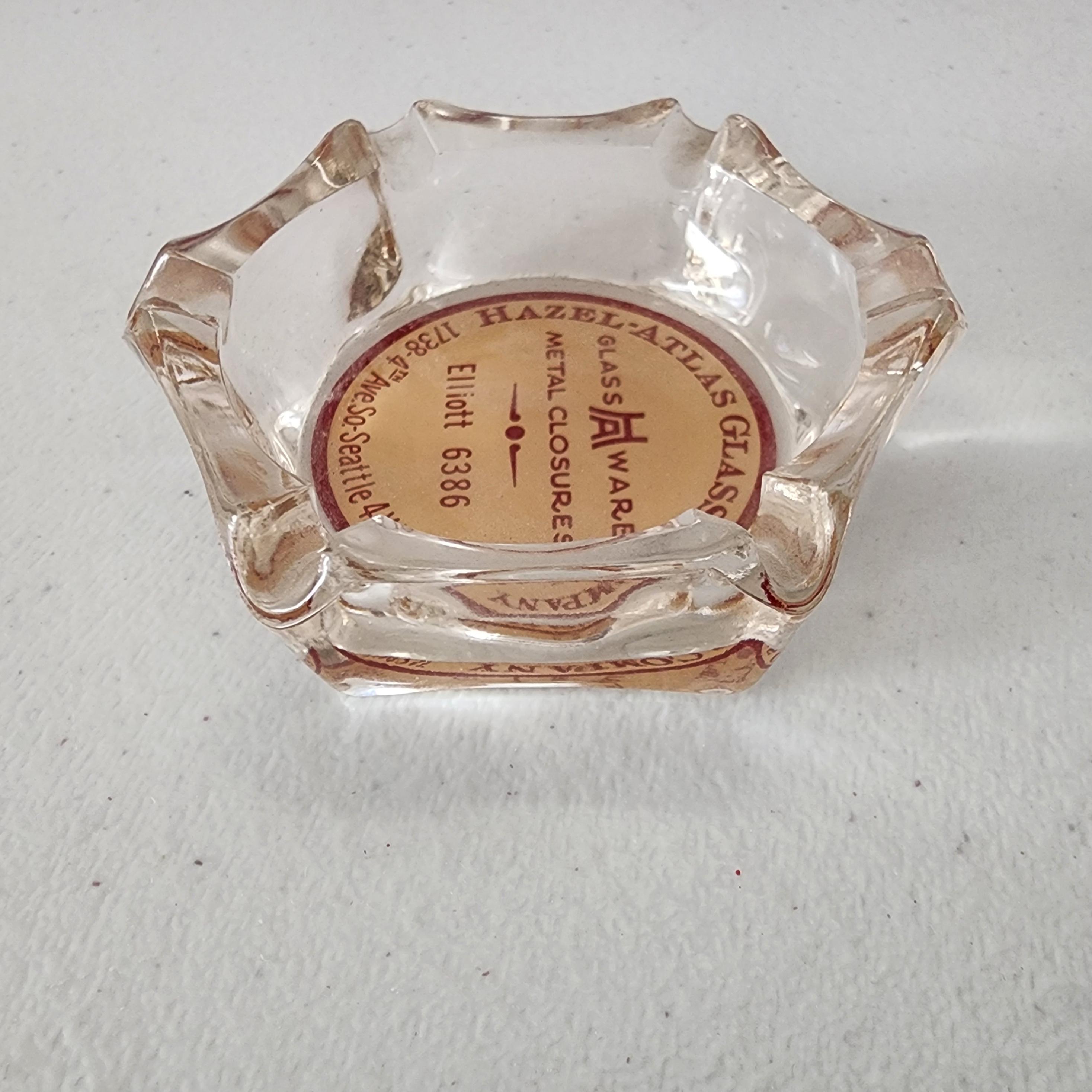 A nice vintage advertising ashtray from Hazel Atlas Glass Company - Glass Ware Metal Closures in Seattle, Washington. It also includes their address and phone number. The circle graphic under the glass is gold with red trim.