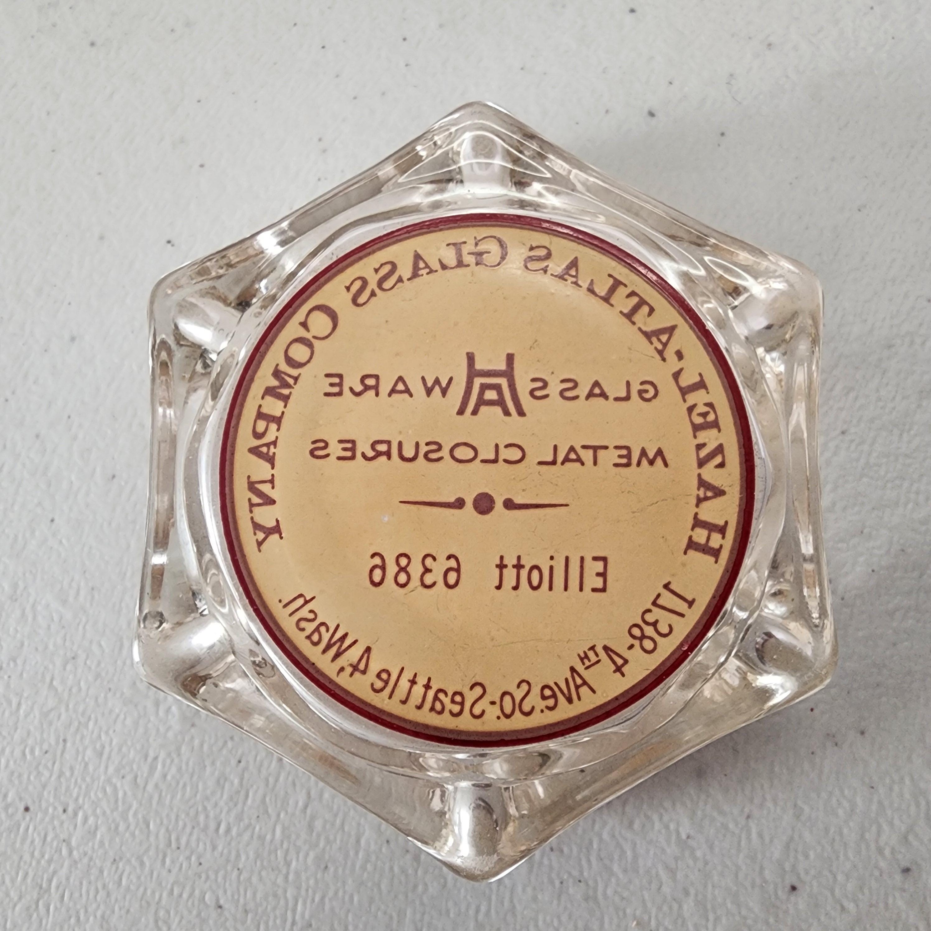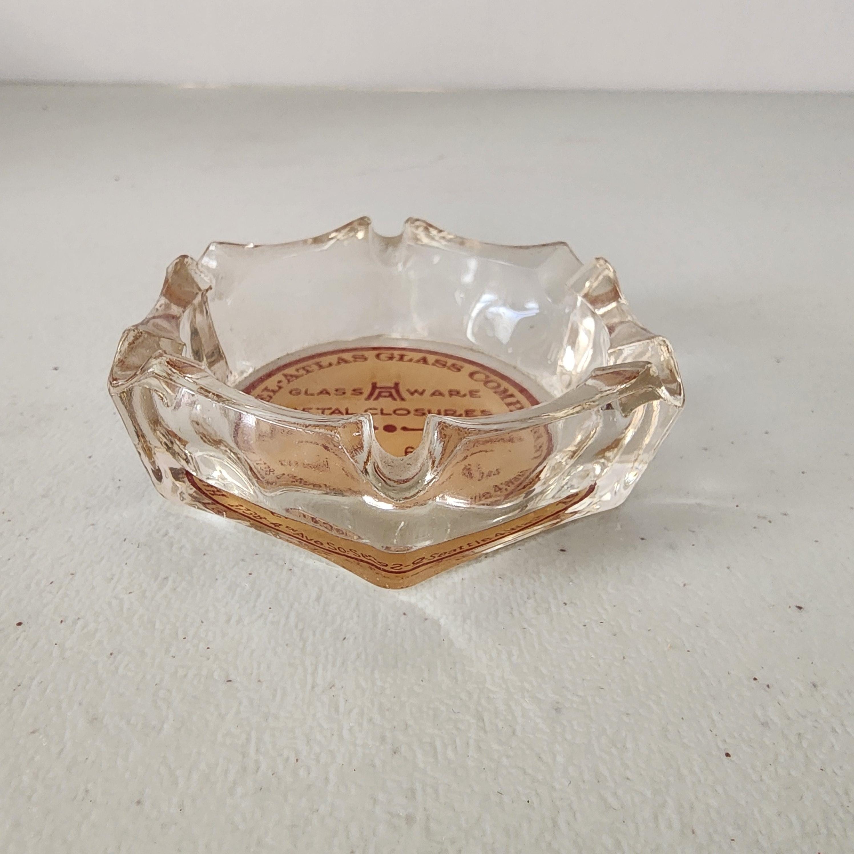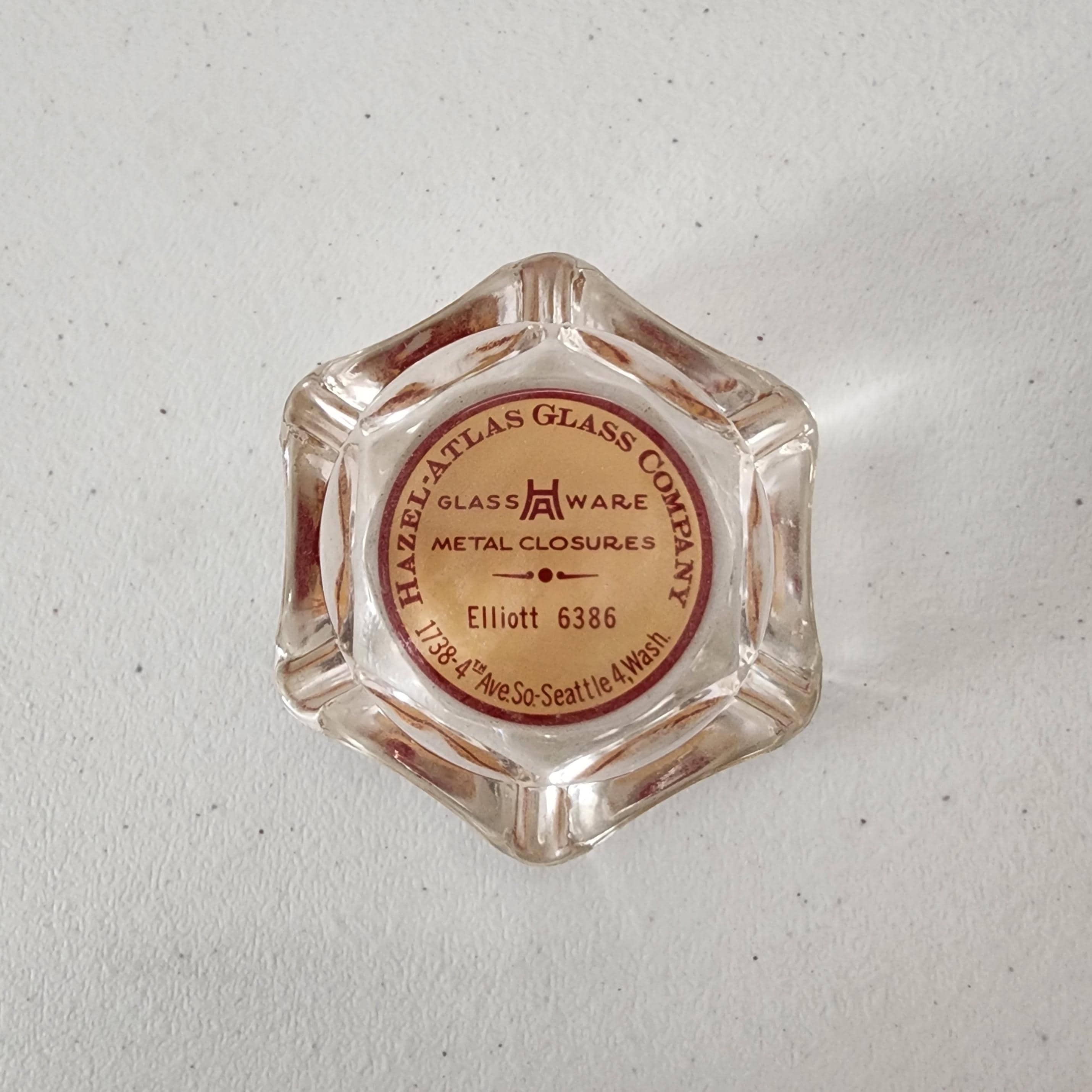 A nice vintage advertising ashtray from Hazel Atlas Glass Company - Glass Ware Metal Closures in Seattle, Washington. It also includes their address and phone number. The circle graphic under the glass is gold with red trim.