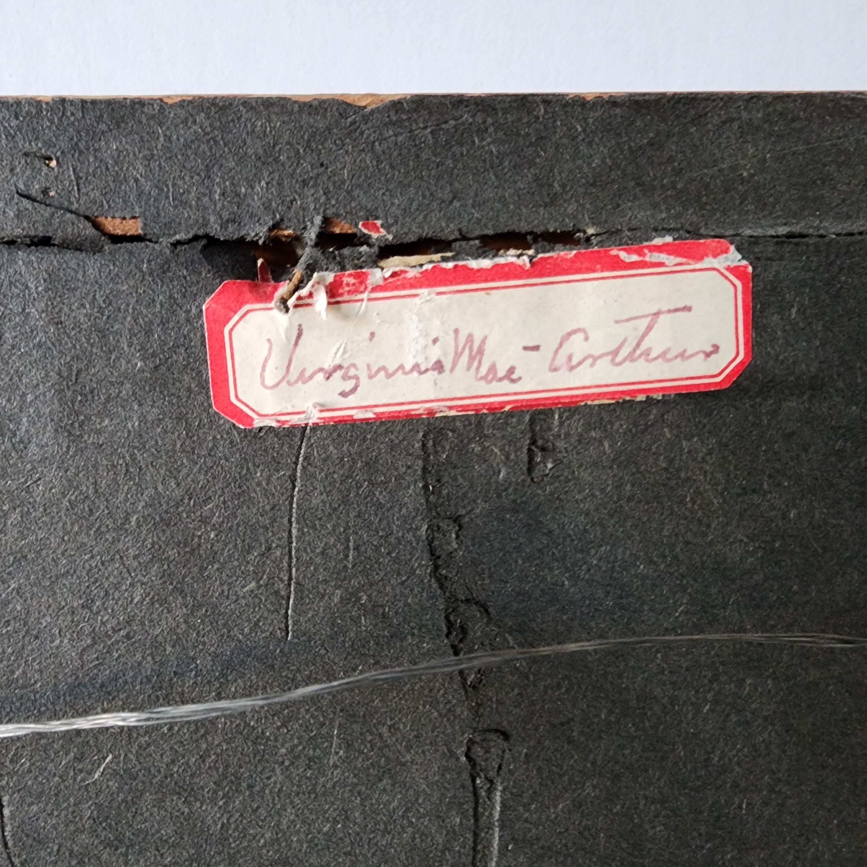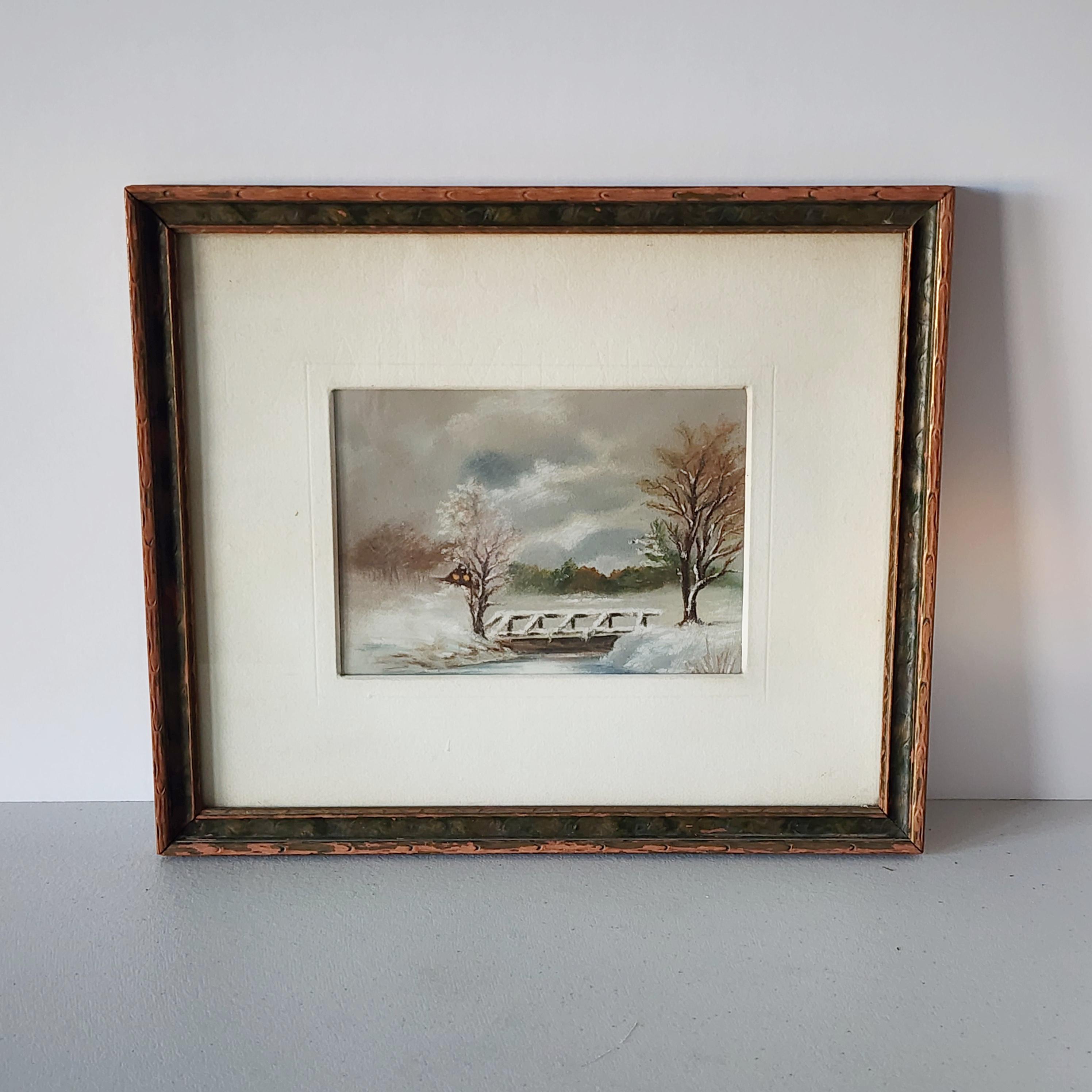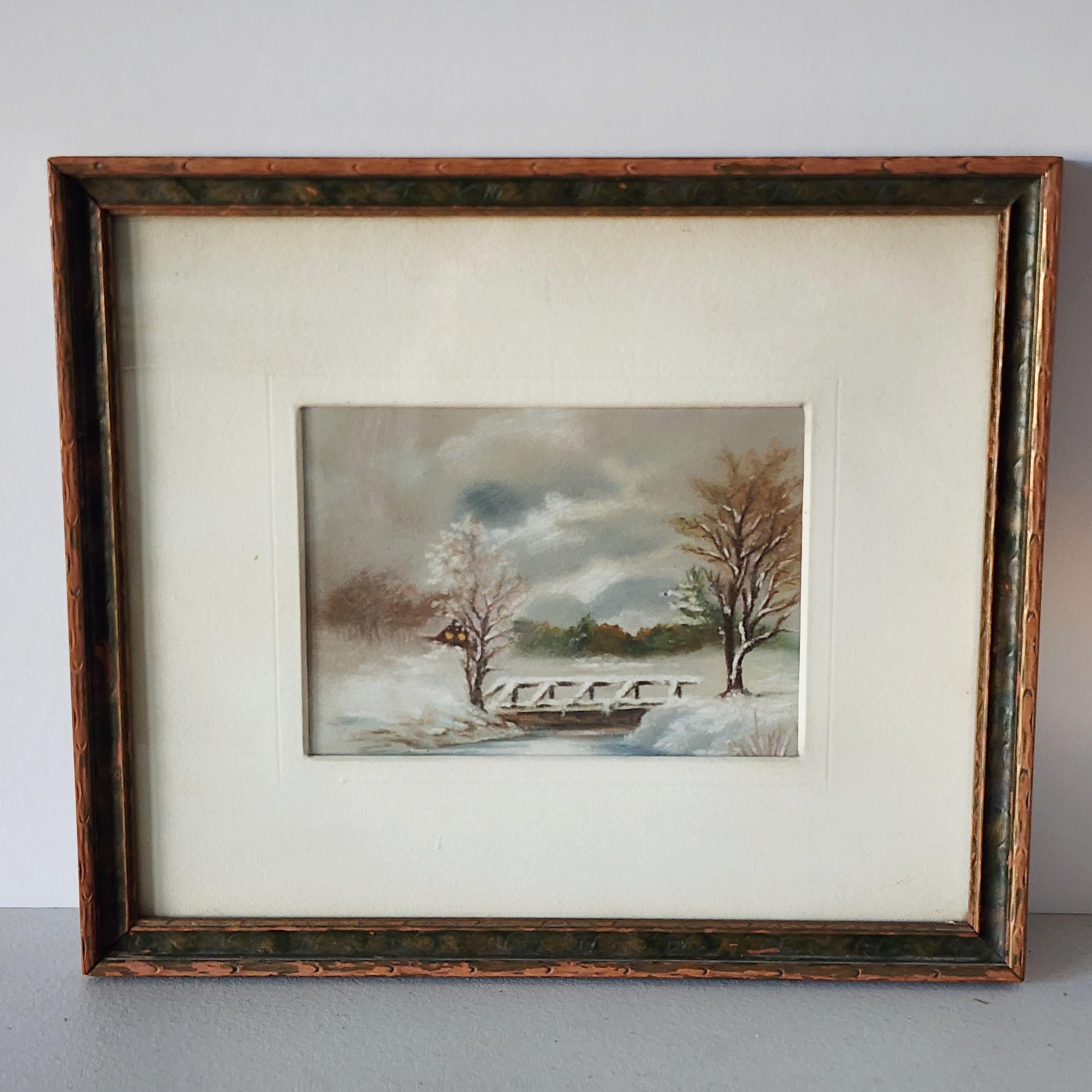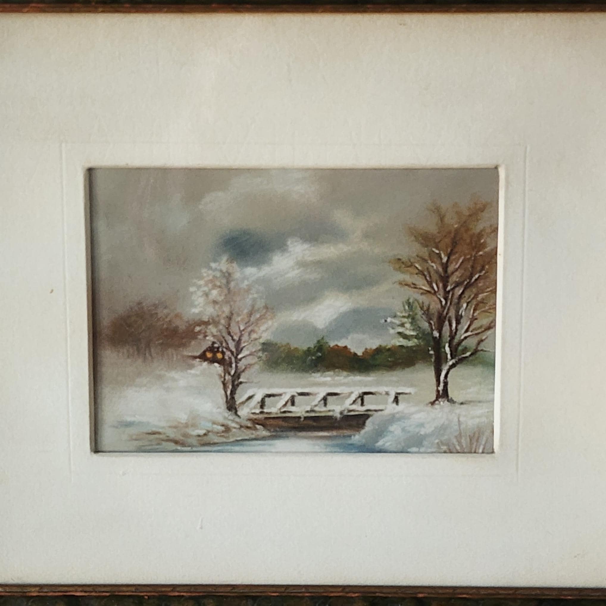 A pretty vintage original pastel featuring a Winter or late Autumn scene with trees, a bridge and snow on the ground. Framed and has a sticker on the back that reads in part Virginia Mae - ?  I'm not sure what the last word is. There is no signature on the artwork visible.