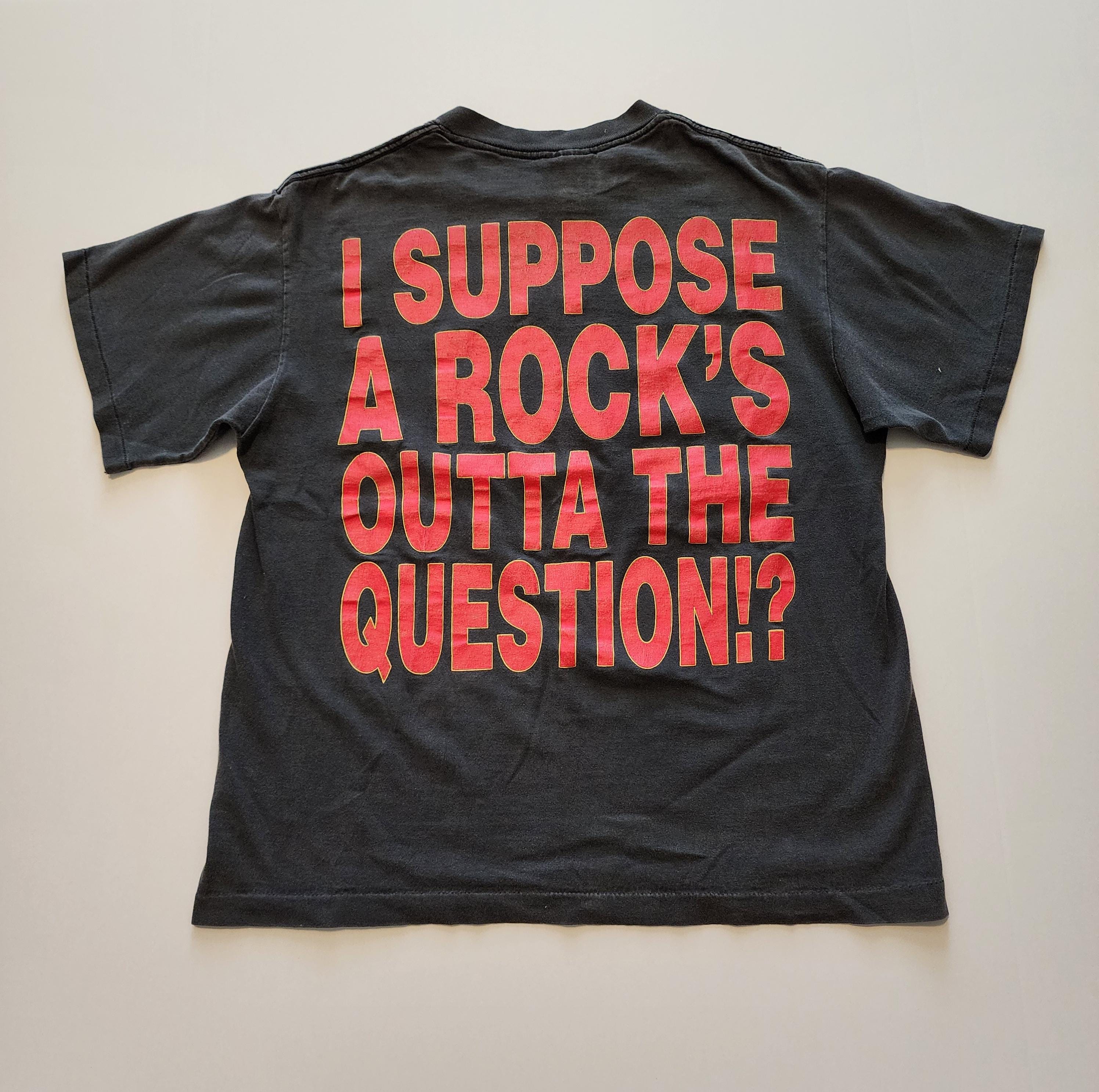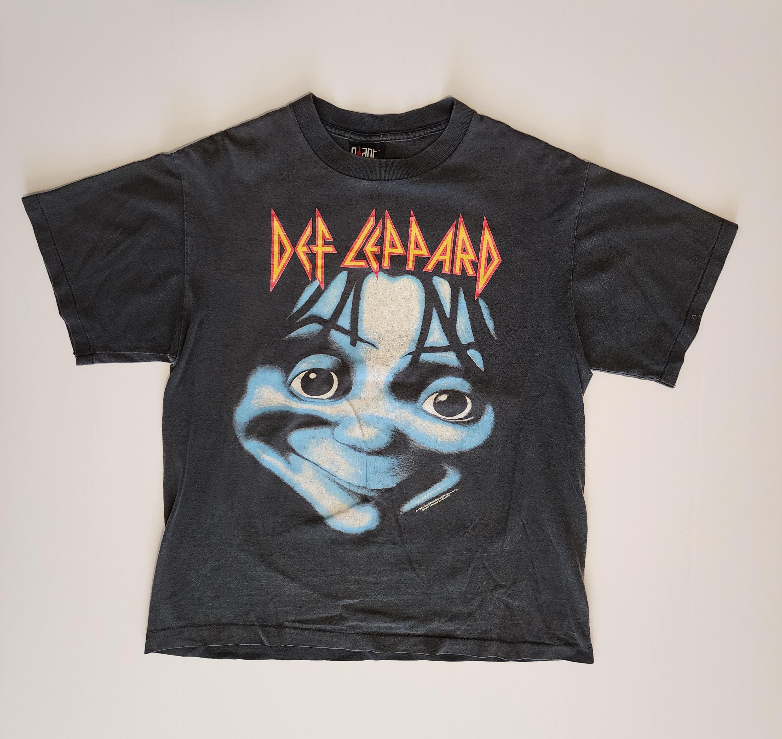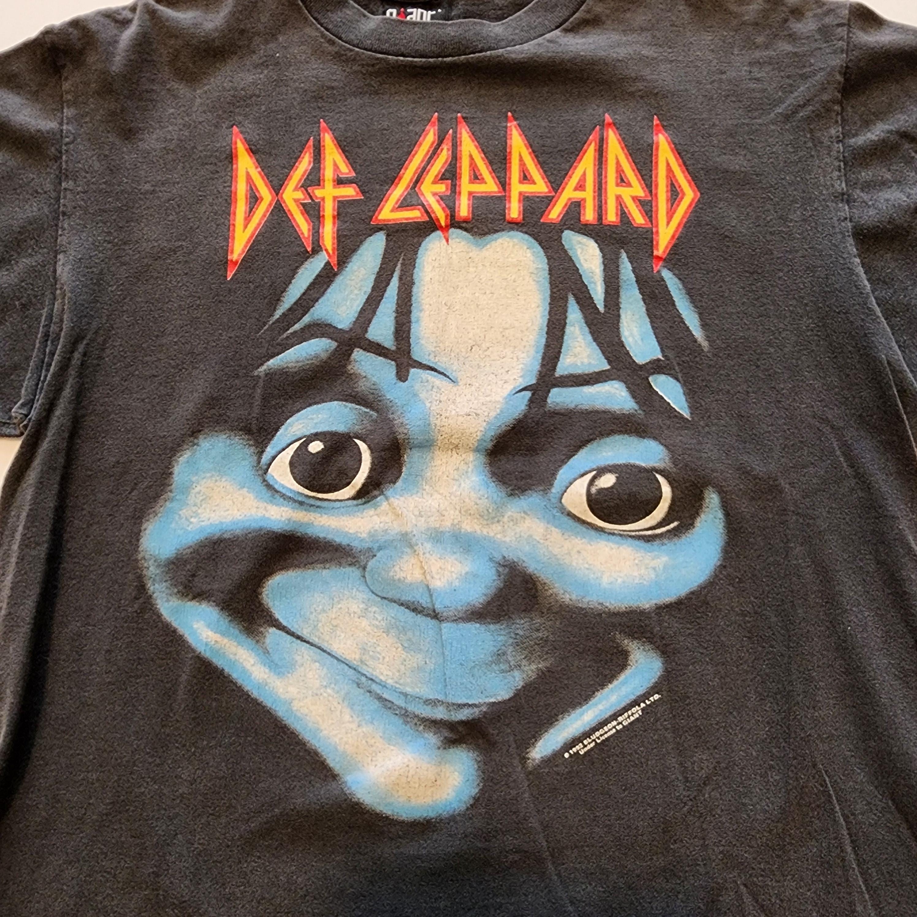A vintage 1992 Def Leppard T Shirt with a large face on the front and "I Suppose A Rock's Outta The Question?" written on the back. It is a Giant by Tee Jays 100% cotton shirt marked a size Large.