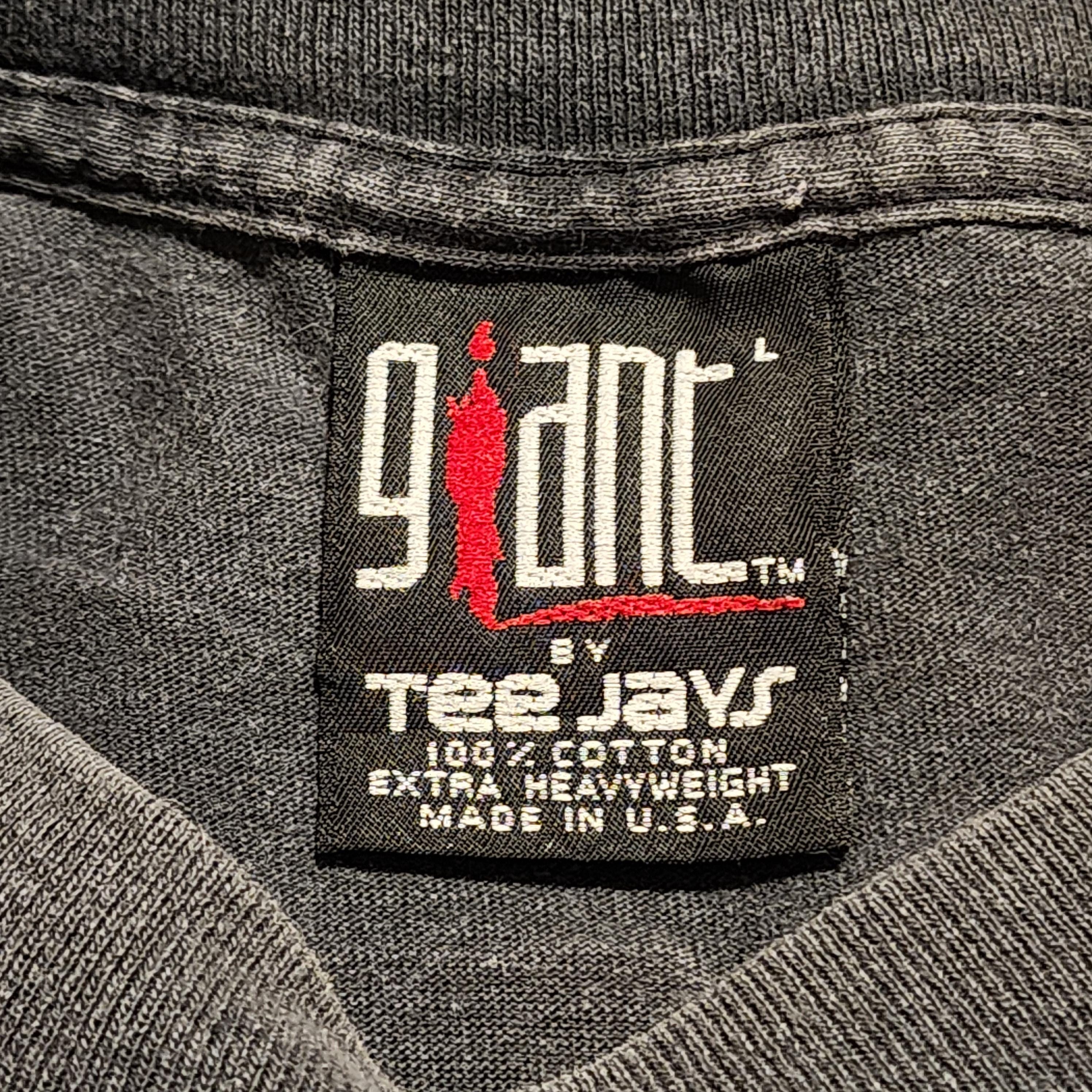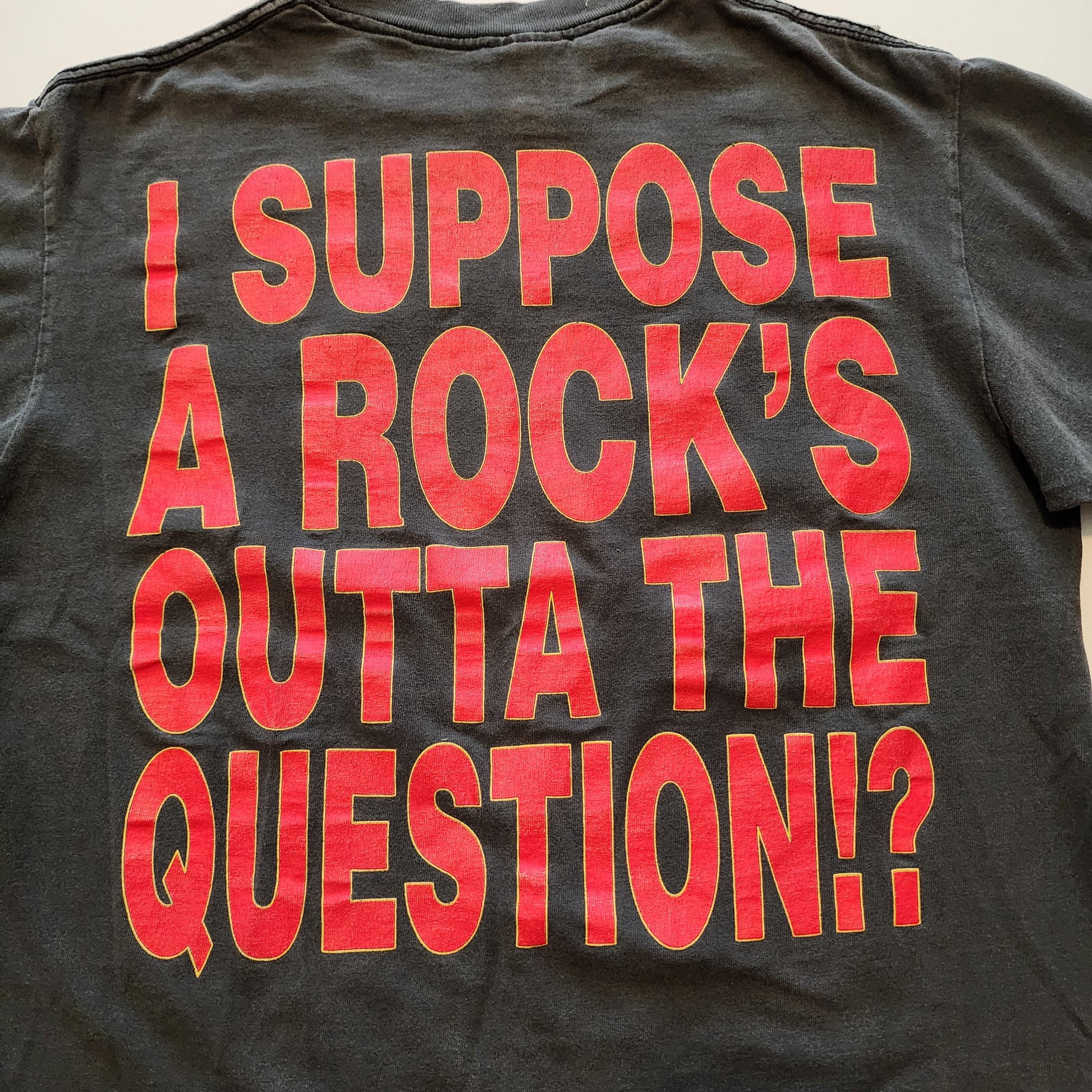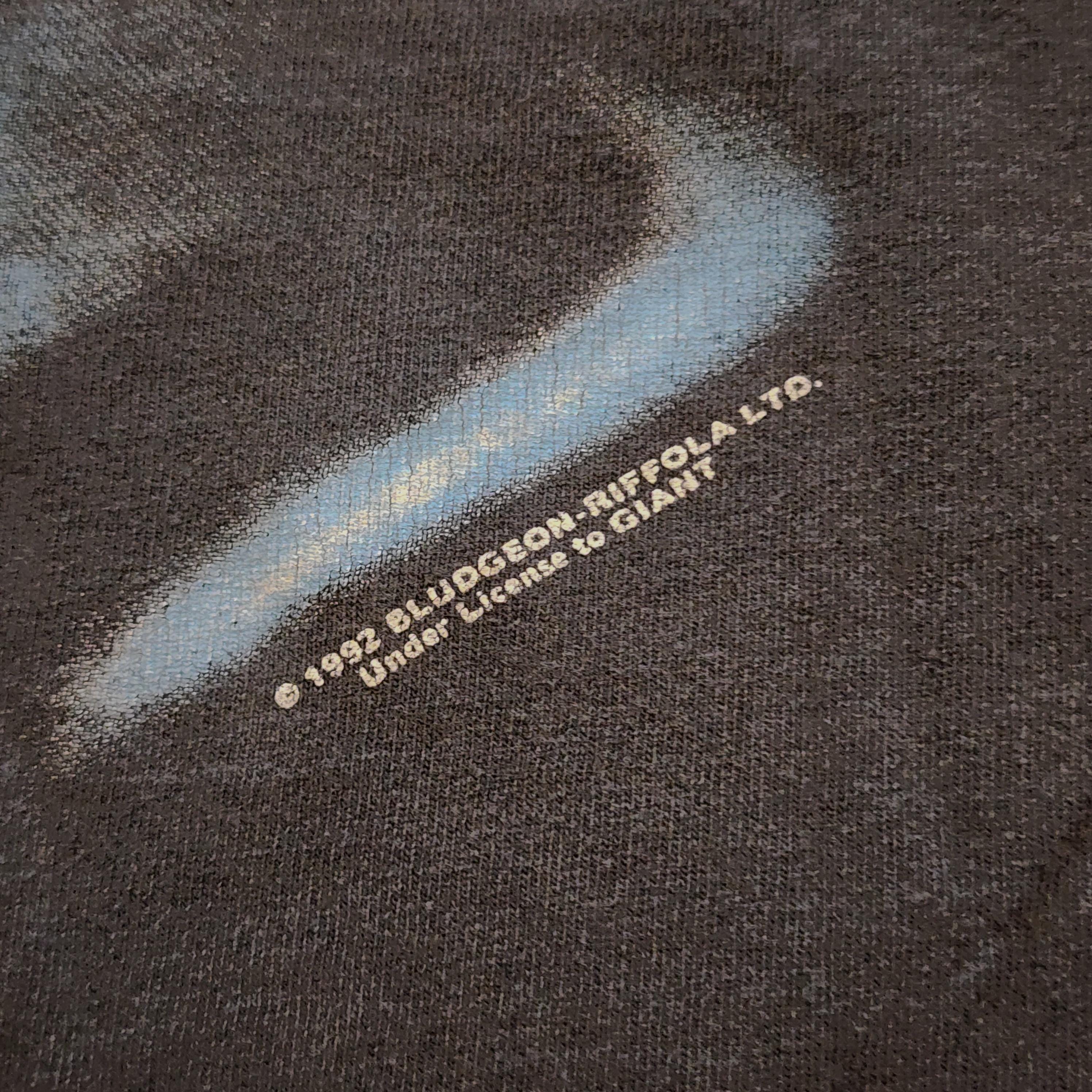 A vintage 1992 Def Leppard T Shirt with a large face on the front and "I Suppose A Rock's Outta The Question?" written on the back. It is a Giant by Tee Jays 100% cotton shirt marked a size Large.