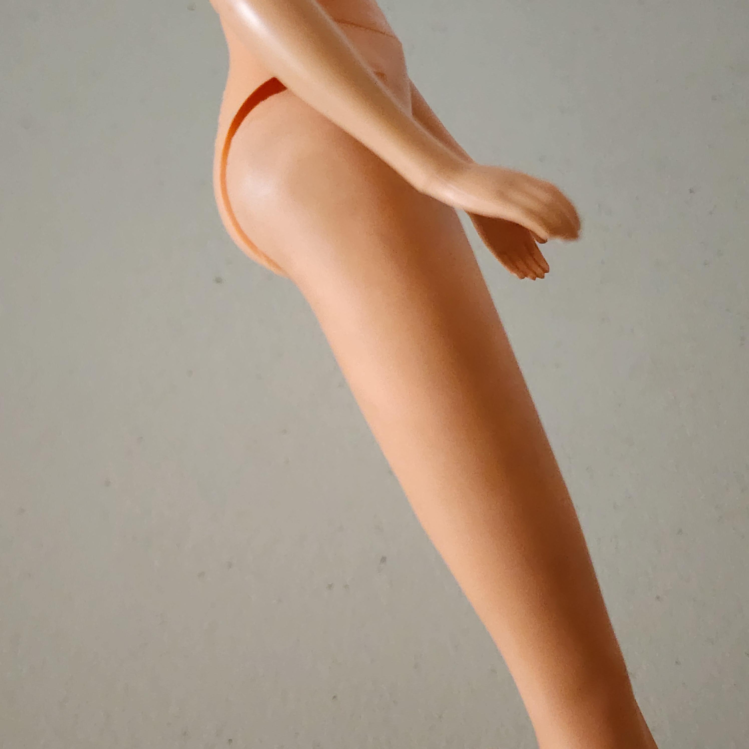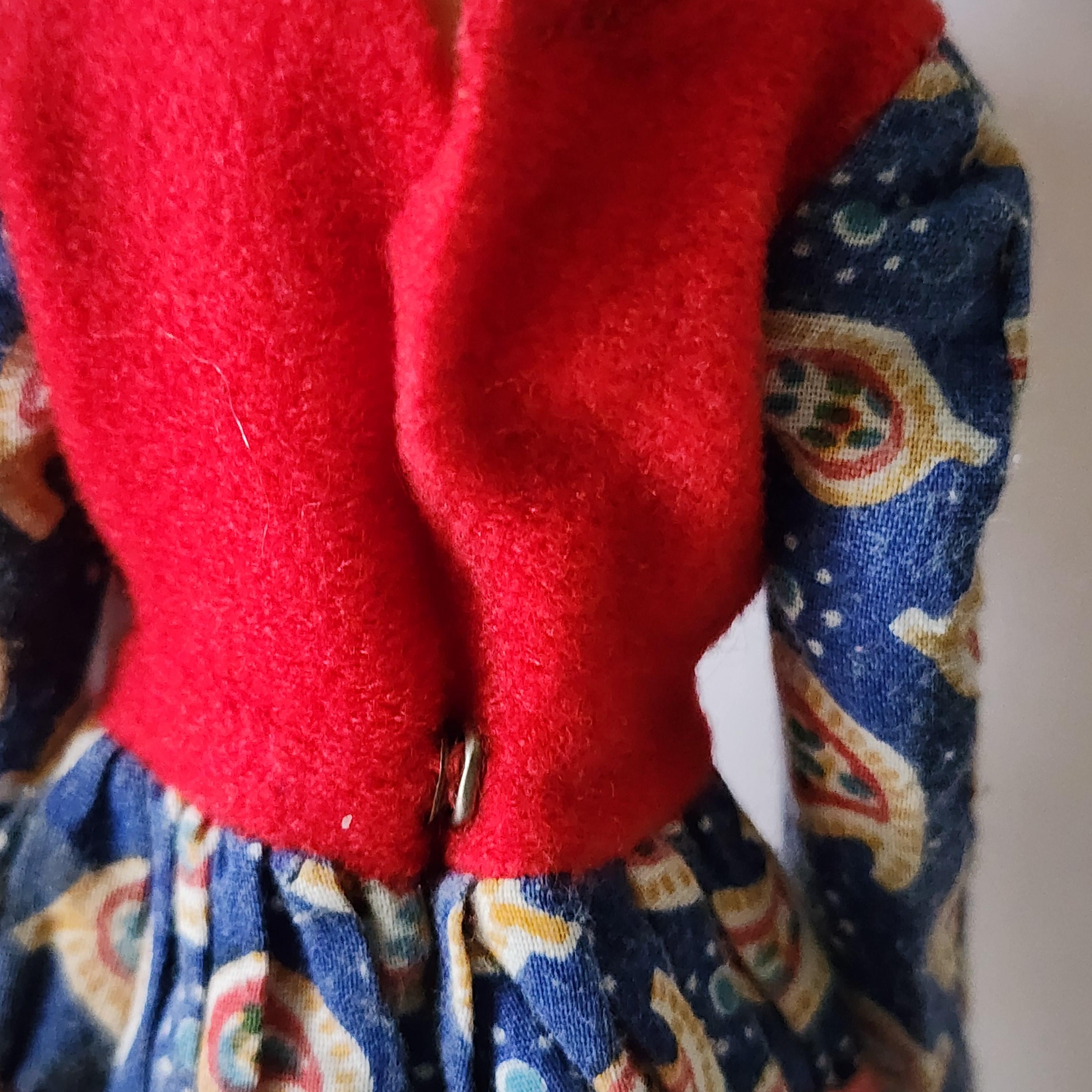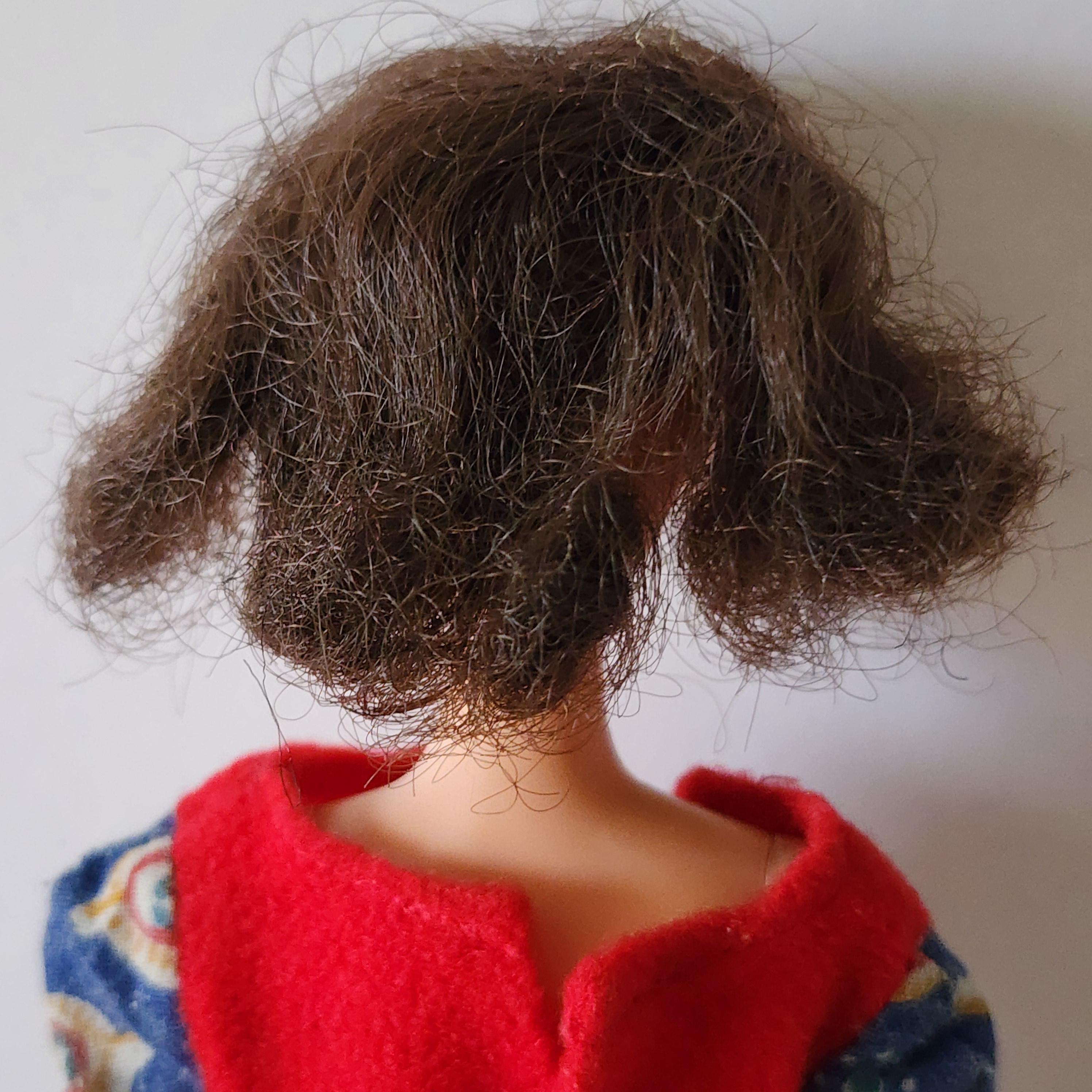 Condition: Her face and body are in nice shape. Her knees click and there is general minor soiling to her legs, which looks a little more obvious in person than in the photos. Her hair is frizzy looking and clumped together at the ends. One snap on the dress must have some loose at some point and was sewn back on the wrong side of the dress. The dress has some elastic cuff fraying and possibly some fading, although the color is uniform.