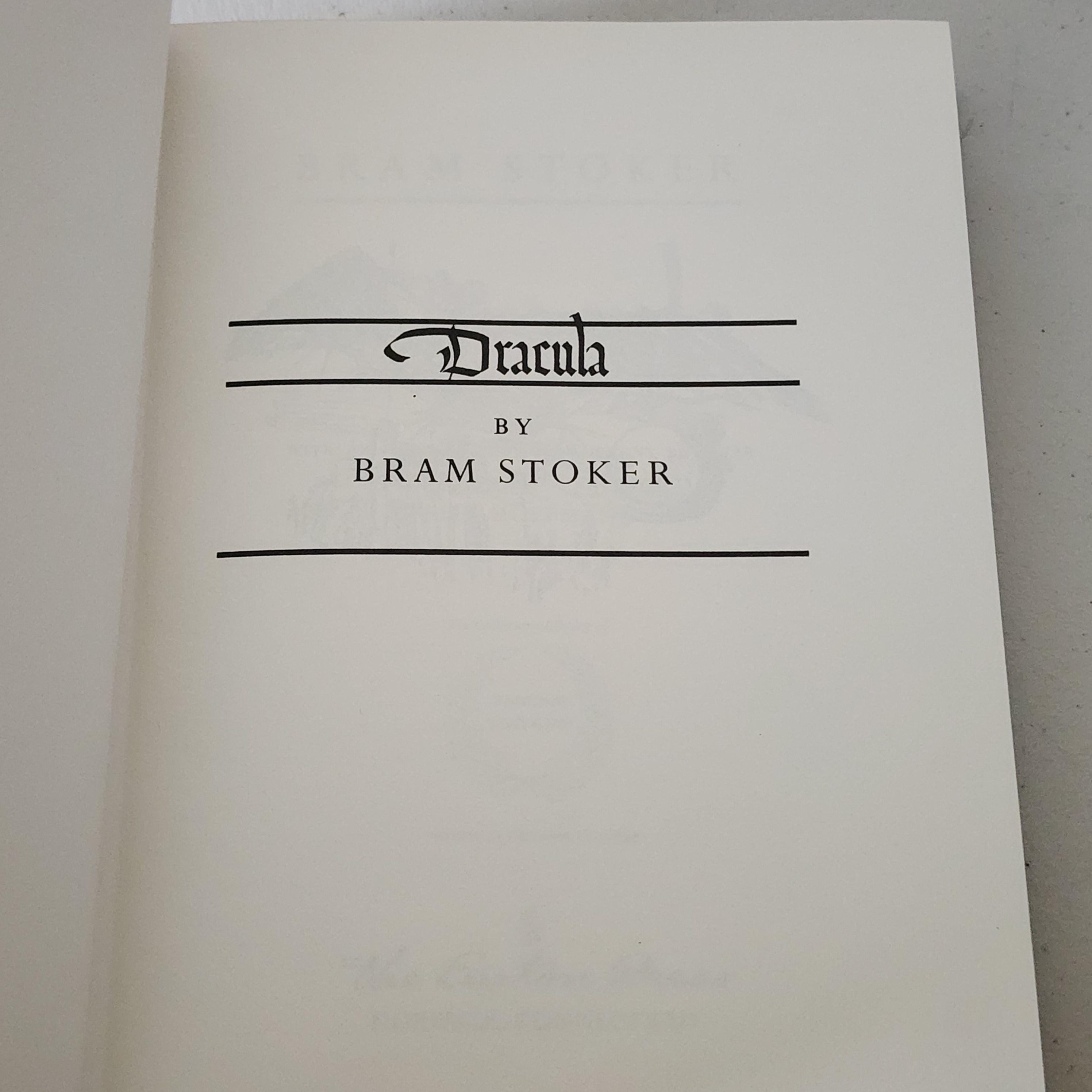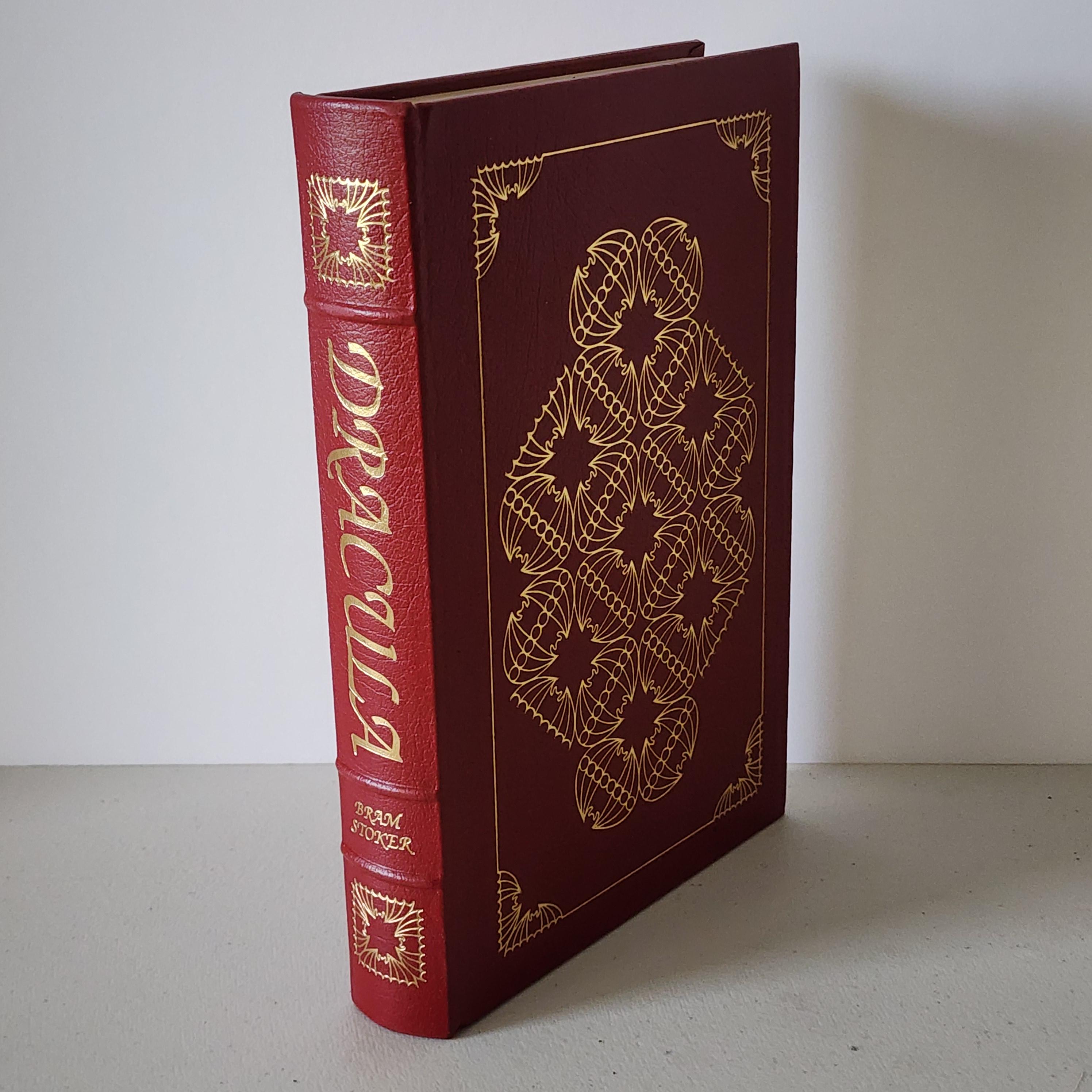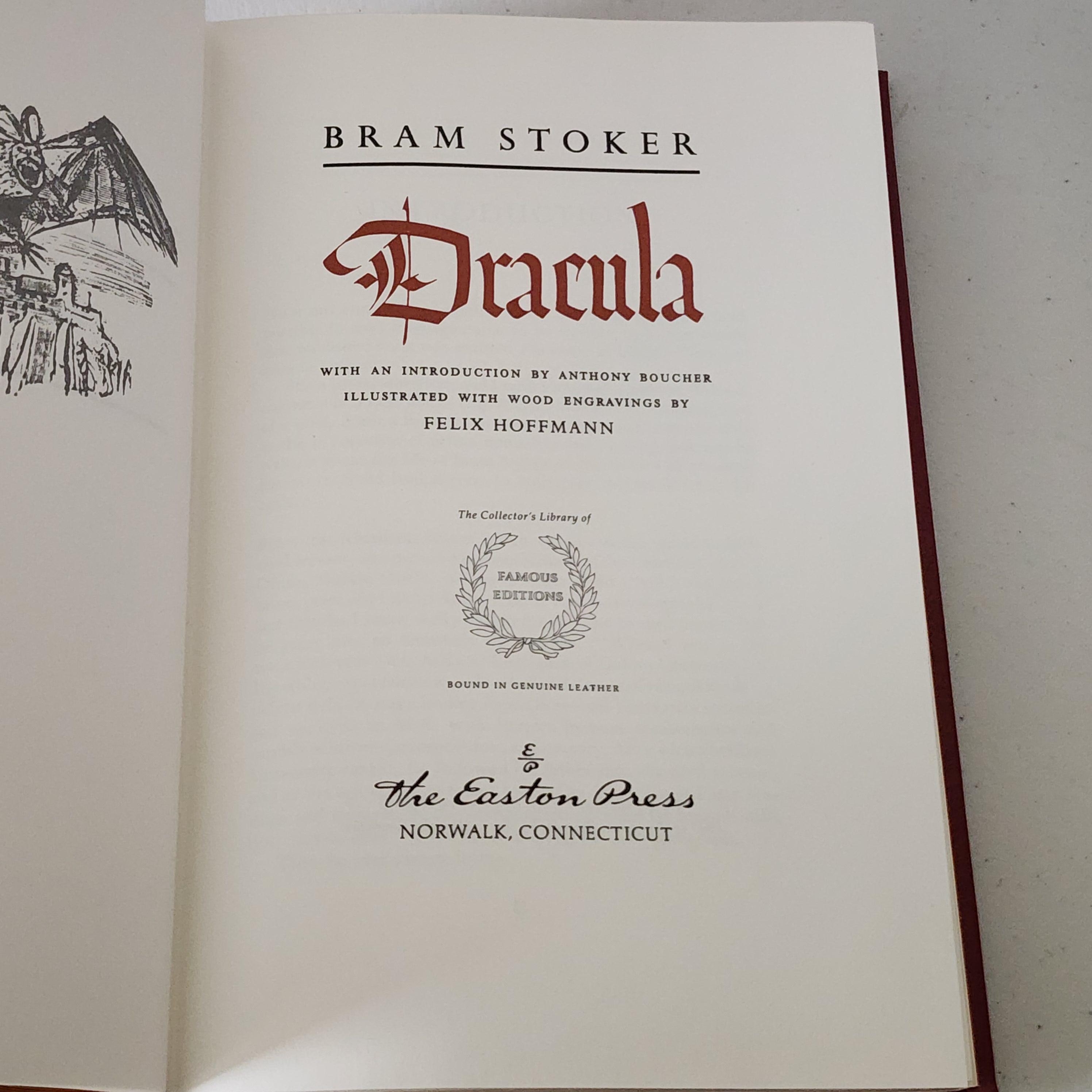 A leather bound hard cover Dracula by Bram Stoker. It is a collector's library Famous Editions book by Easton Press ©1965. Page edges are gold gilt and it comes with an attached ribbon bookmark.