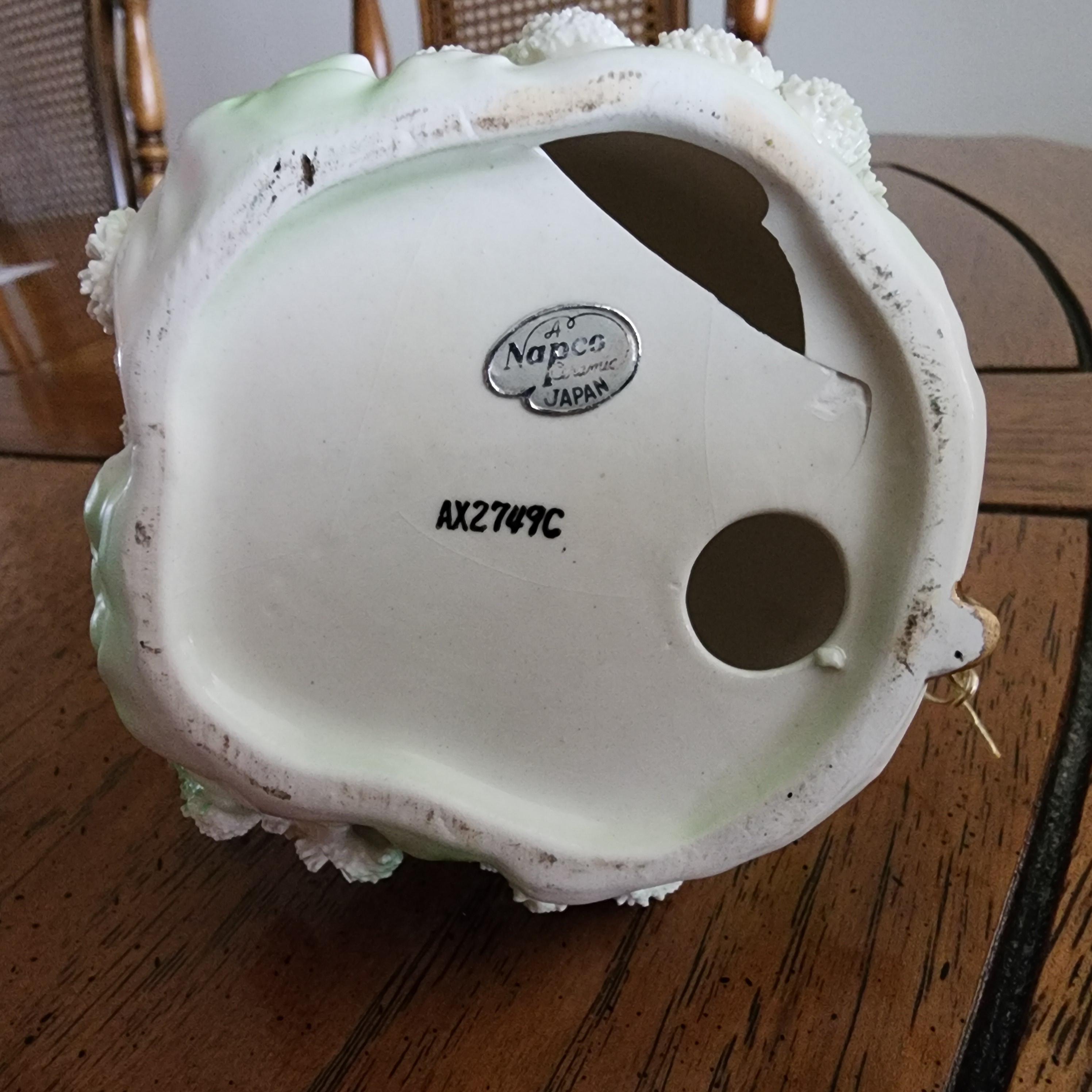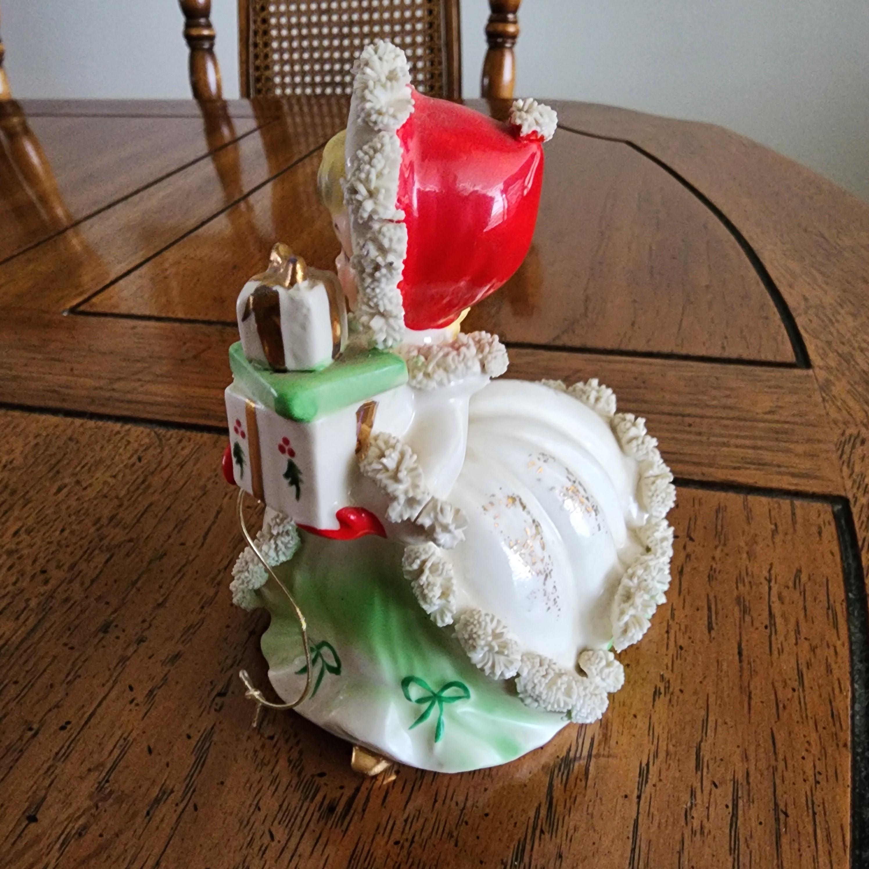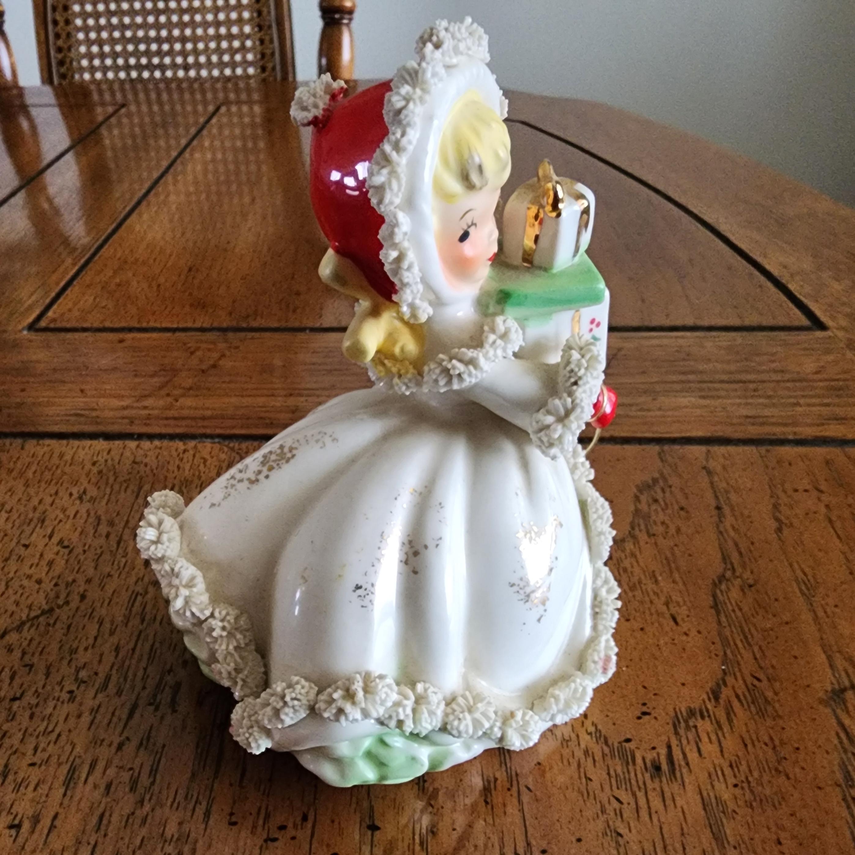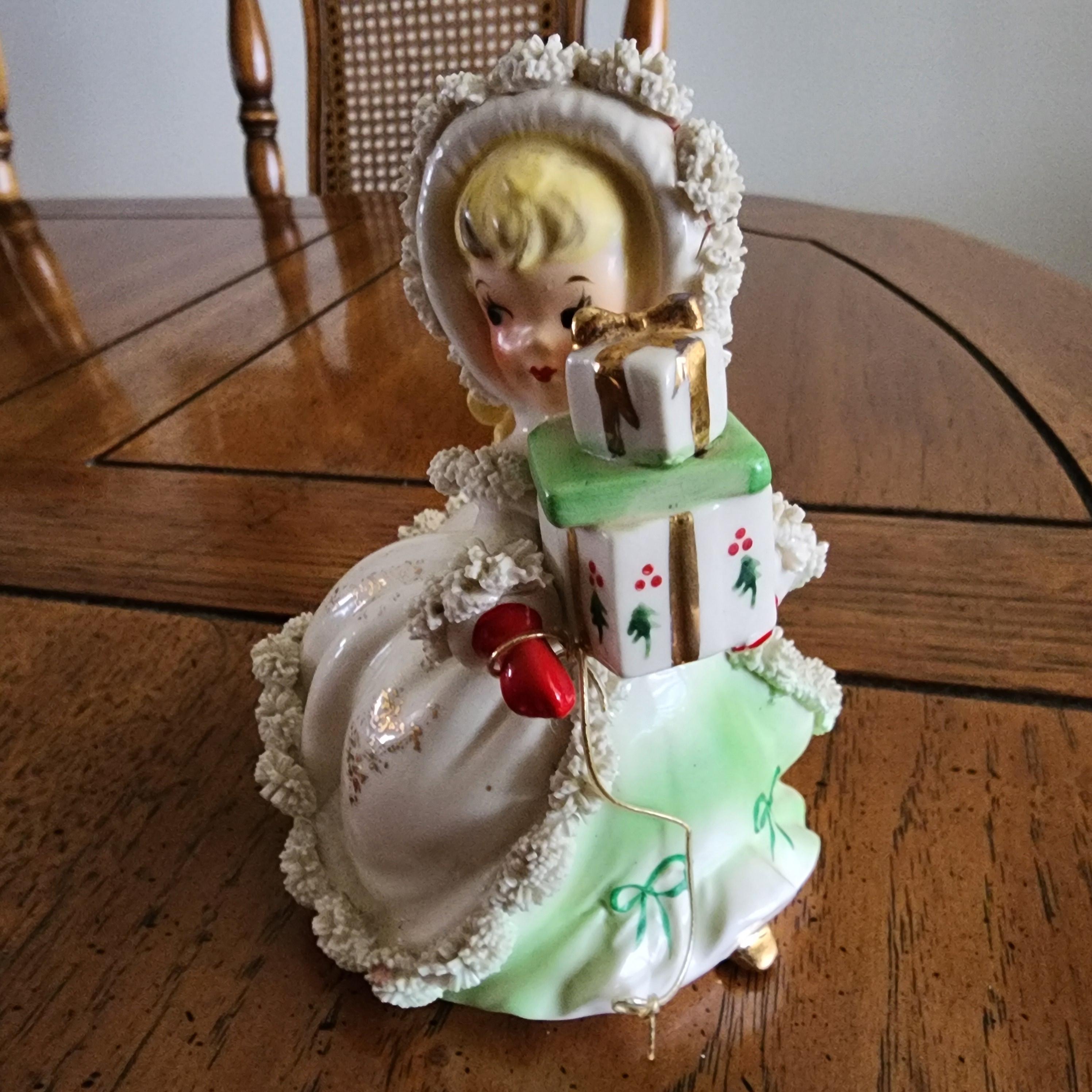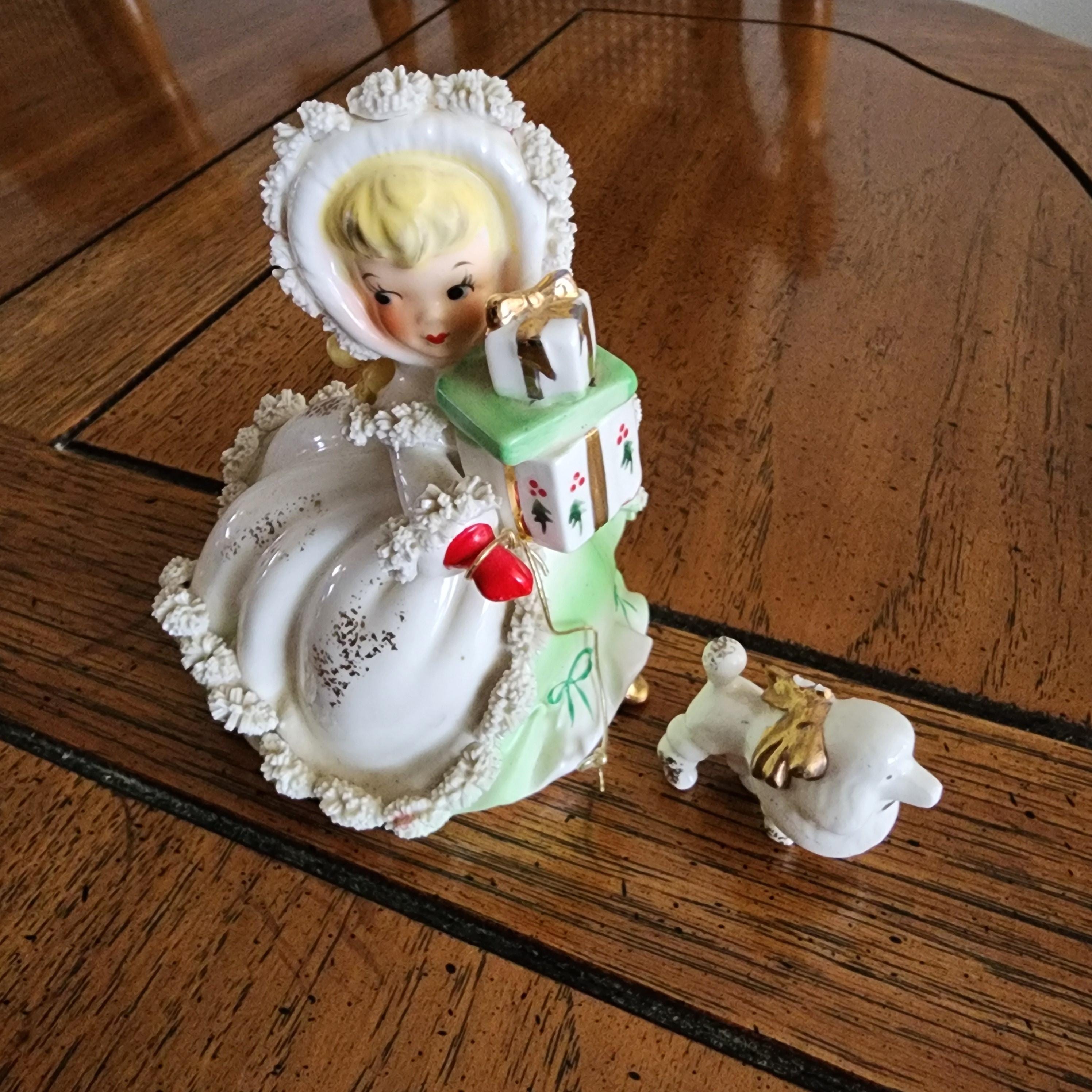 This is a vintage 1950s Napco figurine of a girl in a white fur trimmed coat holding wrapped Christmass present in one hand and a leash for her poodle dog in the other. The Napco Ceramic Japan sticker is on the bottom.