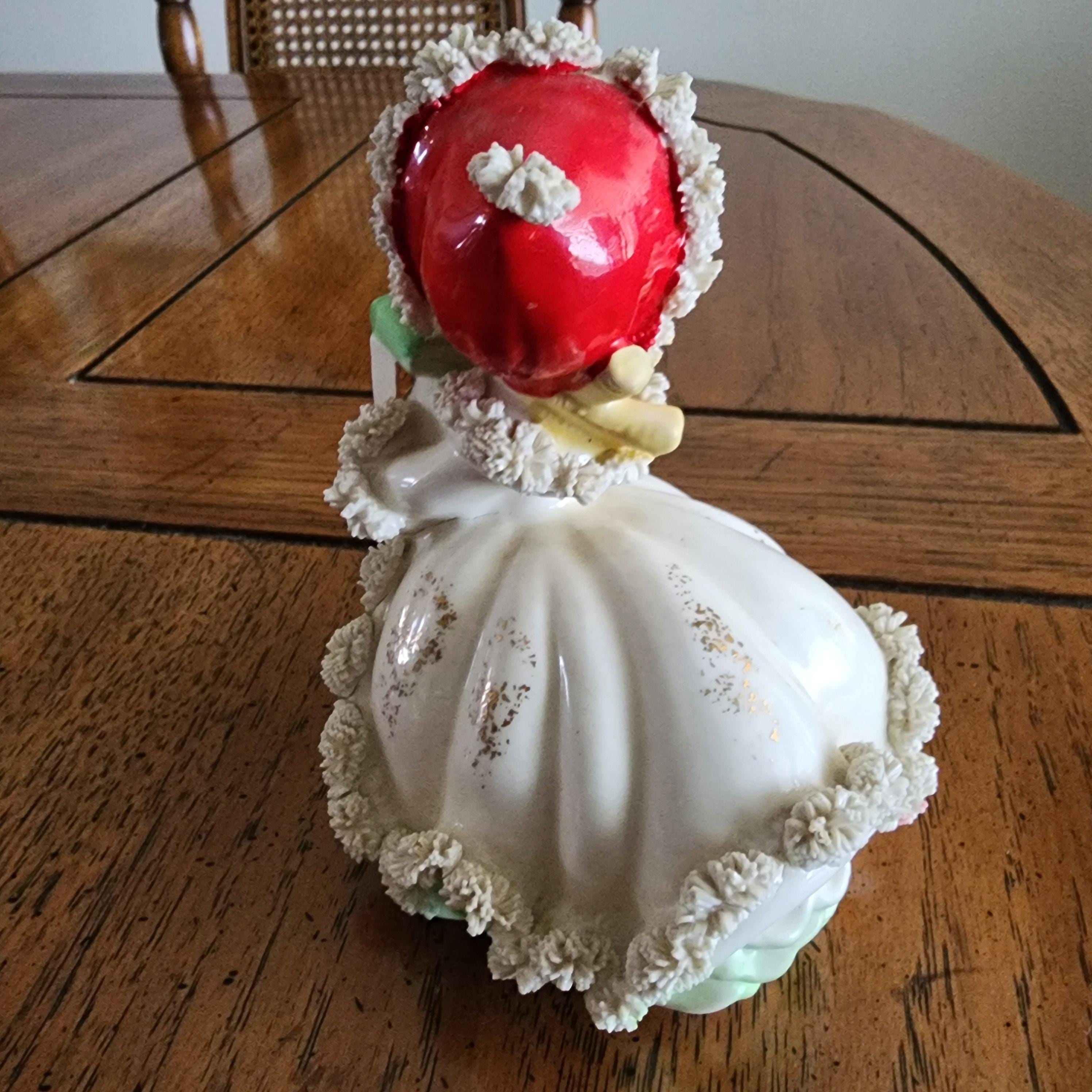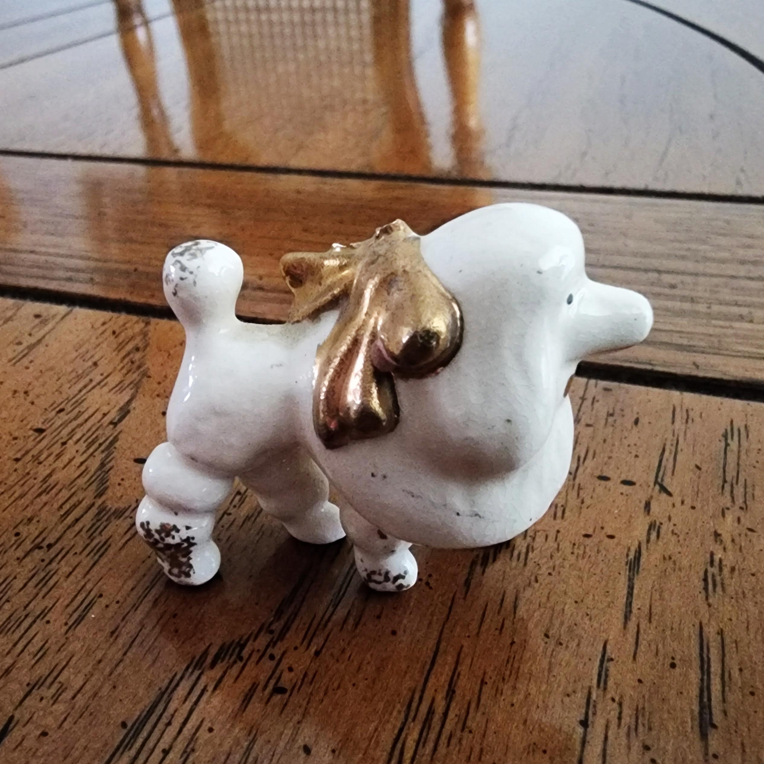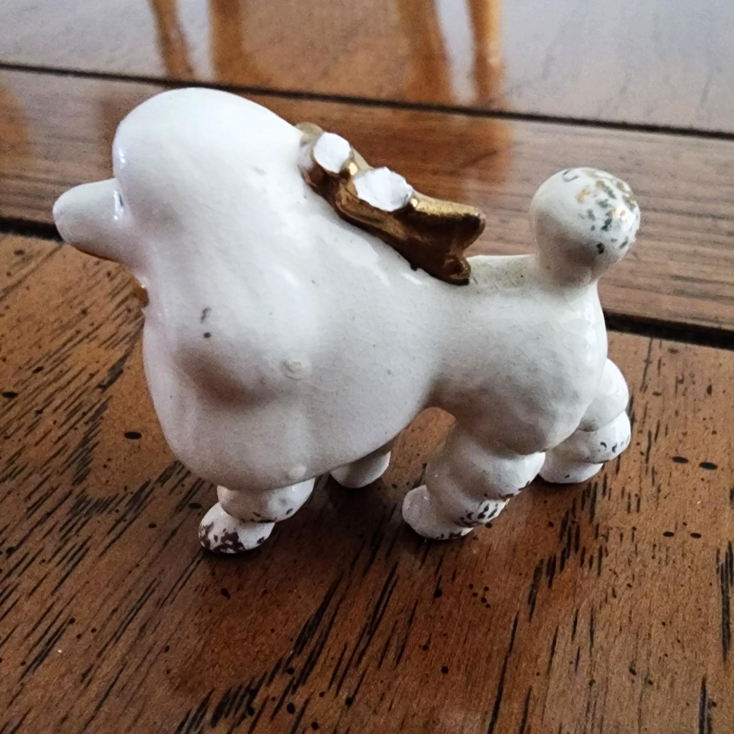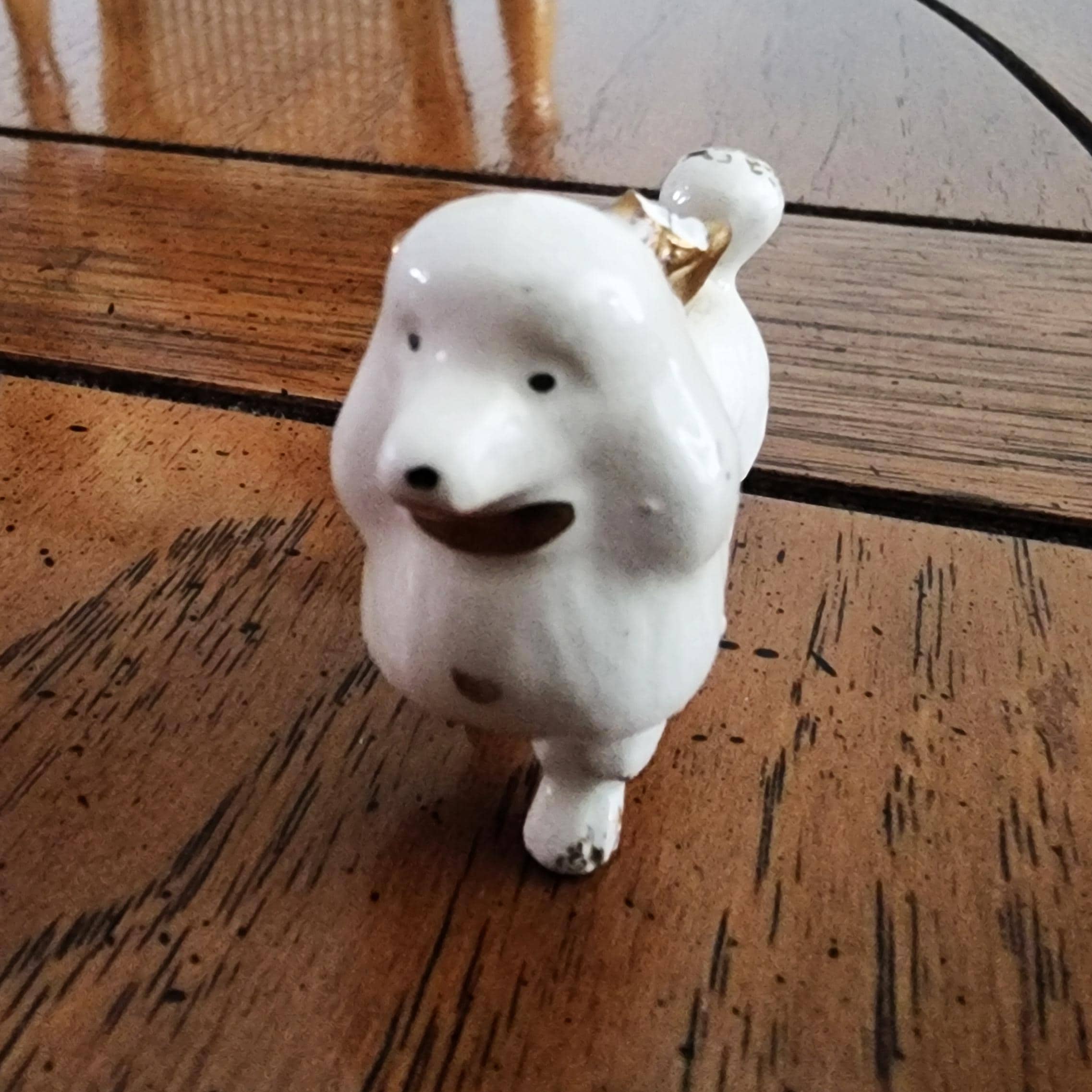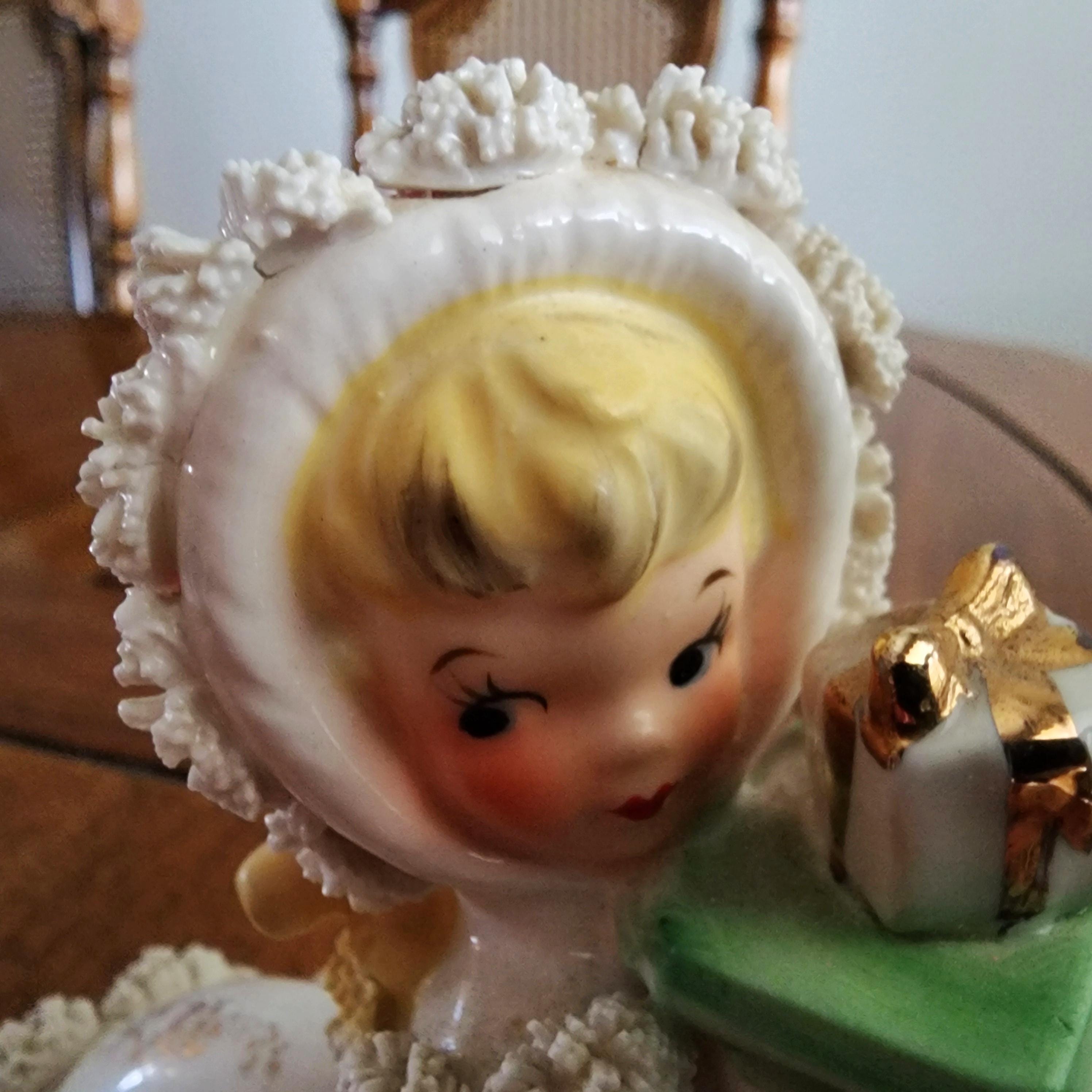 Condition: The girl has some soiling, a broken and cracked bottom, and a couple spots that I don't believe are breaks, but were in the manufacturing process. Her poodle has a broken gold bow and possible scratches. Please see all photos.