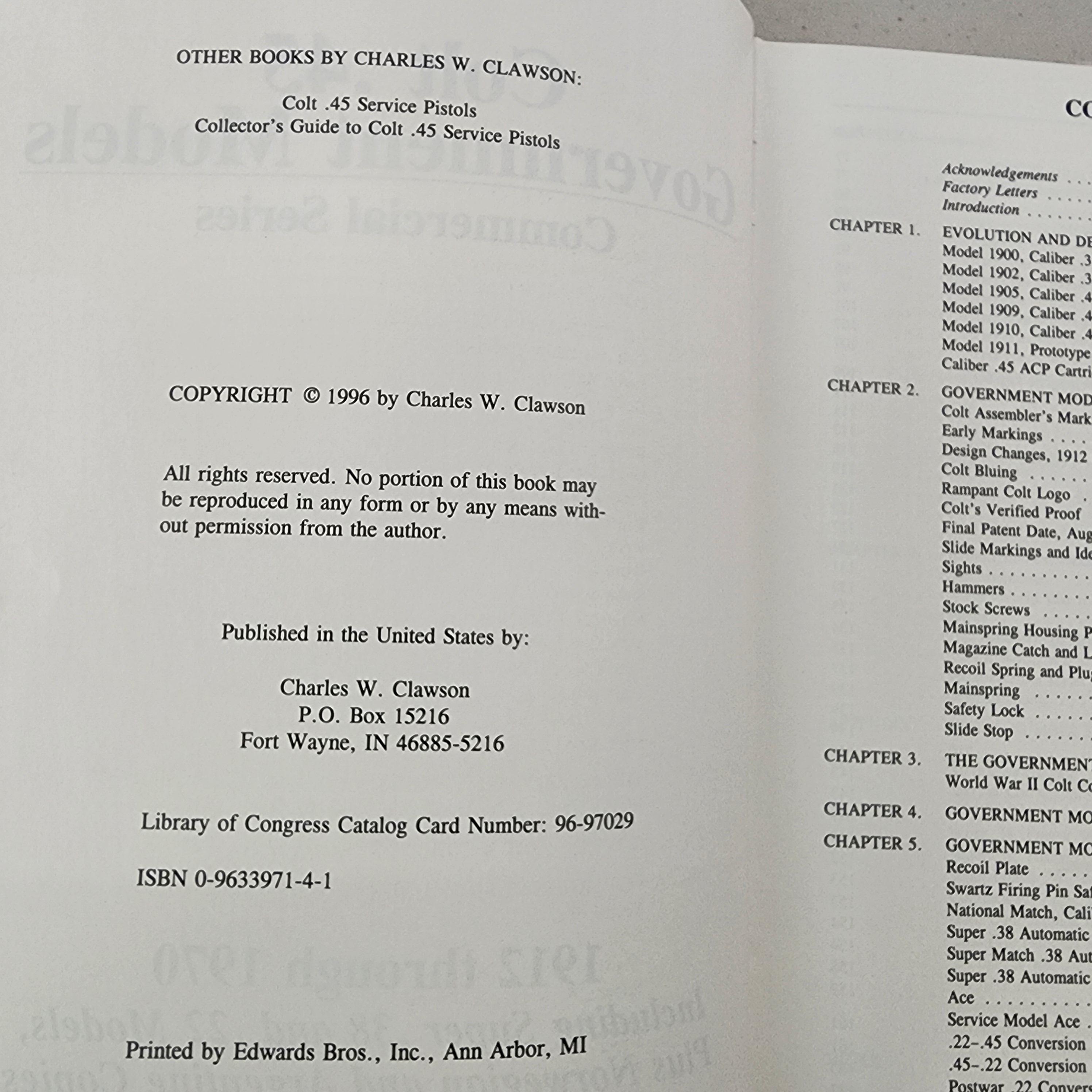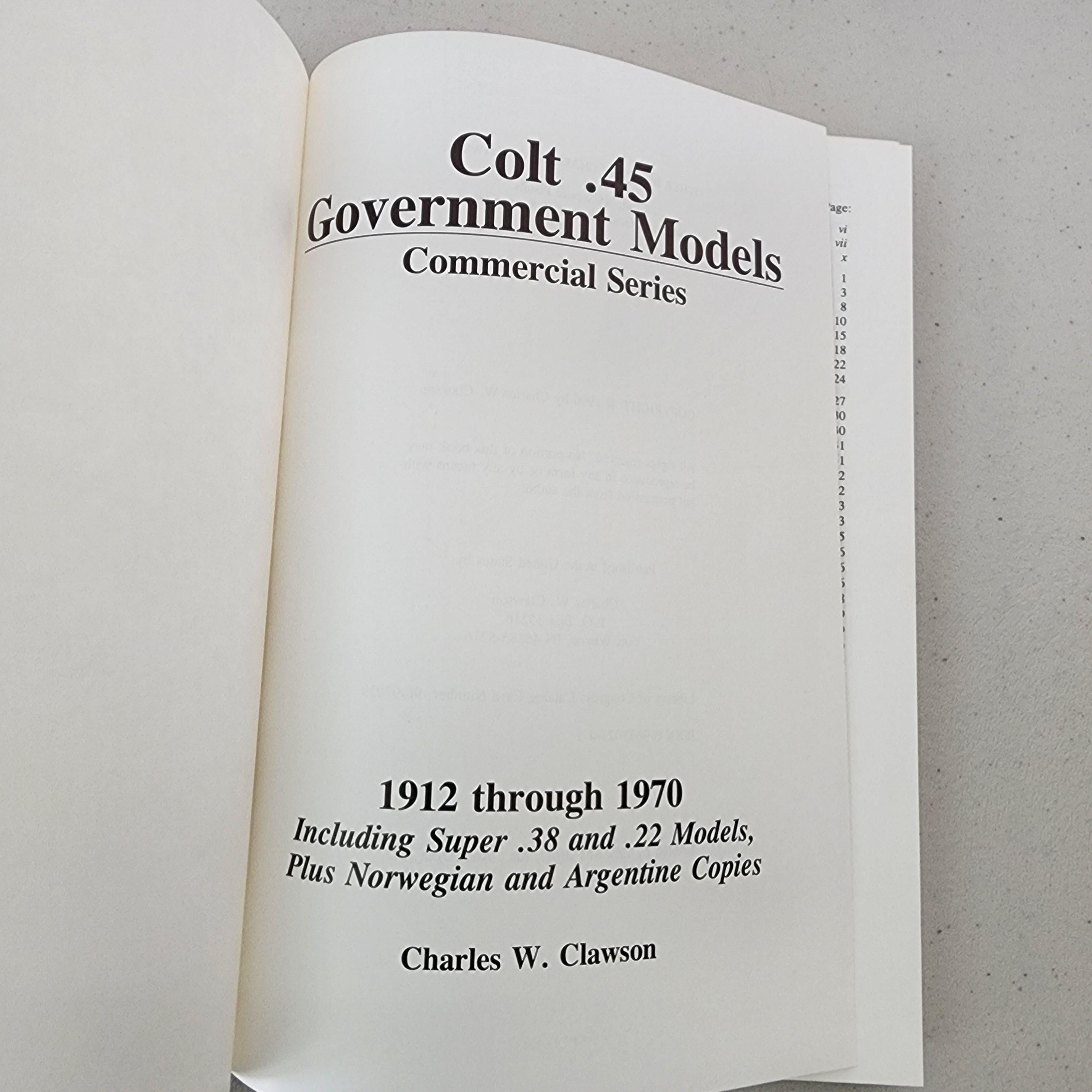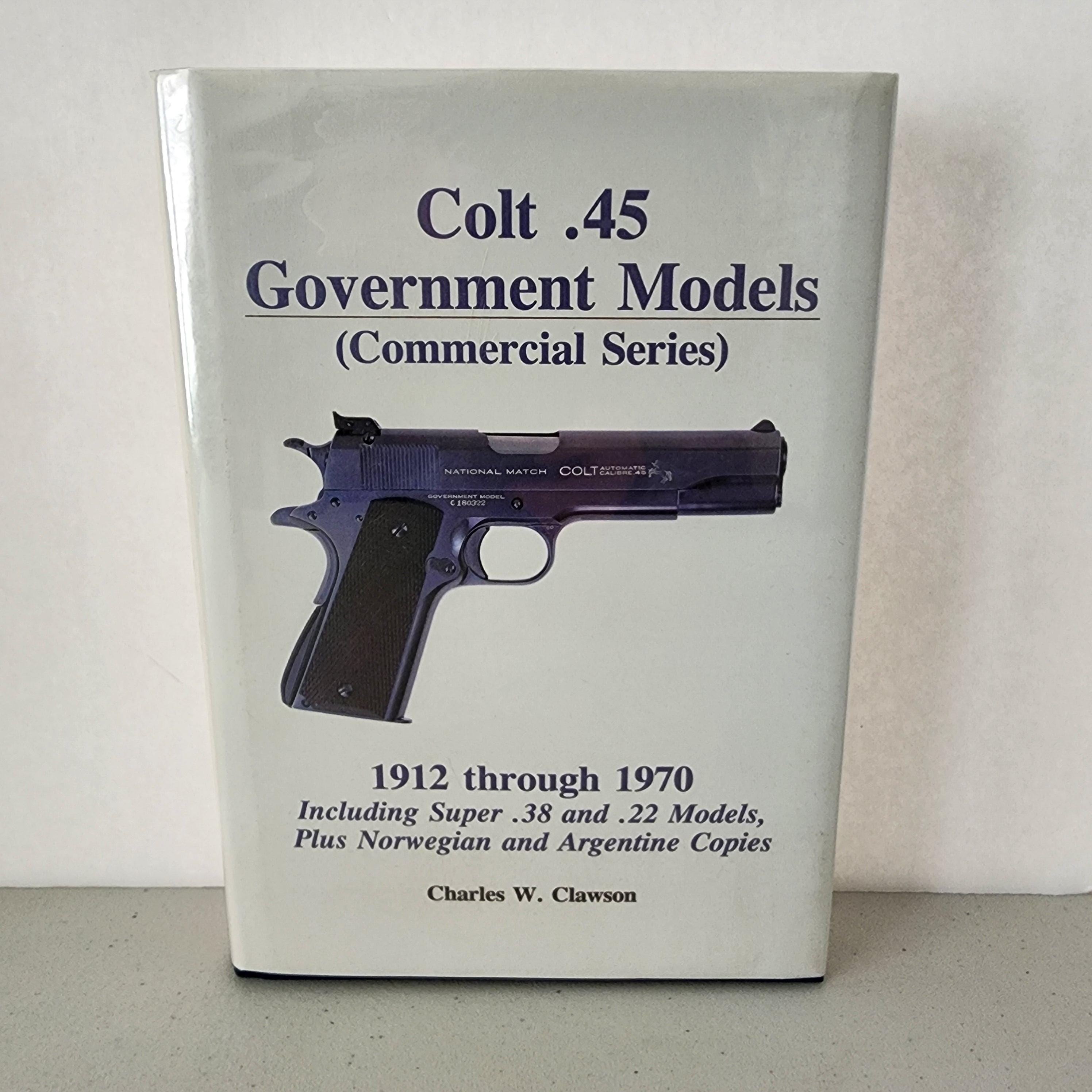 Colt .45 Government Models (Commercial Series) 1st edition hardcover book by Charles W. Clawson. Covers 1912 through 1970 models including the Super .38 and .22, plus Norwegian and Argentine copies. 230 pages.