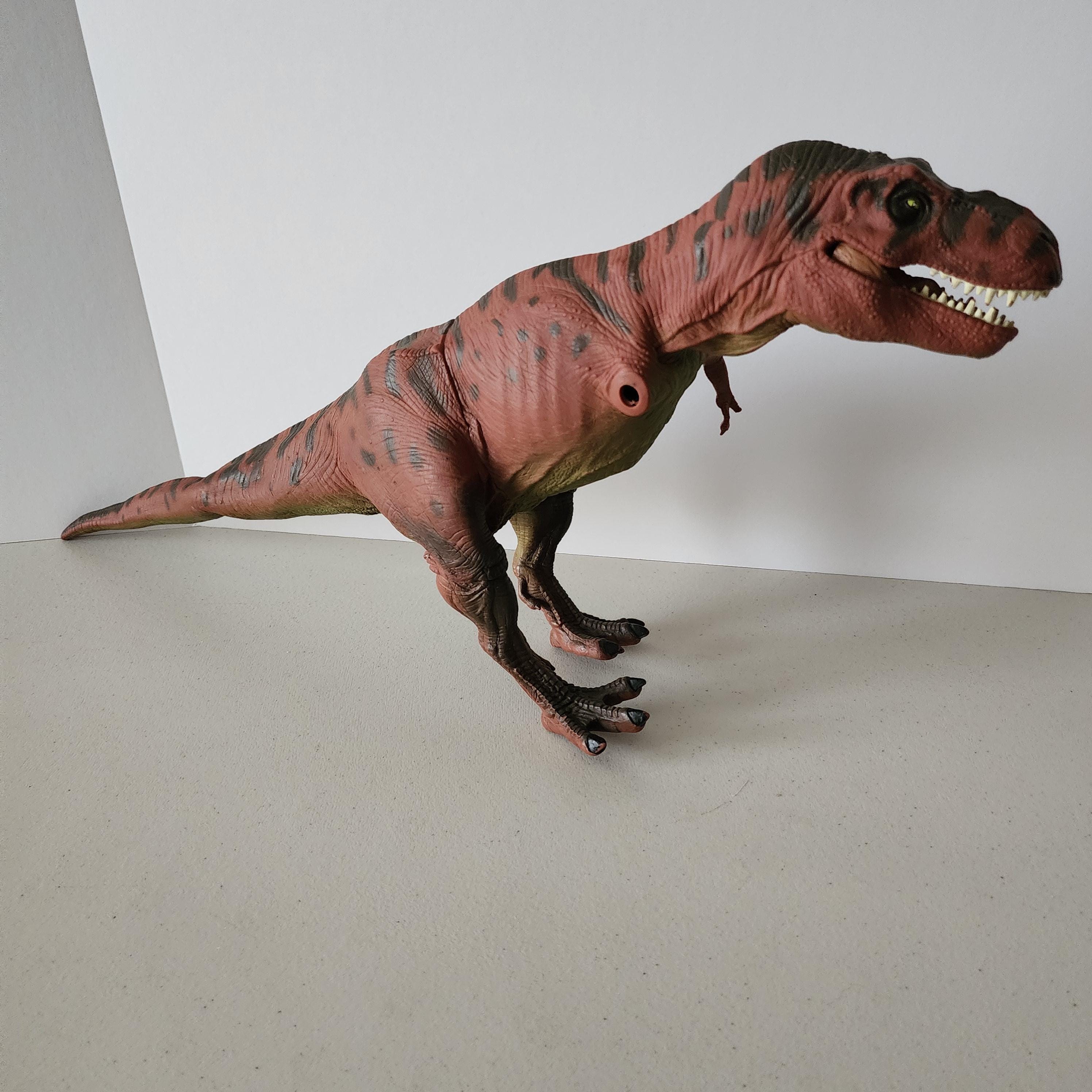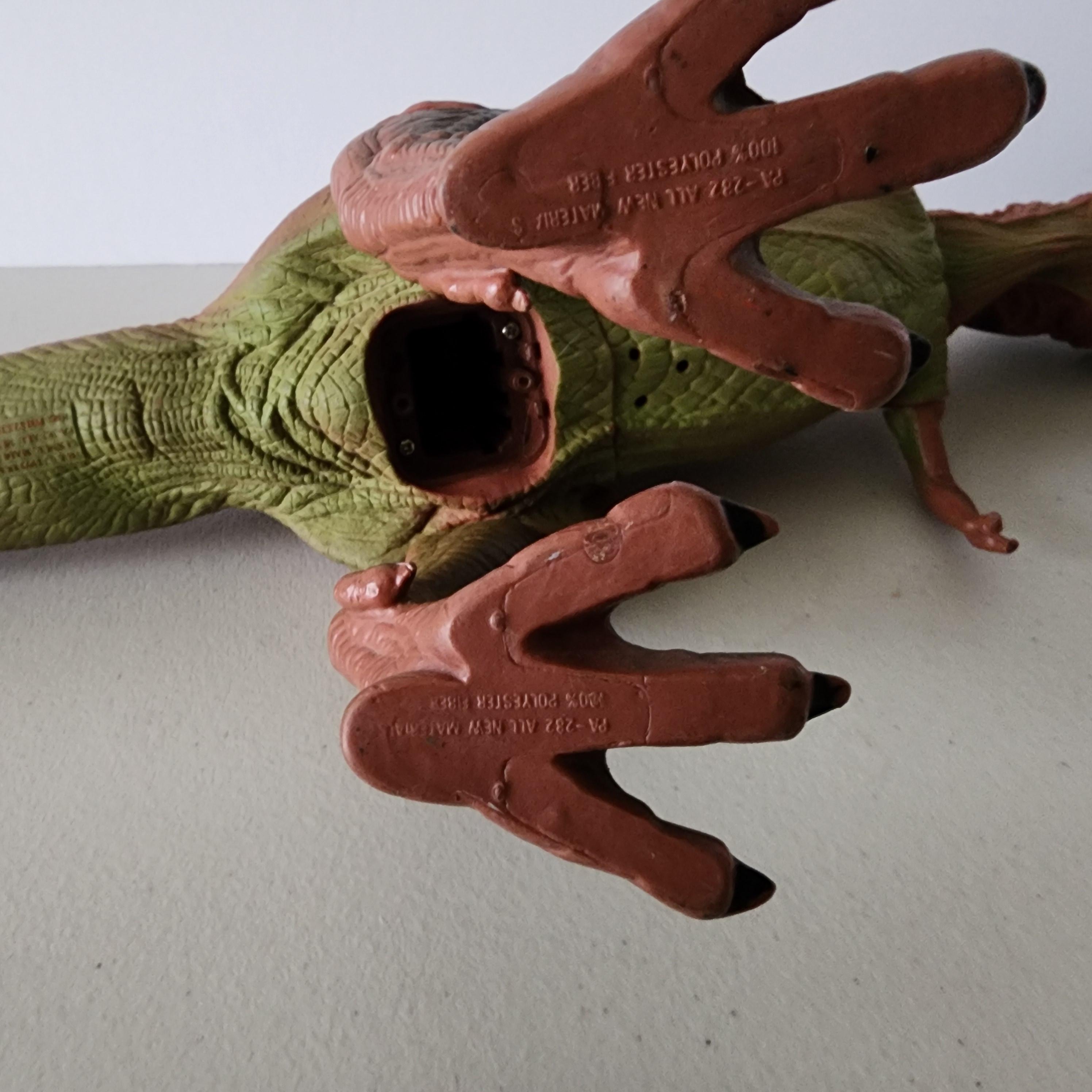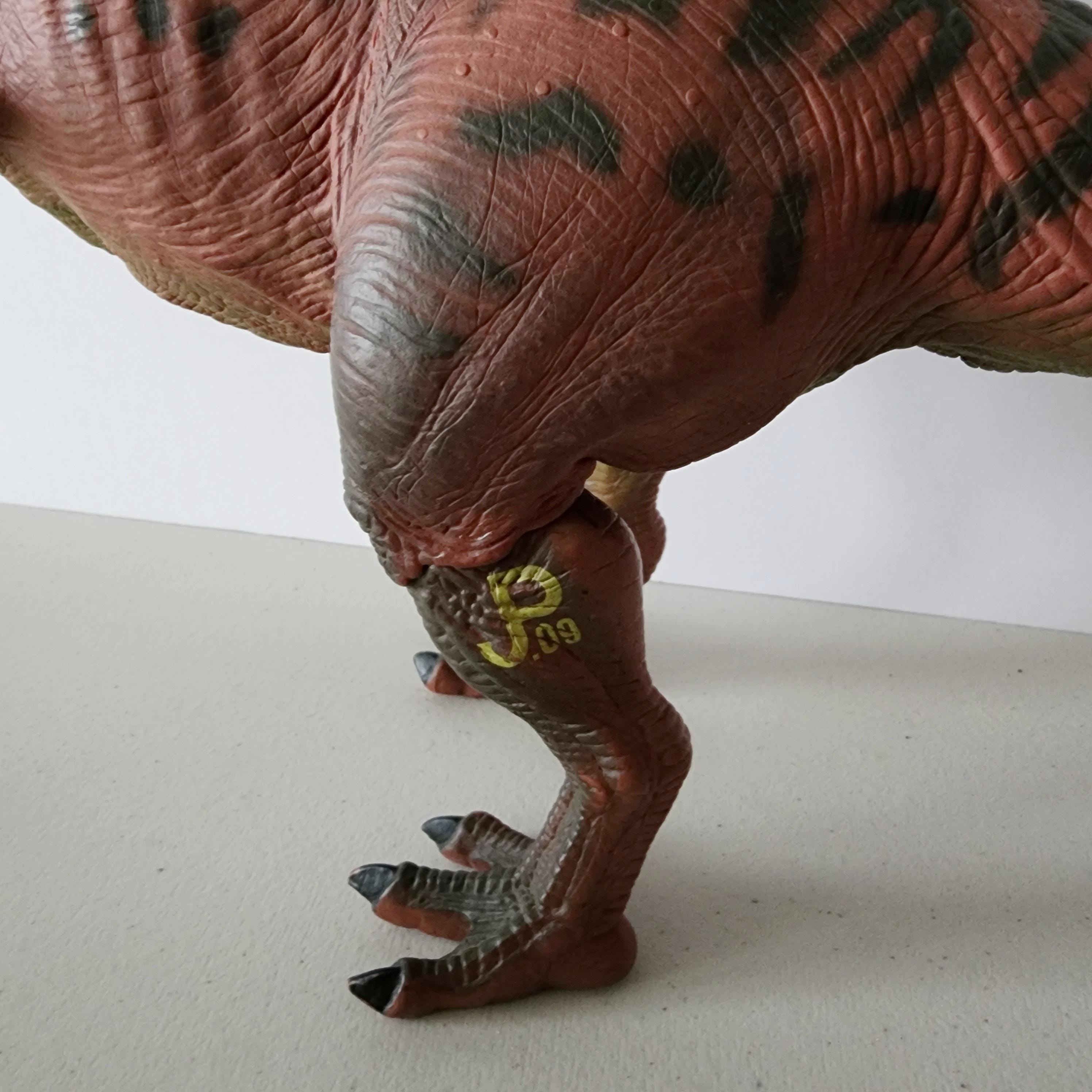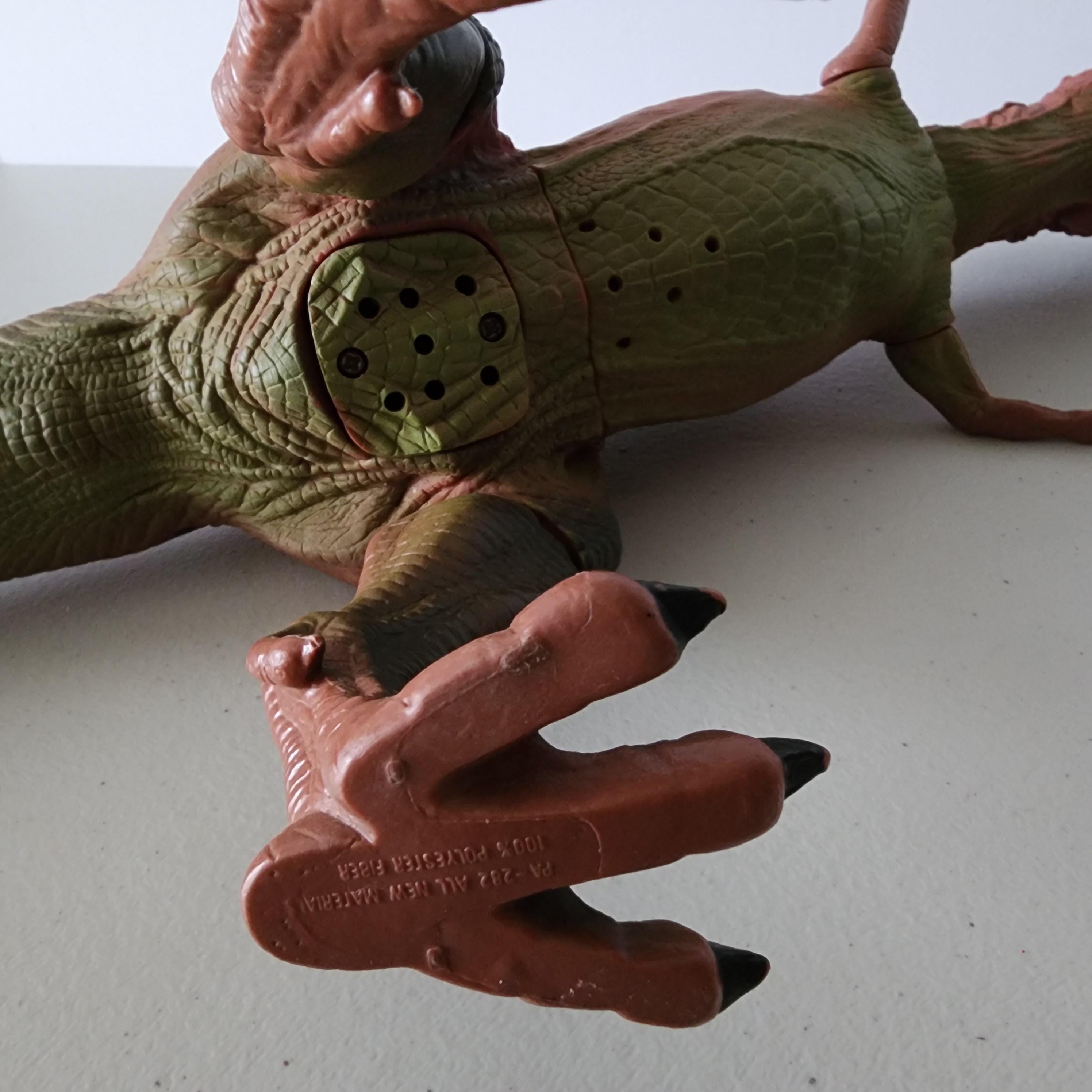 The first dinosaur was tested with batteries (Not Included) and he makes noise when you stomp its feet and his mouth opens a little when a spot on his jaw is pushed. Its tail has a bend in it and the rubber type polyester material is cracked as shown. Otherwise it is in great shape.