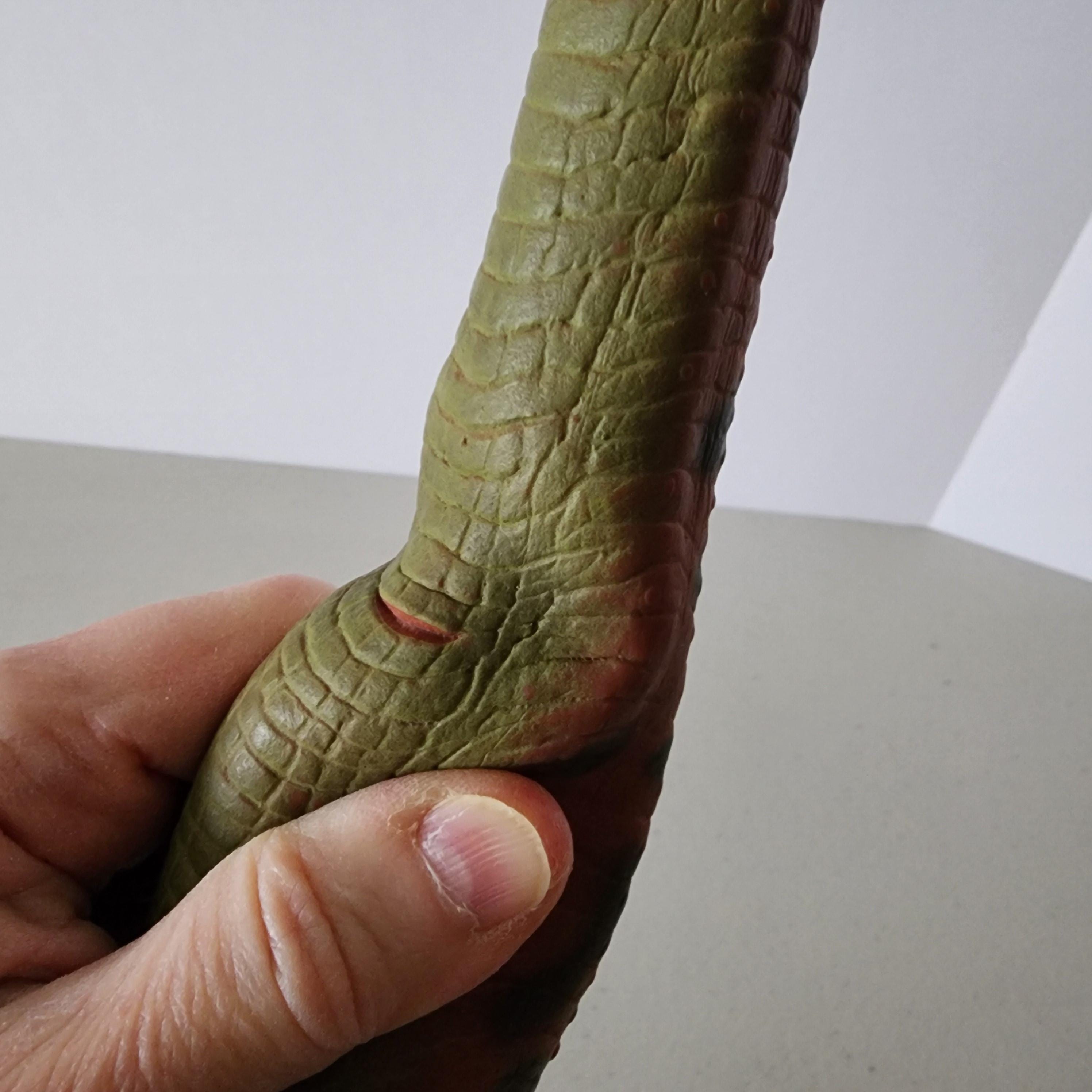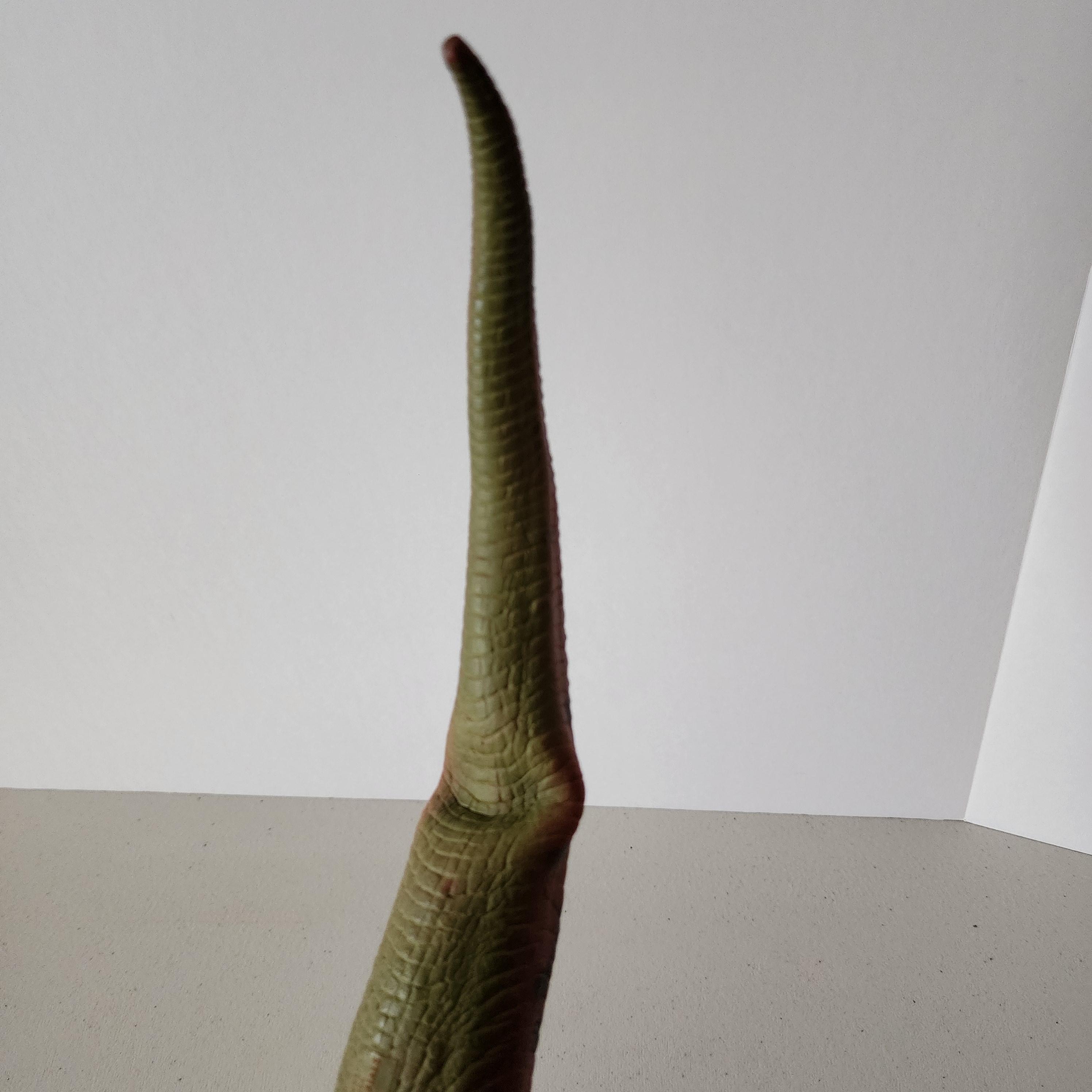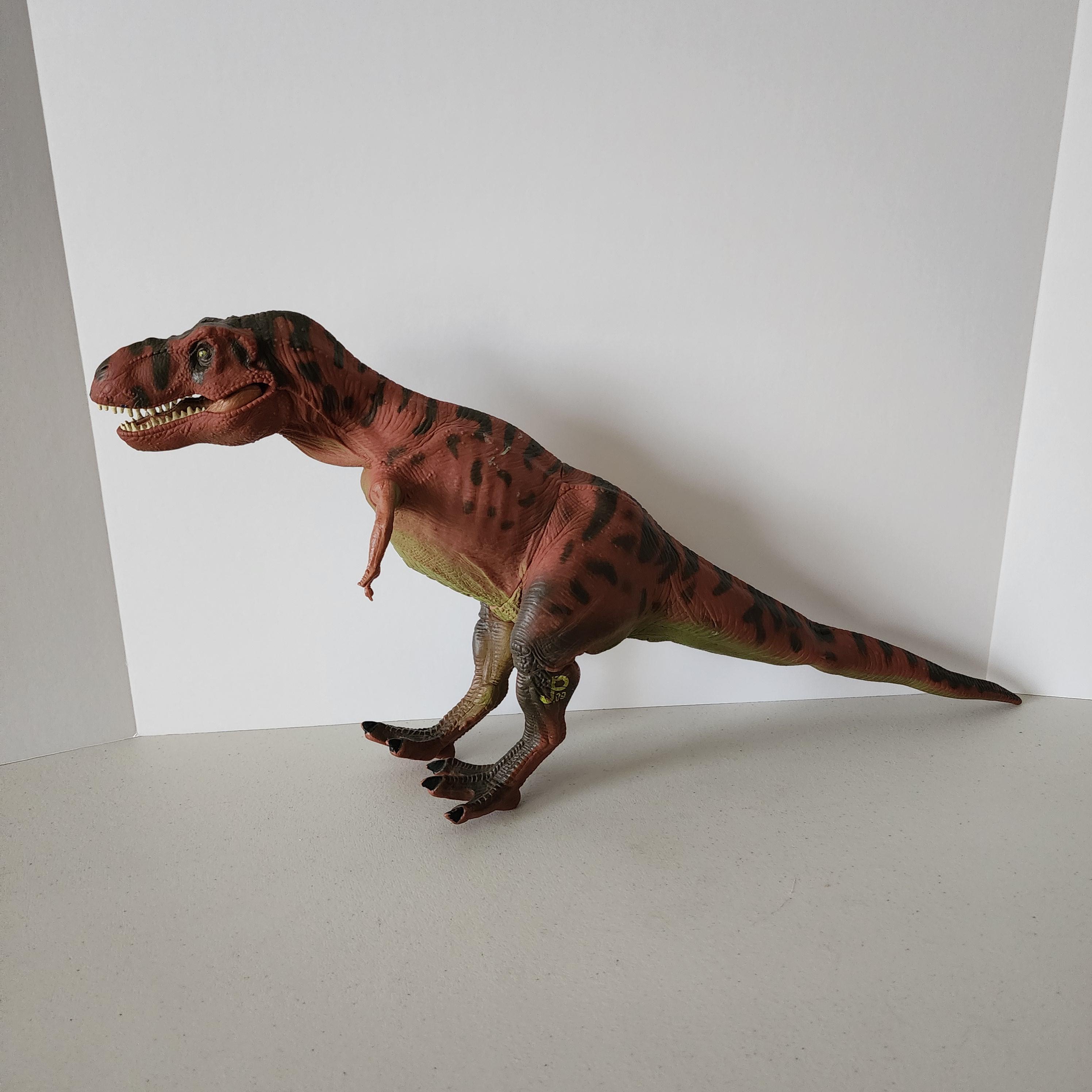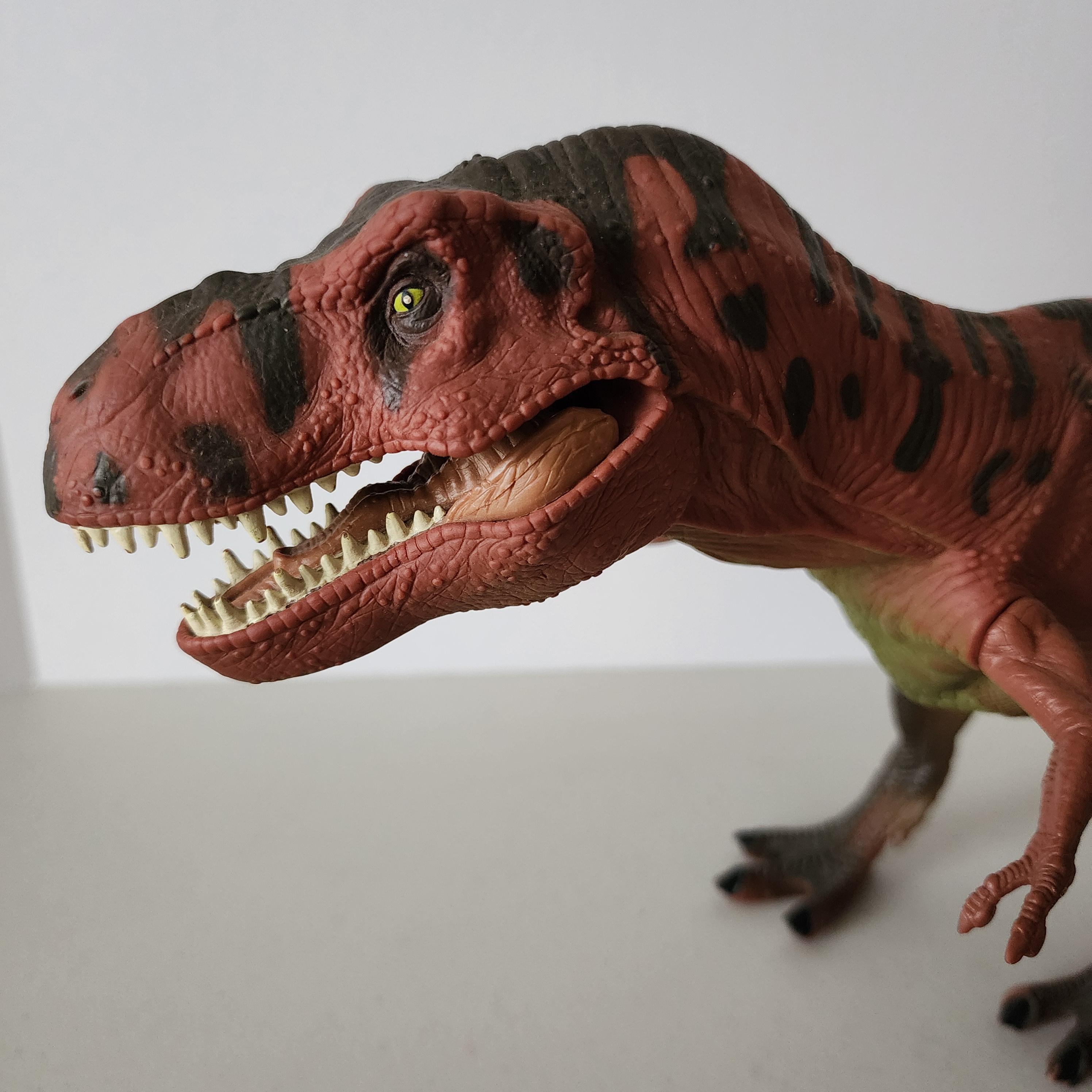 The first dinosaur was tested with batteries (Not Included) and he makes noise when you stomp its feet and his mouth opens a little when a spot on his jaw is pushed. Its tail has a bend in it and the rubber type polyester material is cracked as shown. Otherwise it is in great shape.