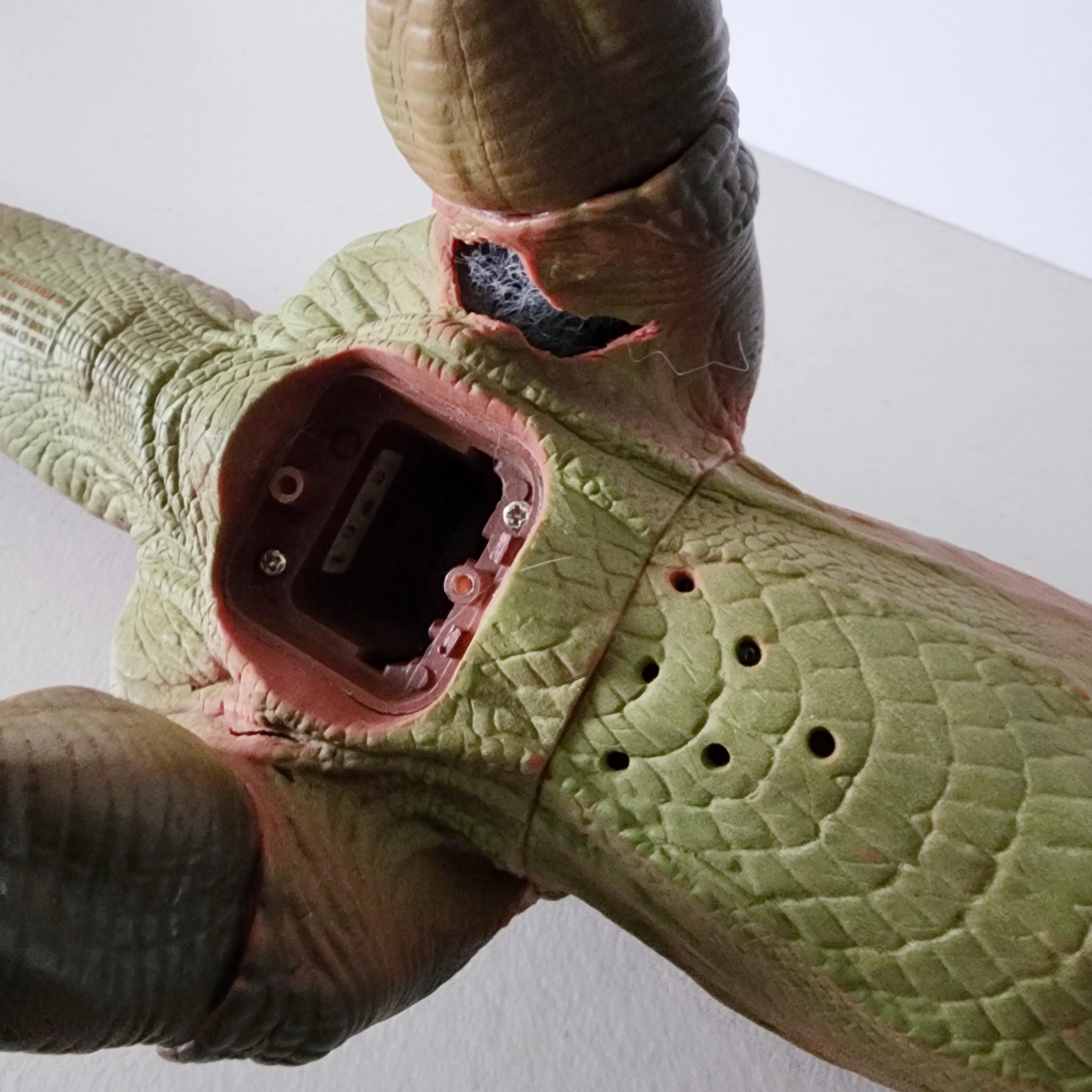 The second one will not stand by itself. It is missing a front leg/arm, missing the battery cover and wires inside have been cut, Both legs have large cracks. There are also some spots of white/silver on him on the body and also a little on the tail. The tail has a slight bend but no crack. Please see all photos.