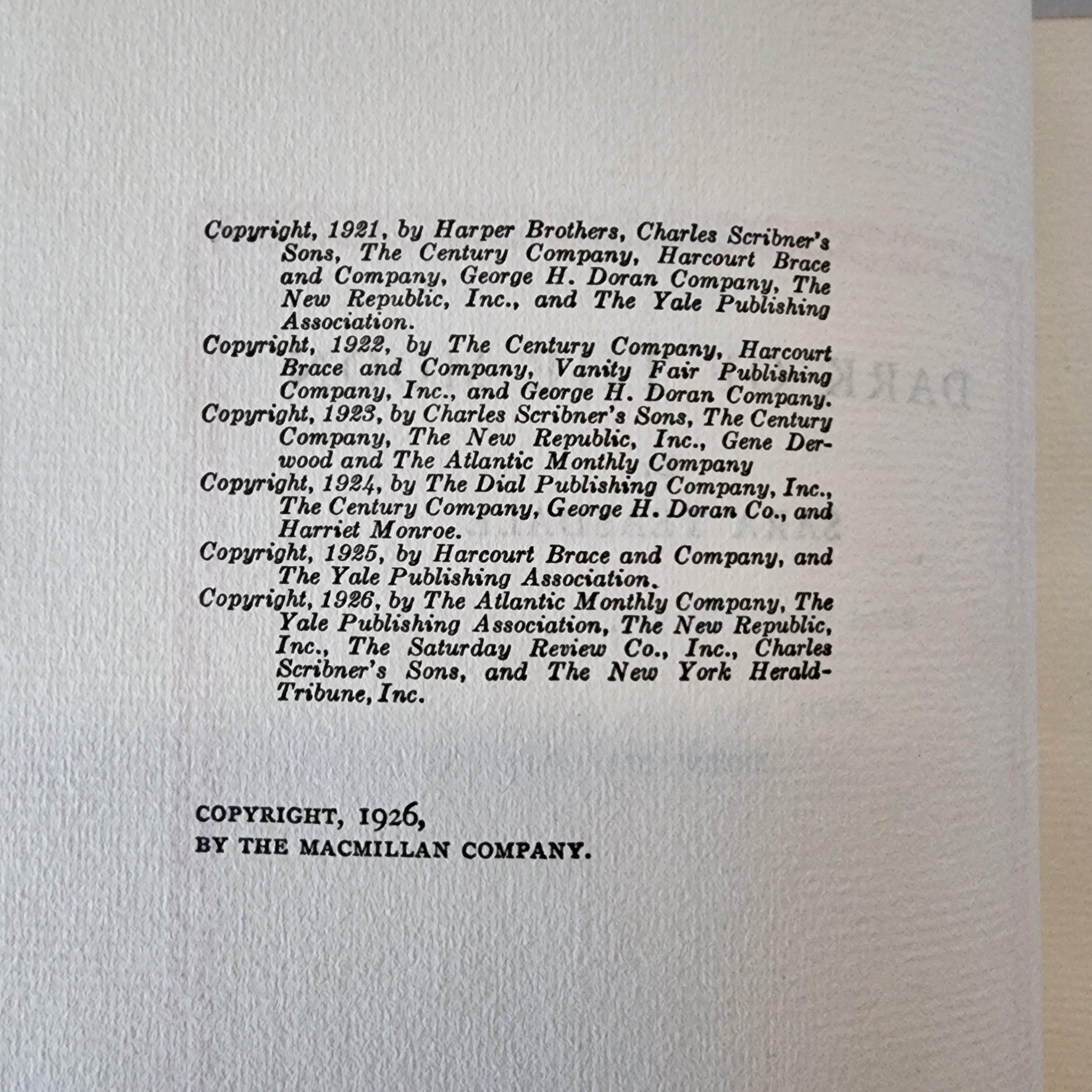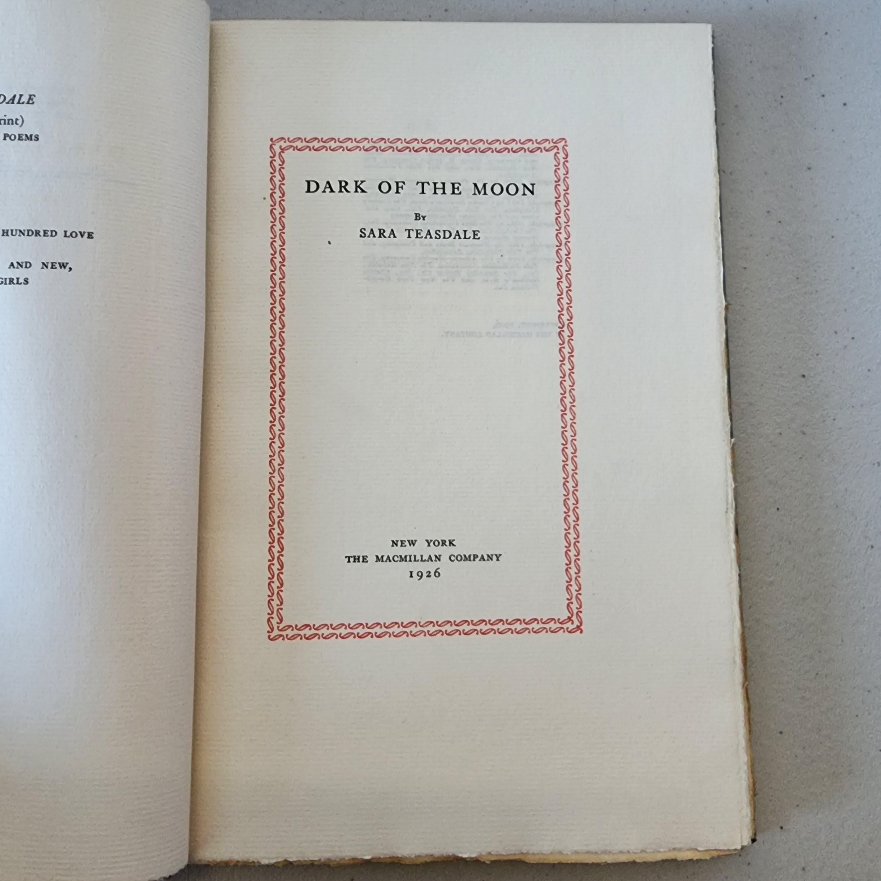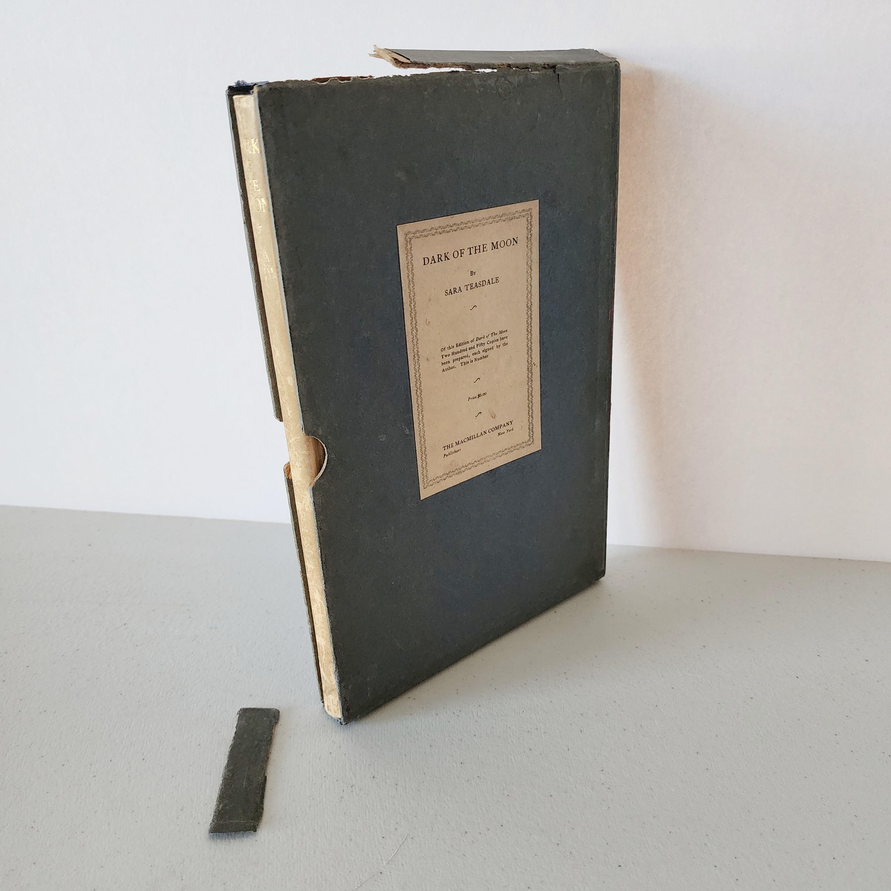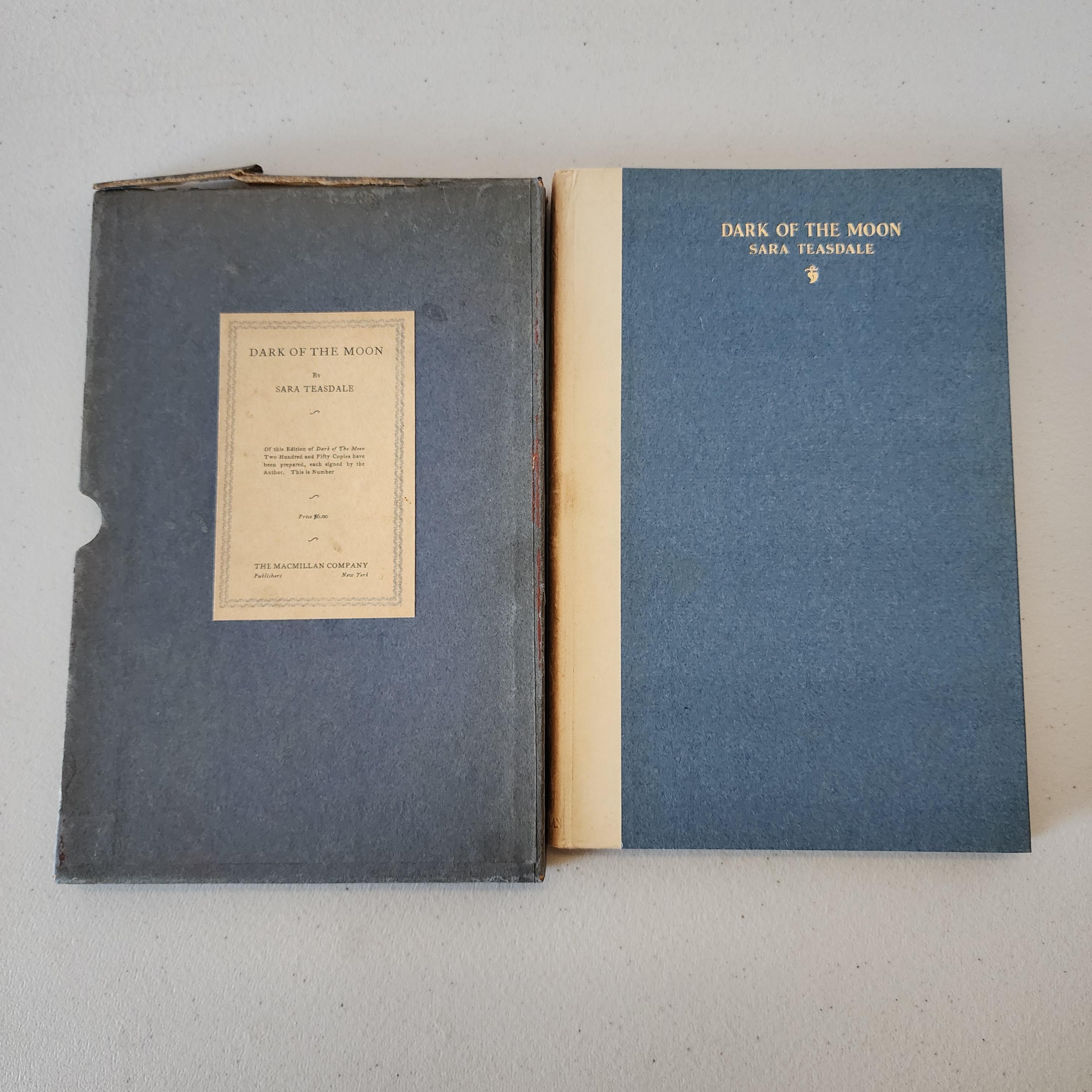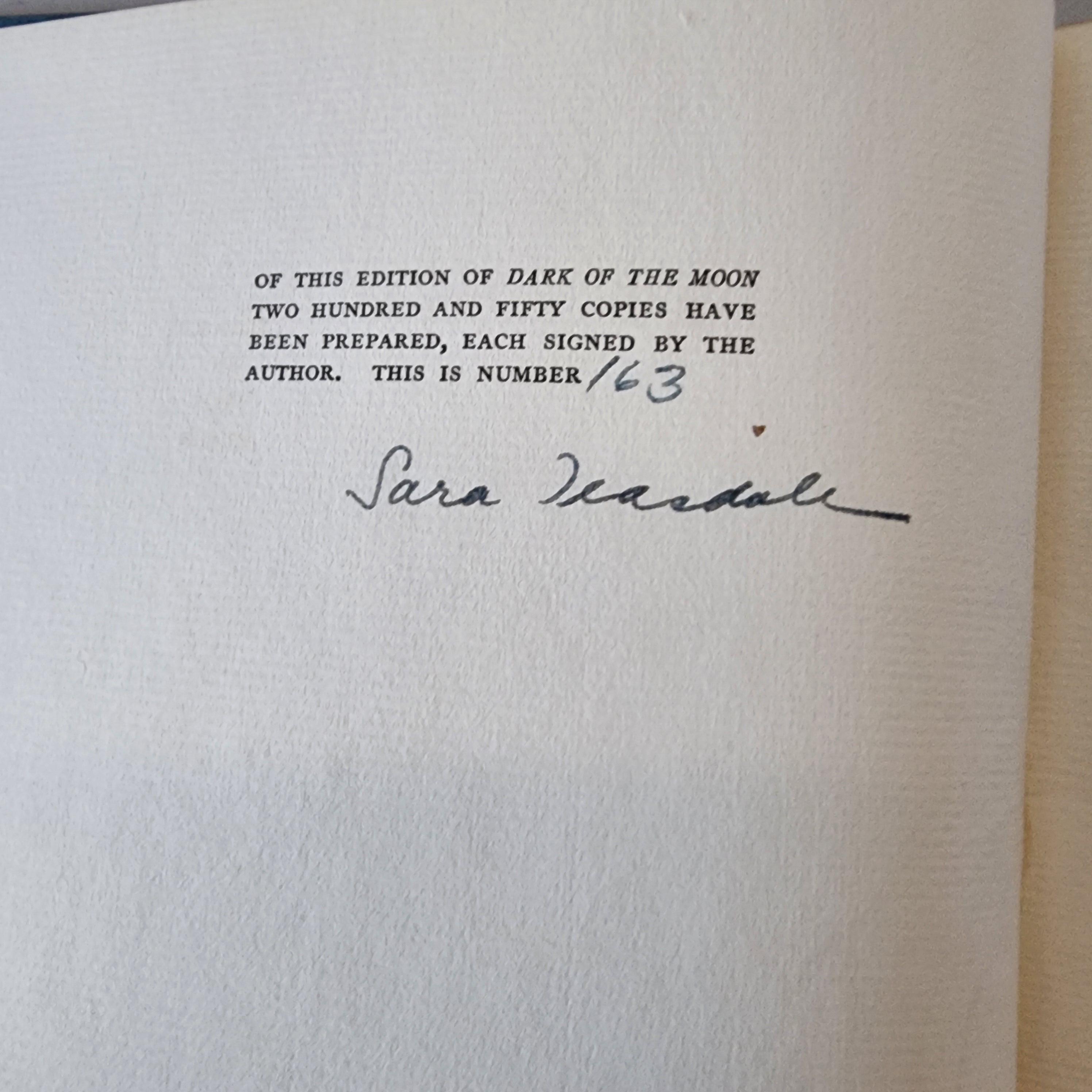 This is a rare signed, numbered edition of Dark Of The Moon by Sara Teasdale. This hard cover book, a collection of poetry, comes in a slipcase with label on the front. ©1926 The Macmillan Company, 92 pages and is number 163 out of 250 signed by Sara.