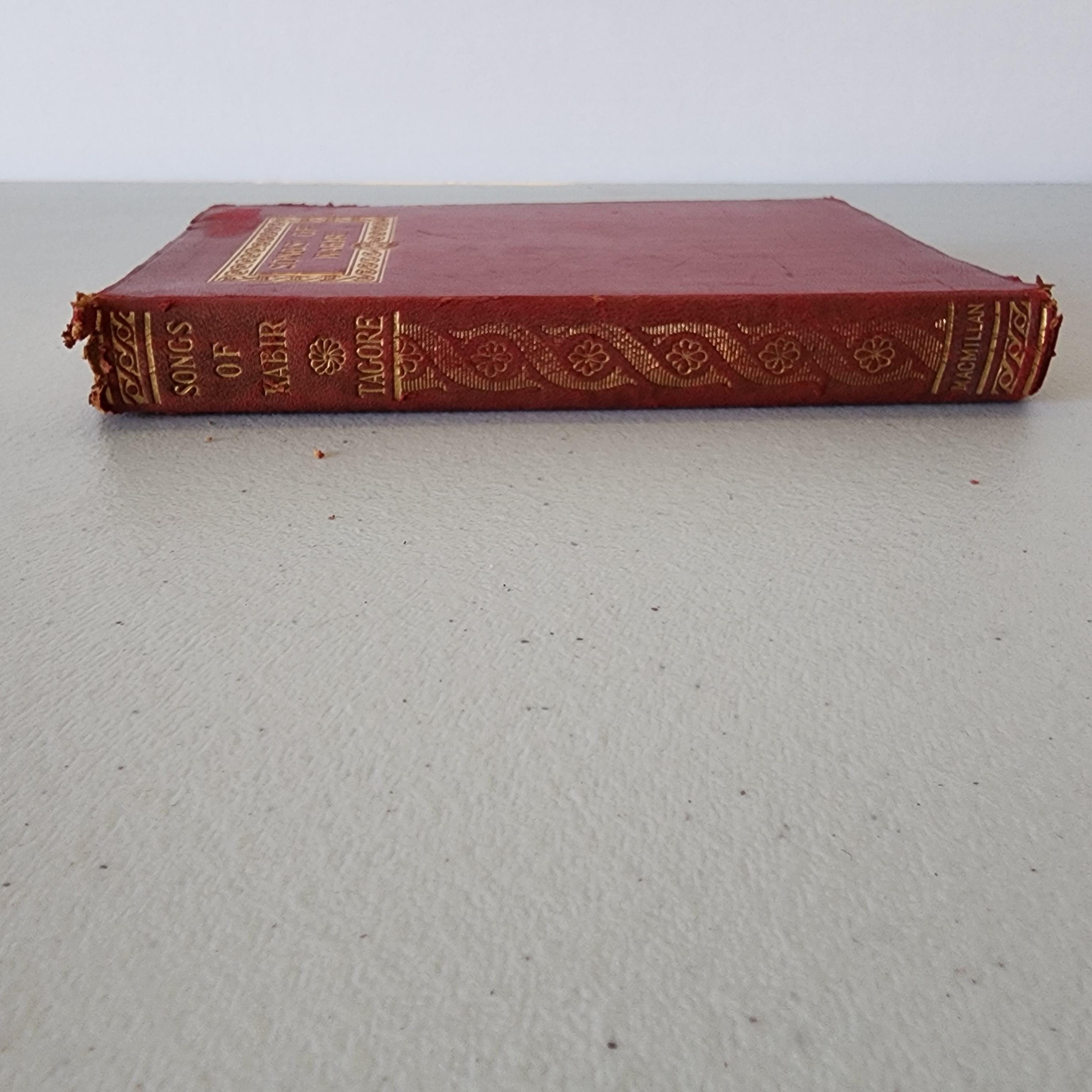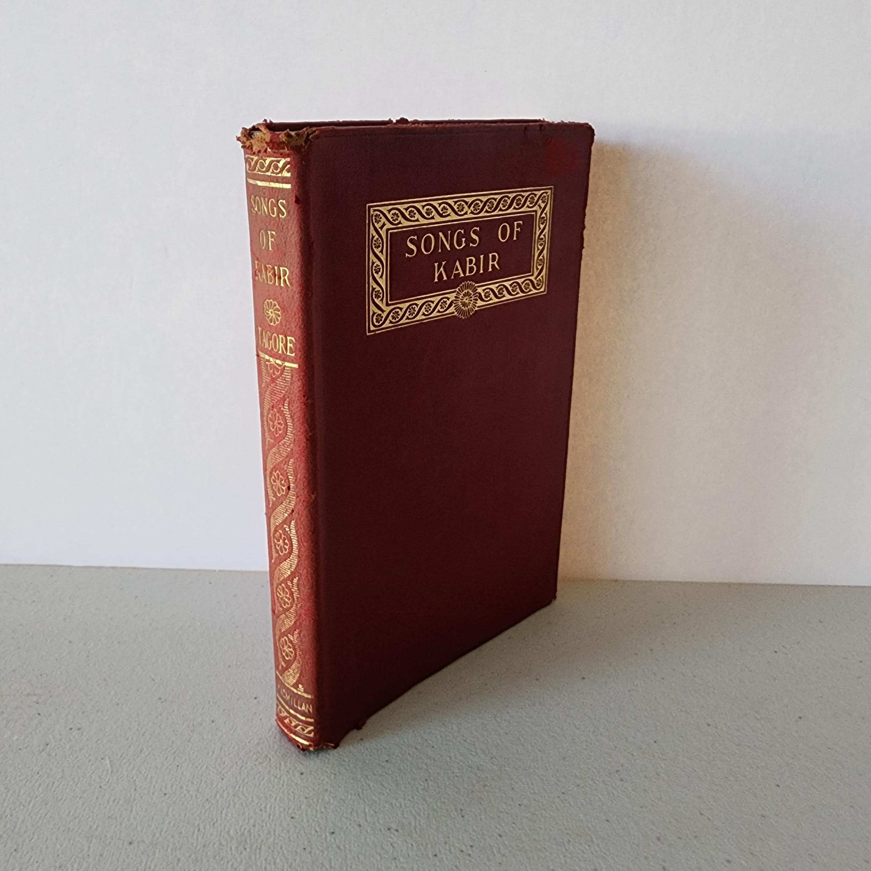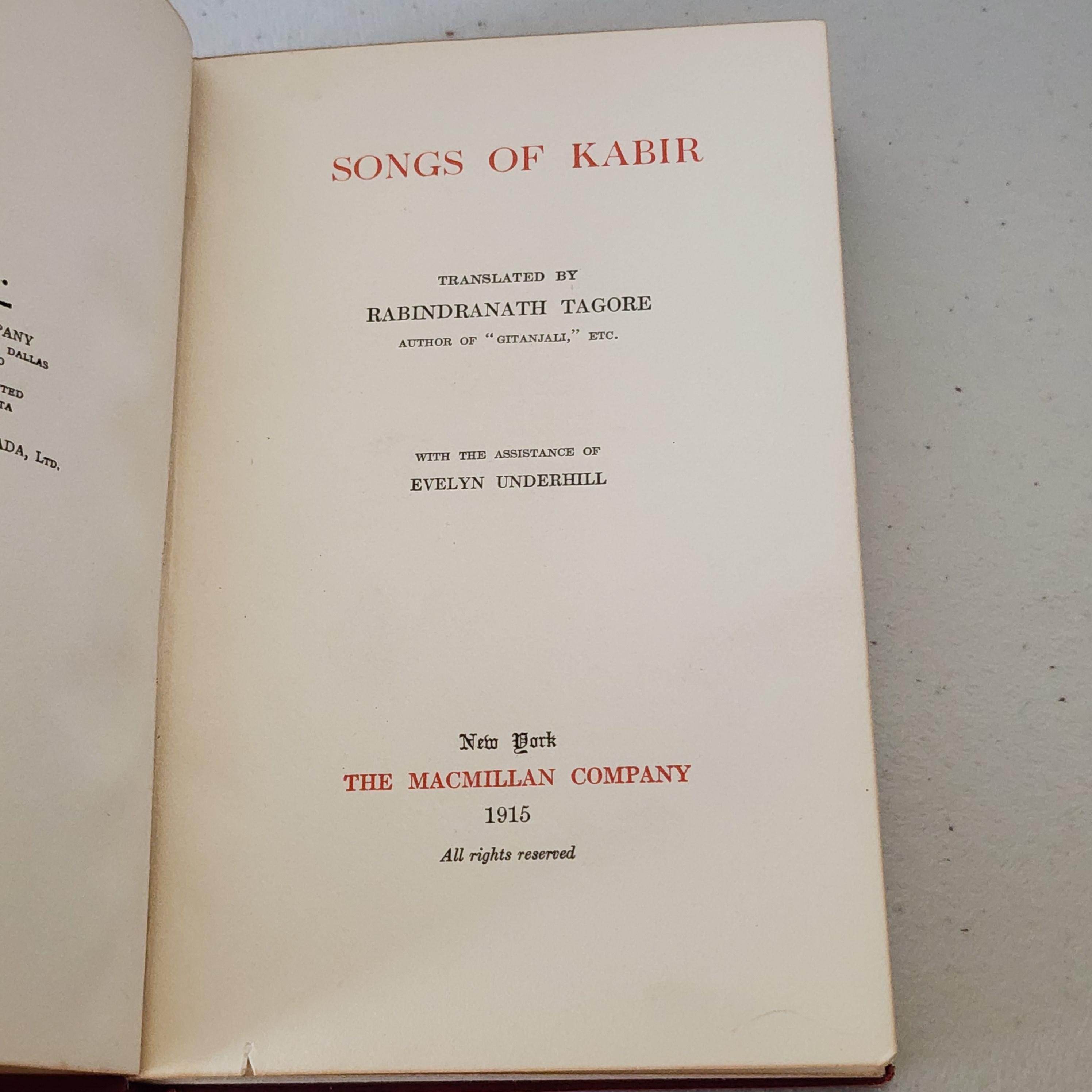 Songs Of Kabir leather bound hard cover book, translated by Rabindranath Tagore with assistance of Evelyn Underhill. Published in 1915 by The Macmillan Company. Collection of poetry. 145 pages plus advertisements in the back.
