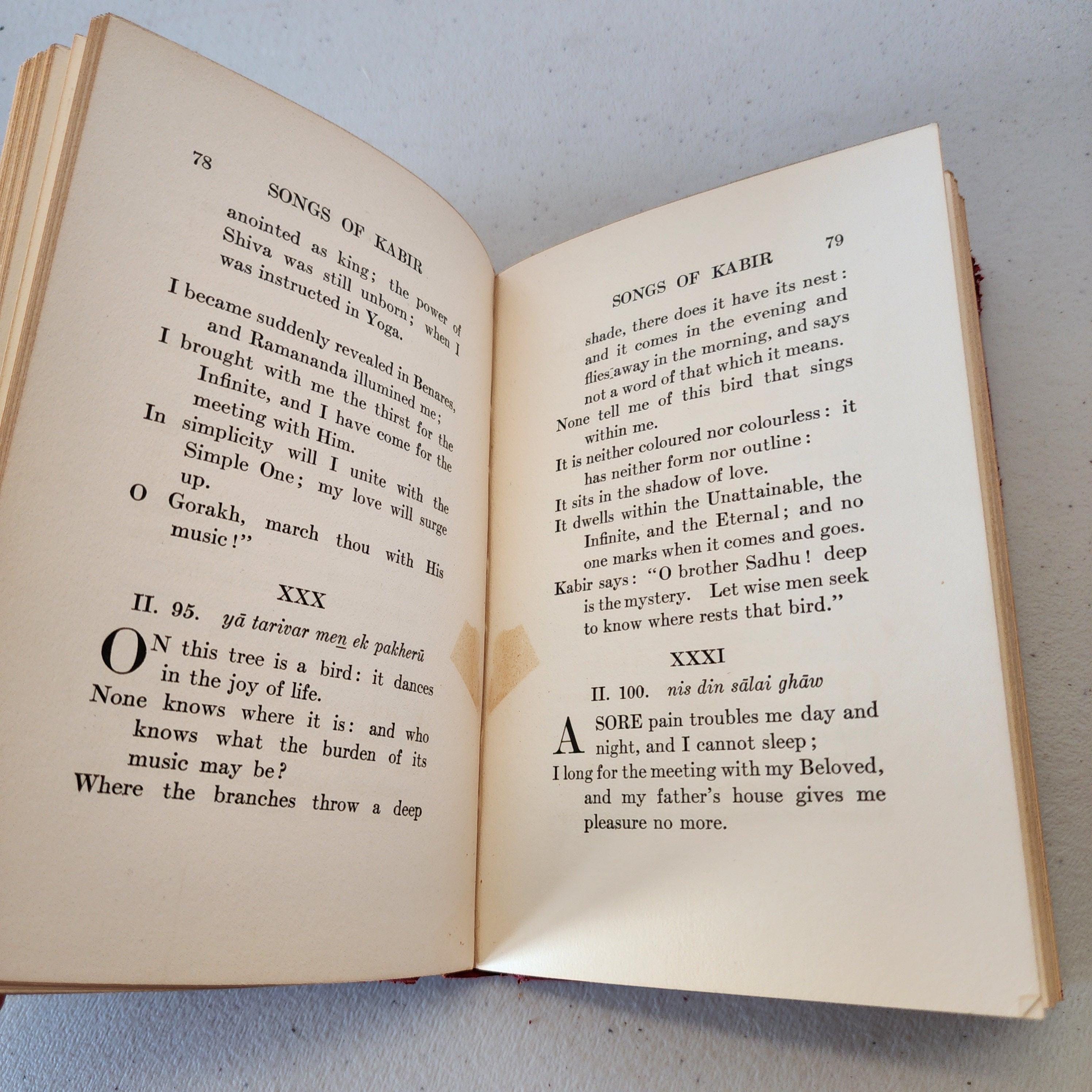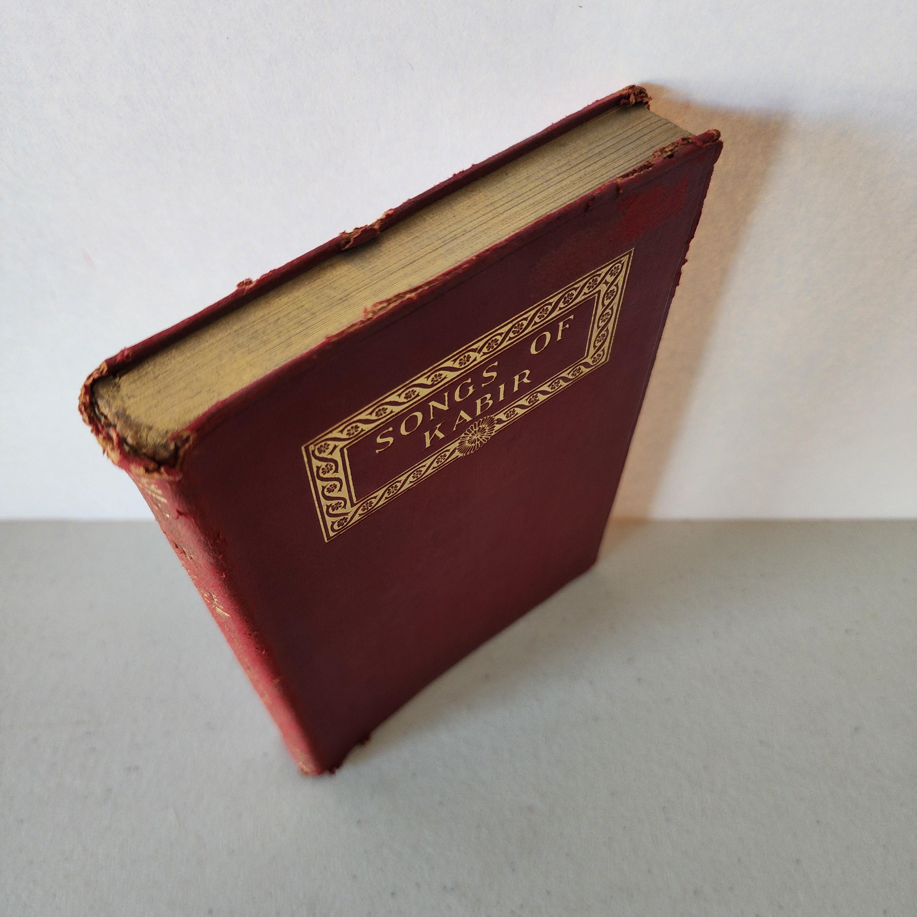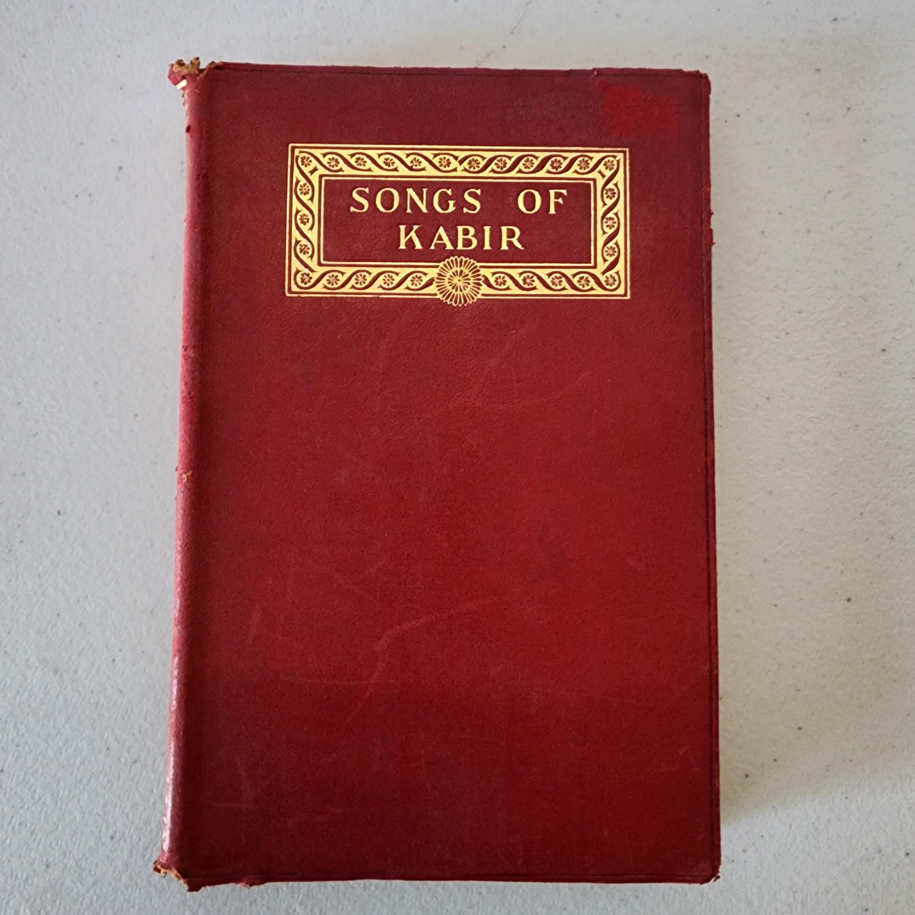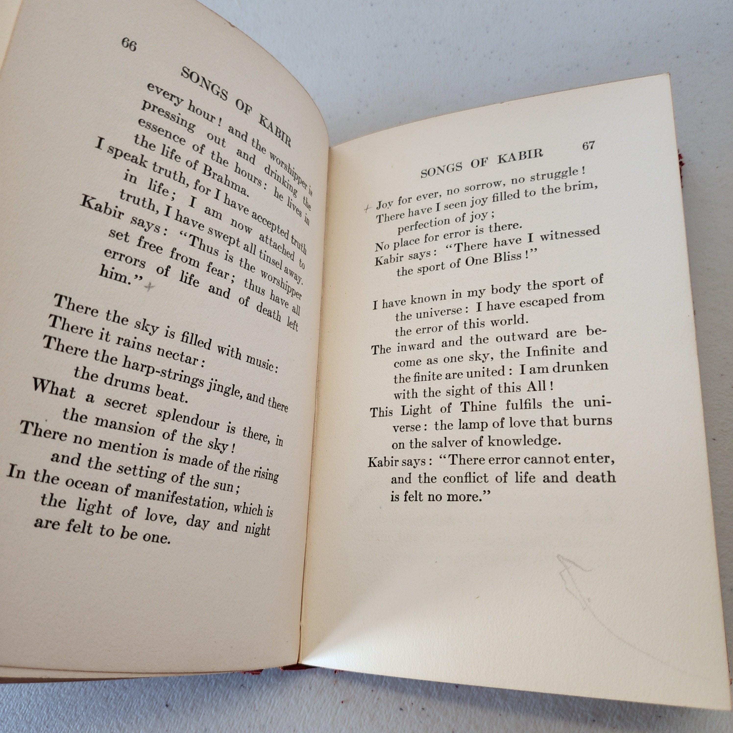 Songs Of Kabir leather bound hard cover book, translated by Rabindranath Tagore with assistance of Evelyn Underhill. Published in 1915 by The Macmillan Company. Collection of poetry. 145 pages plus advertisements in the back.