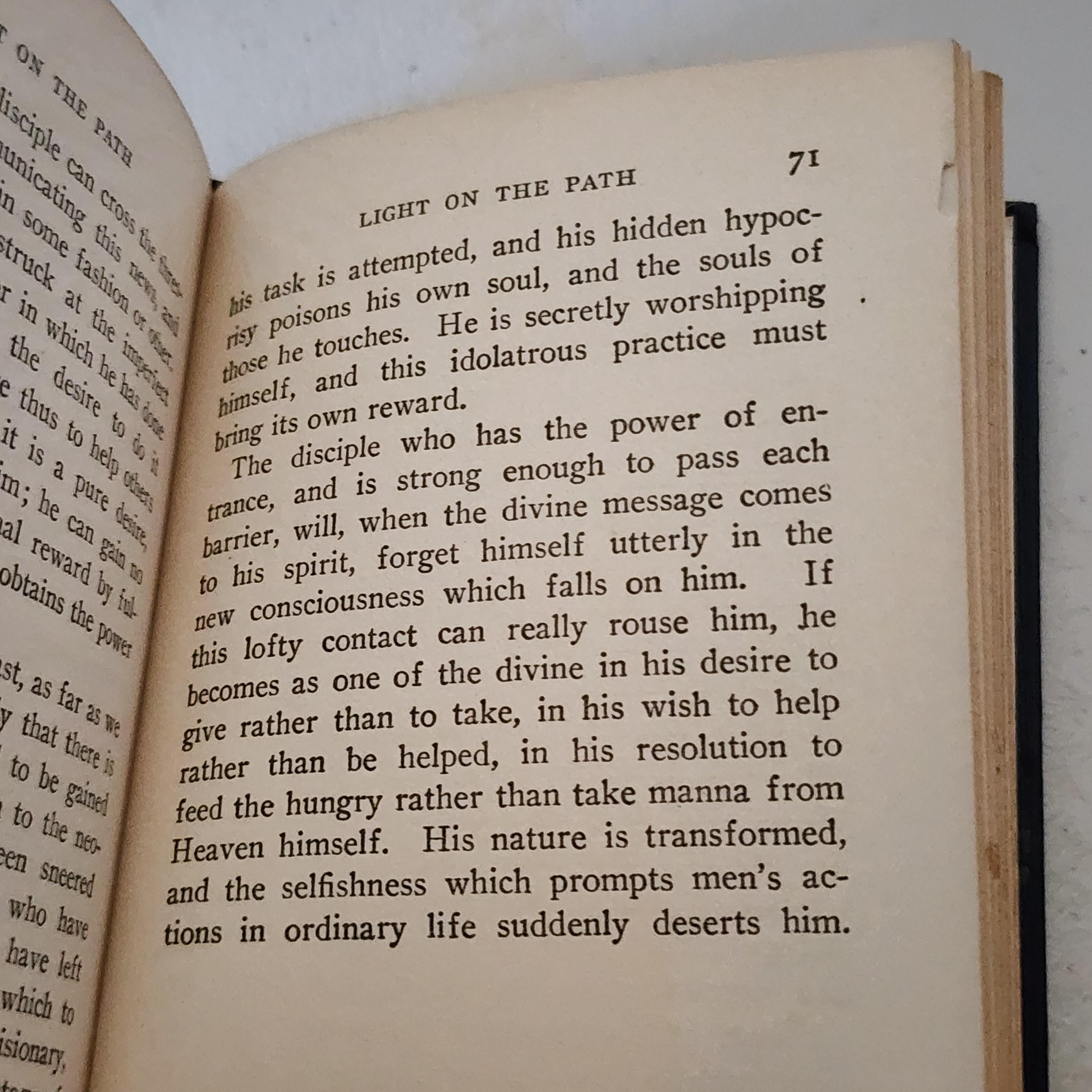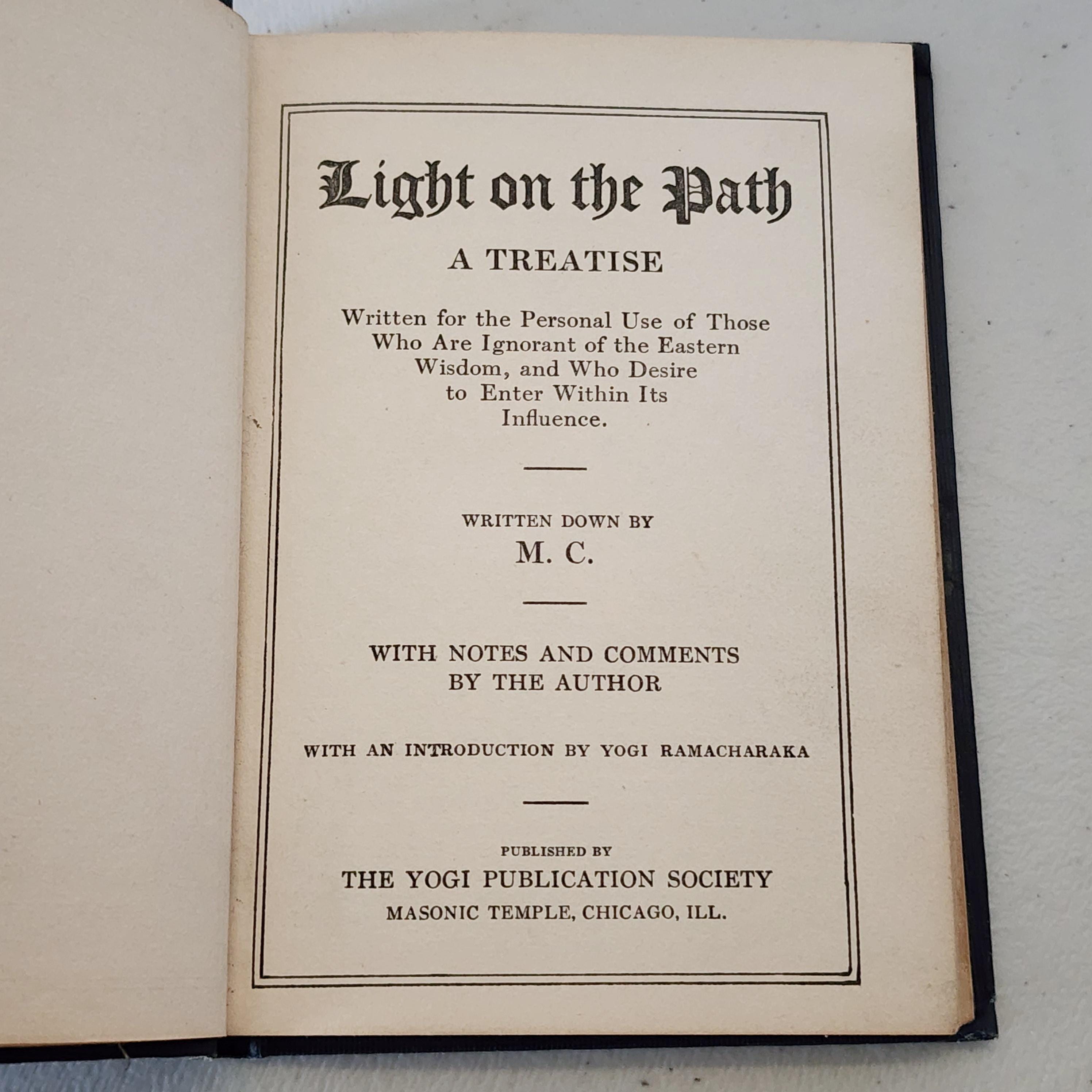 Light On The Path - A Treatise. Published by The Yogi Publication Society Masonic Temple. Written down by M.C. (Mabel Collins). I don't see mention of an author's name, and there is no copyright or publishing year. Small book of 92 pages measuring 5.5" x 4".