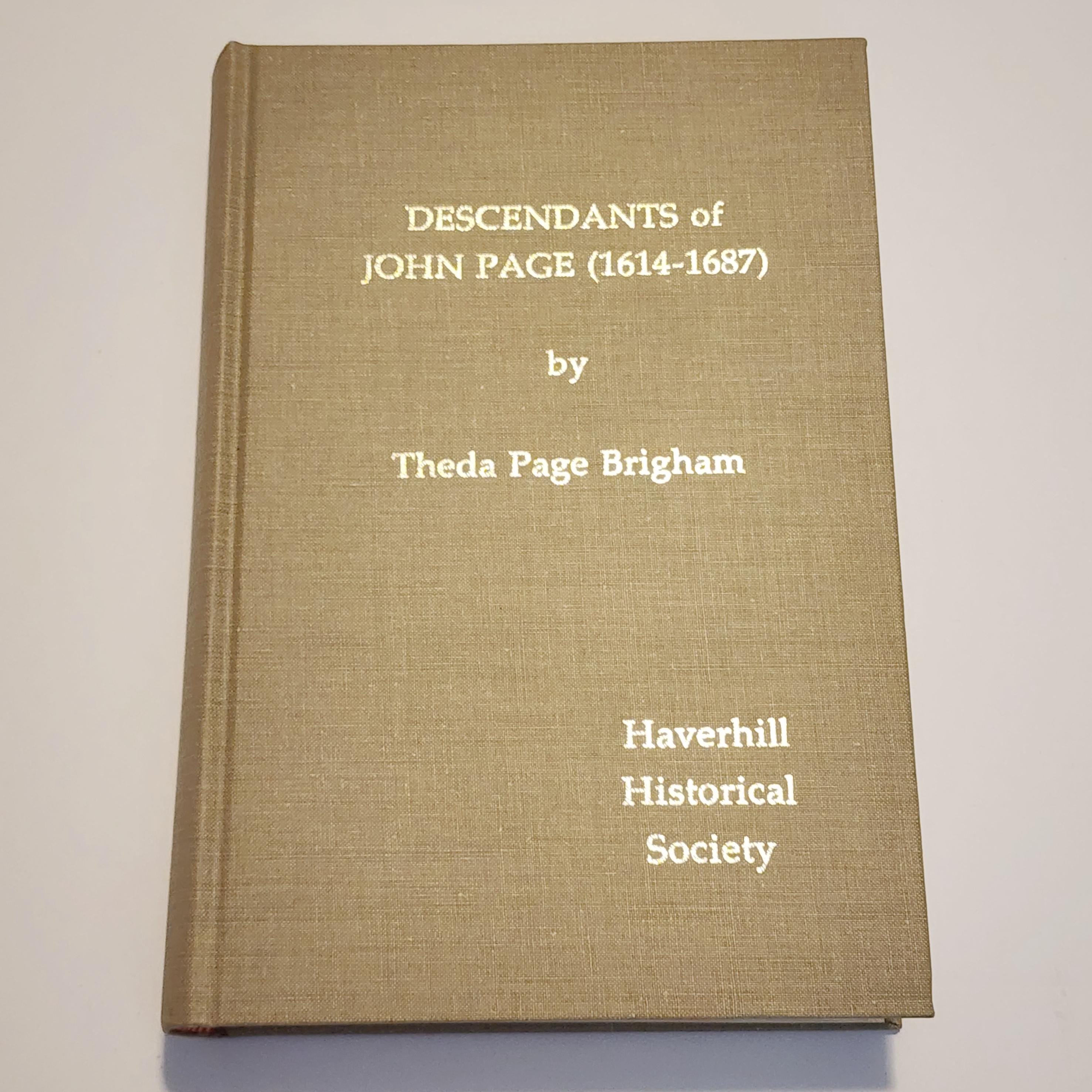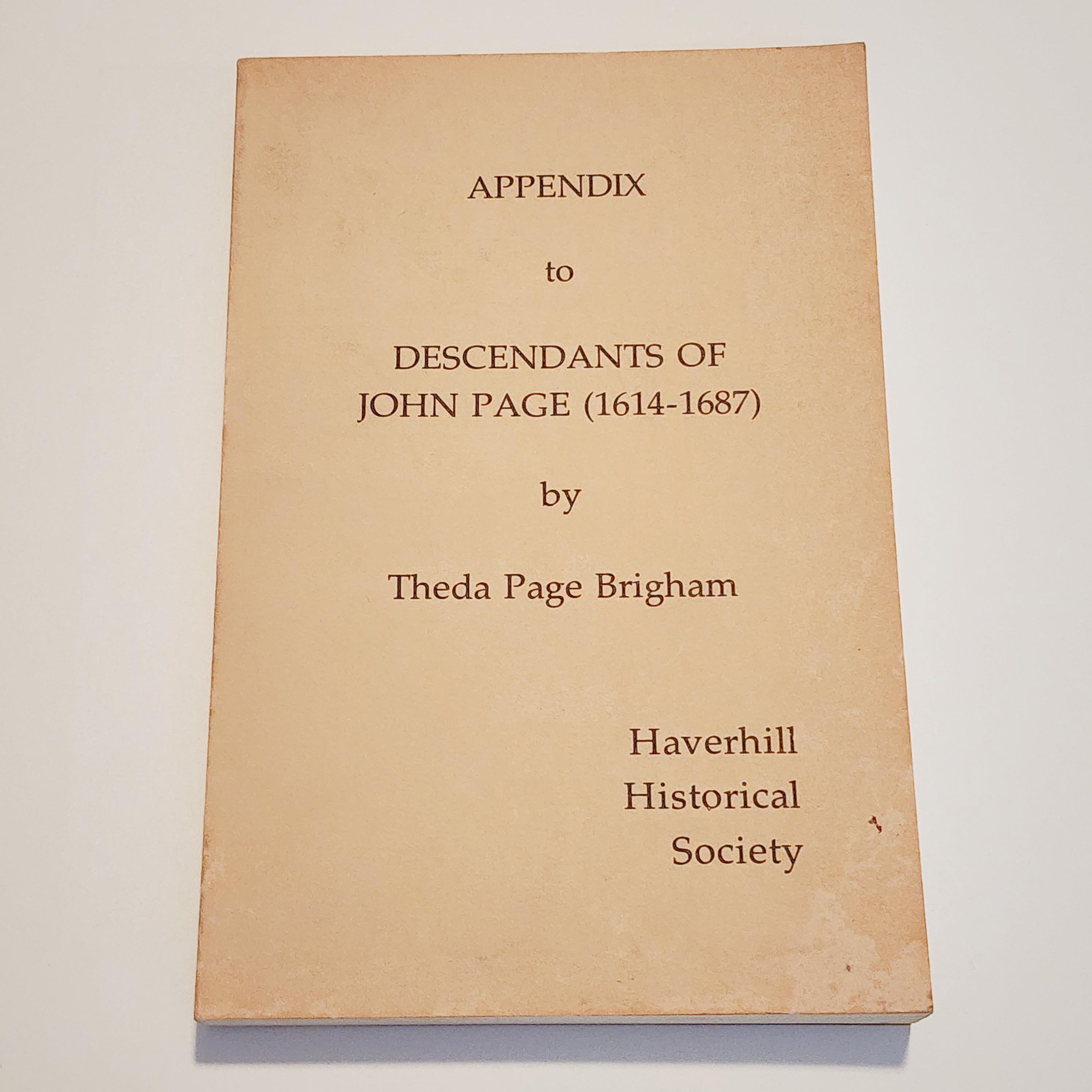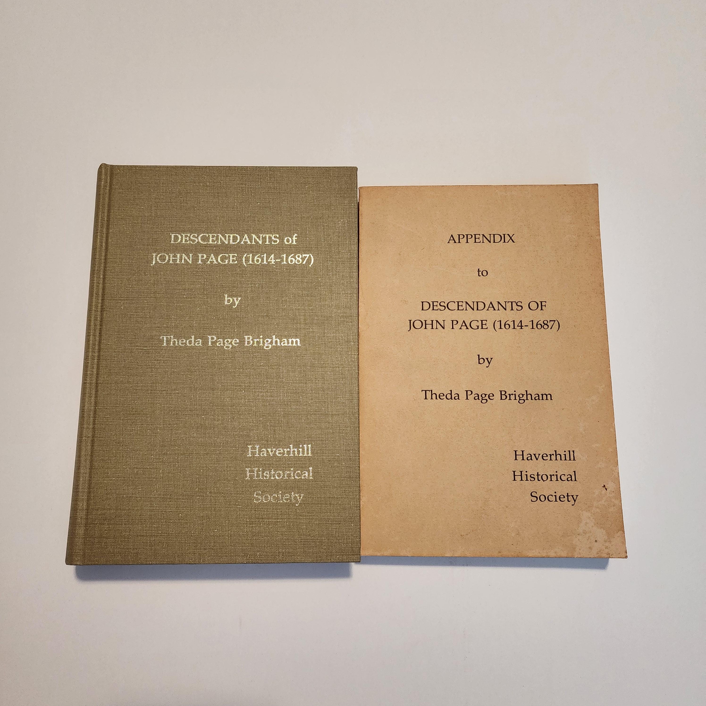 The hard cover book Descendants of John Page (1614 - 1687) by Theda Page Brigham and the paperback appendix of the same title. The hard cover was published in 1972 by Haverhill Historical Society and the paperback published in 1979.