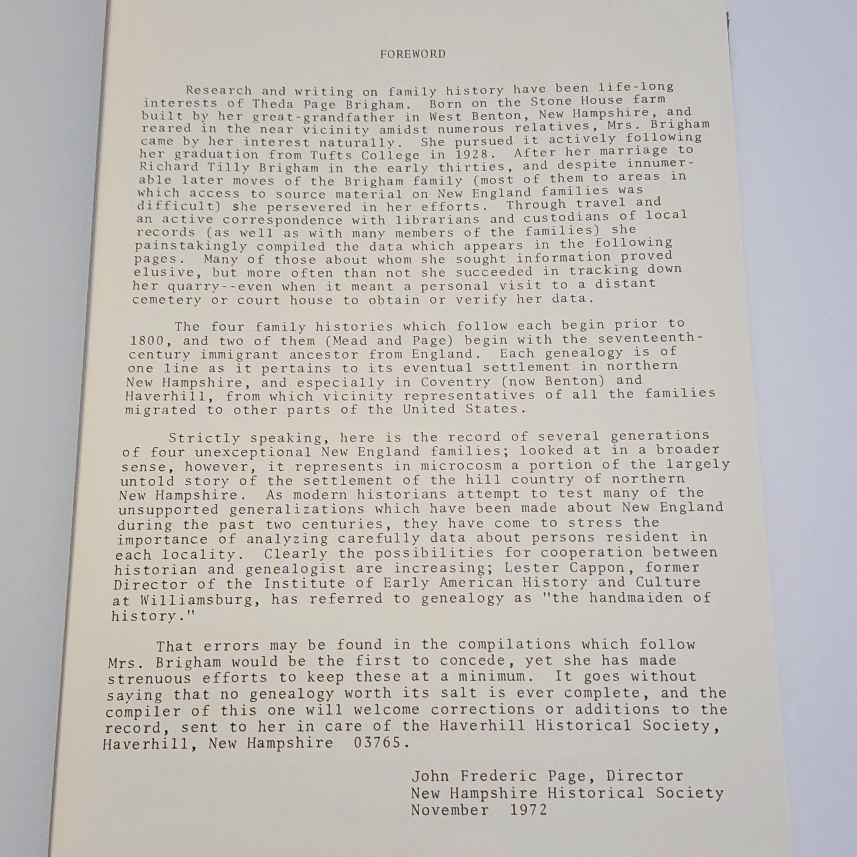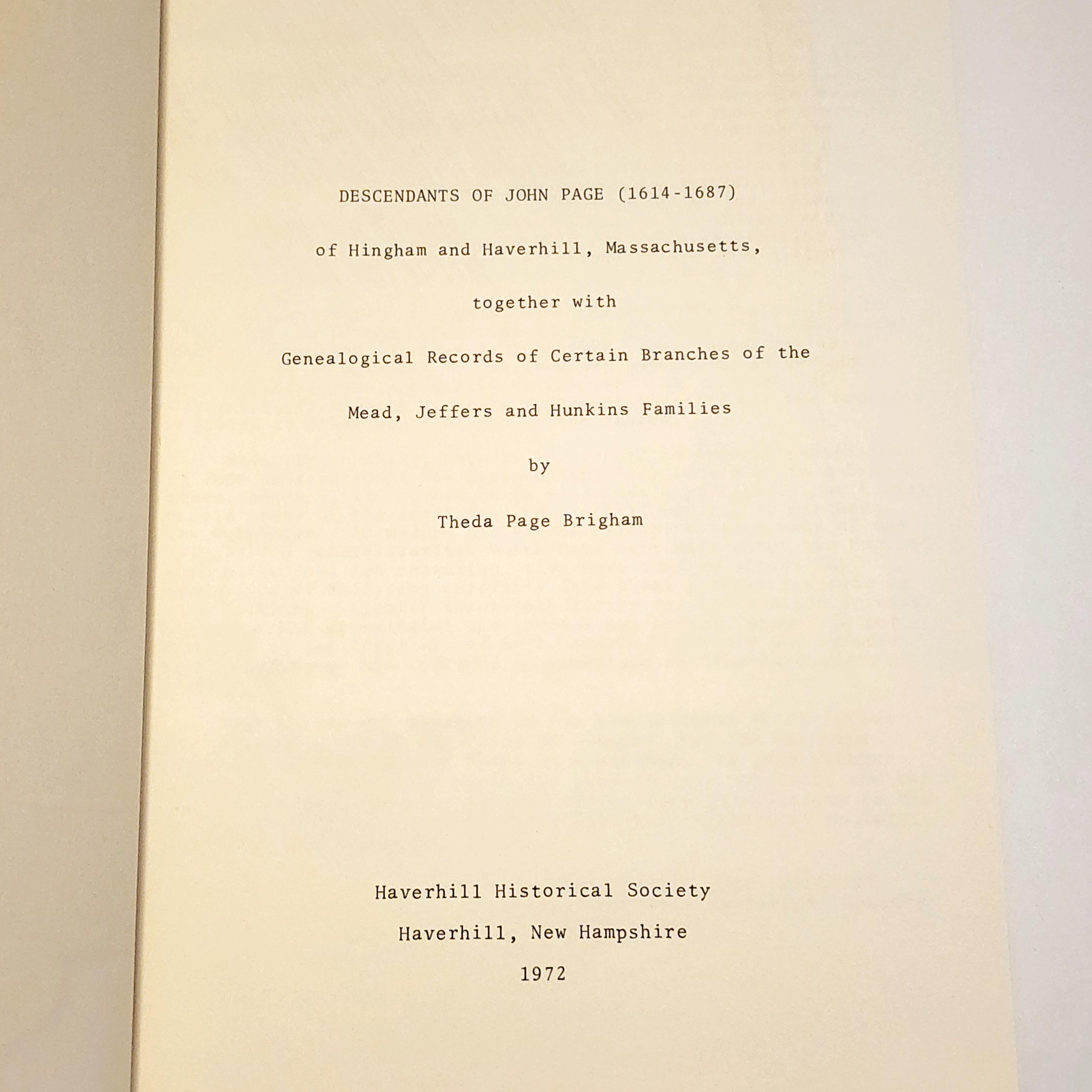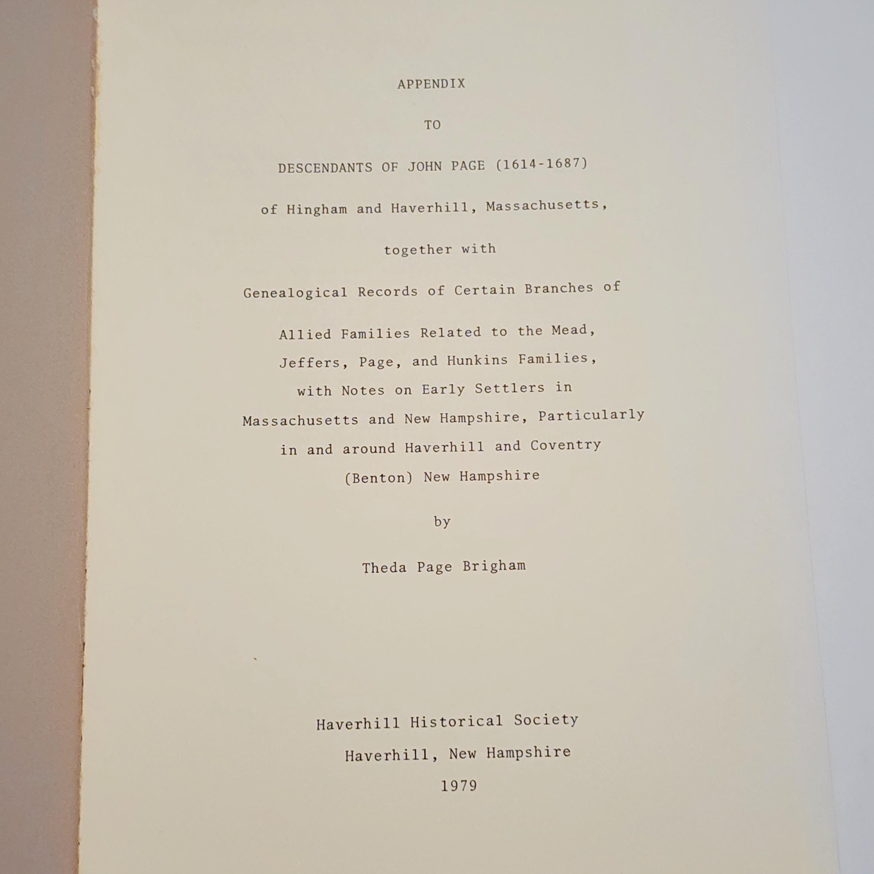 The hard cover book Descendants of John Page (1614 - 1687) by Theda Page Brigham and the paperback appendix of the same title. The hard cover was published in 1972 by Haverhill Historical Society and the paperback published in 1979.