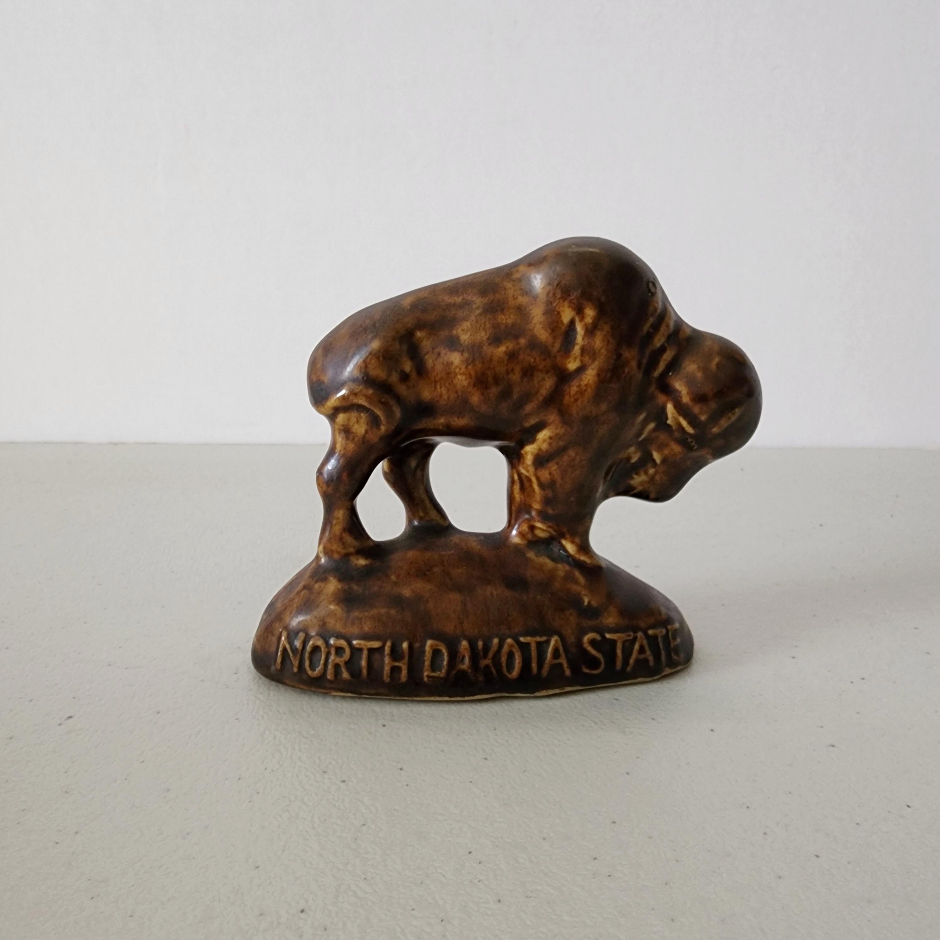 This is a vintage buffalo or bison sculpture with the words North Dakota State embossed on the base. The bottom is marked Dickota Dickinson N. Dak.