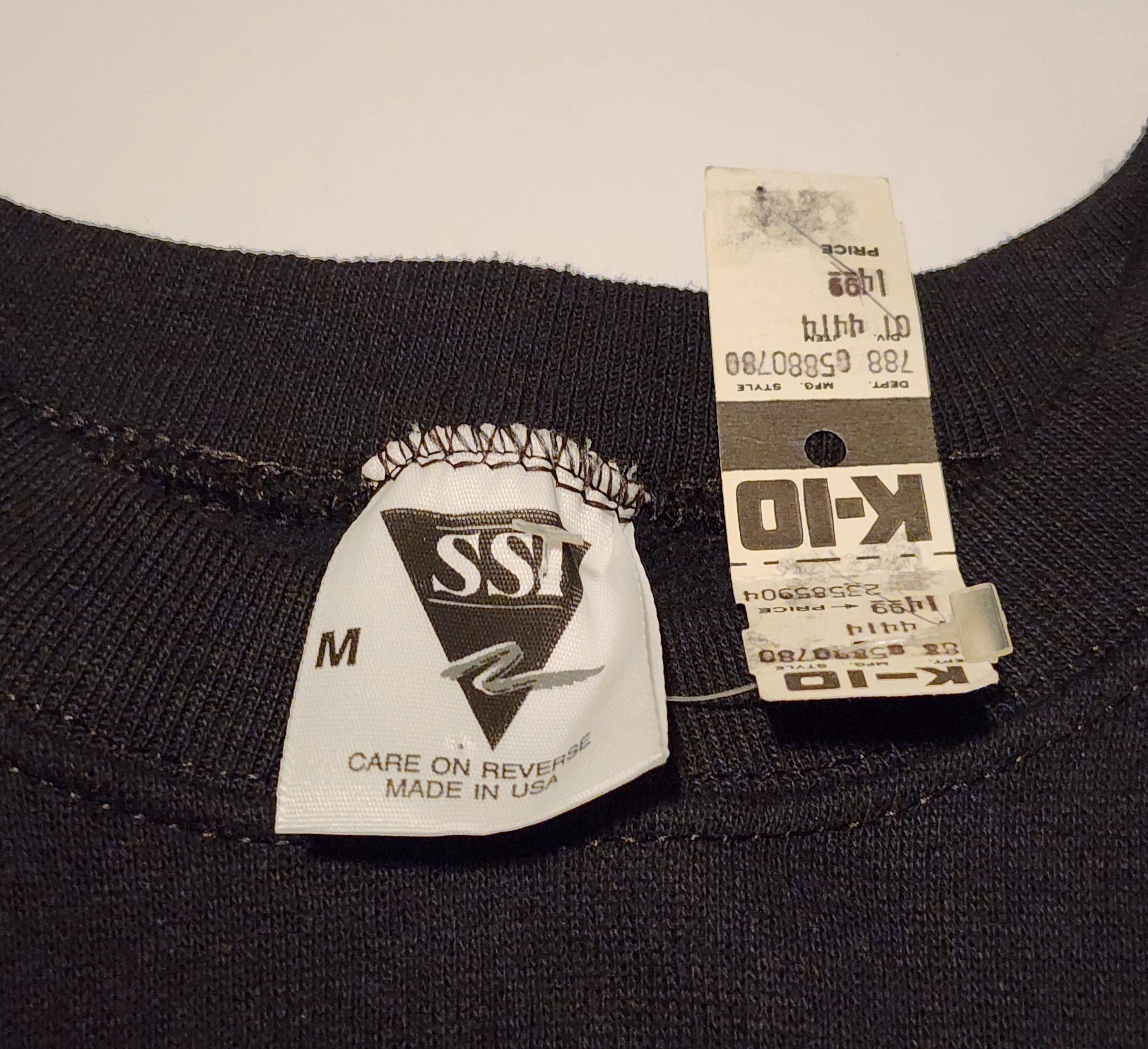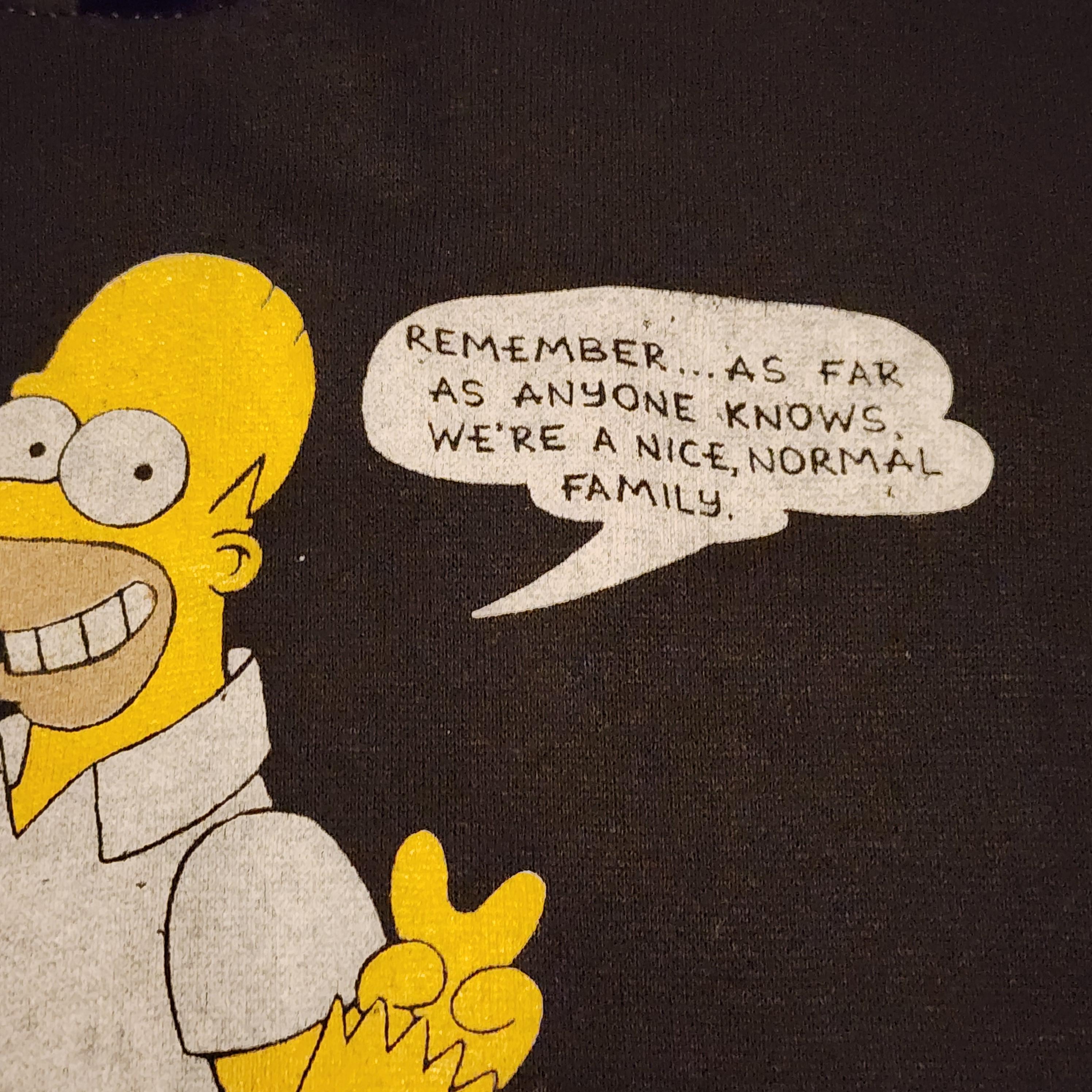 This is a brand new with tags 1990s The Simpsons black graphic crew neck sweatshirt. It says "Remember, as far as anyone knows, we're a nice normal family" along with a graphic of the Simpson family. It is a size Medium and 50% cotton, 50% polyester.