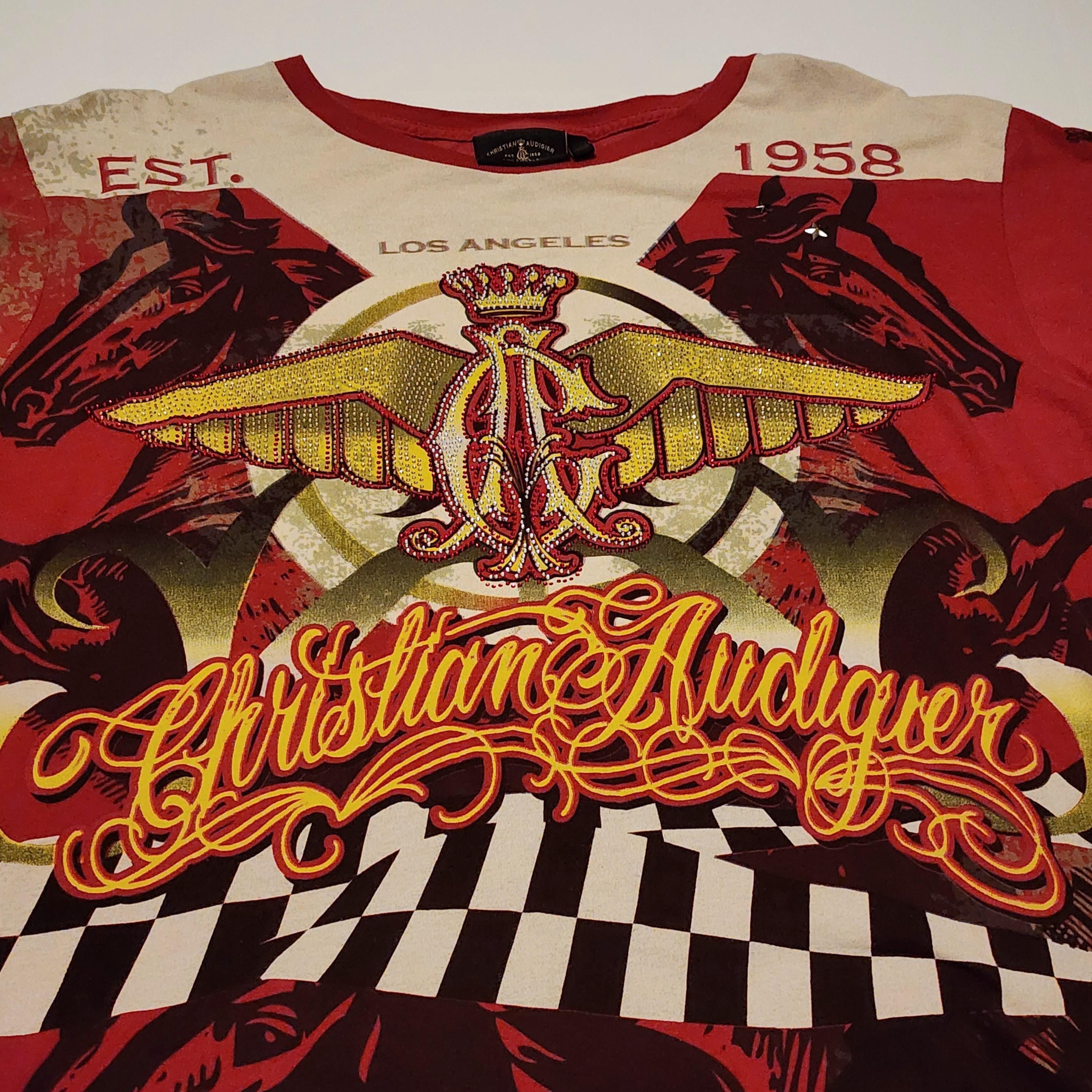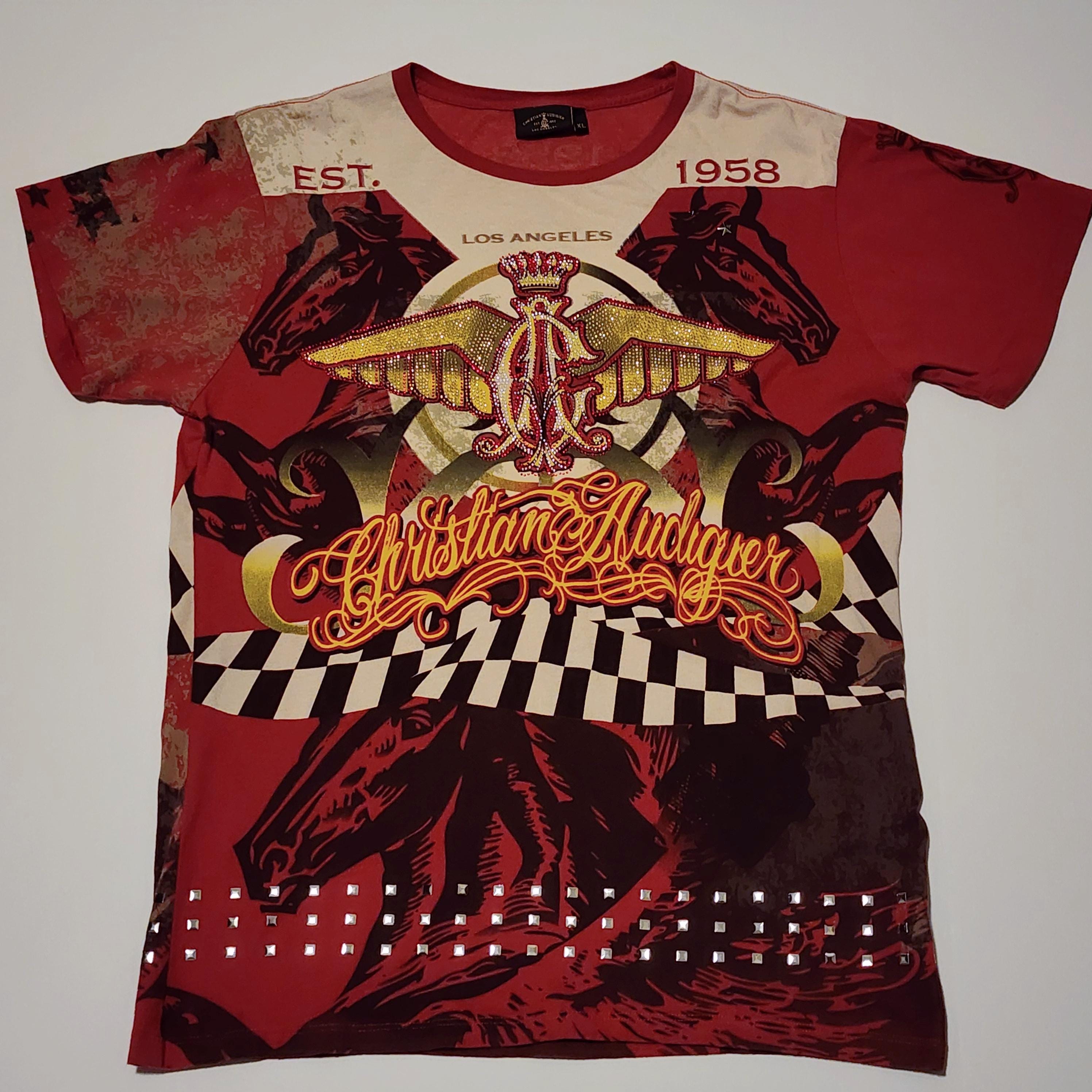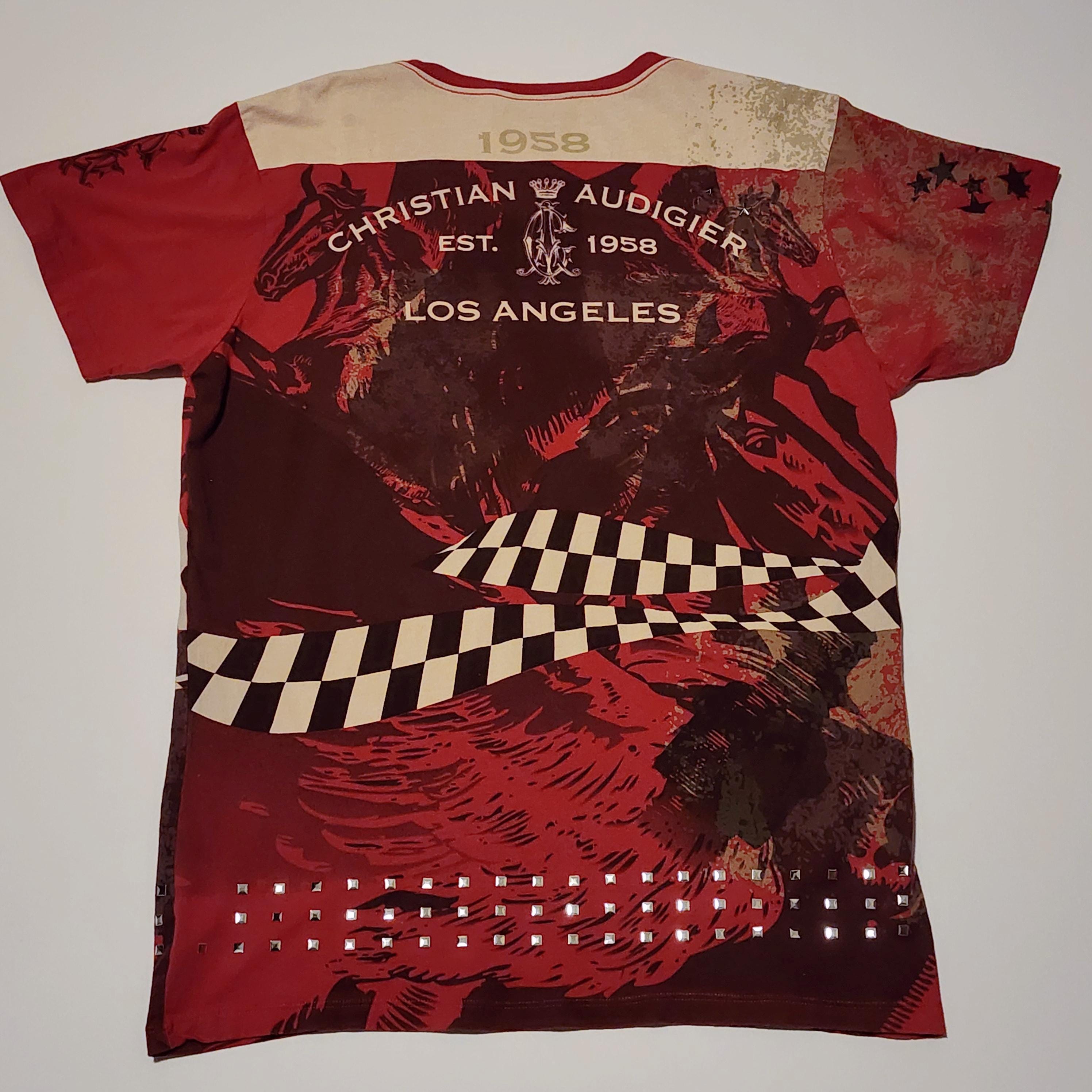 A vintage Christian Audigier Los Angeles T shirt with rhinestones and silver accents, along with horse outlines in black. It is a size XL and is 100% cotton. The wing logo in the center has tiny rhinestones, and along the bottom front and back are square silver metal look accents, and two stars on the upper left chest area.
