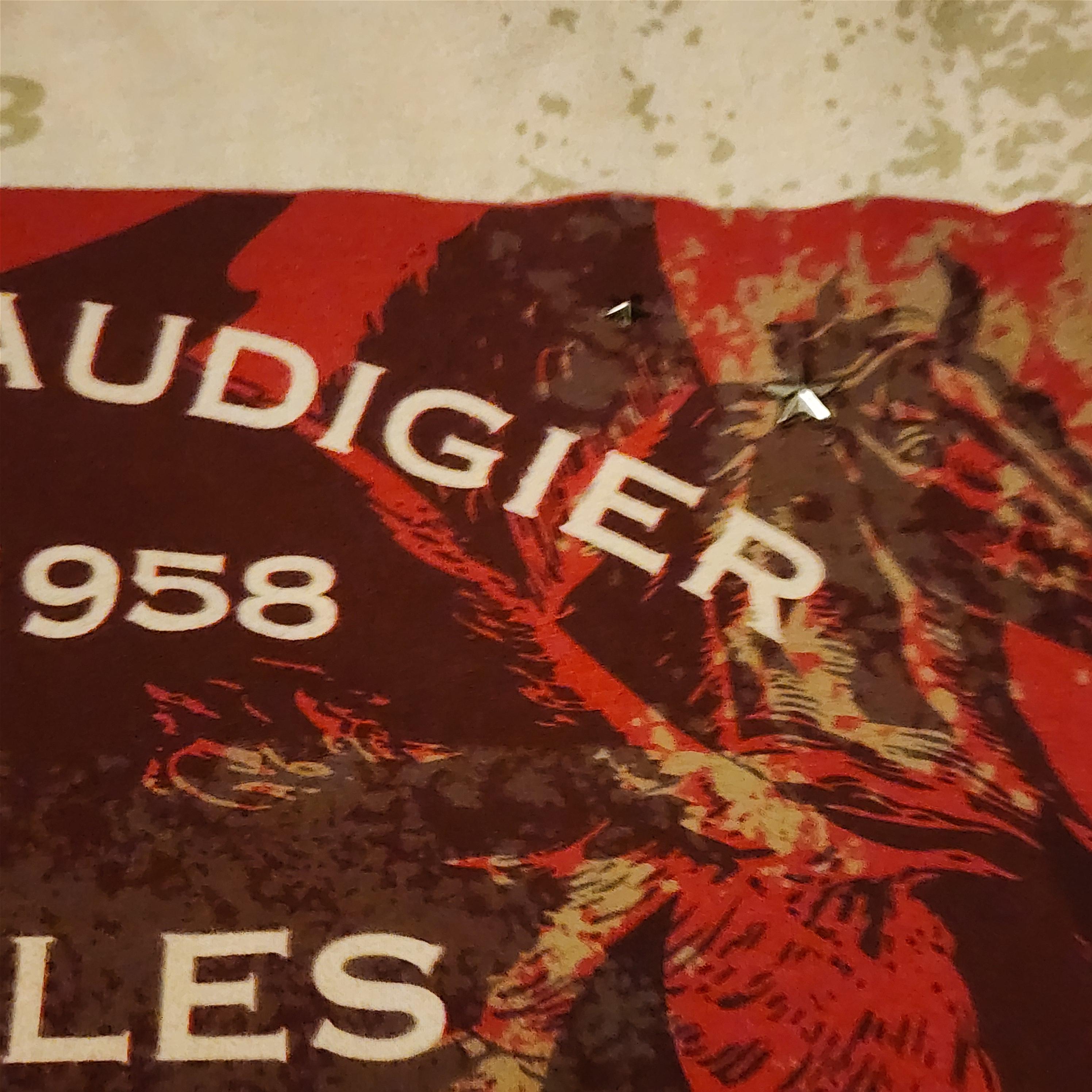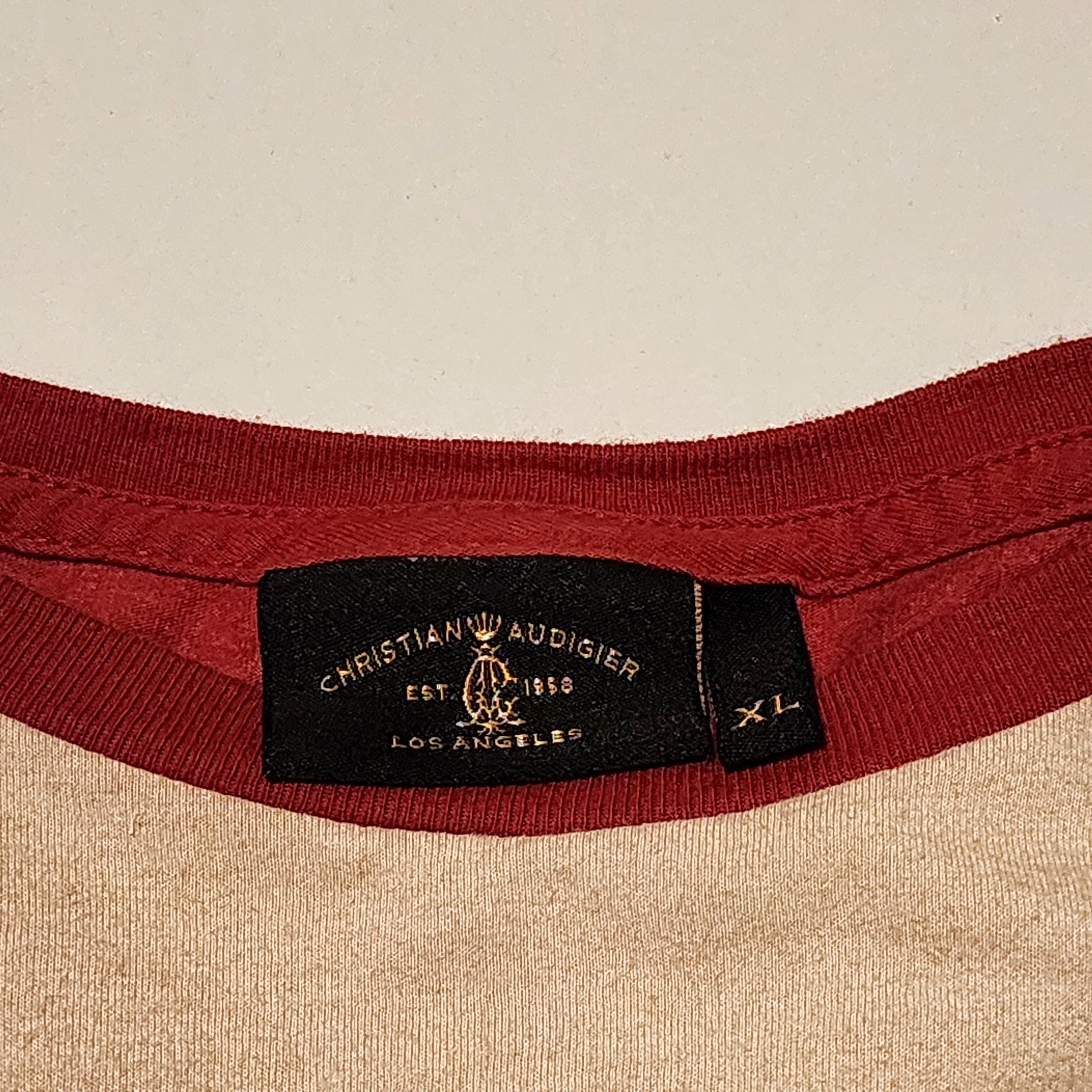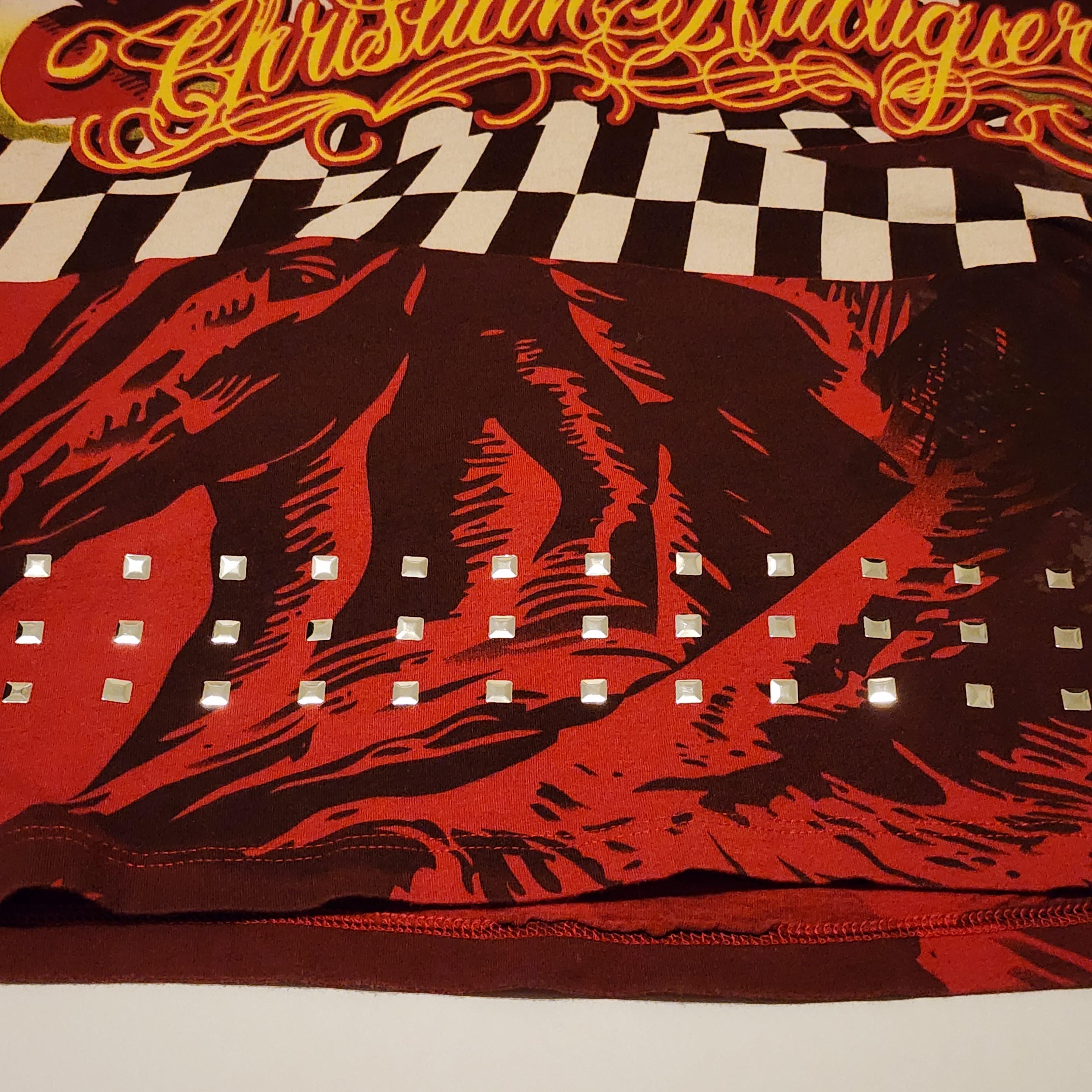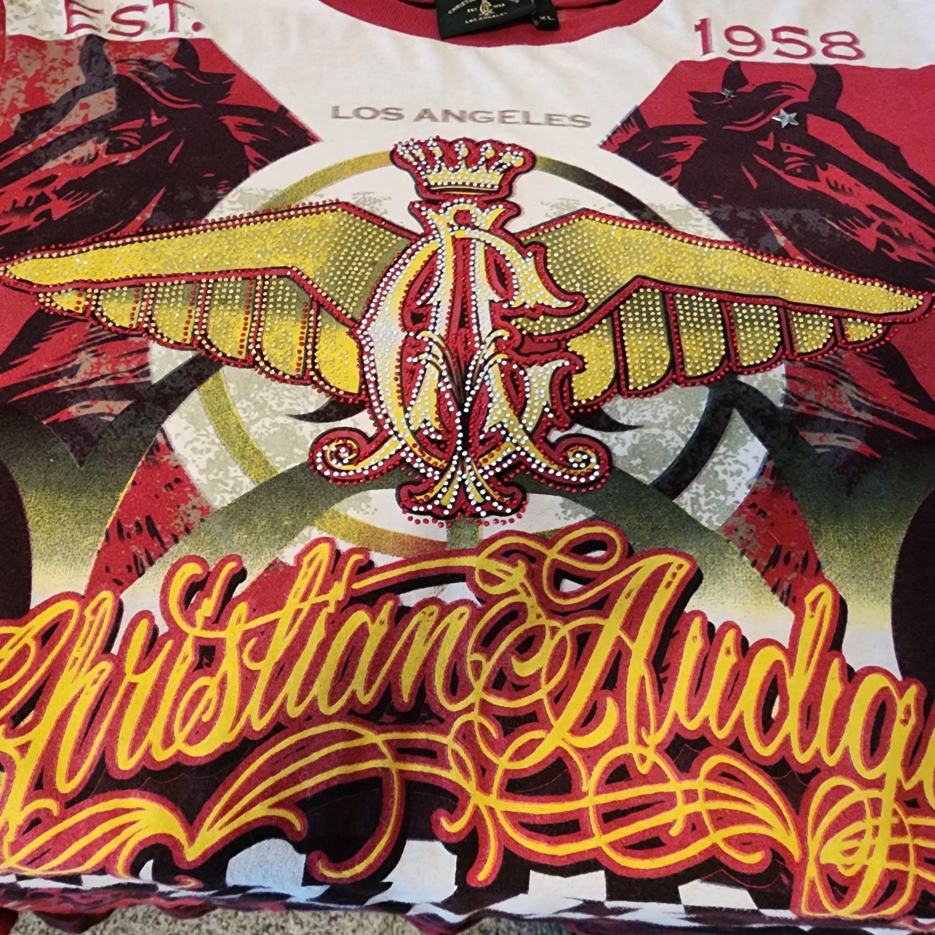 A vintage Christian Audigier Los Angeles T shirt with rhinestones and silver accents, along with horse outlines in black. It is a size XL and is 100% cotton. The wing logo in the center has tiny rhinestones, and along the bottom front and back are square silver metal look accents, and two stars on the upper left chest area.