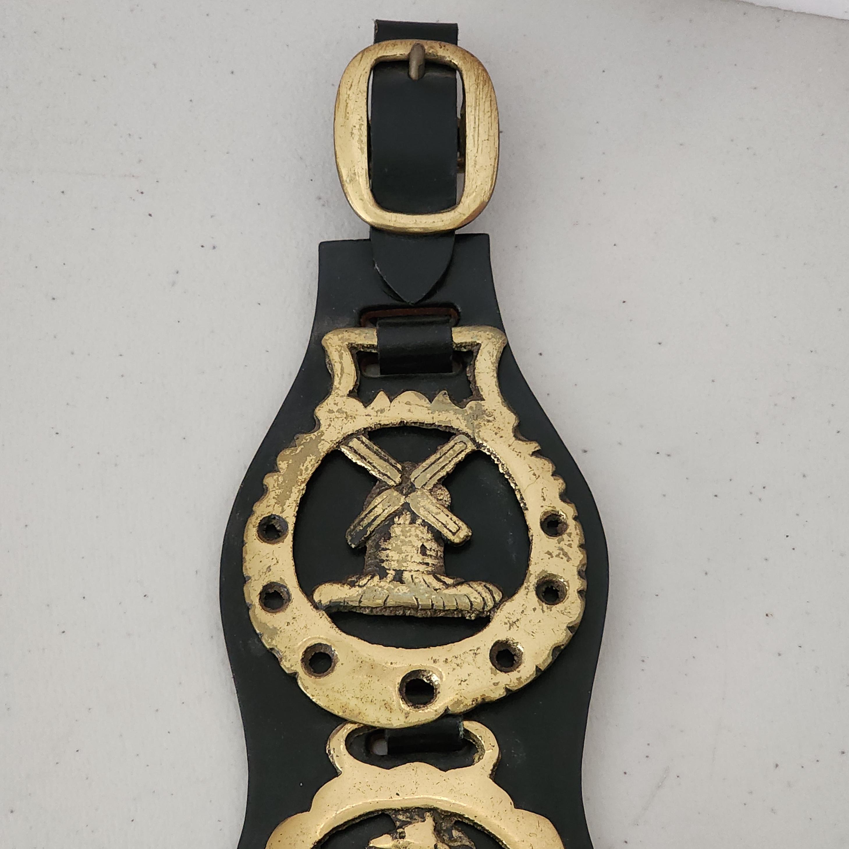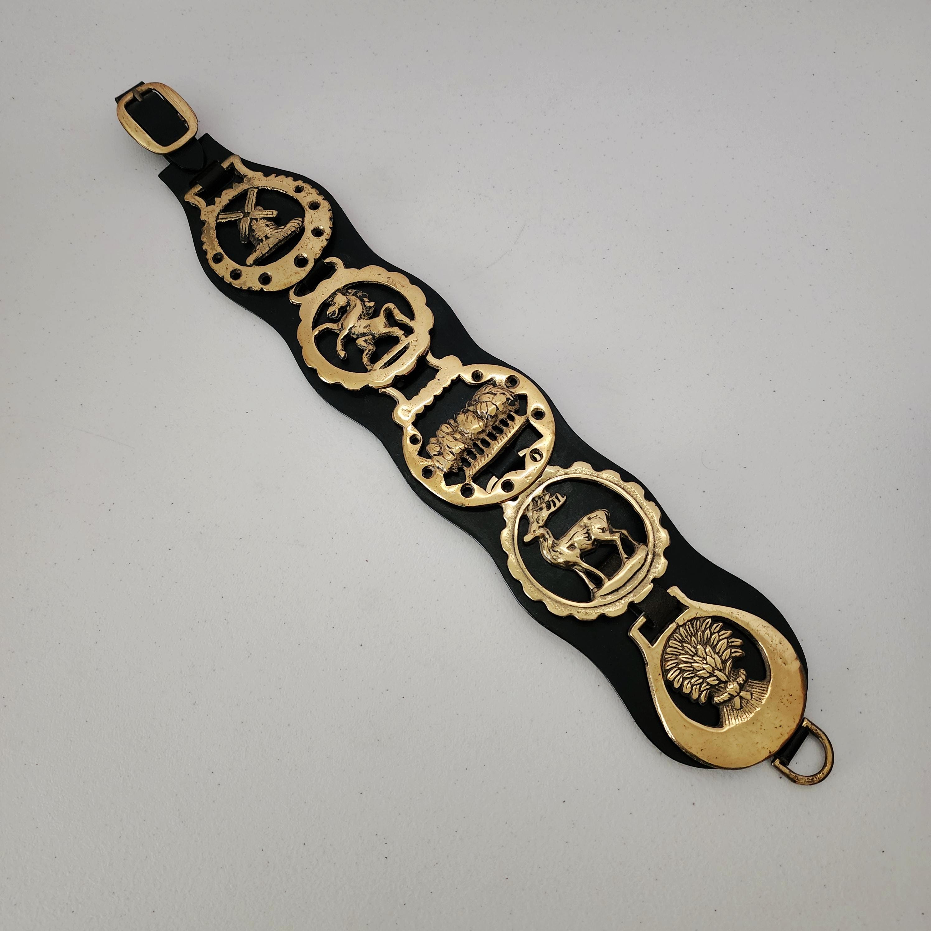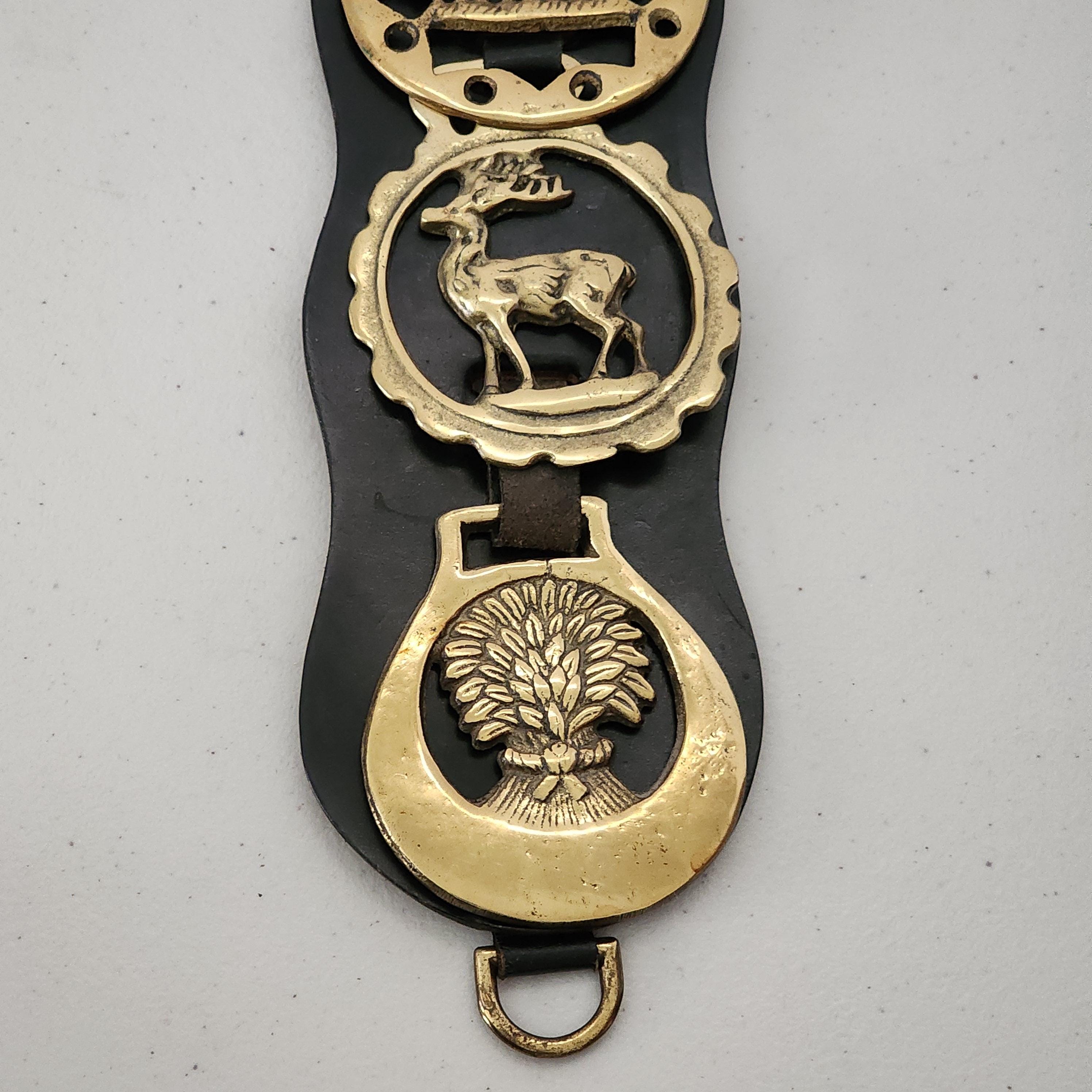 This is a set of 5 different gold toned horse brasses that are attached to a metal strap.