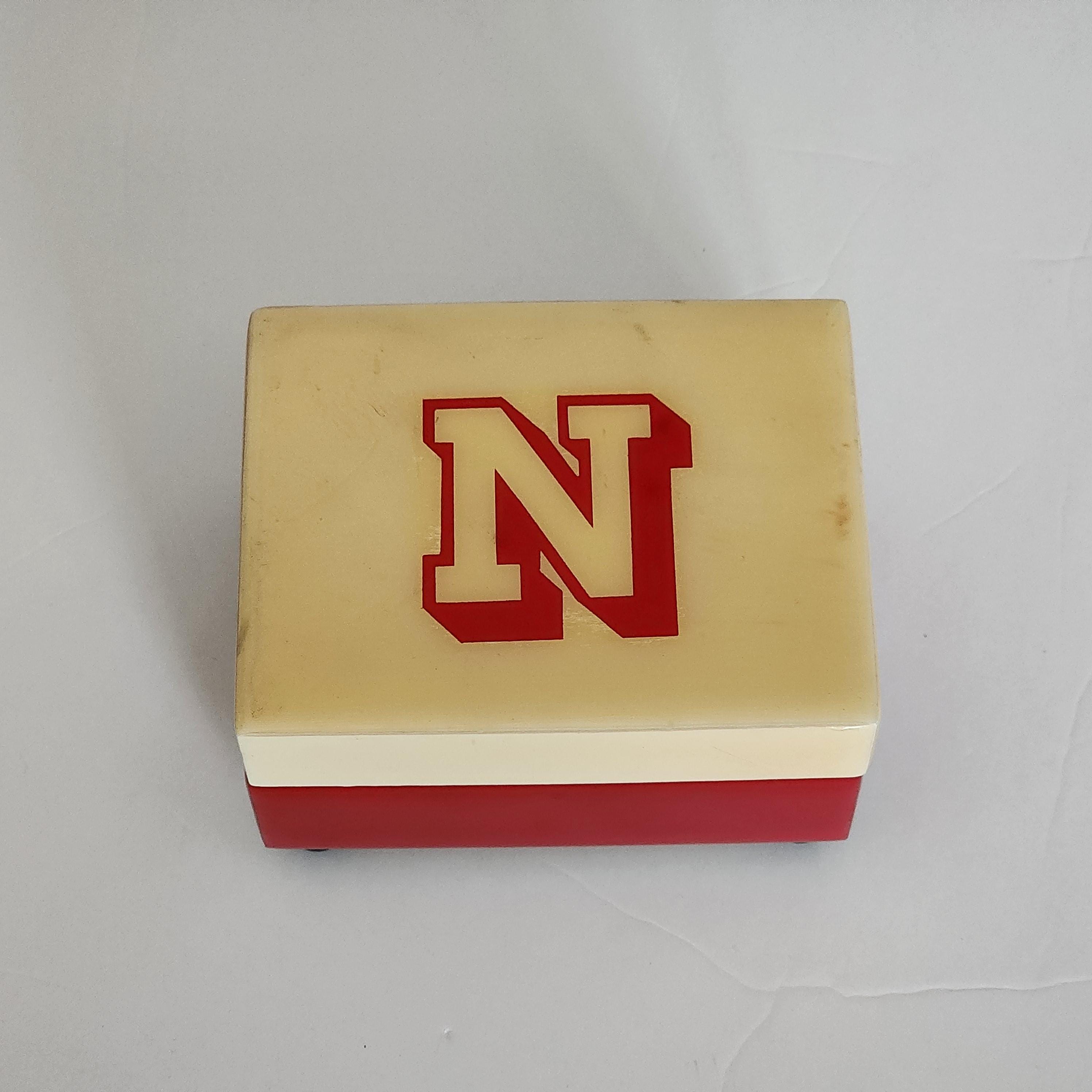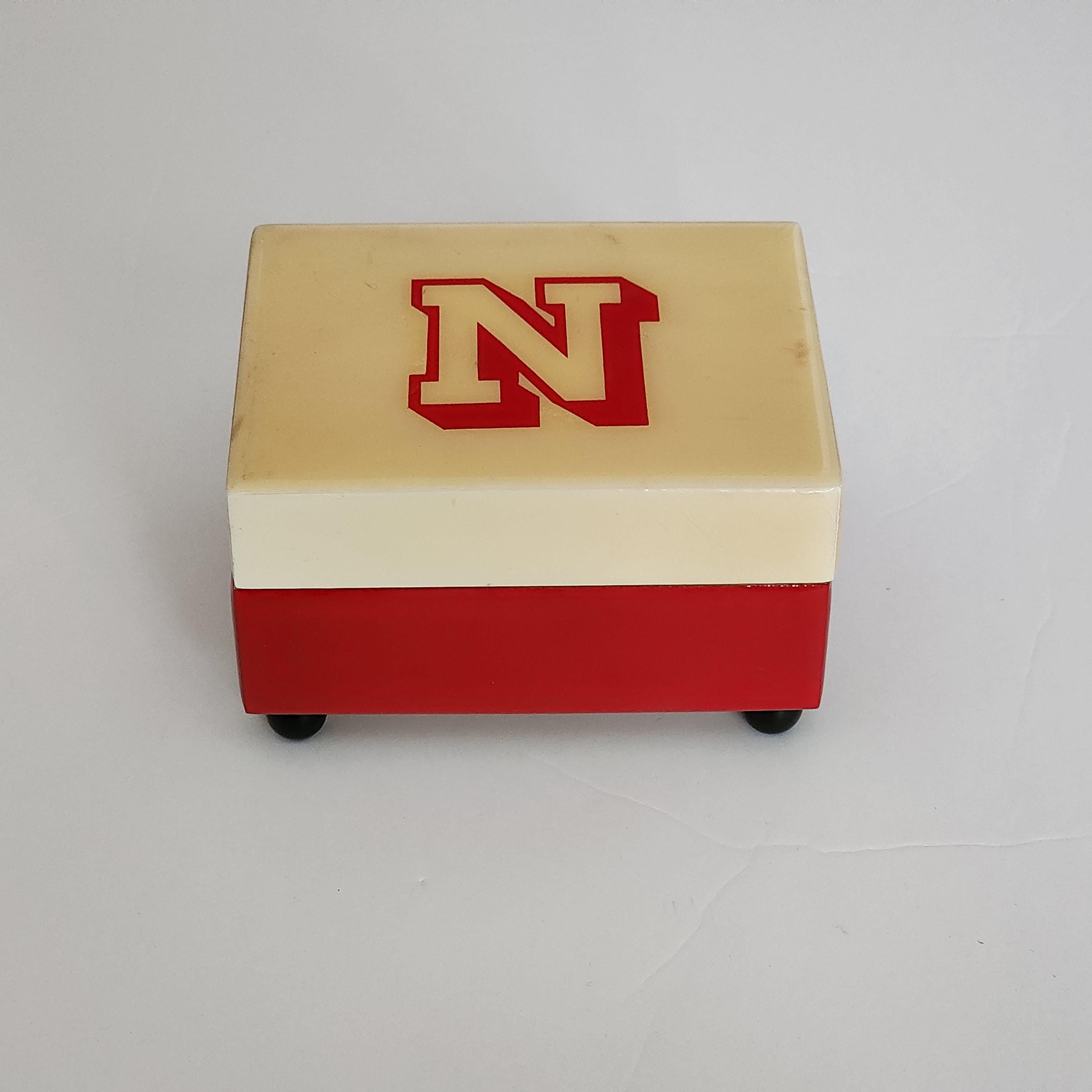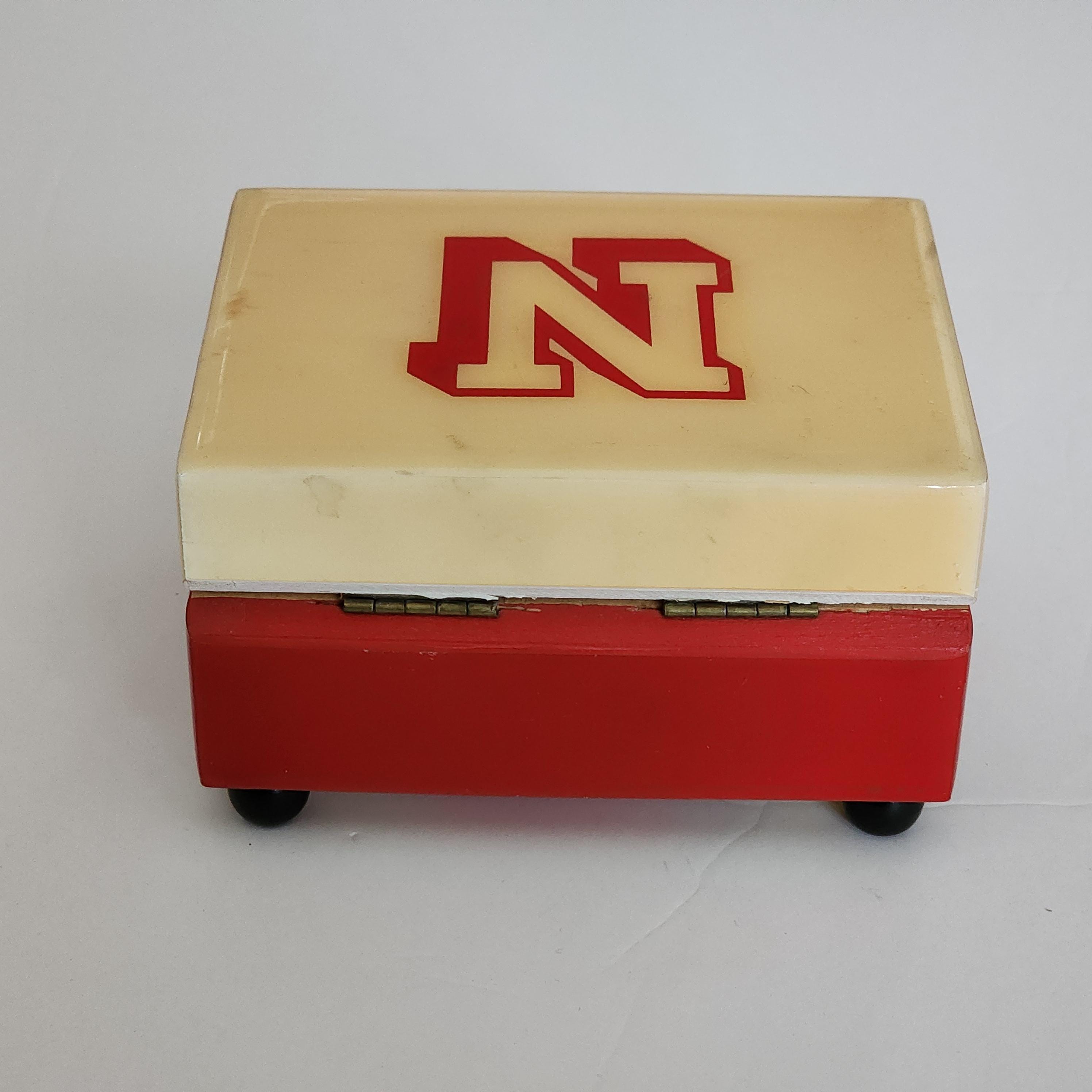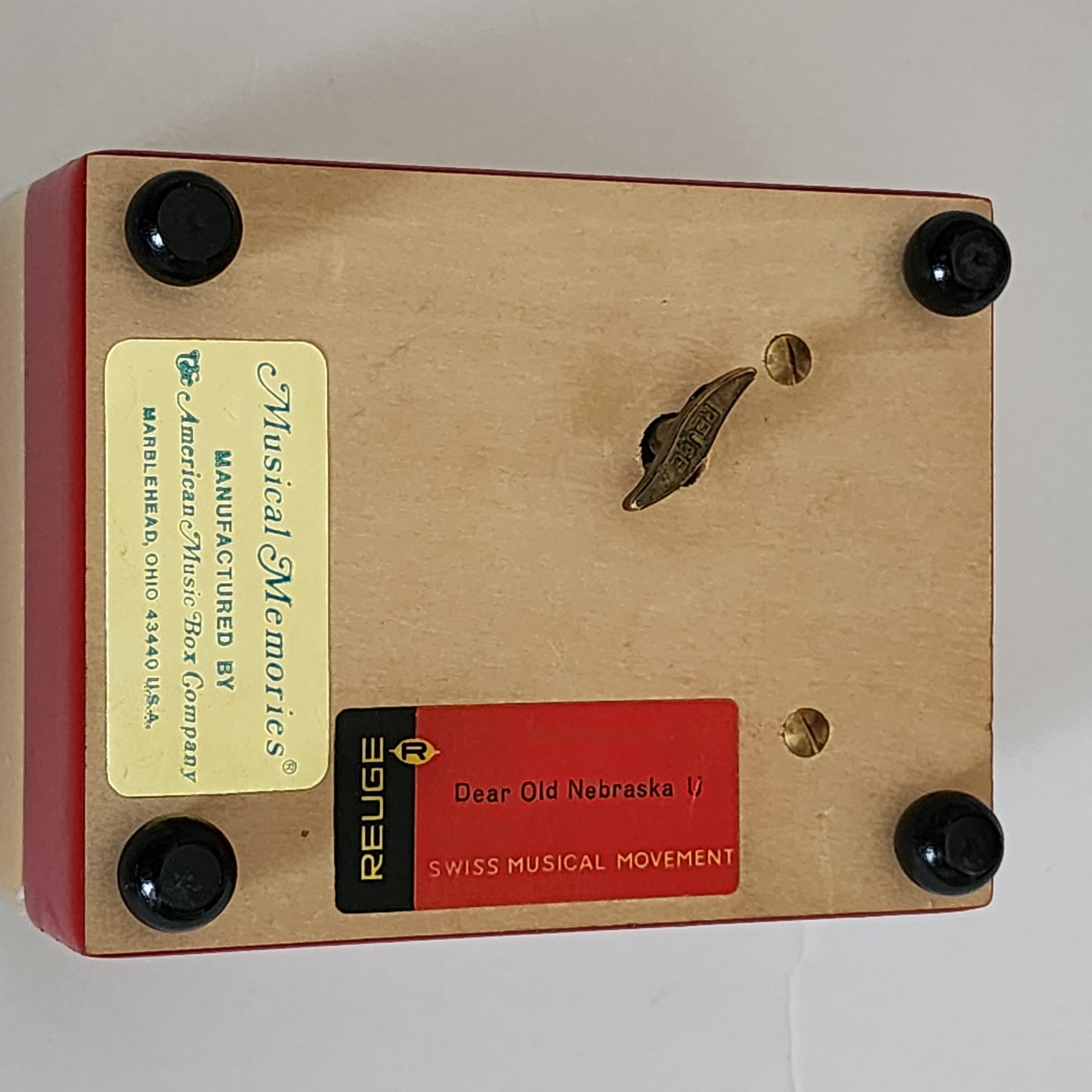 A vintage Nebraska University music box in the school colors of scarlet red and cream. The labels on the bottom are Reuge Swiss Musical Movement and it plays Dear Old Nebraska U. The other sticker says Musical Memories Manufactured by The American Music Box Company Marblehead, Ohio 43440 U.S.A.