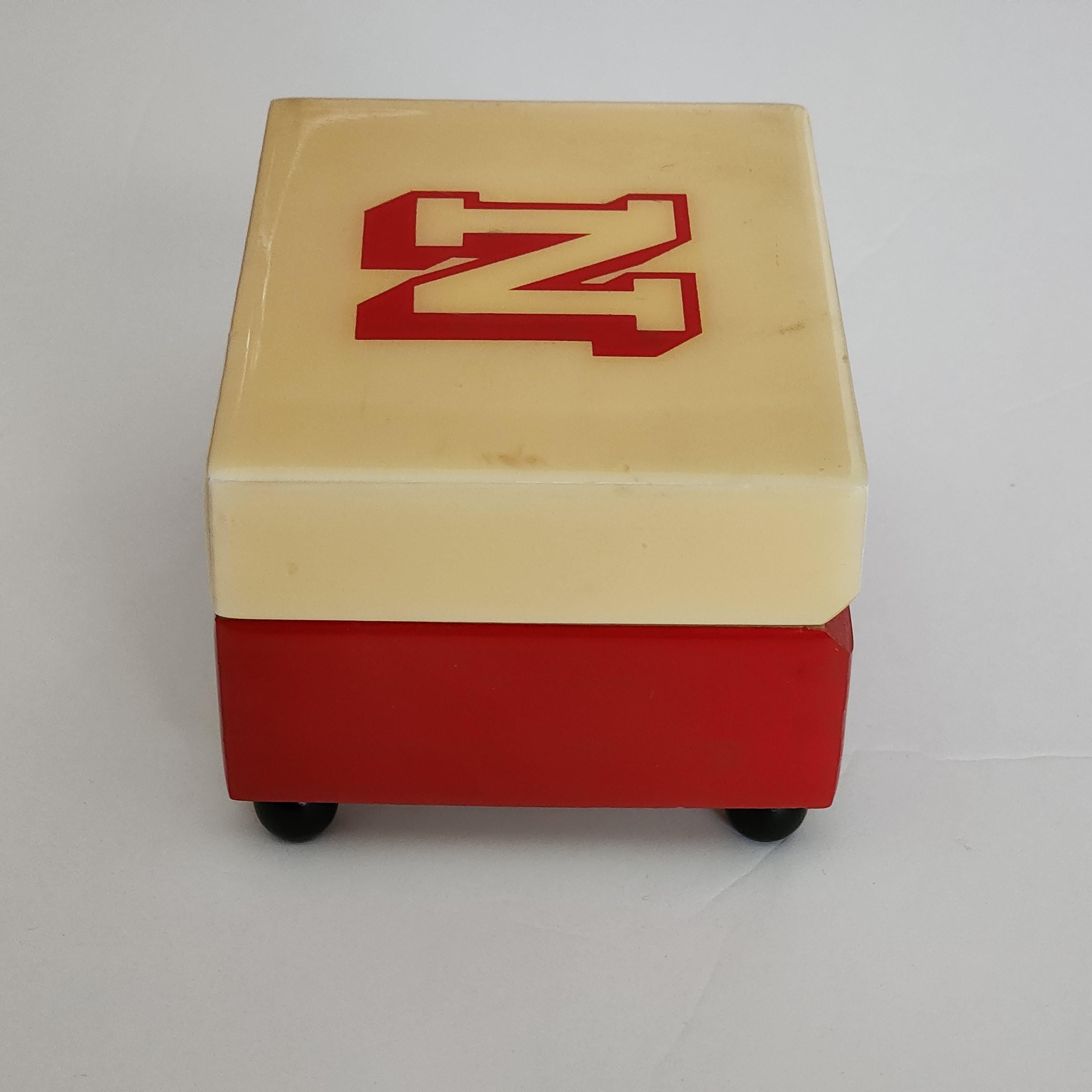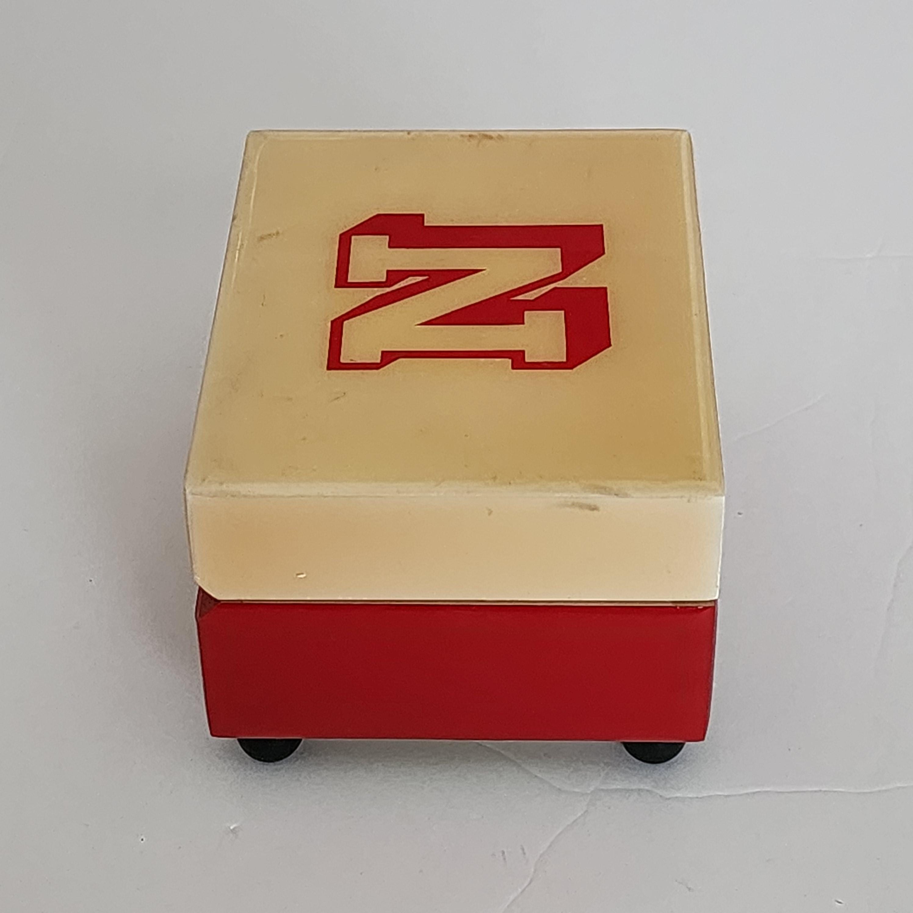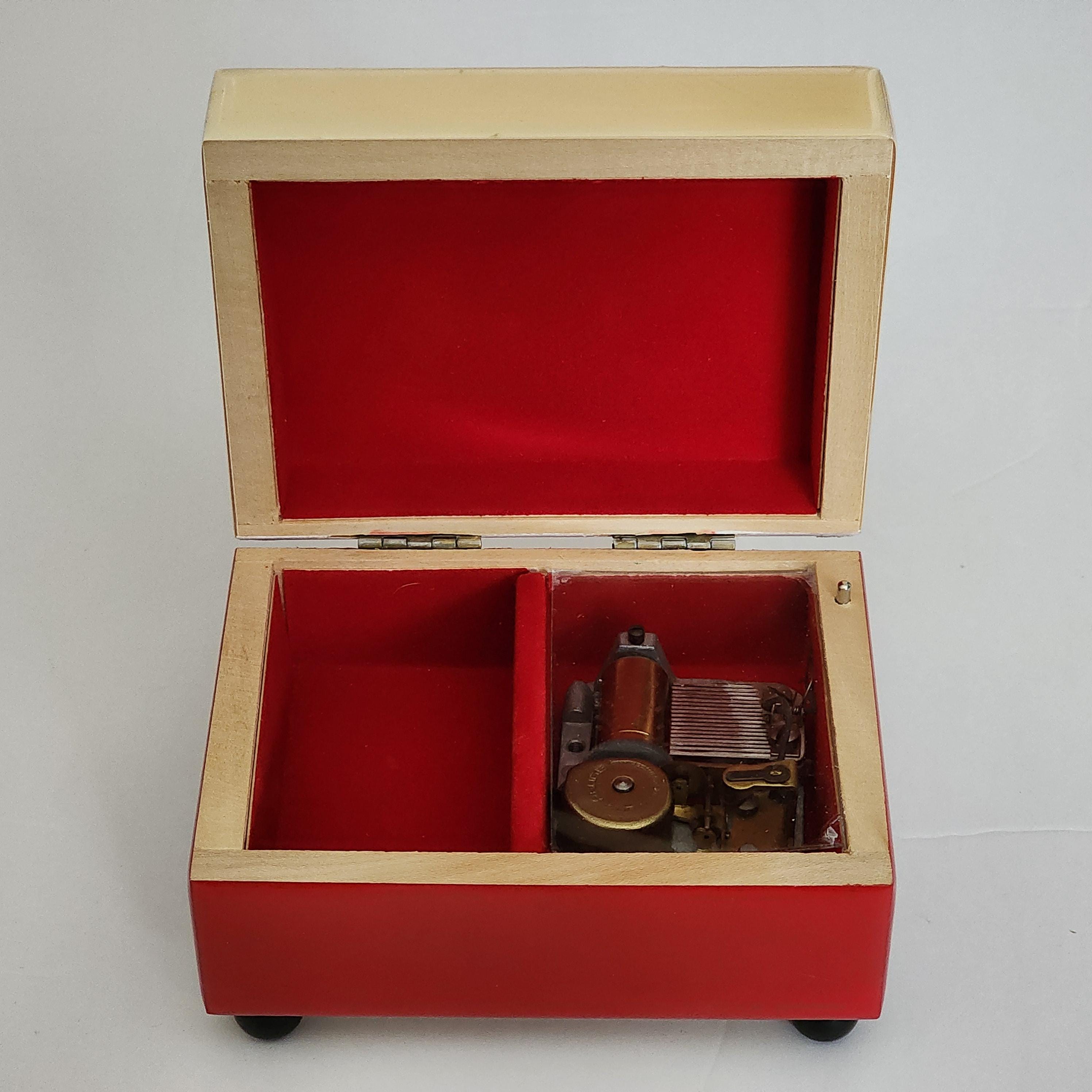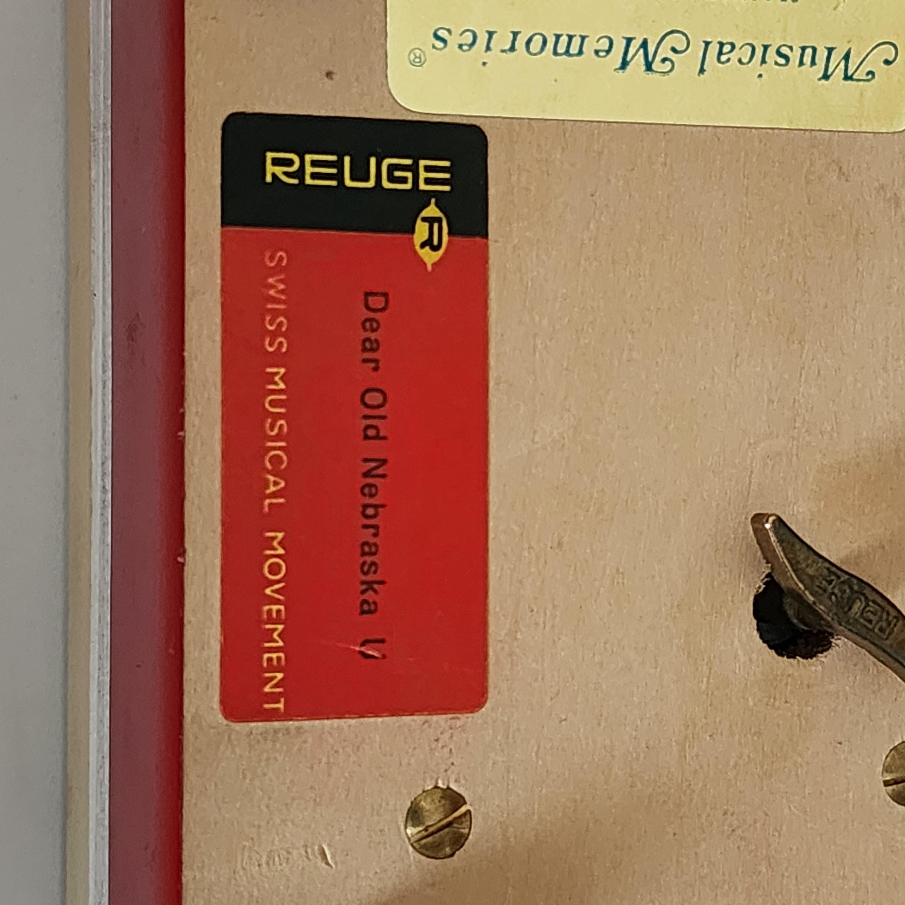 A vintage Nebraska University music box in the school colors of scarlet red and cream. The labels on the bottom are Reuge Swiss Musical Movement and it plays Dear Old Nebraska U. The other sticker says Musical Memories Manufactured by The American Music Box Company Marblehead, Ohio 43440 U.S.A.