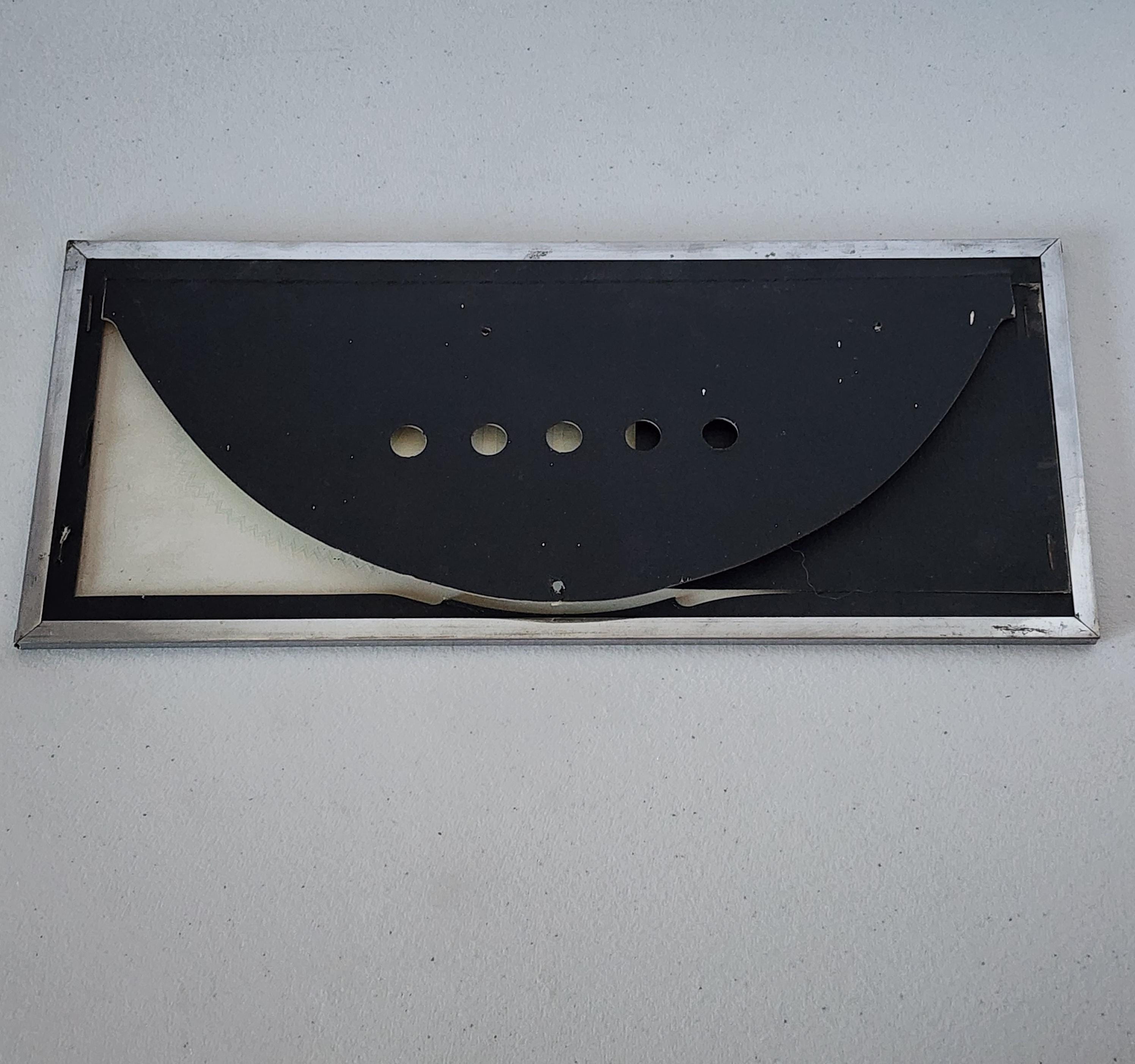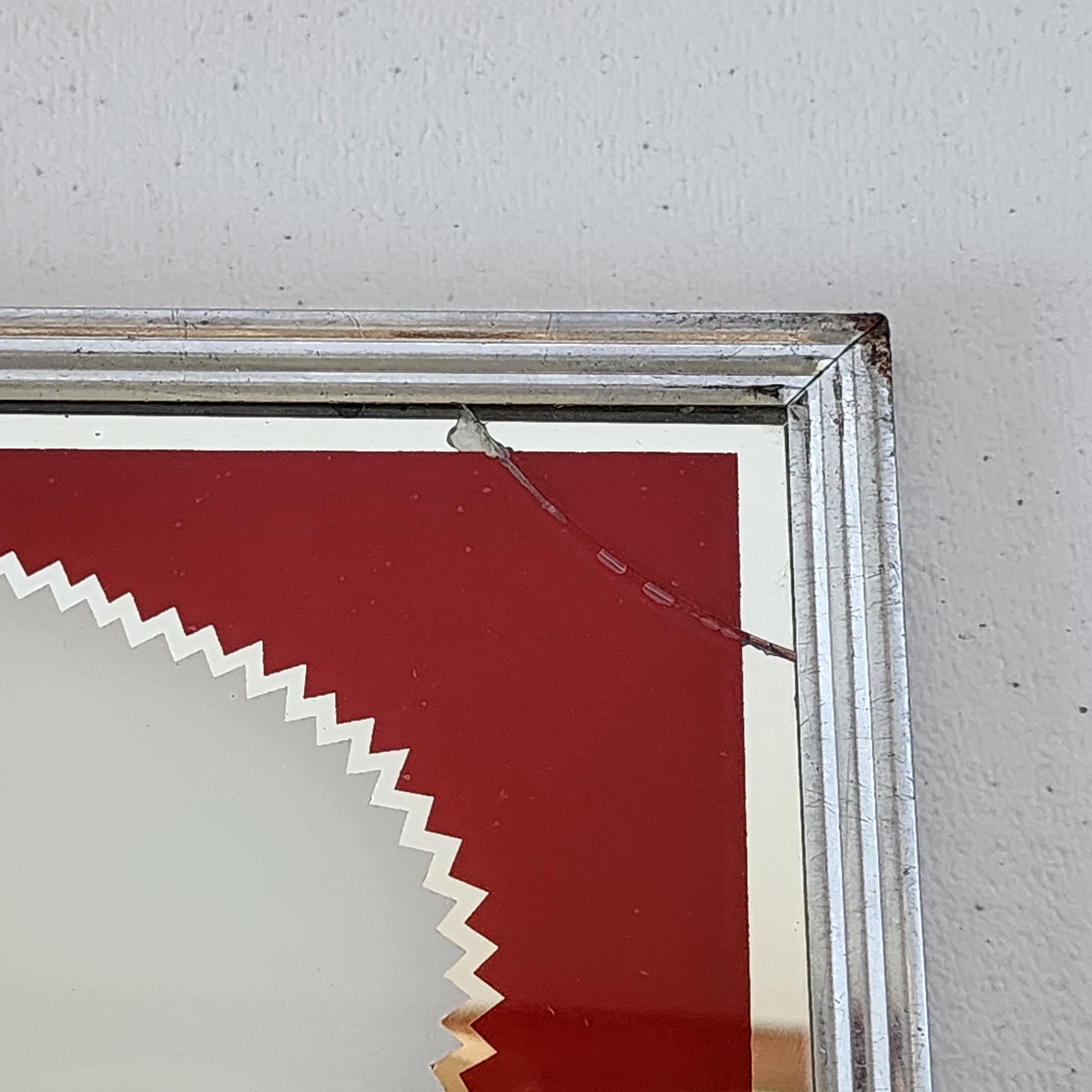 Condition: An obvious crack in the upper right corner, a few other small marks to the edge of the mirror. The frame also shows some wear. Please see all photos.