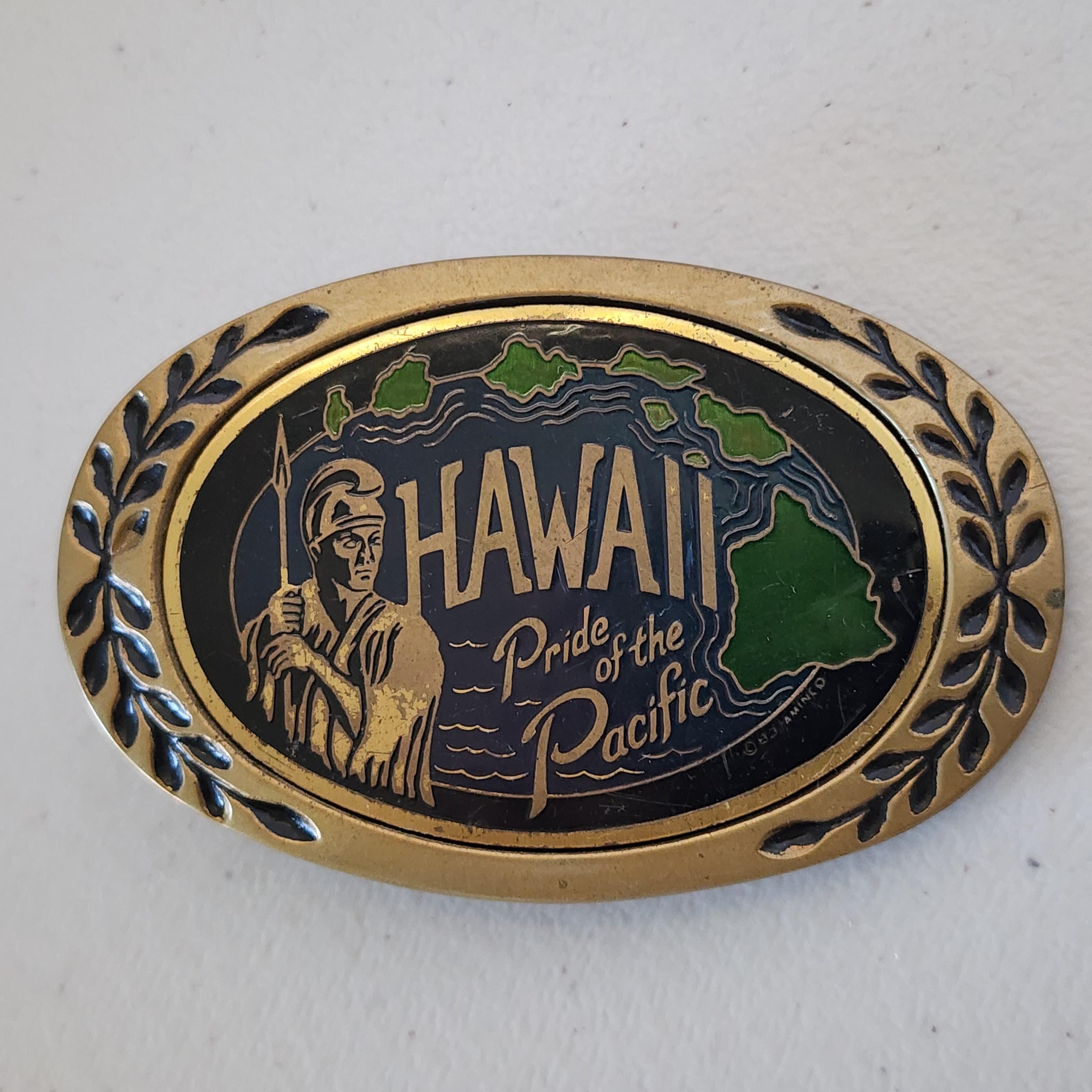 This is a nice vintage Hawaii Pride of the Pacific belt buckle. It is solid brass and enamel made by Heritage Buckles.