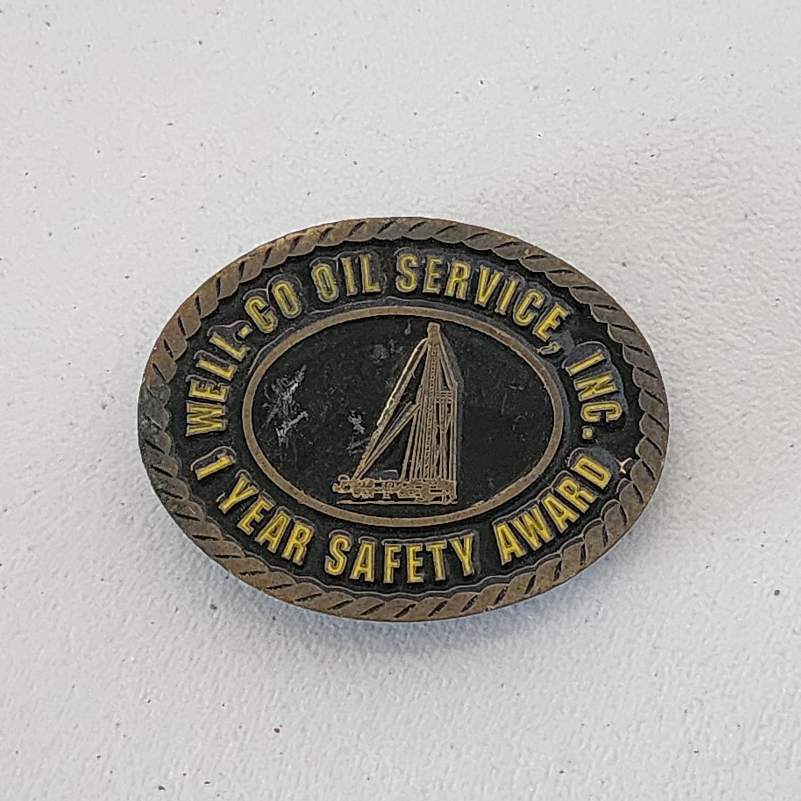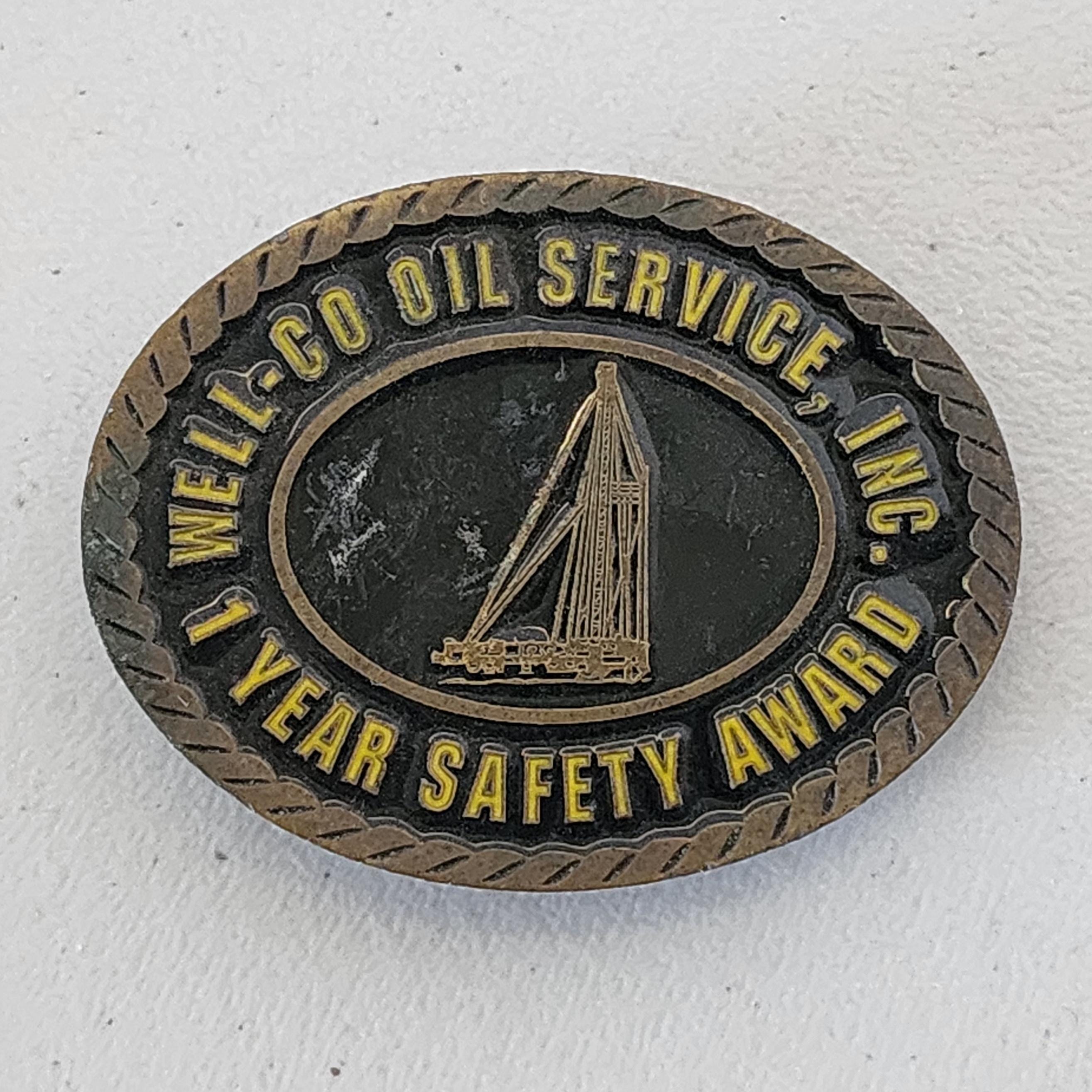 A vintage Well-Co Oil Service Inc. belt buckle. This was presented as a 1 year safety award. It appears to be brass with enamel and made in the USA by C D Hit.