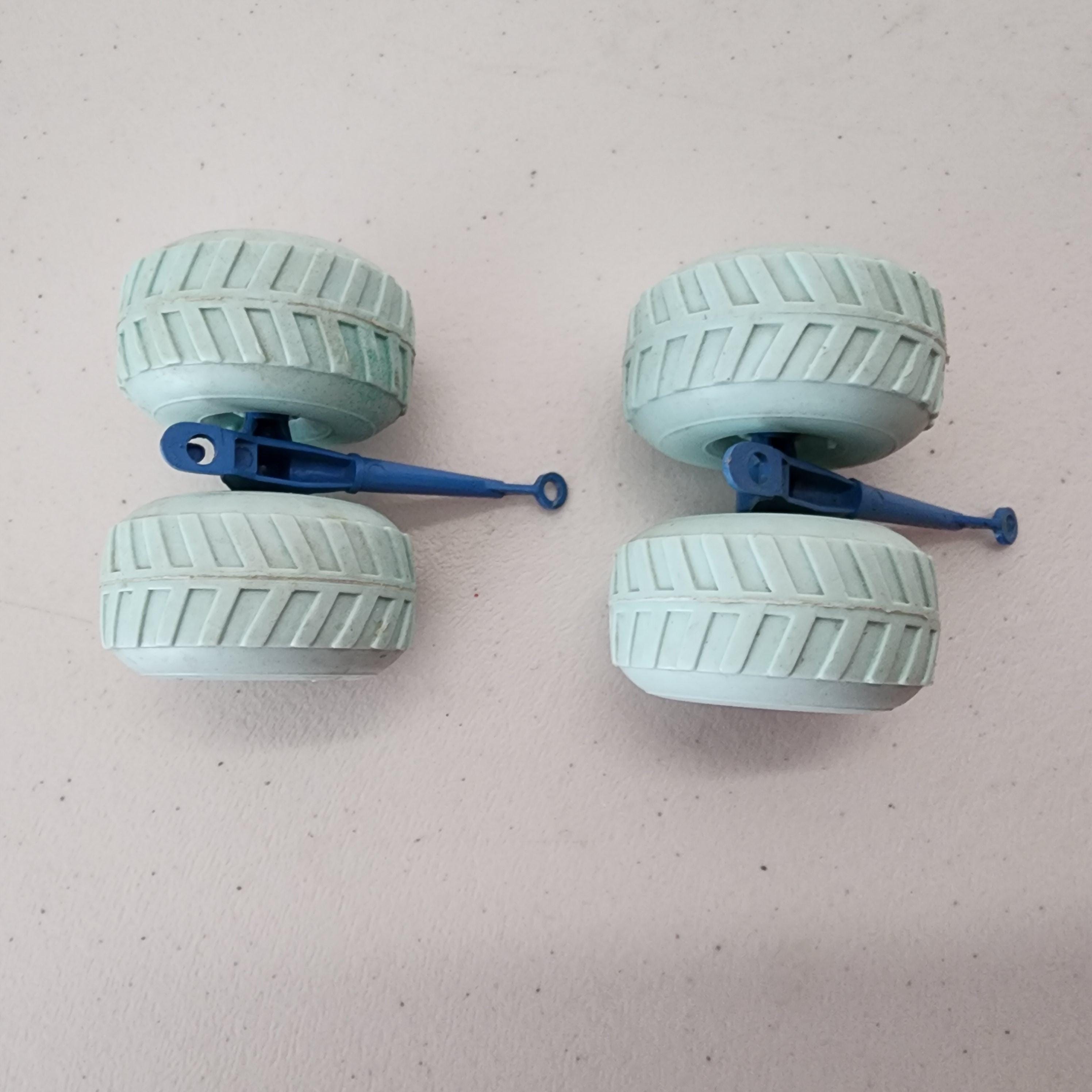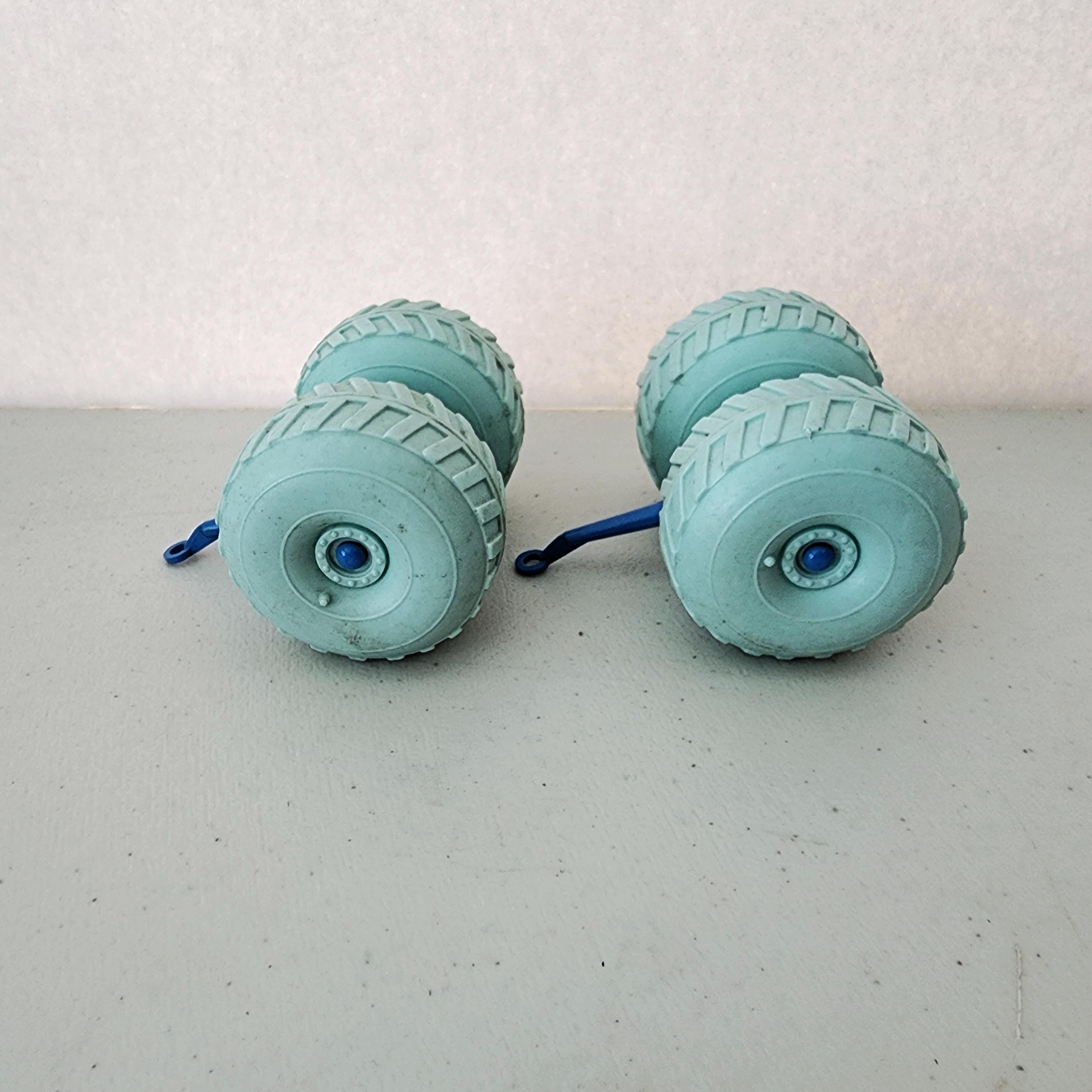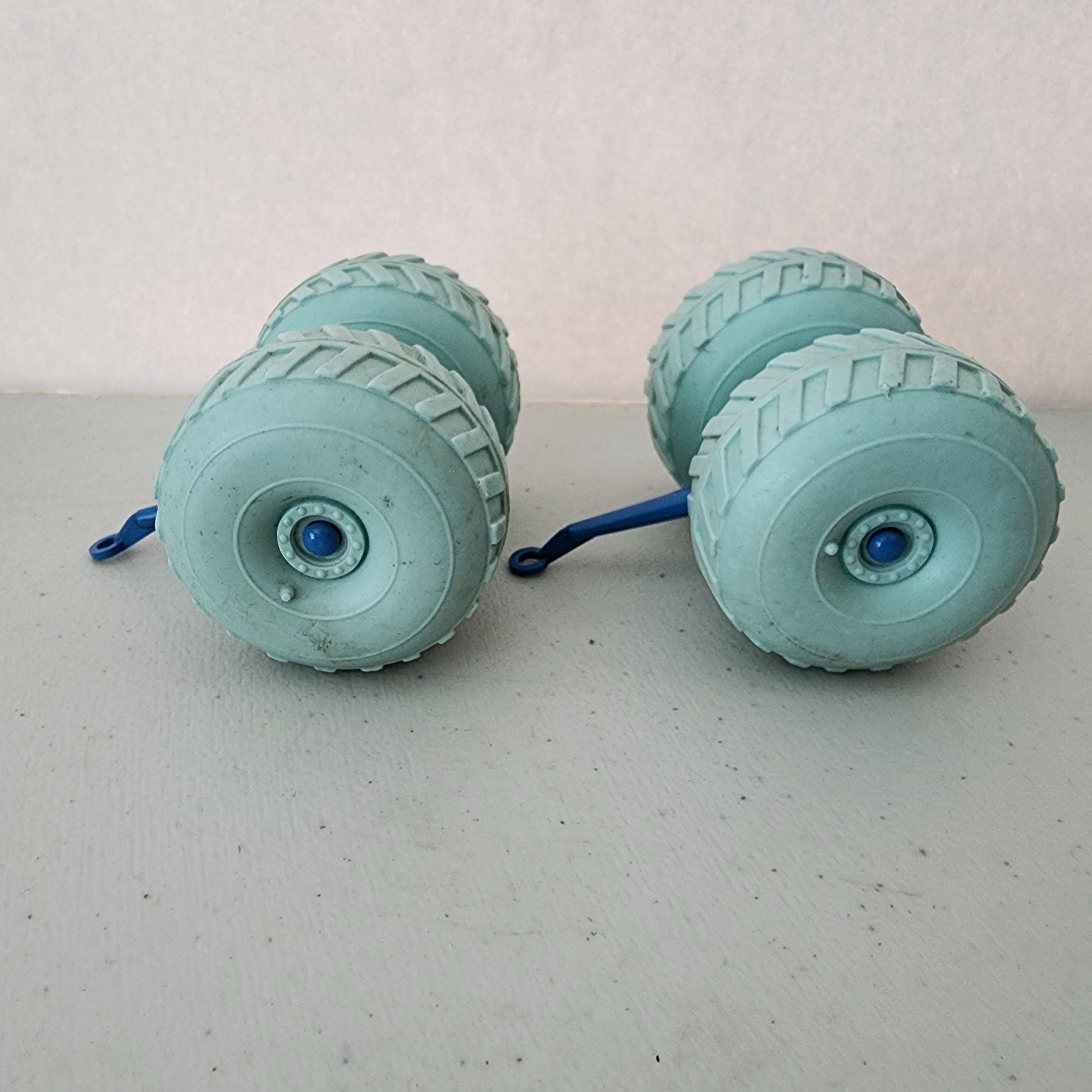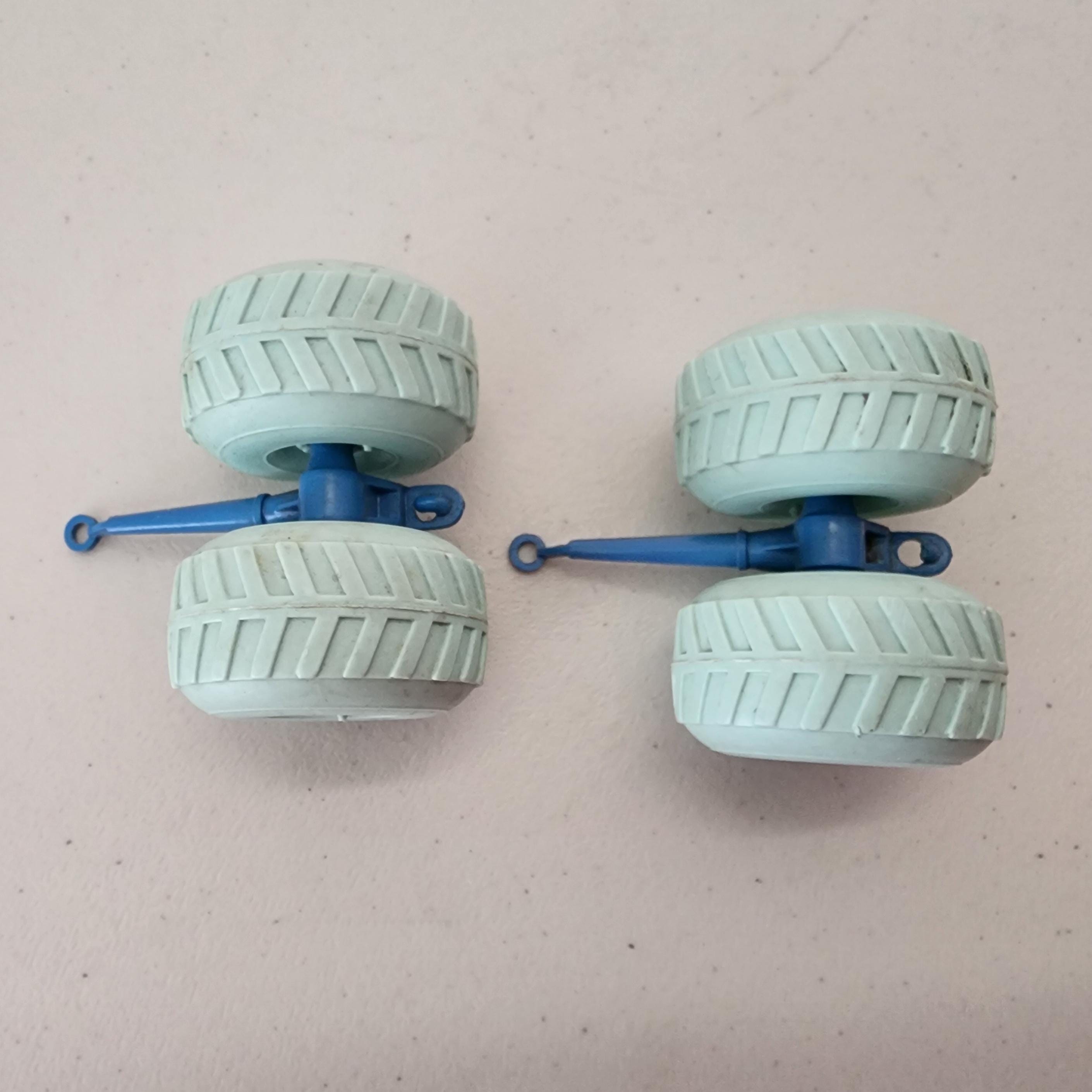 This is a vintage 1960s set of 2 Marx Operation Moon Base balloon wheels with axles. The hard plastic wheels are a mint green and the axles a light/medium blue.