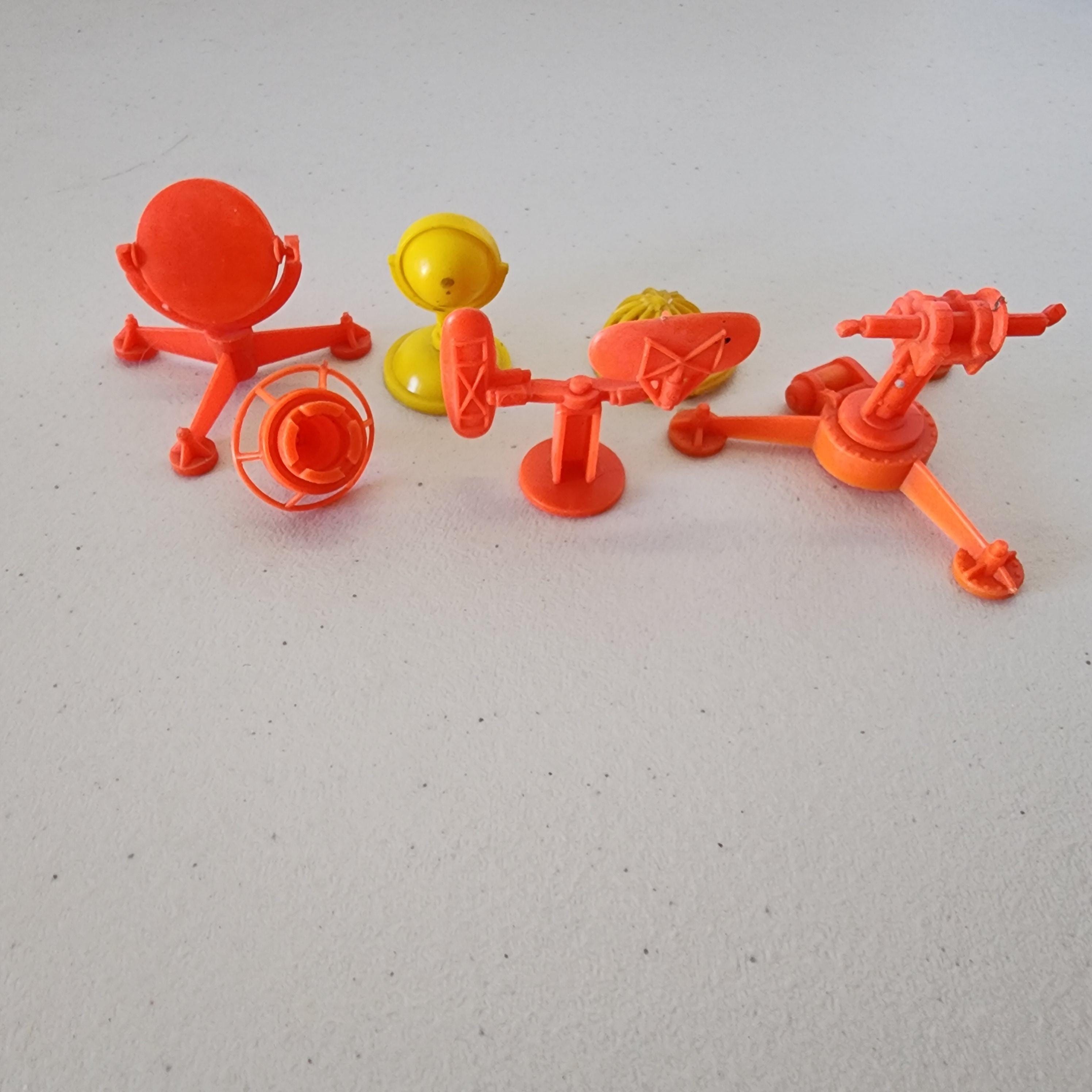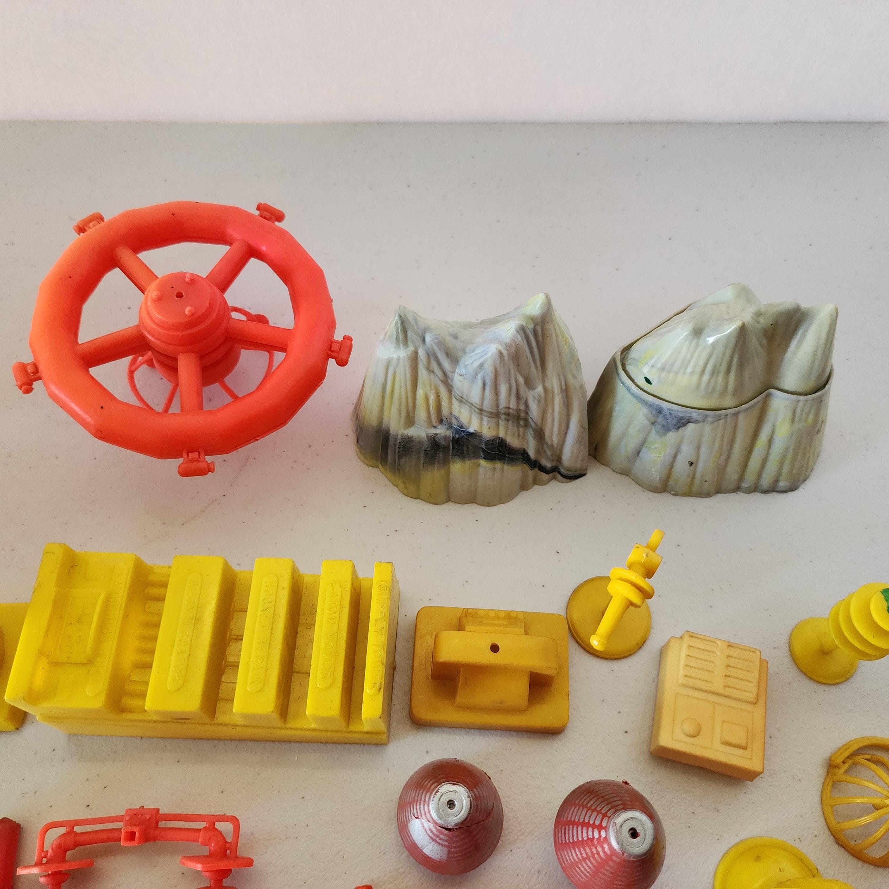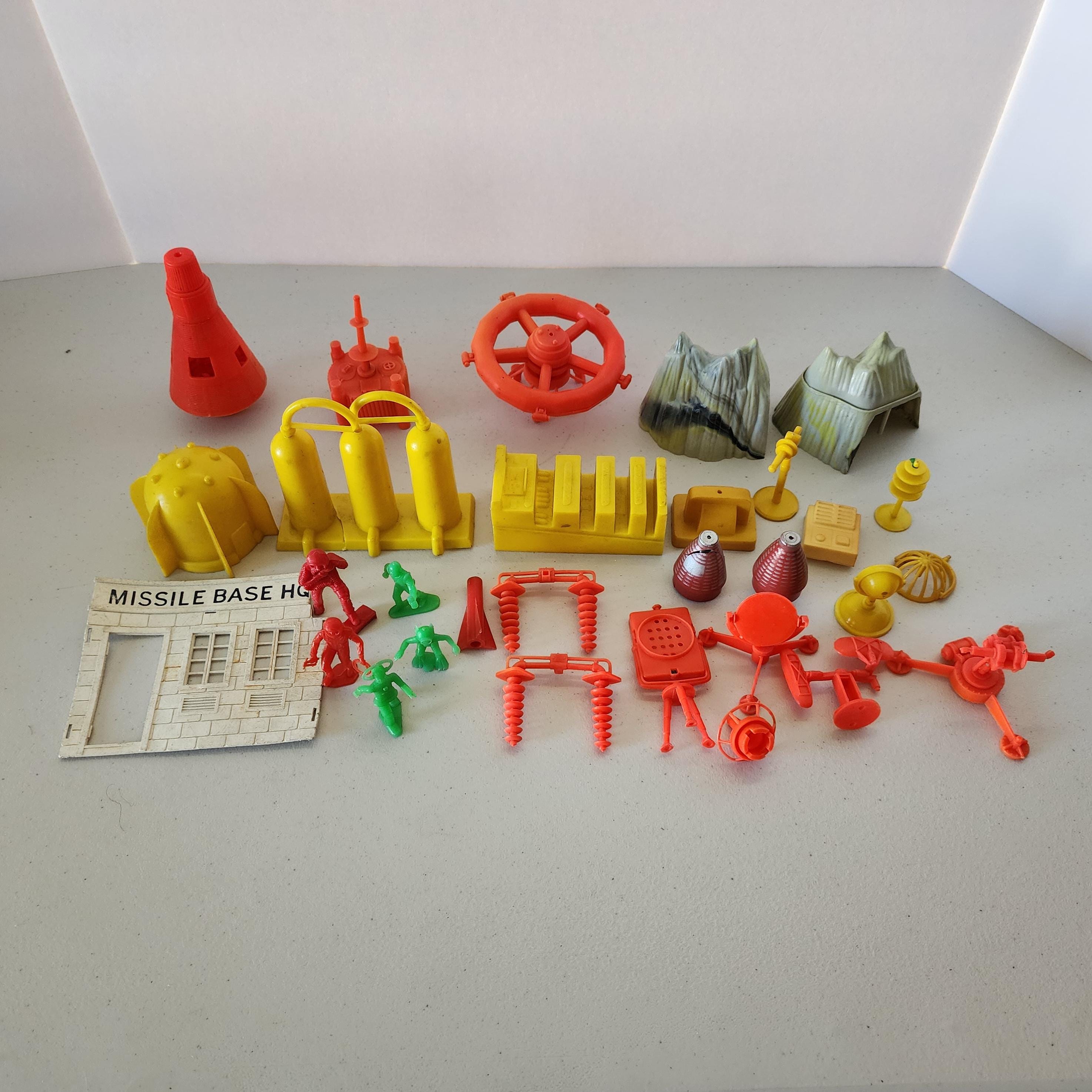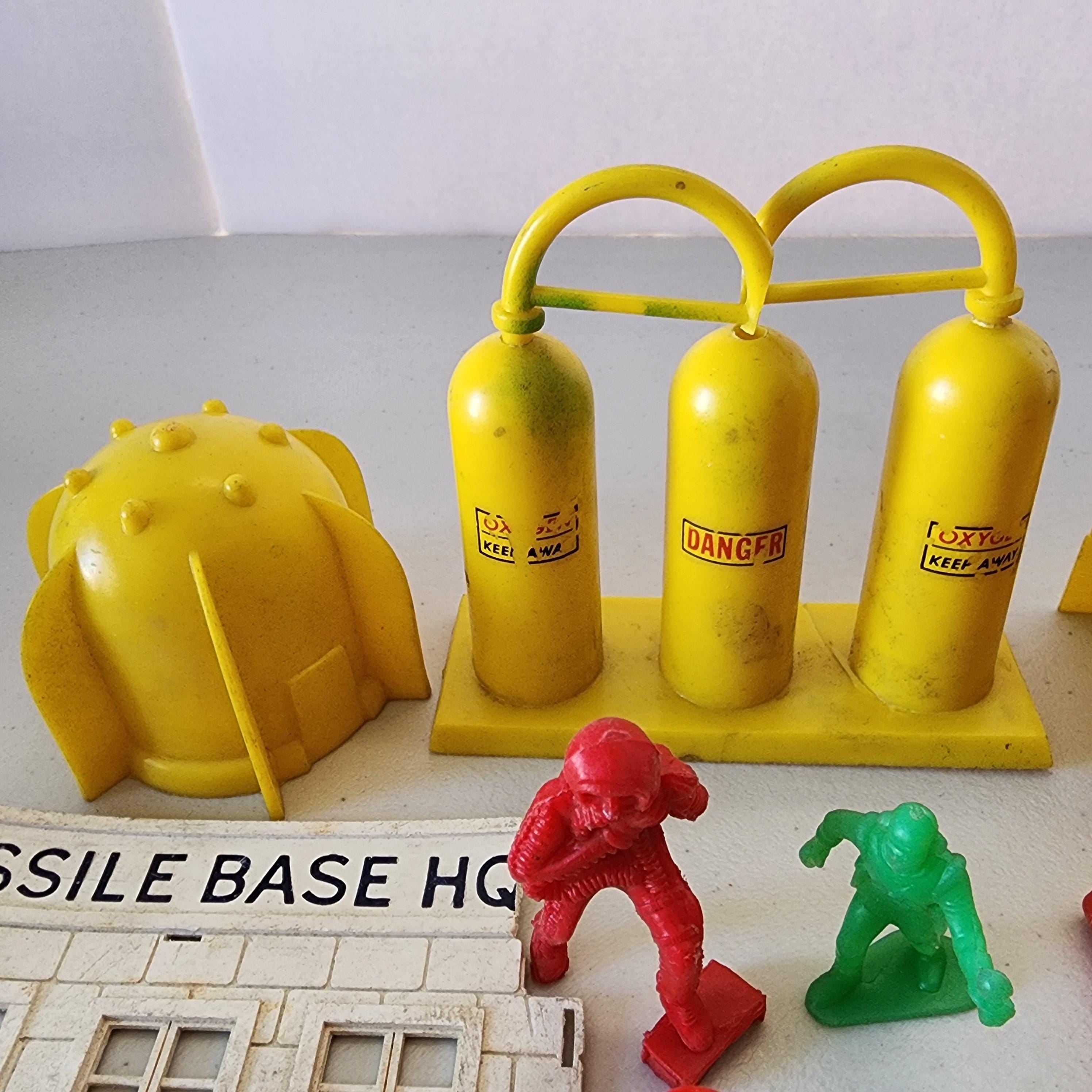 This is a vintage 1960s lot of hard plastic accessories from the Marx Operation Moon Base. It includes a space capsule with man inside, astronauts, oxygen tanks, and other miscellaneous pieces.