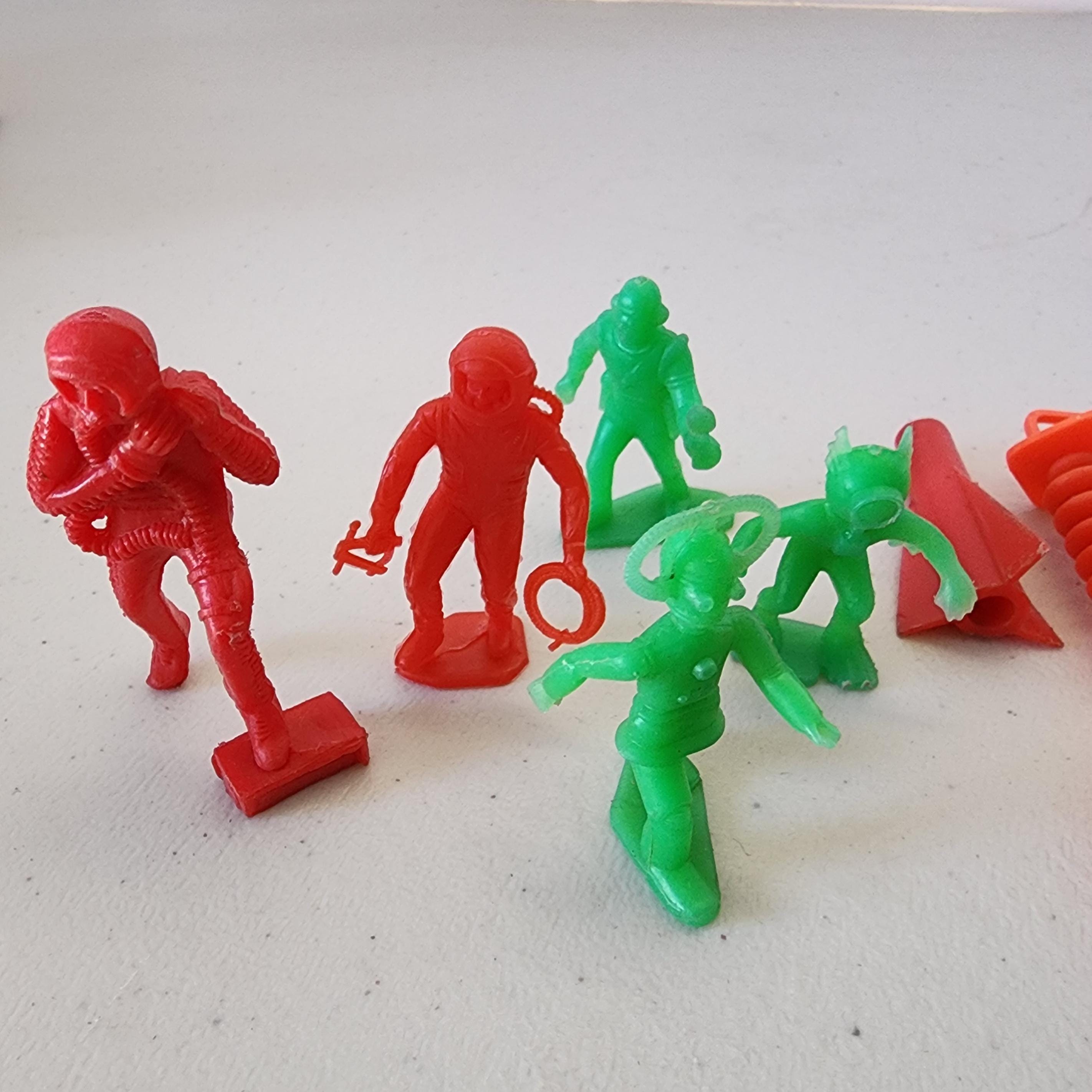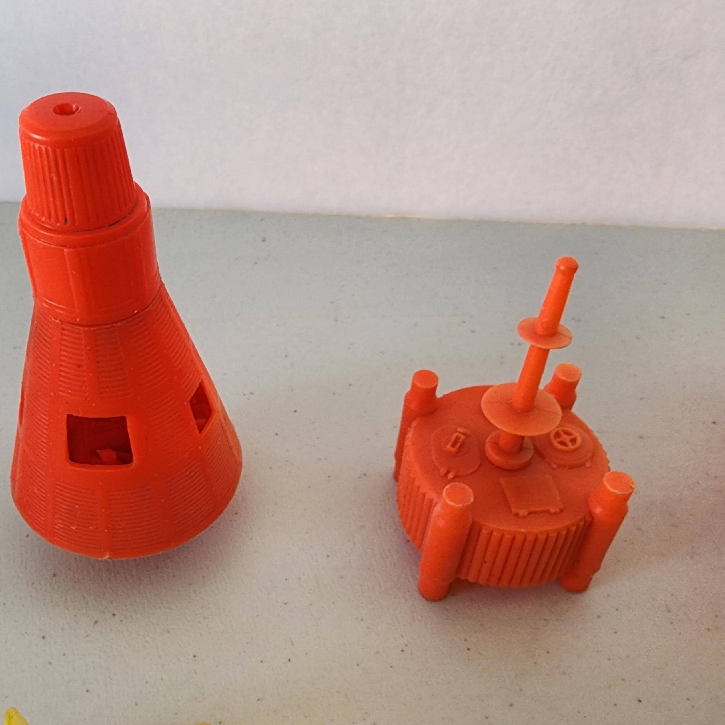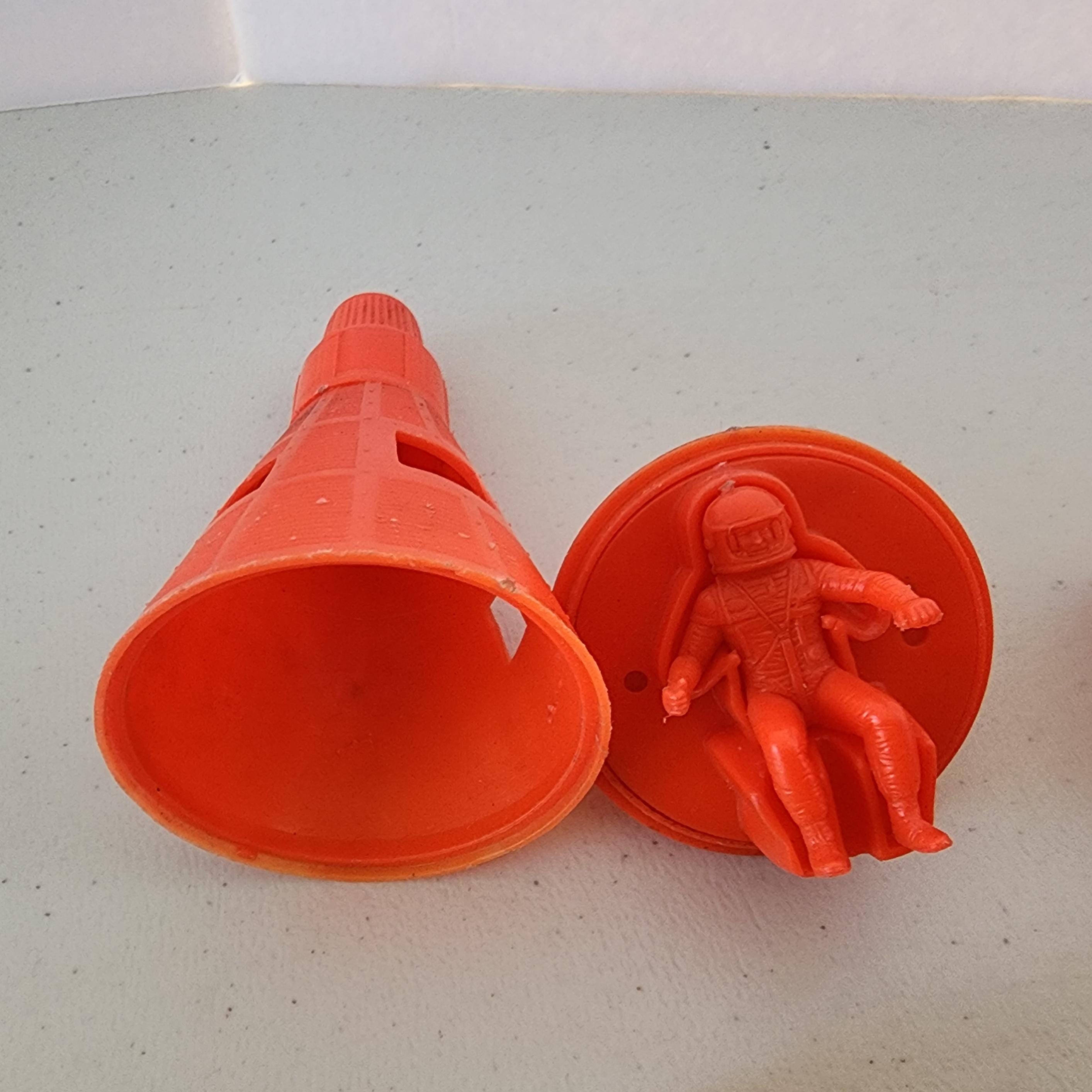This is a vintage 1960s lot of hard plastic accessories from the Marx Operation Moon Base. It includes a space capsule with man inside, astronauts, oxygen tanks, and other miscellaneous pieces.