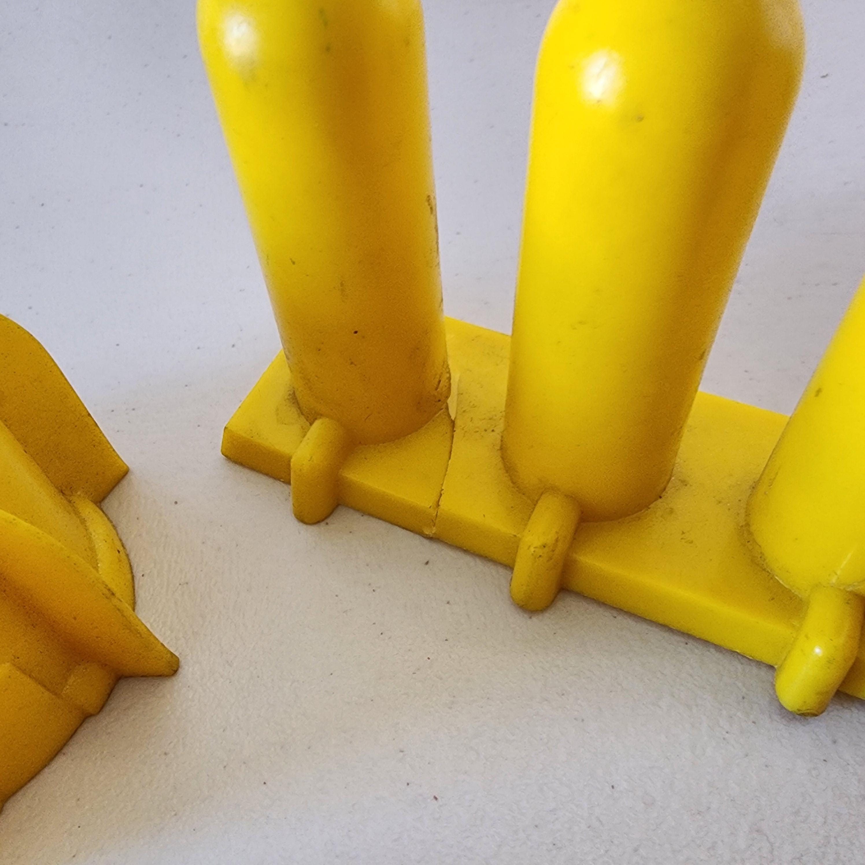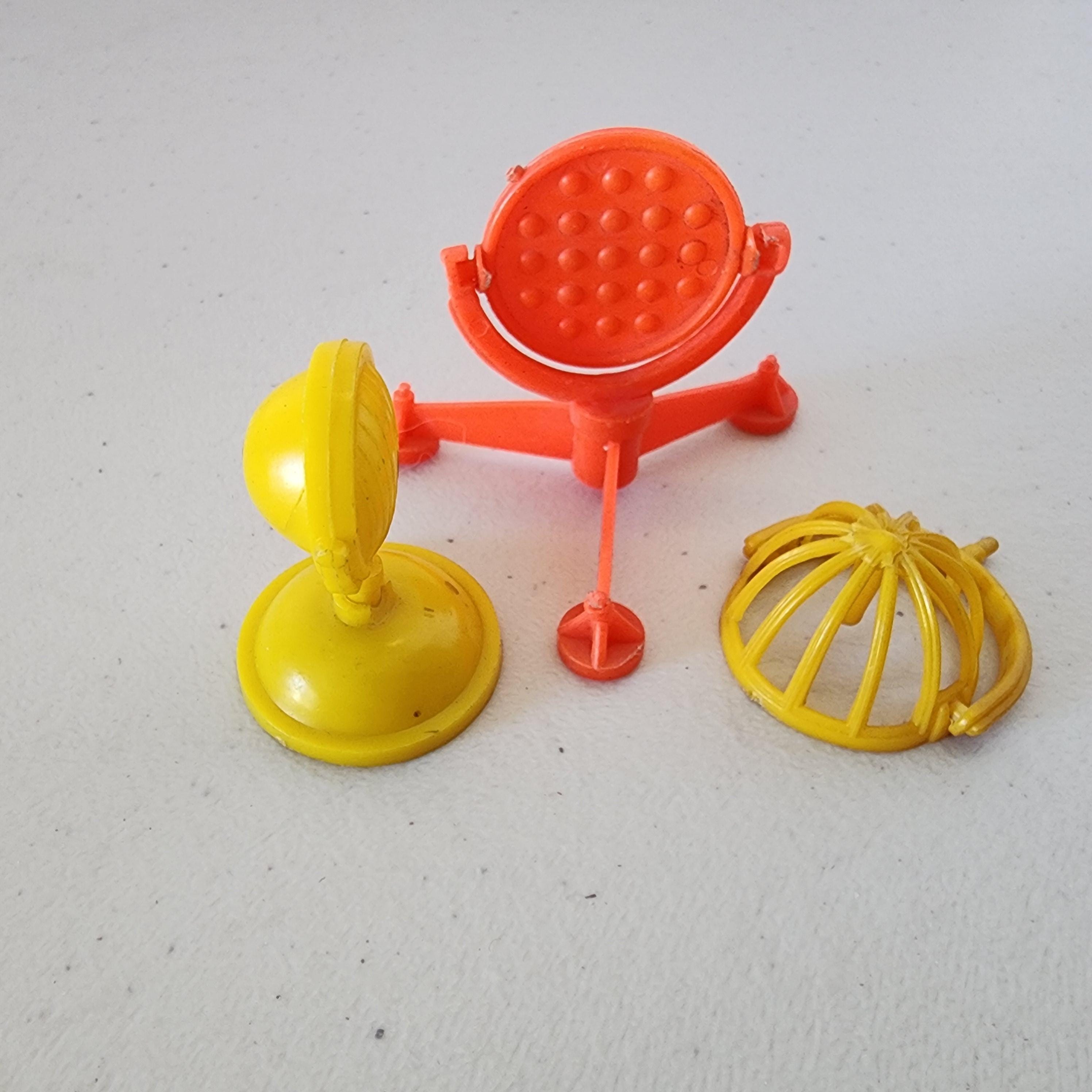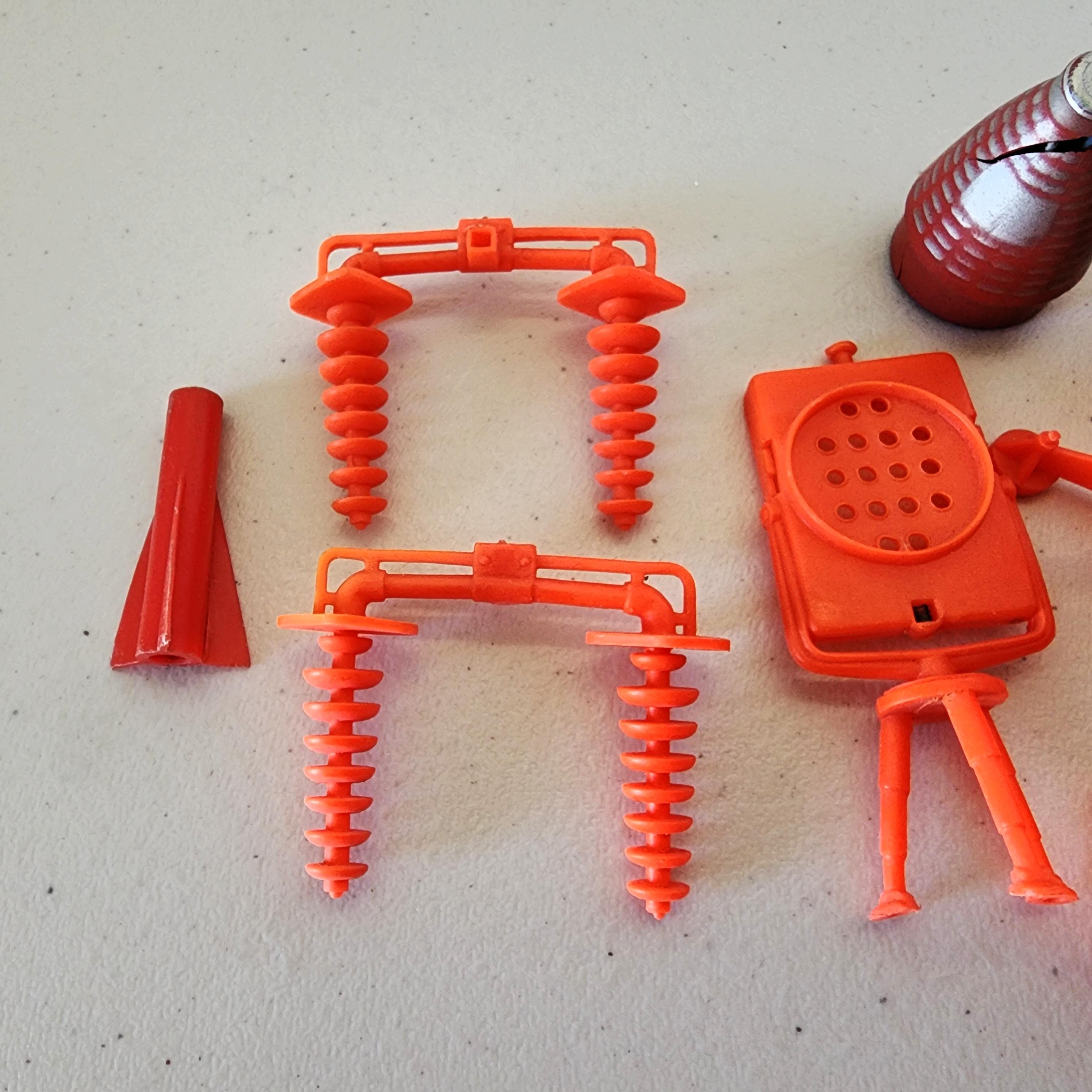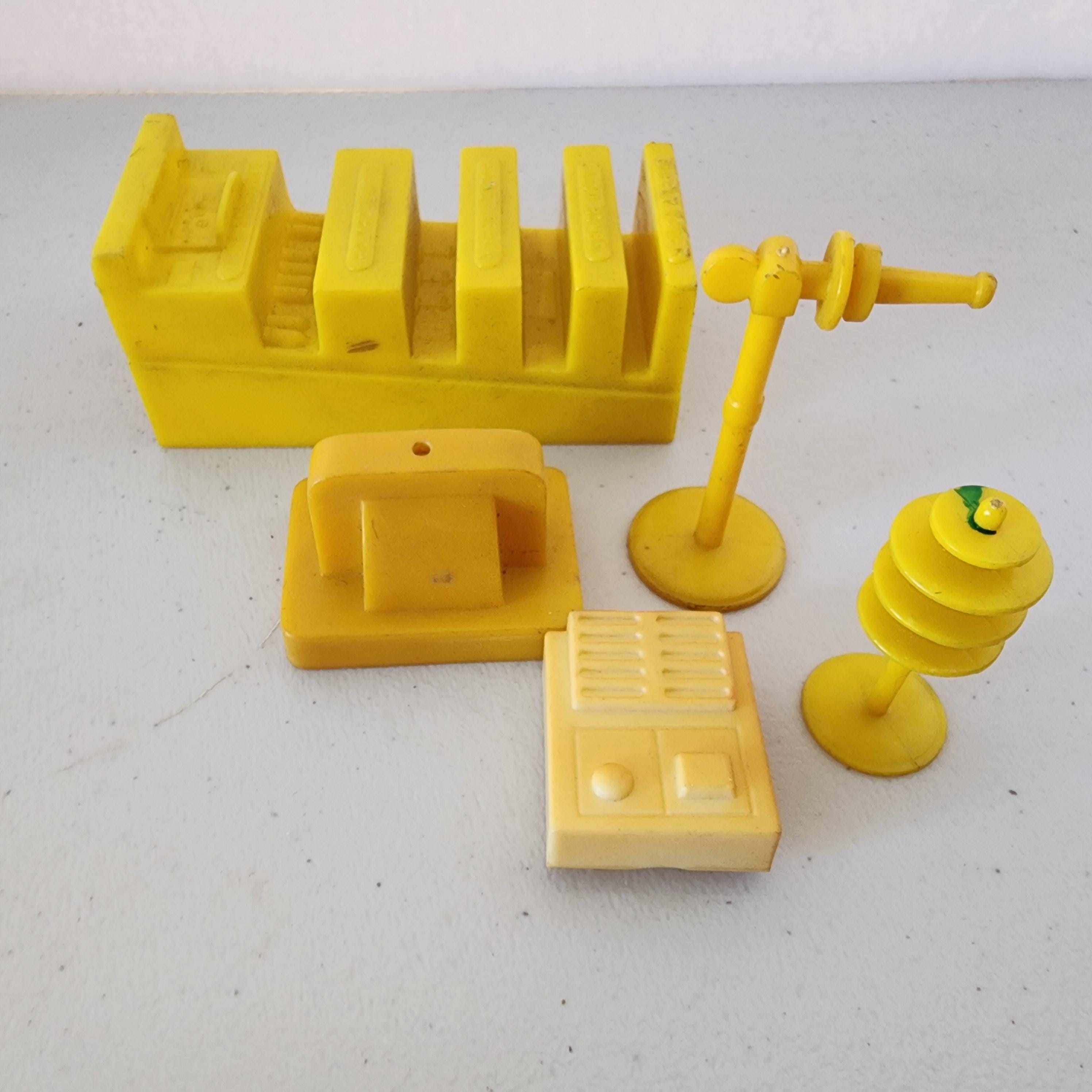 This is a vintage 1960s lot of hard plastic accessories from the Marx Operation Moon Base. It includes a space capsule with man inside, astronauts, oxygen tanks, and other miscellaneous pieces.