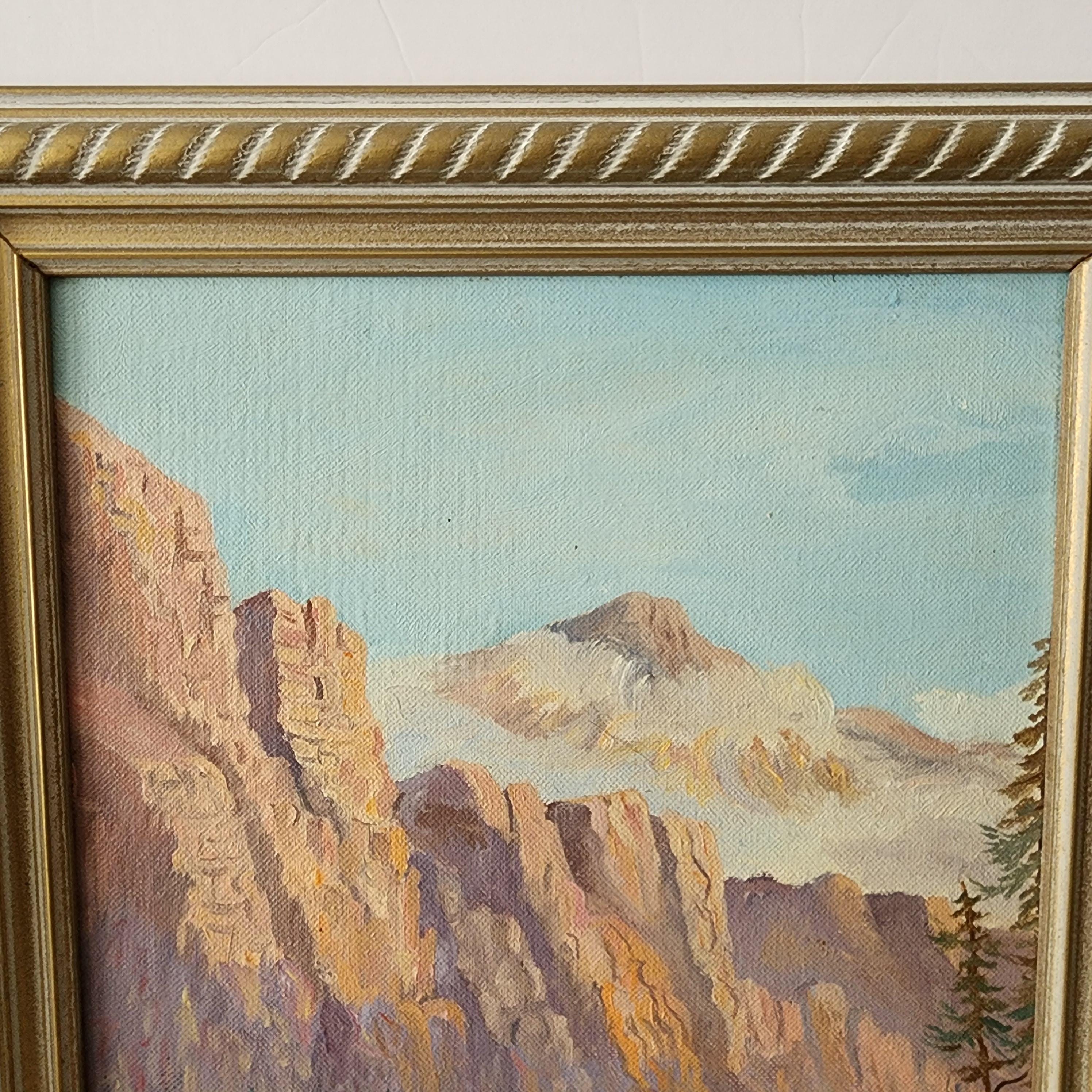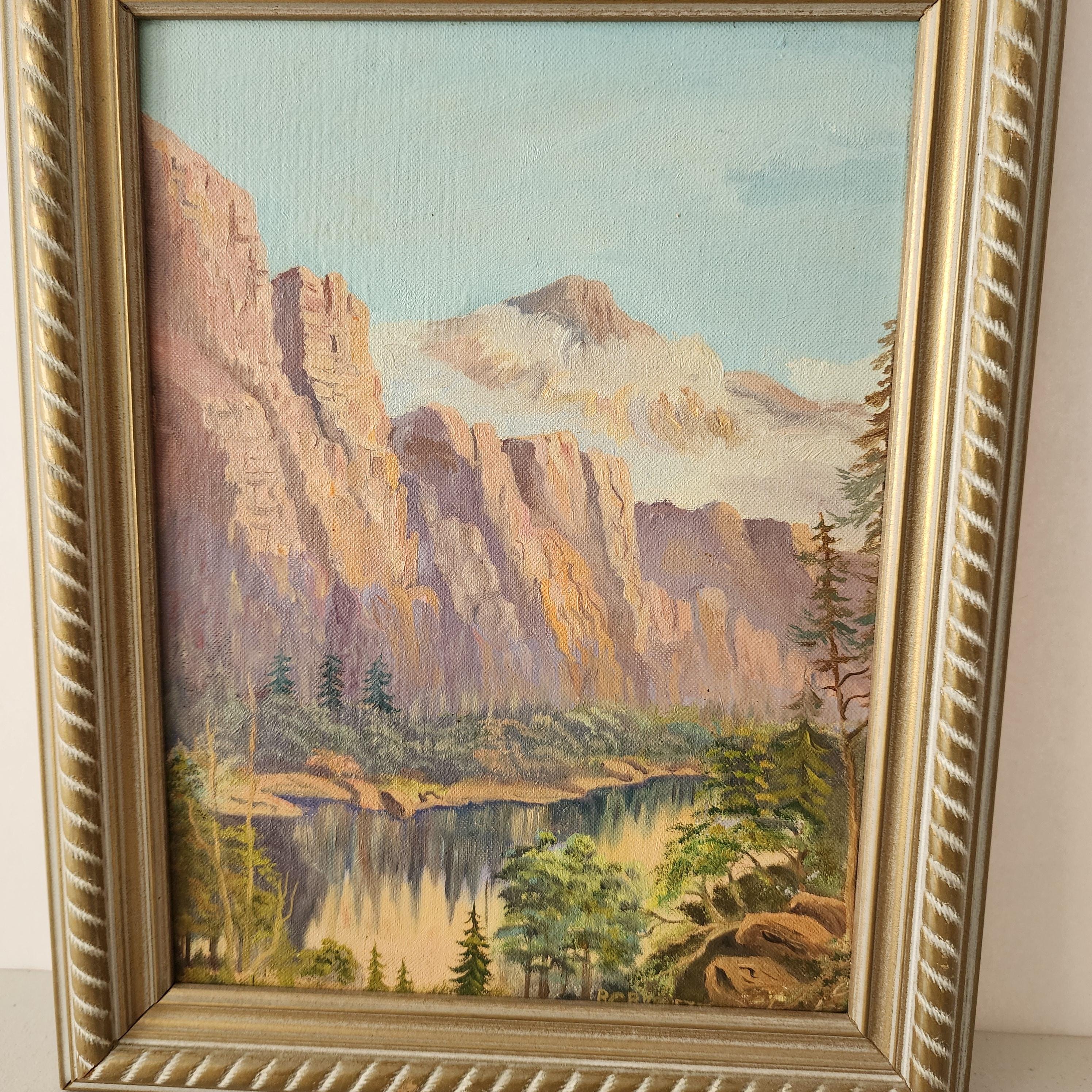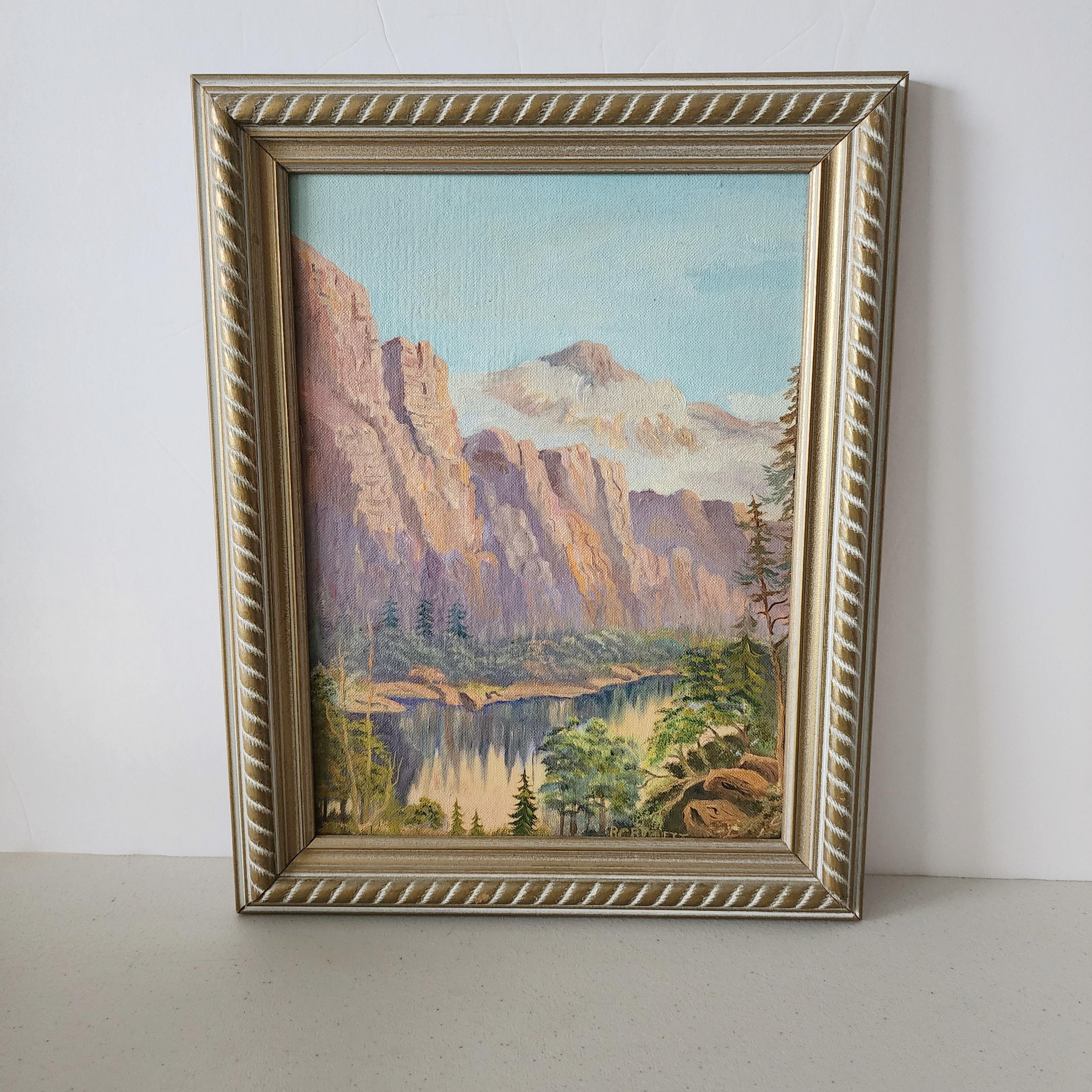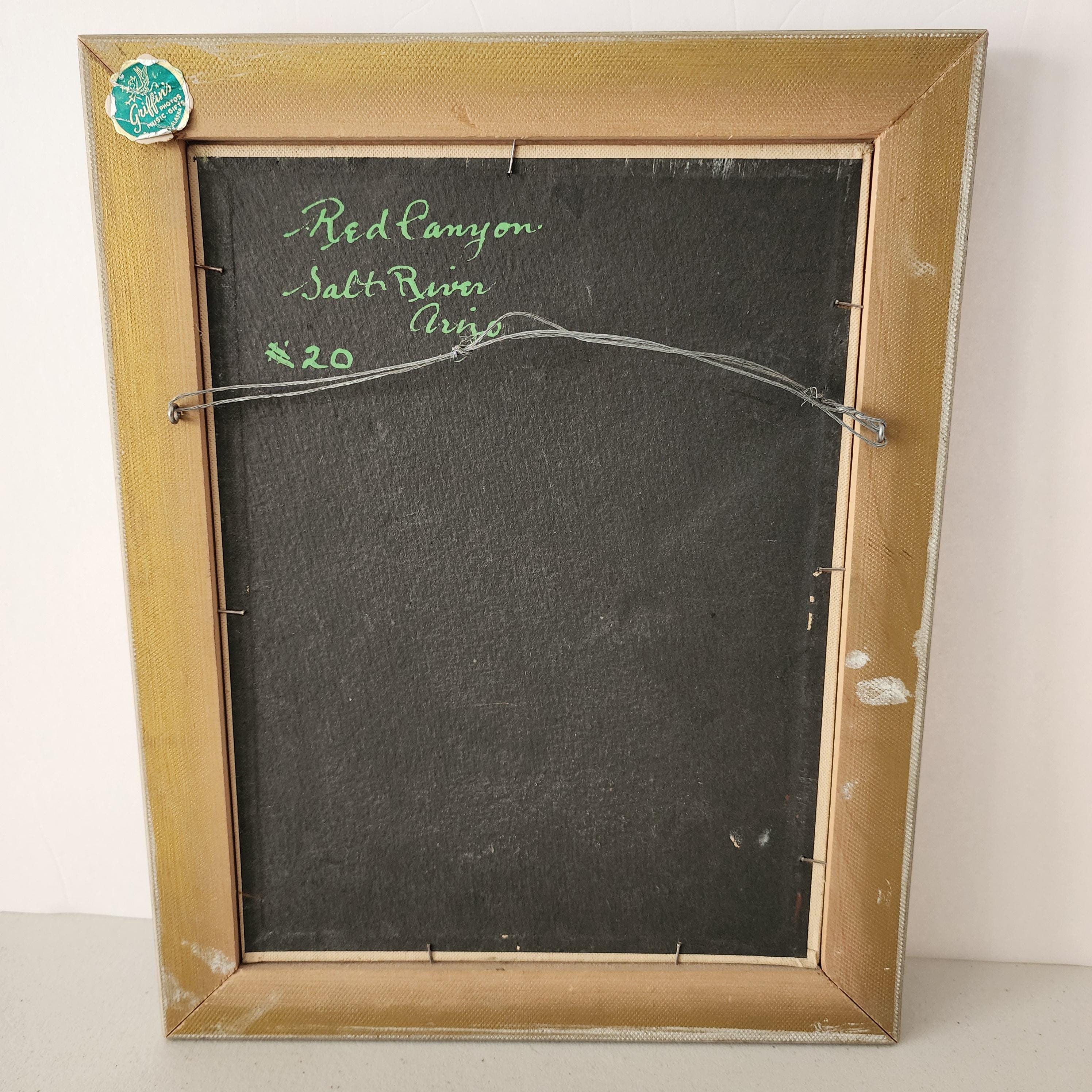 A vintage 1940s era oil painting on canvas board of Red Canyon, Salt River Arizona. It is signed in the lower right corner as shown. The painting itself measures 9" x 12" and the frame is 11.5" x 14.5".
