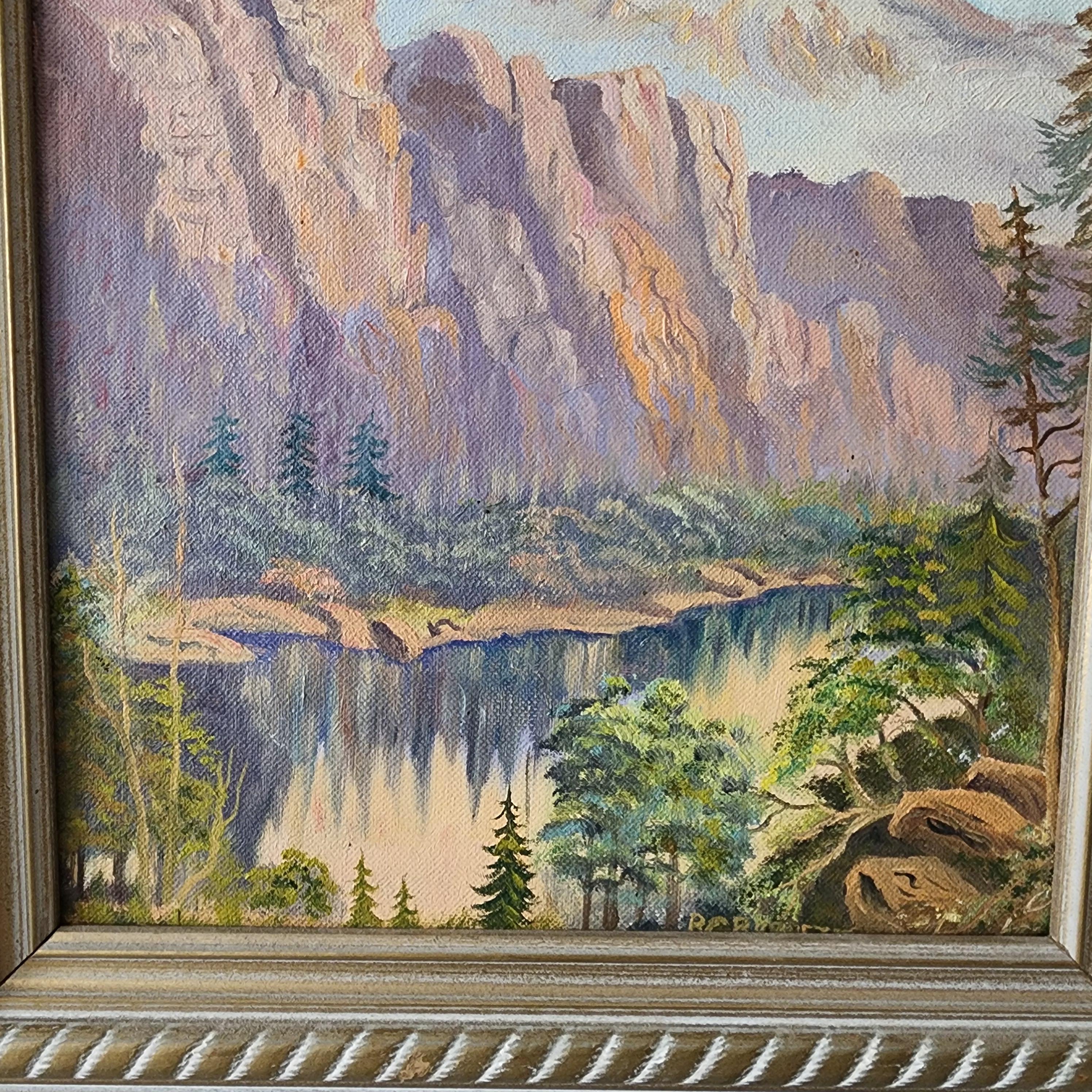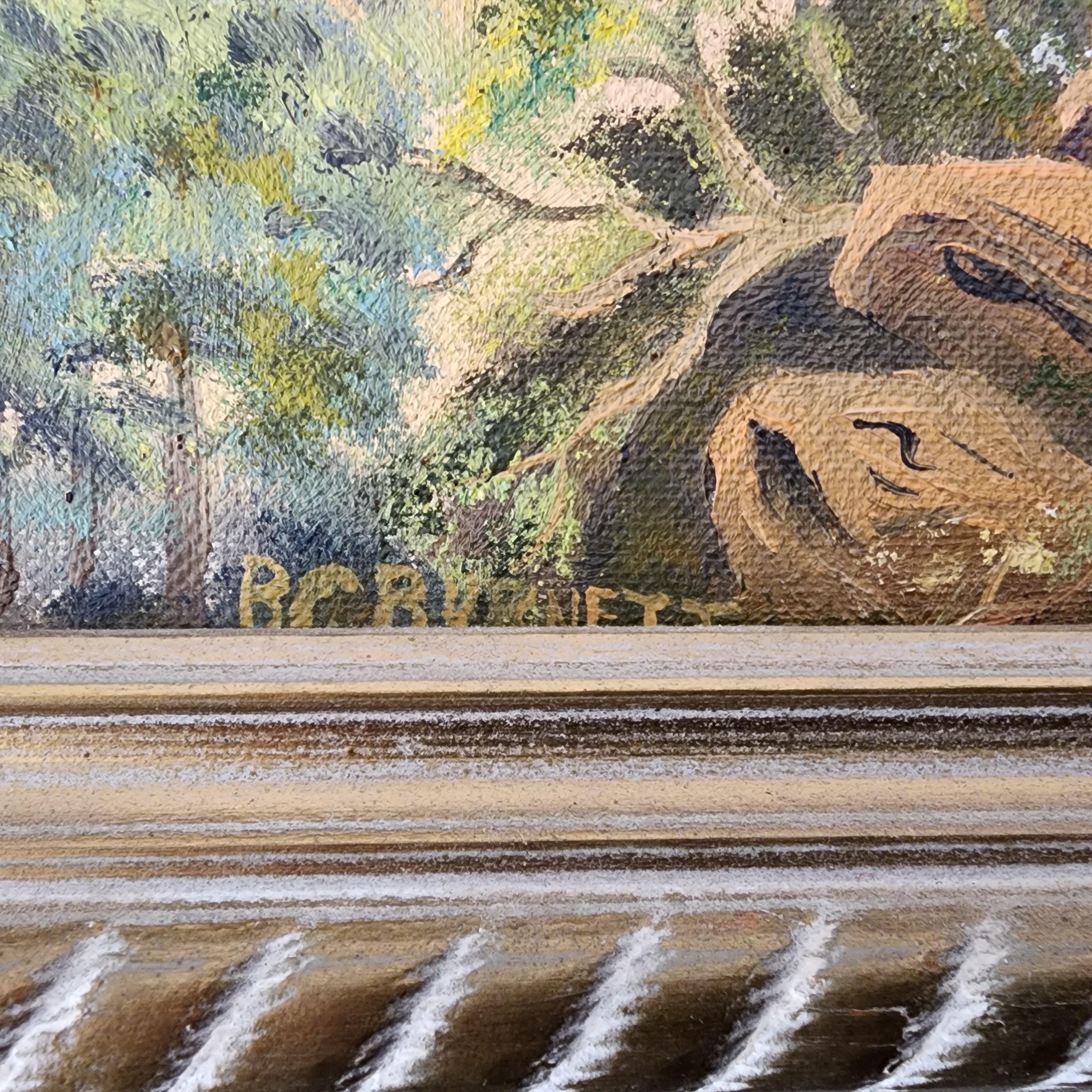 Condition: Painting looks to be in good shape for its age. There are a couple tiny dark dots in the sky and a small yellow area to the right of the signature that may be wear. The frame has minor wear.